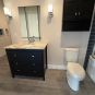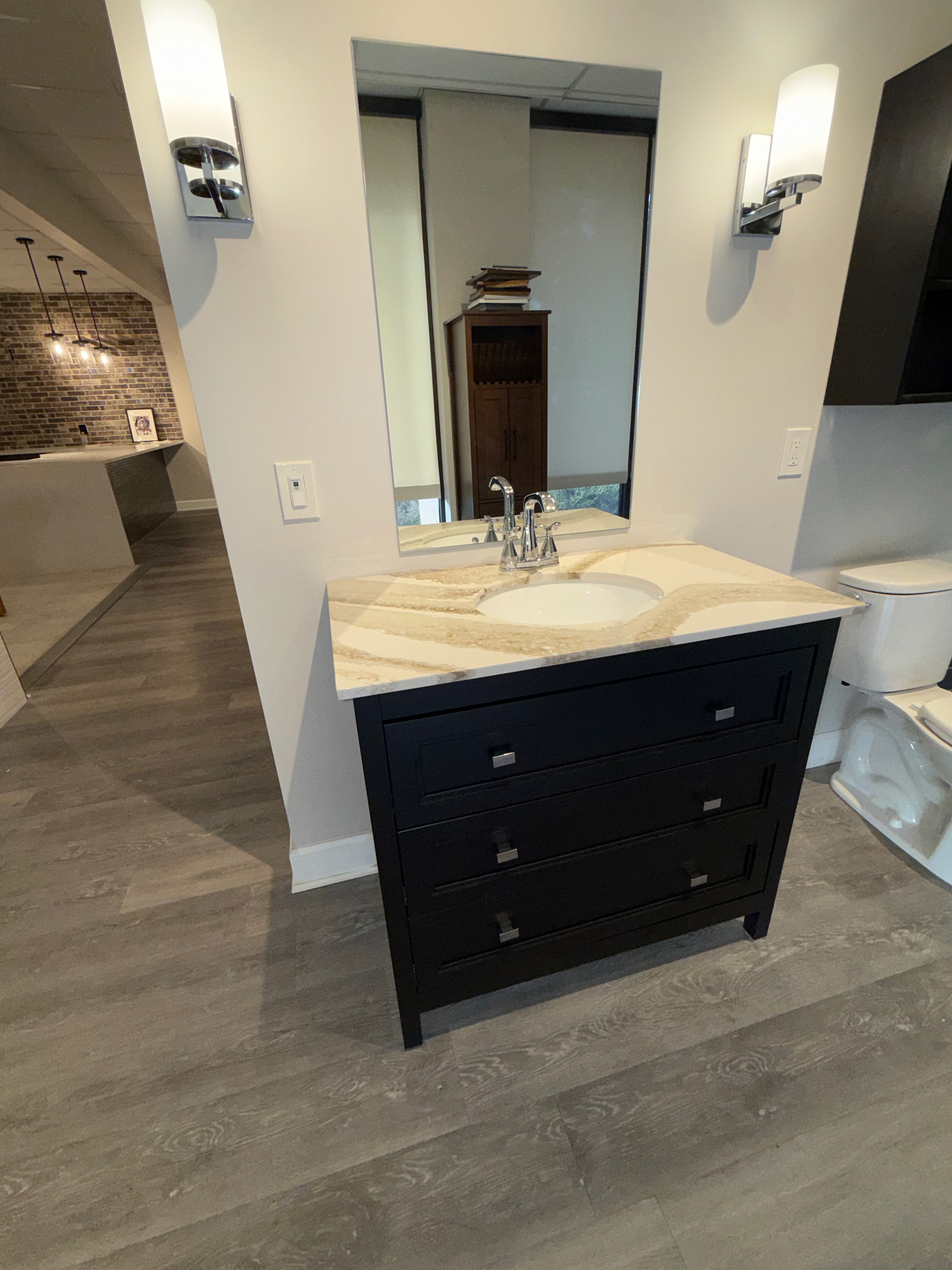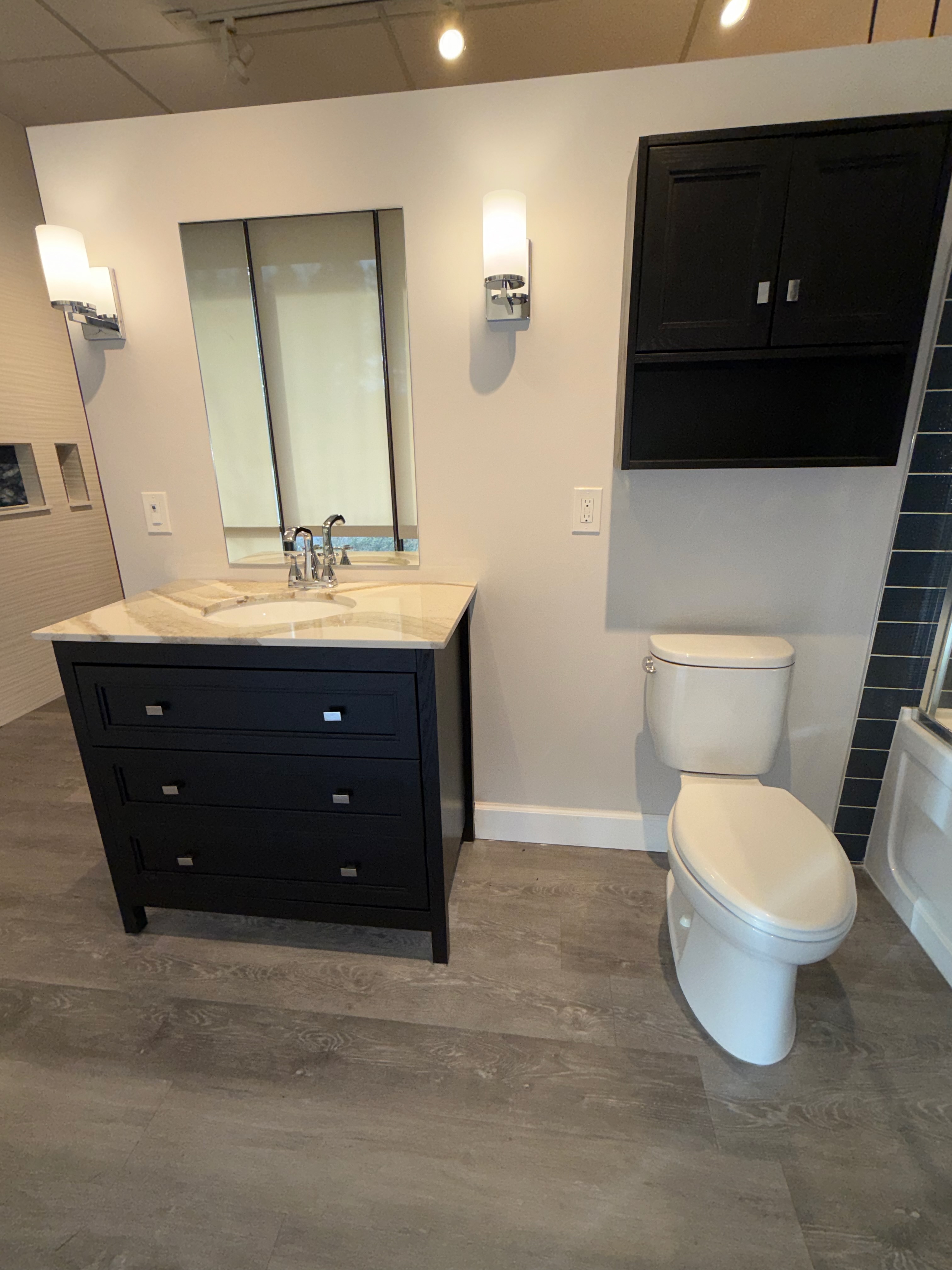 Nice! Strauser black Oak vanity with matching wall cabinet over the commode. Mirror and sconces included. Like new only used as a showroom display. Pics #21-23