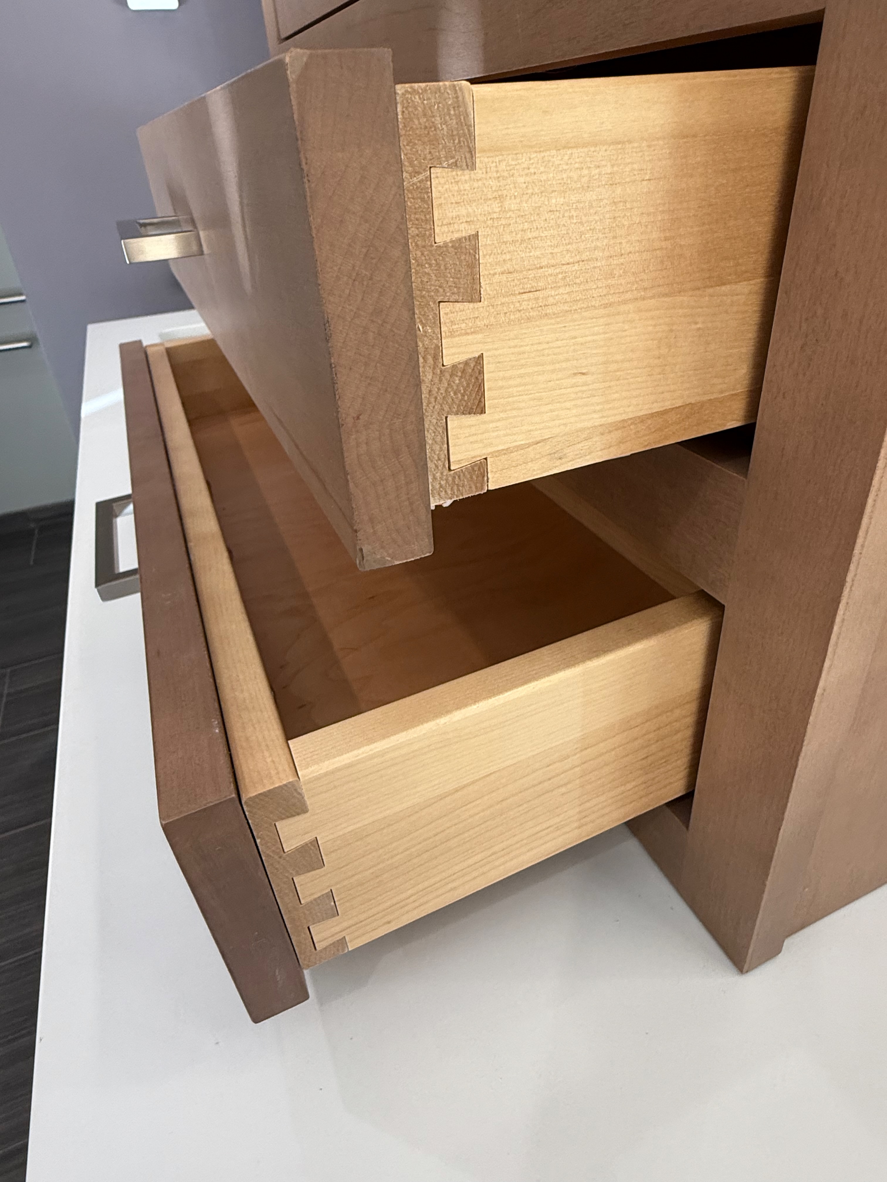 2-Three drawer base cabinets with a slab marble countertop. Dim.:41 ½”w/43 ¾”w x 36”h x 24”d