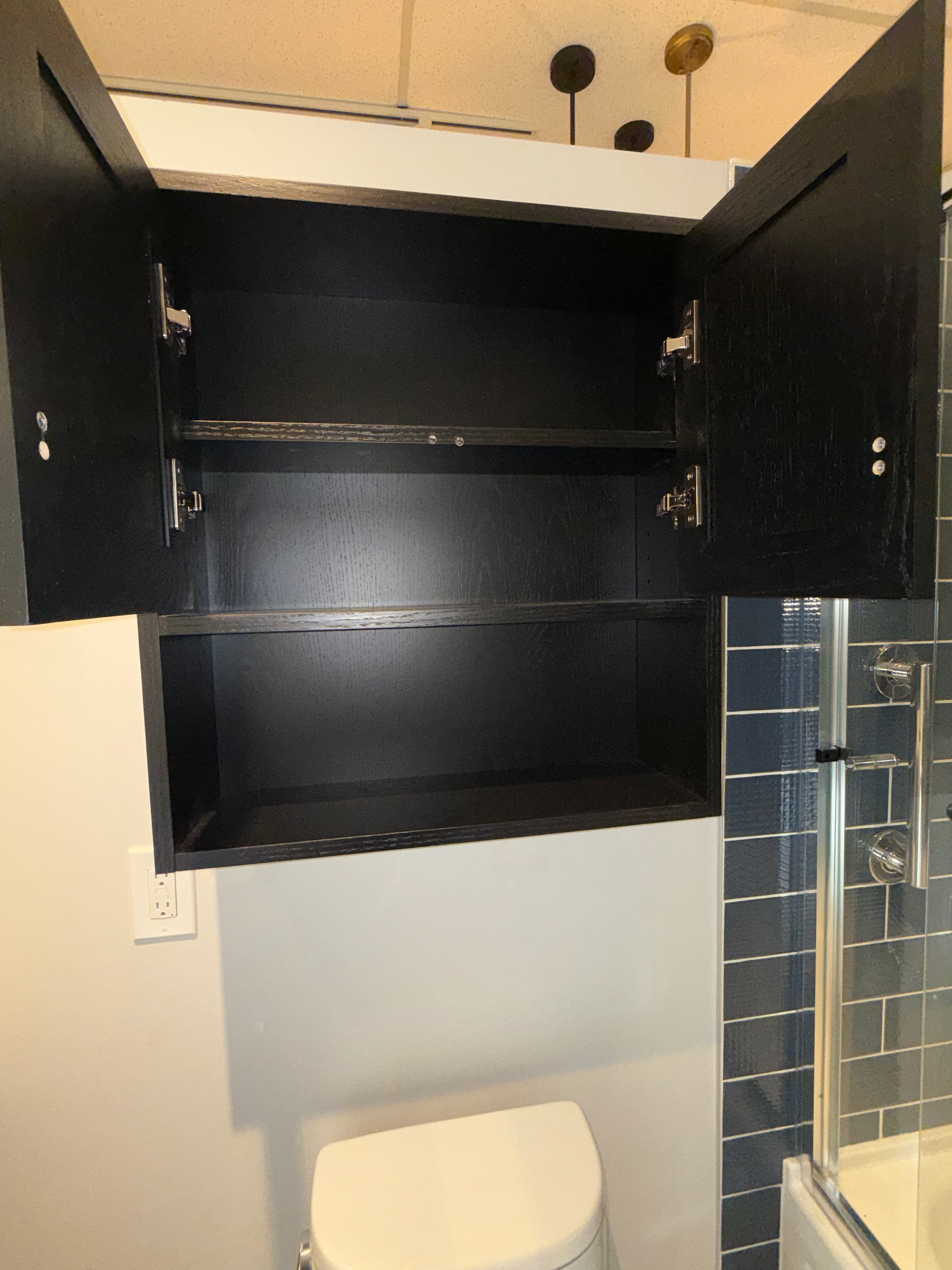 Two door matching wall cabinet w/ shelf over the commode Dim.: 24”w x 26”h x 8”d