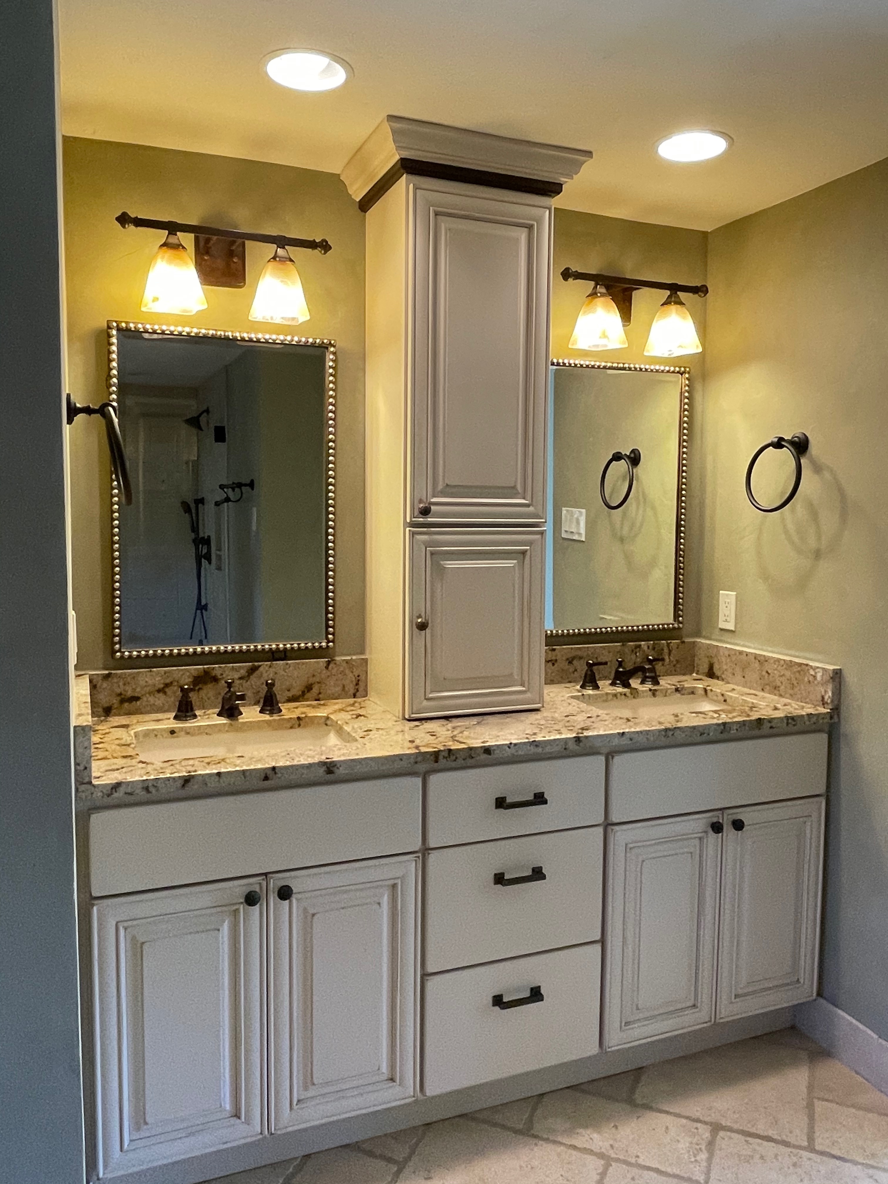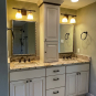 Like New! Crystal cabinetry master bathroom double sink vanity with slab granite counter tops with two under mount sink and faucet sets. The cabinet drawers are soft close and dovetail. The mirror and sconce lighting is included. Only 5 years old! Also available a Kohler Pedestal sink and oil rubbed faucet set. Available any time to be removed by a qualified buyer.