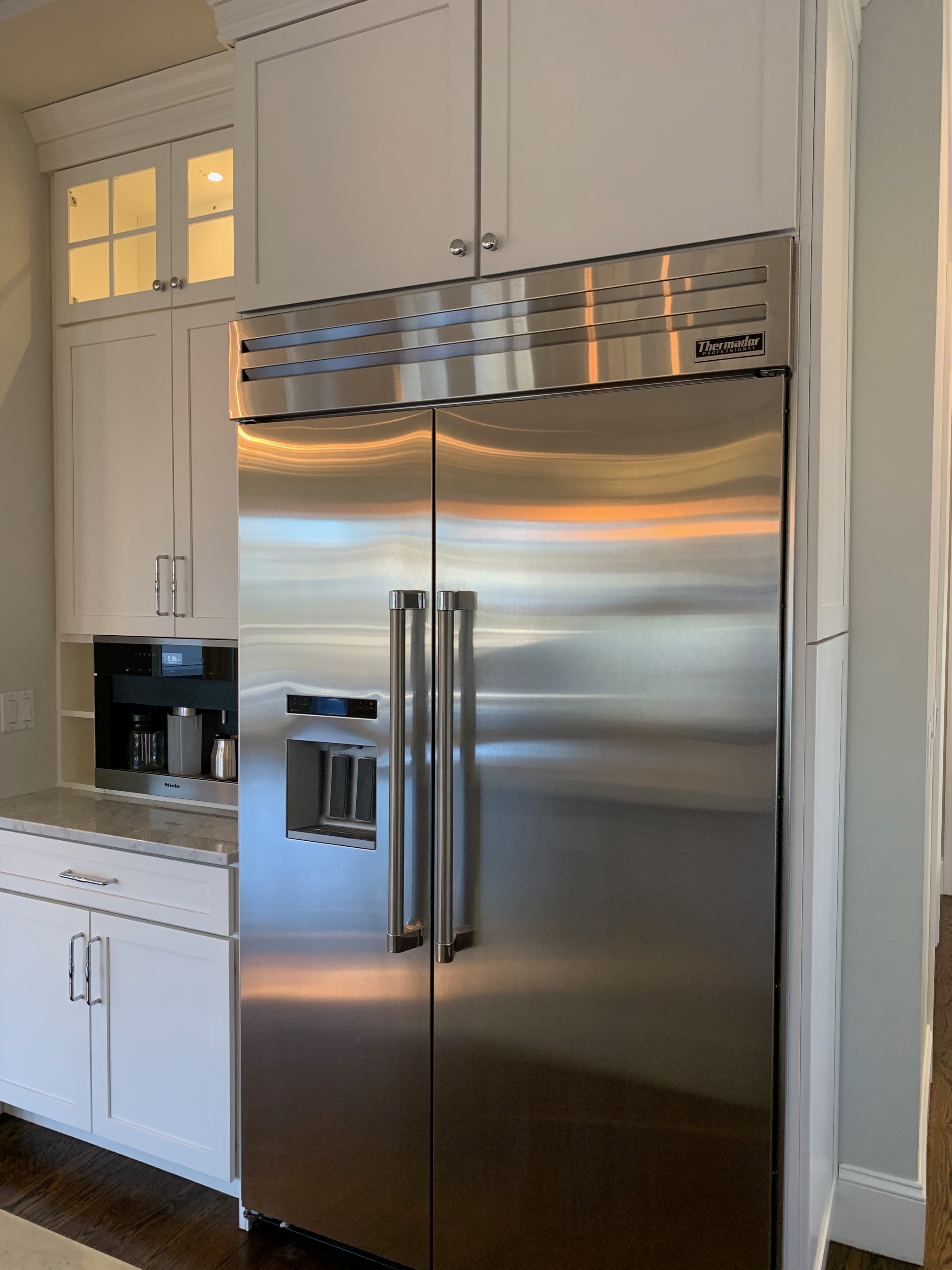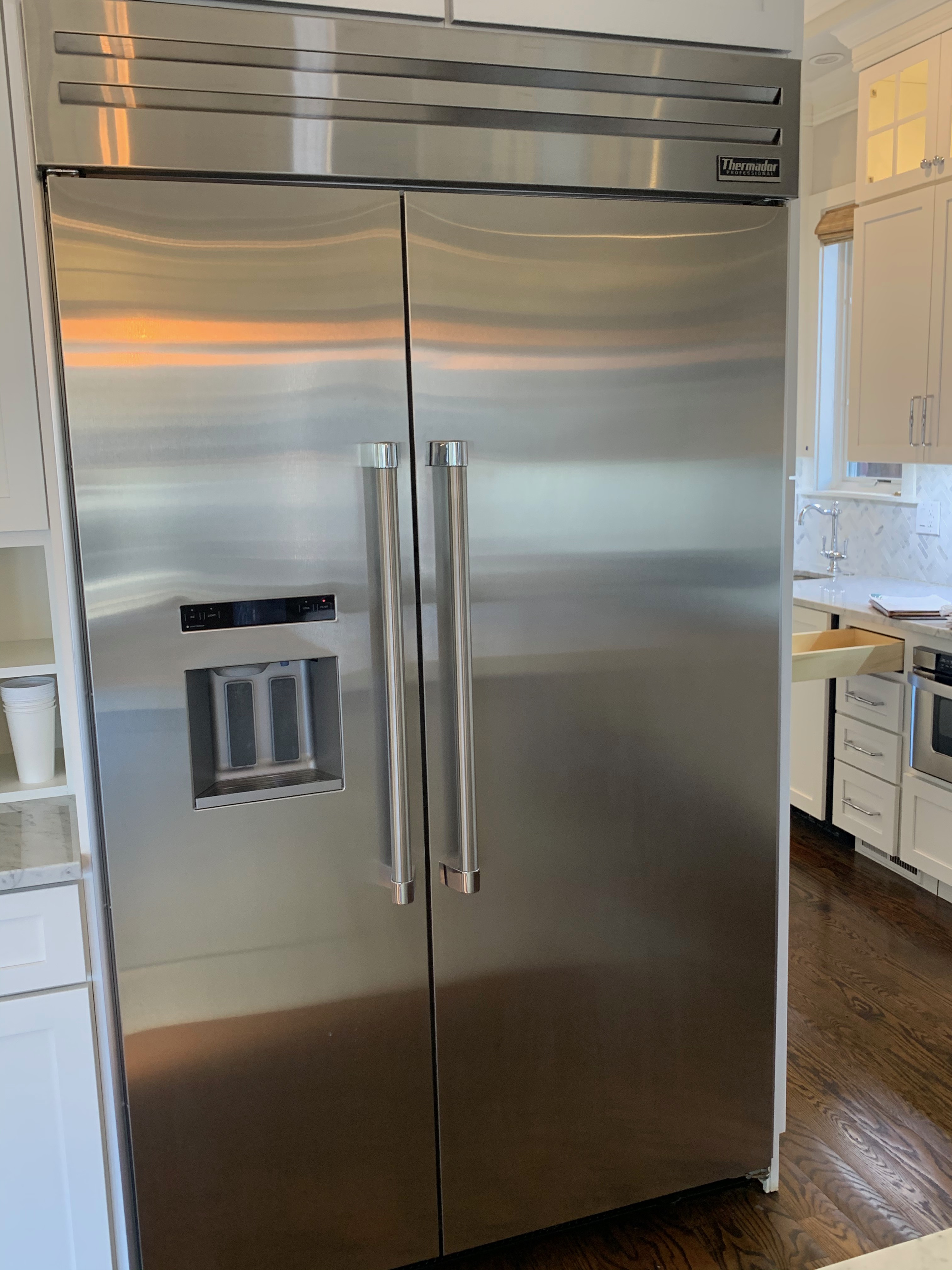 48” Thermador Refrigerator Model #T48BD820NS02 Serial#9401000553 1/14 Built-in Side by Side Refrigerator with 29 cu. ft. Capacity, 4 Adjustable Glass Shelves, Gallon Door Bins, Holiday Mode, Electronic Touch Controls, FlexTemp Drawer, Professional Handles and Fully Filtered Internal Ice Maker Dim.:48”w x 83 7/8”h x 24”d