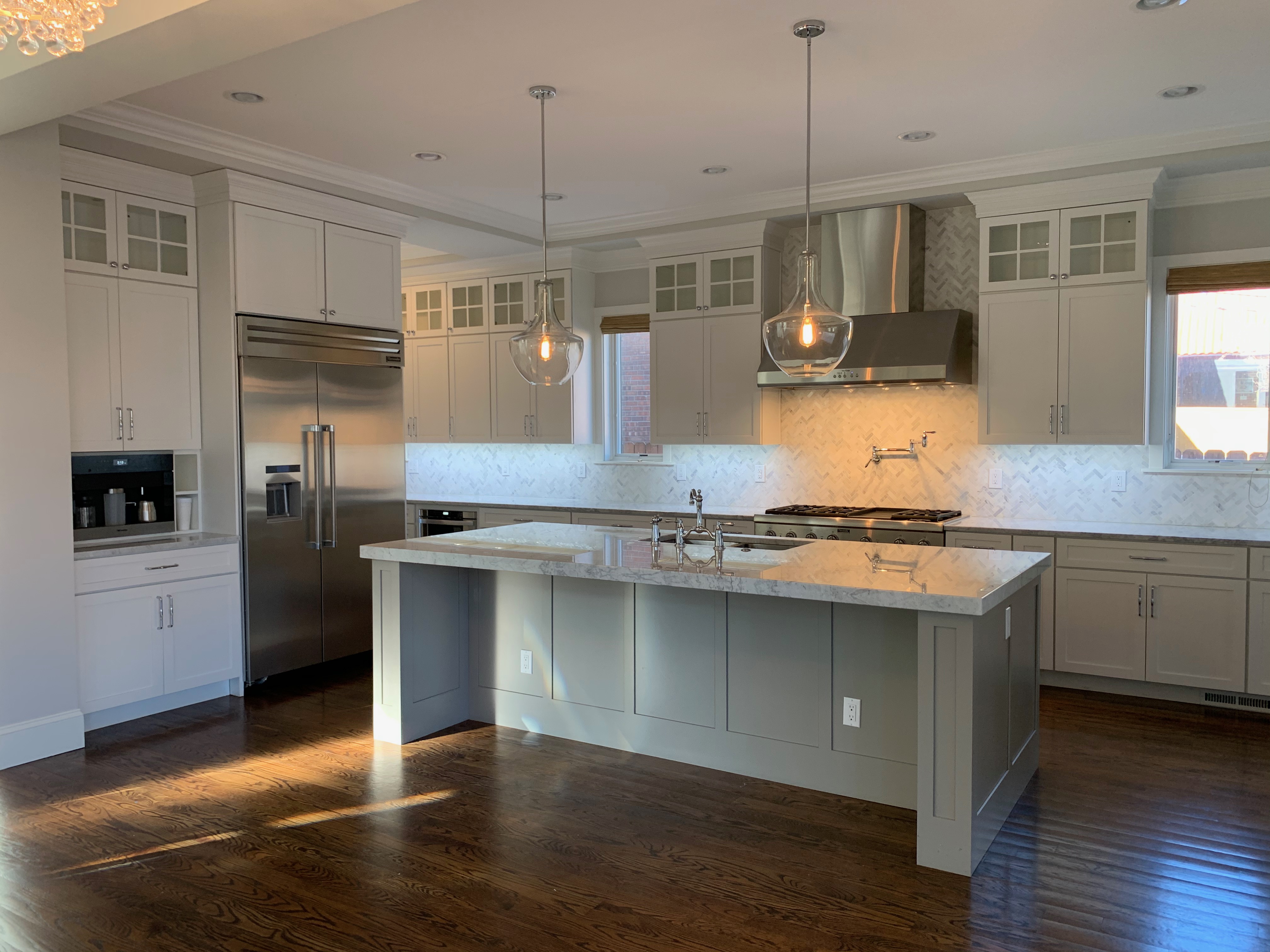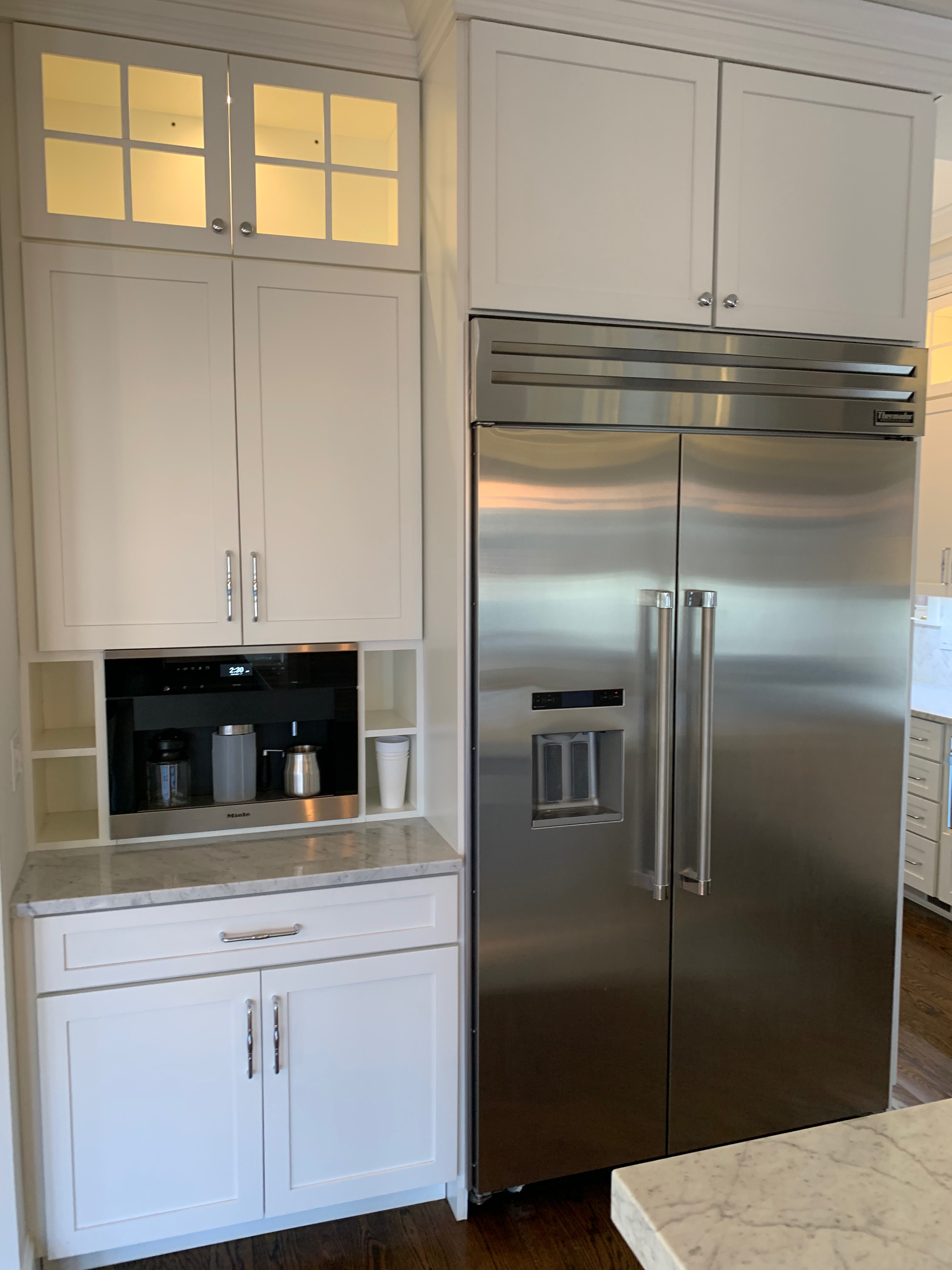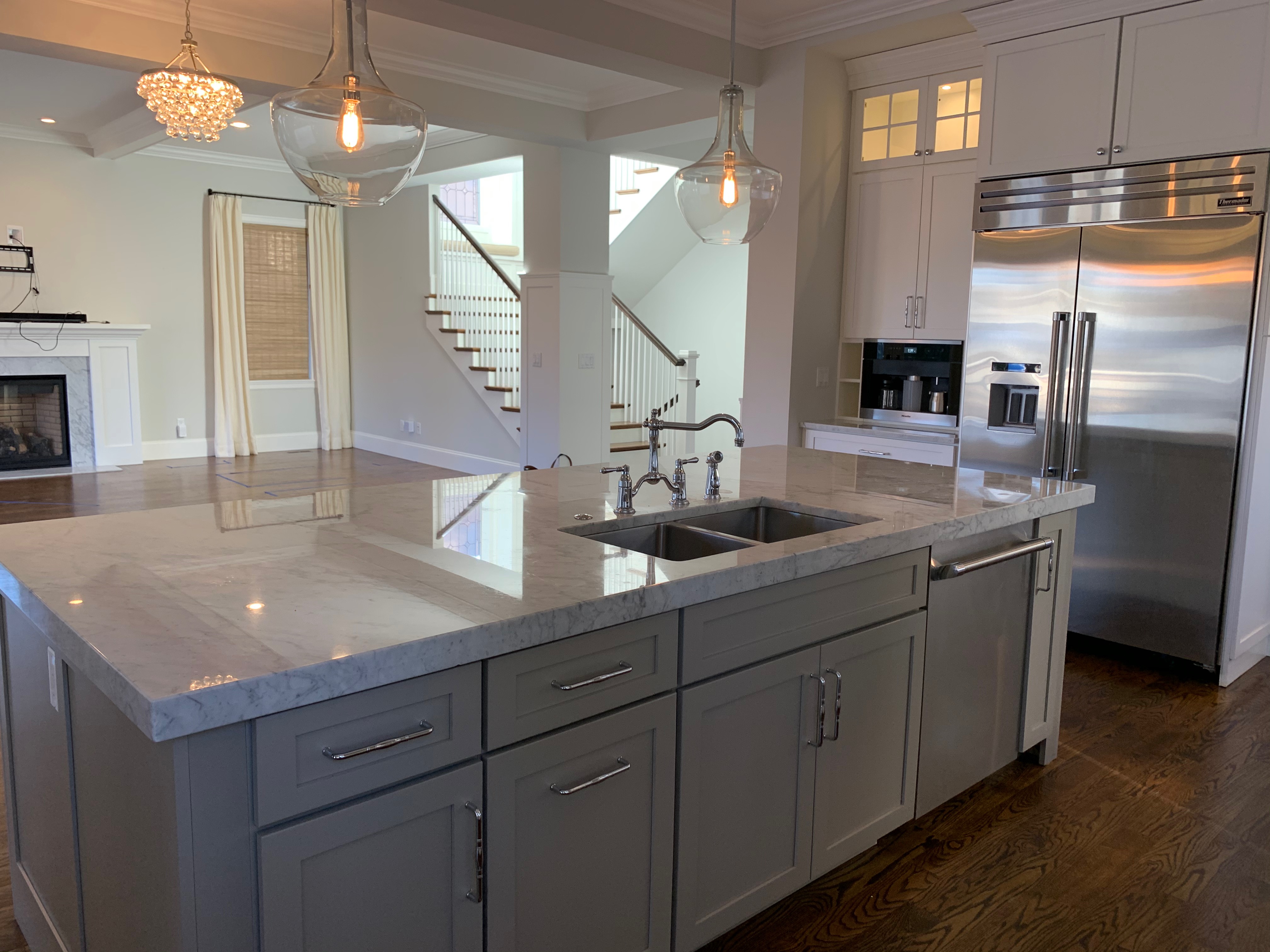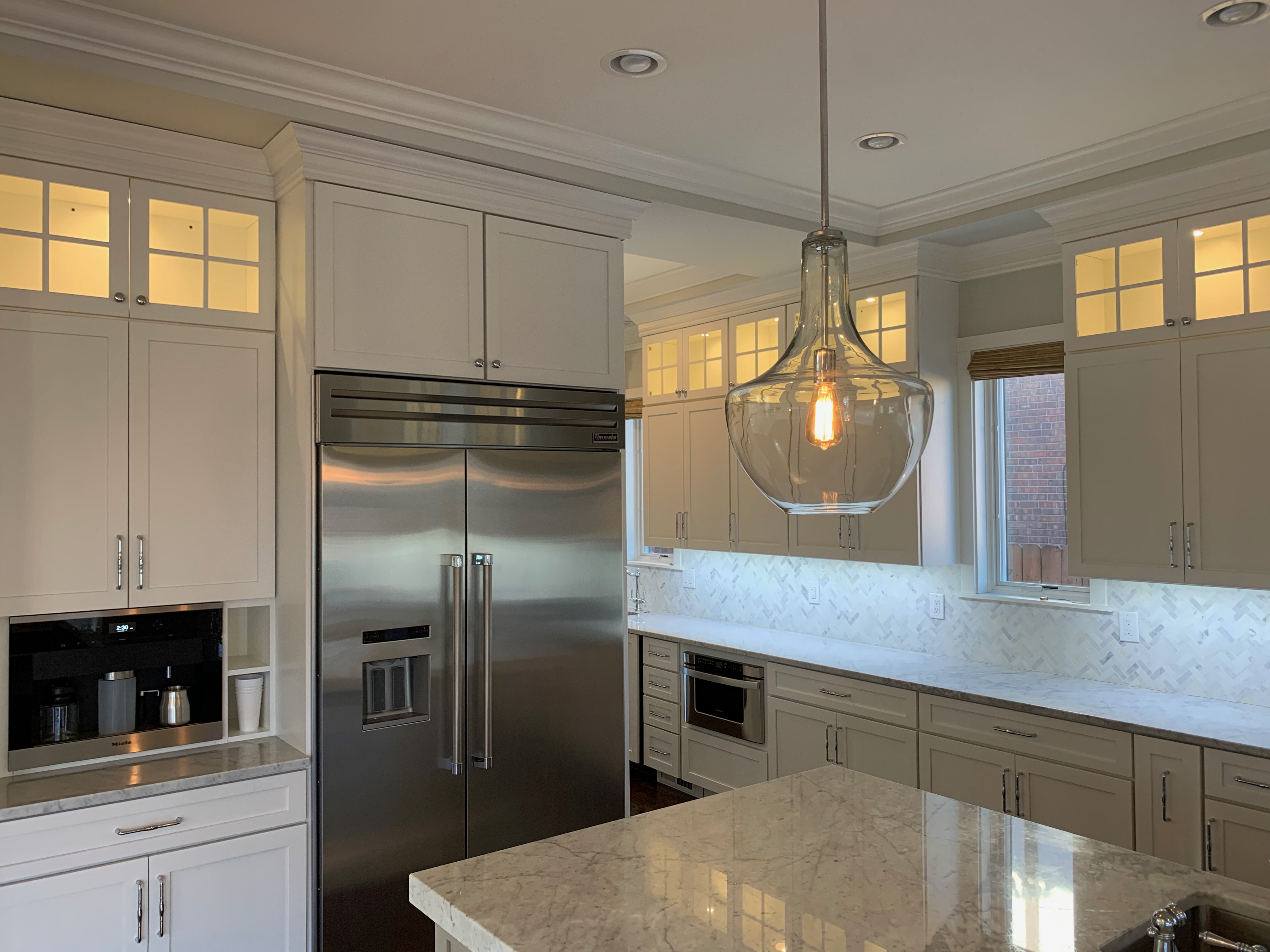 Stunning white Medallion Kitchen cabinets with contrasting light gray island cabinets, like new, only 6 years old! This deal is too good to be true that this newer kitchen package is available for resale. The cabinets are dovetail with soft close drawers. The kitchen has beautiful slab marble counter tops. High-end Appliances include Thermador stainless steel Refrigerator, Hood and dishwasher, ice maker, wine fridge, warming drawer and microwave drawer. The kitchen is available anytime. Sub-contractors are available to hire to remove the kitchen. Professional movers are also available to hire. Price for the package below.