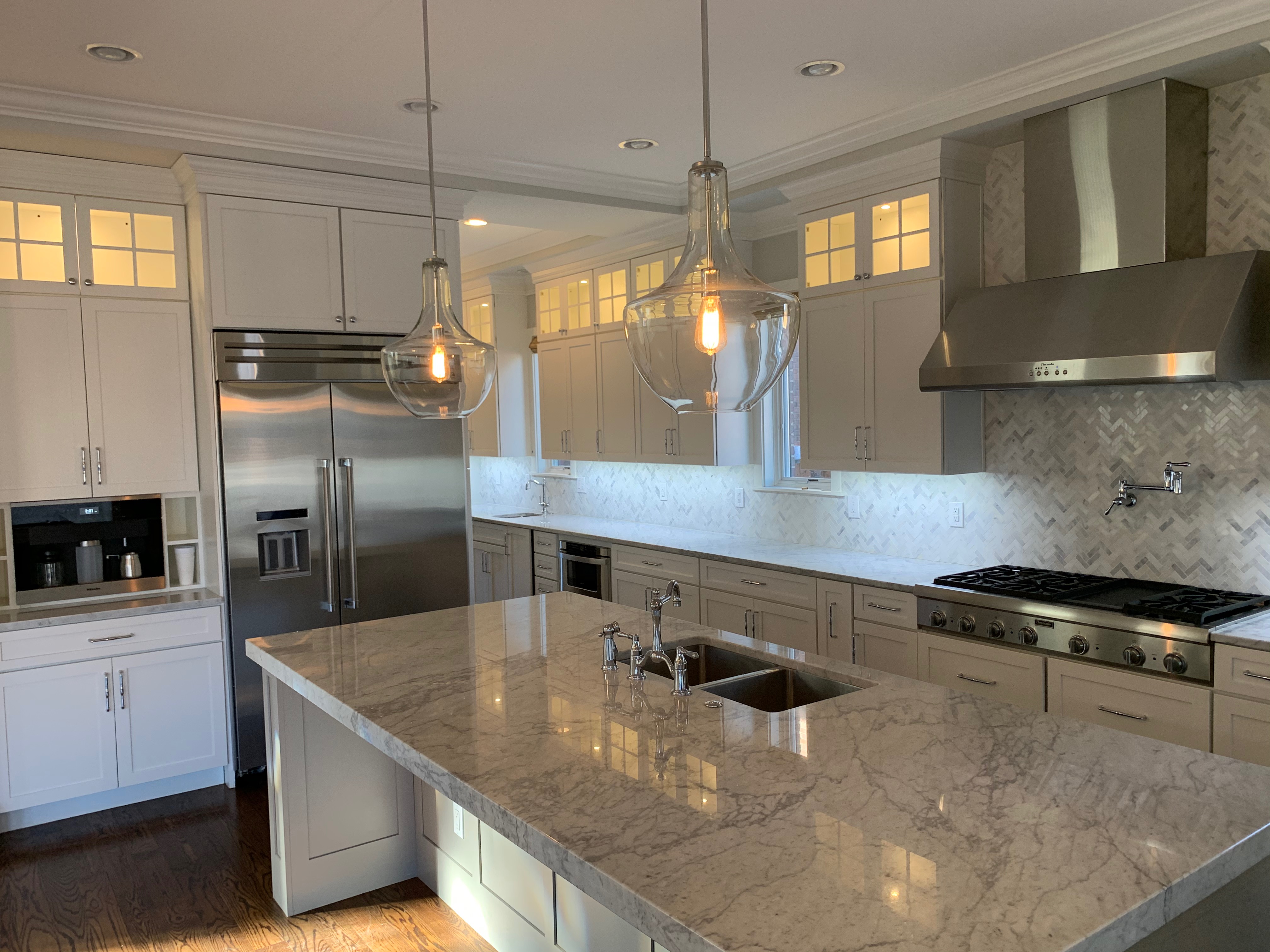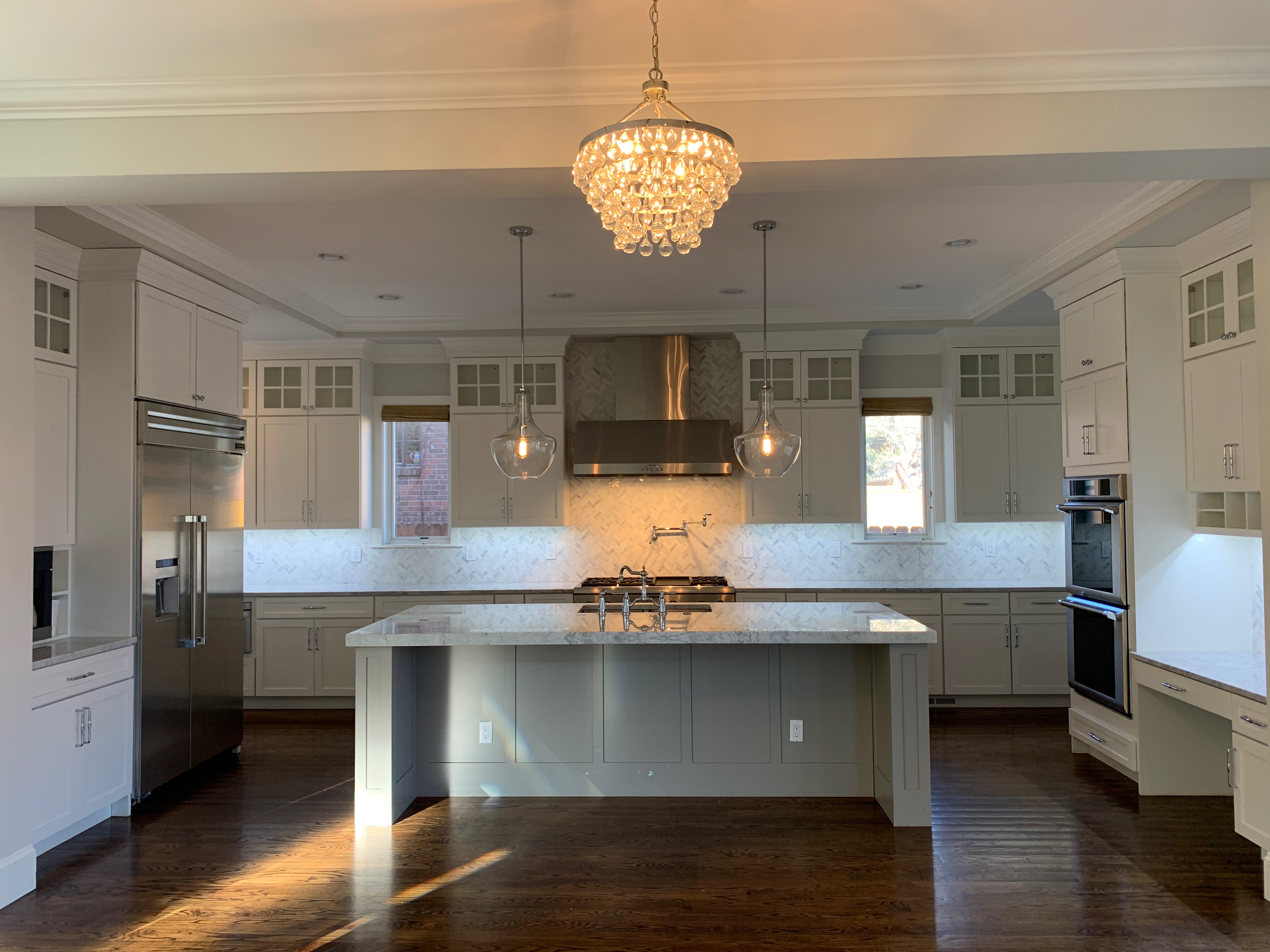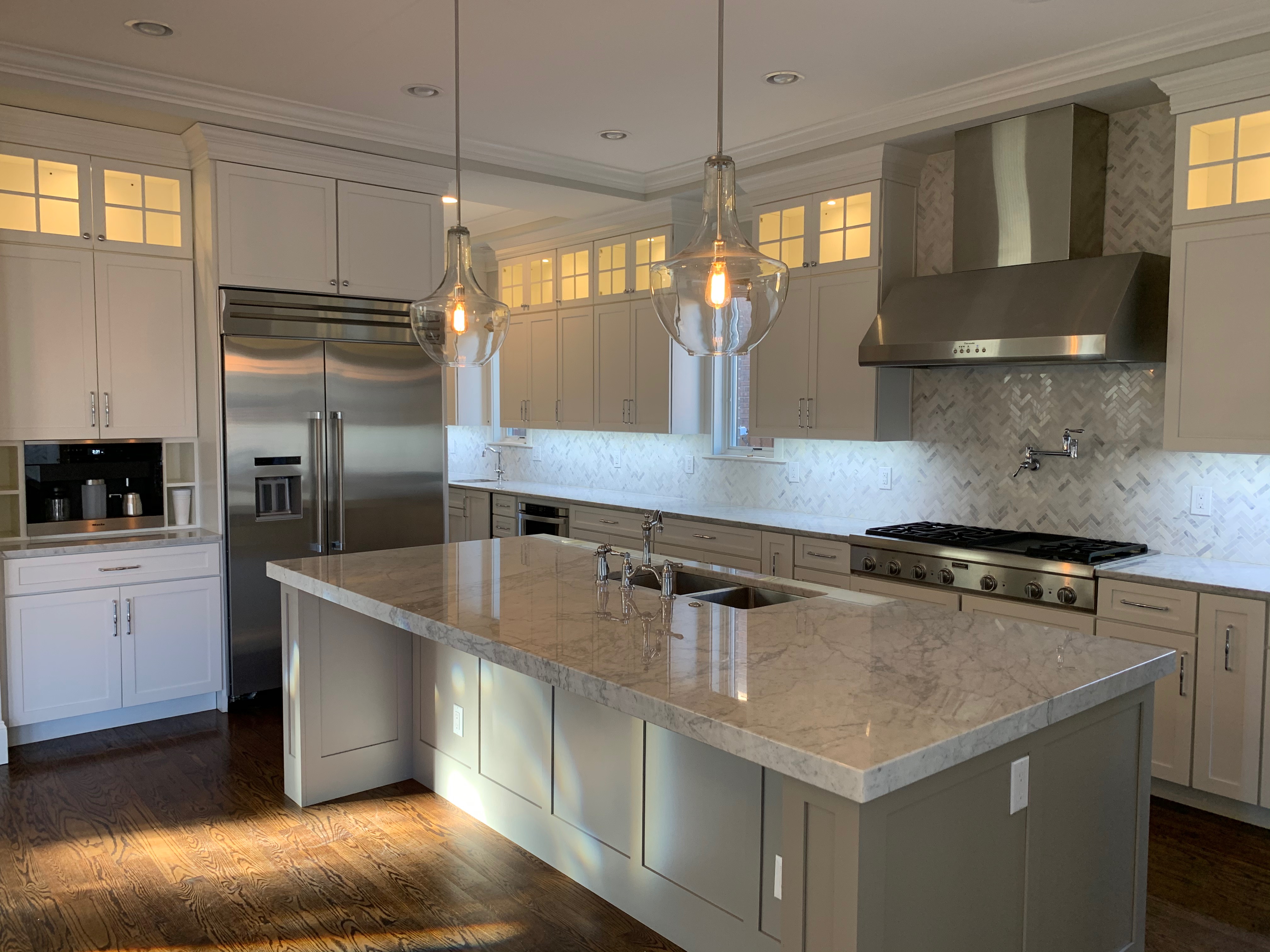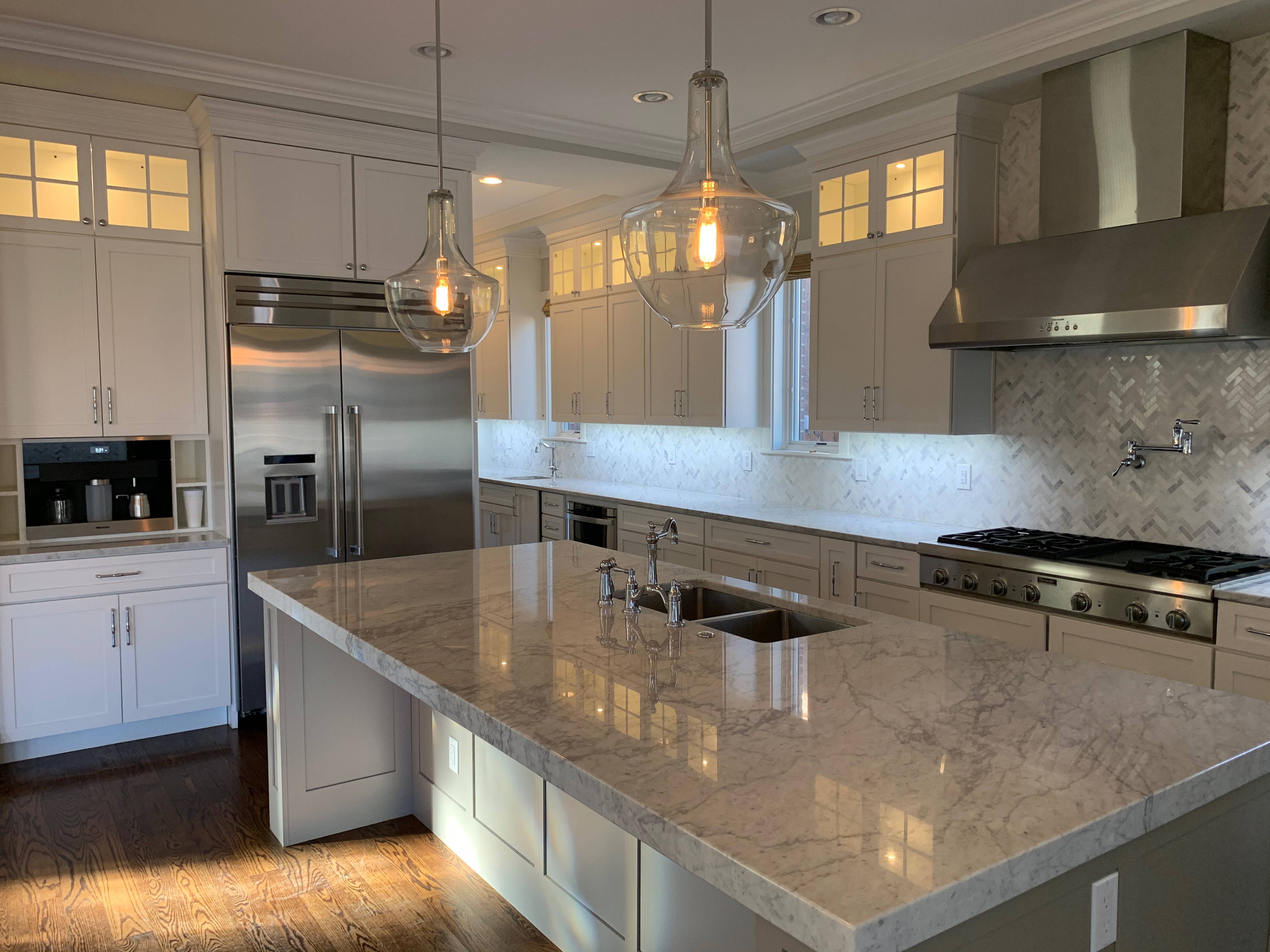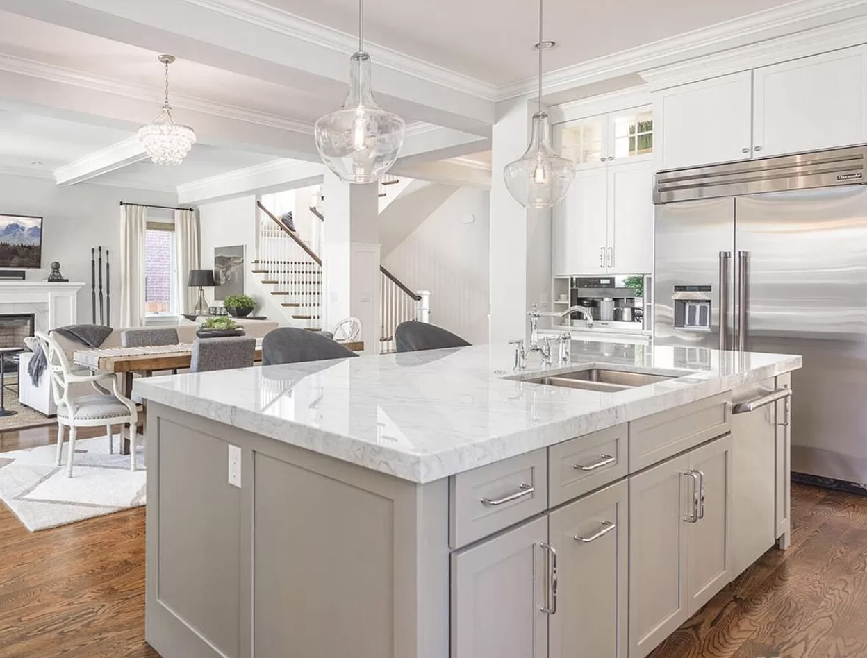 Stunning white Medallion Kitchen cabinets with contrasting light gray island cabinets, like new, only 6 years old! This deal is too good to be true that this newer kitchen package is available for resale. The cabinets are dovetail with soft close drawers. The kitchen has beautiful slab marble counter tops. High-end Appliances include Thermador stainless steel Refrigerator, Hood and dishwasher, ice maker, wine fridge, warming drawer and microwave drawer. The kitchen is available anytime. Sub-contractors are available to hire to remove the kitchen. Professional movers are also available to hire. Price for the package below.