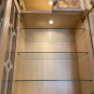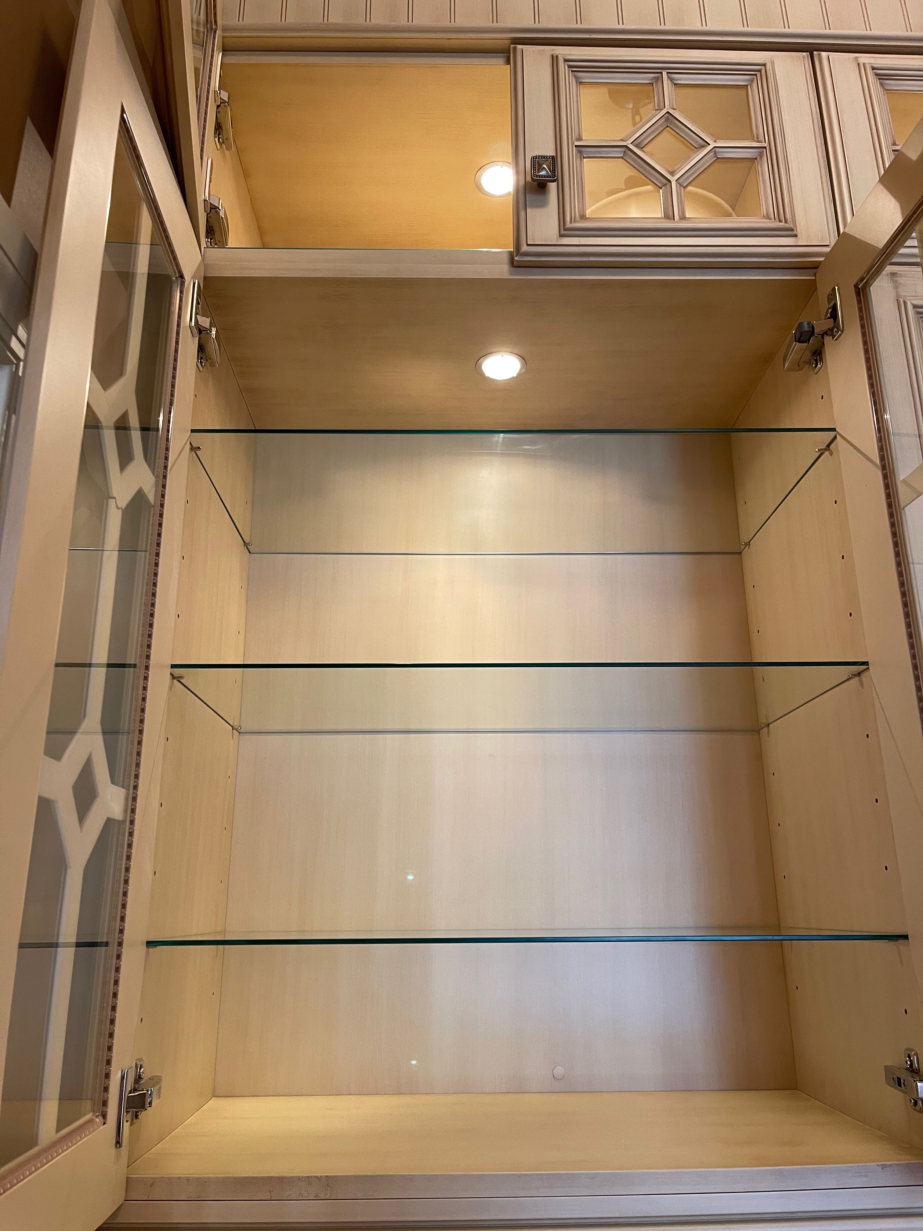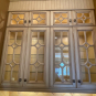 2-Four door glass front cabinets the two door cabinets are stacked and can be separated Dim.: 29”w x 58 5/8”w/crown x 12”d