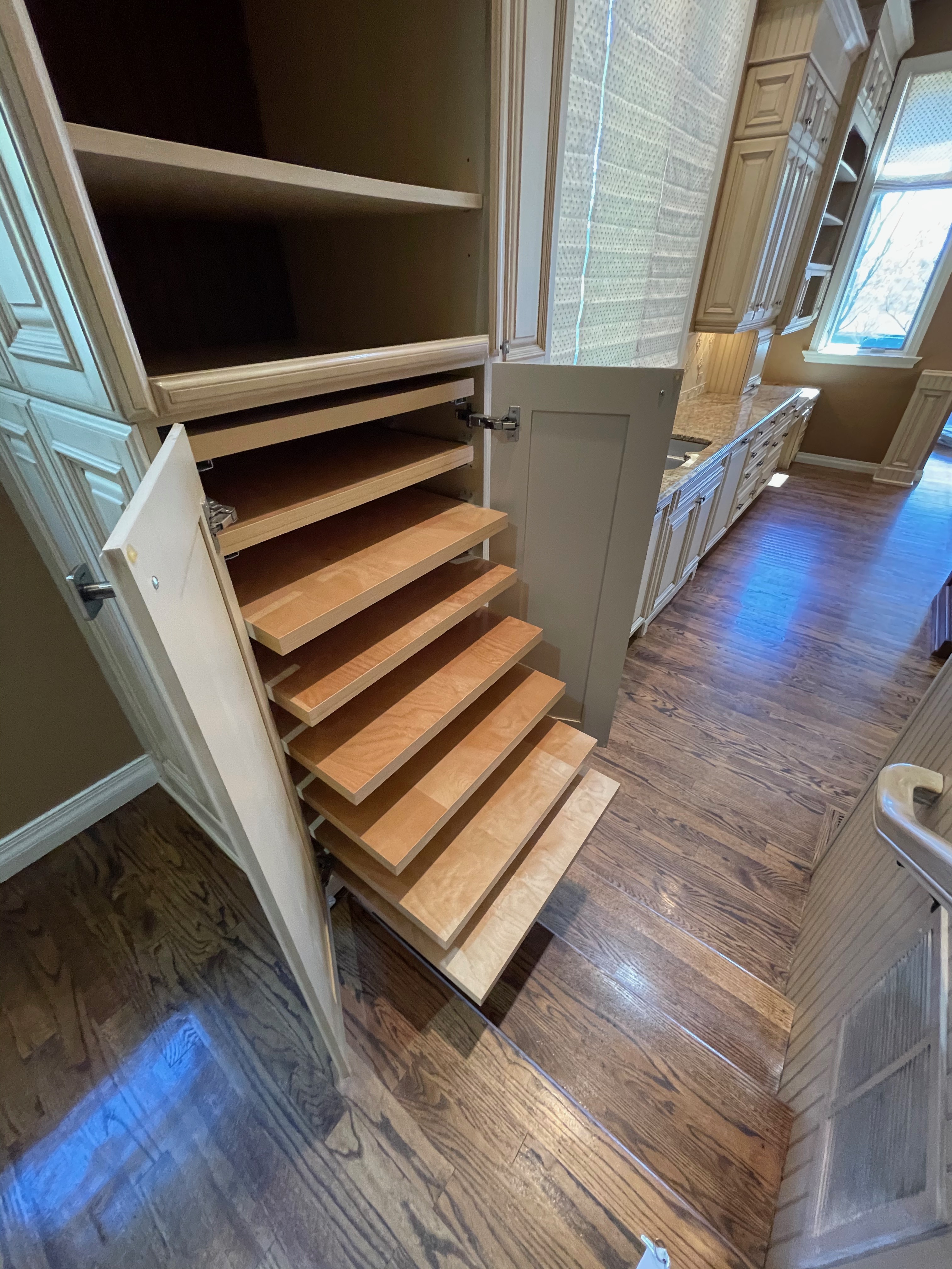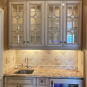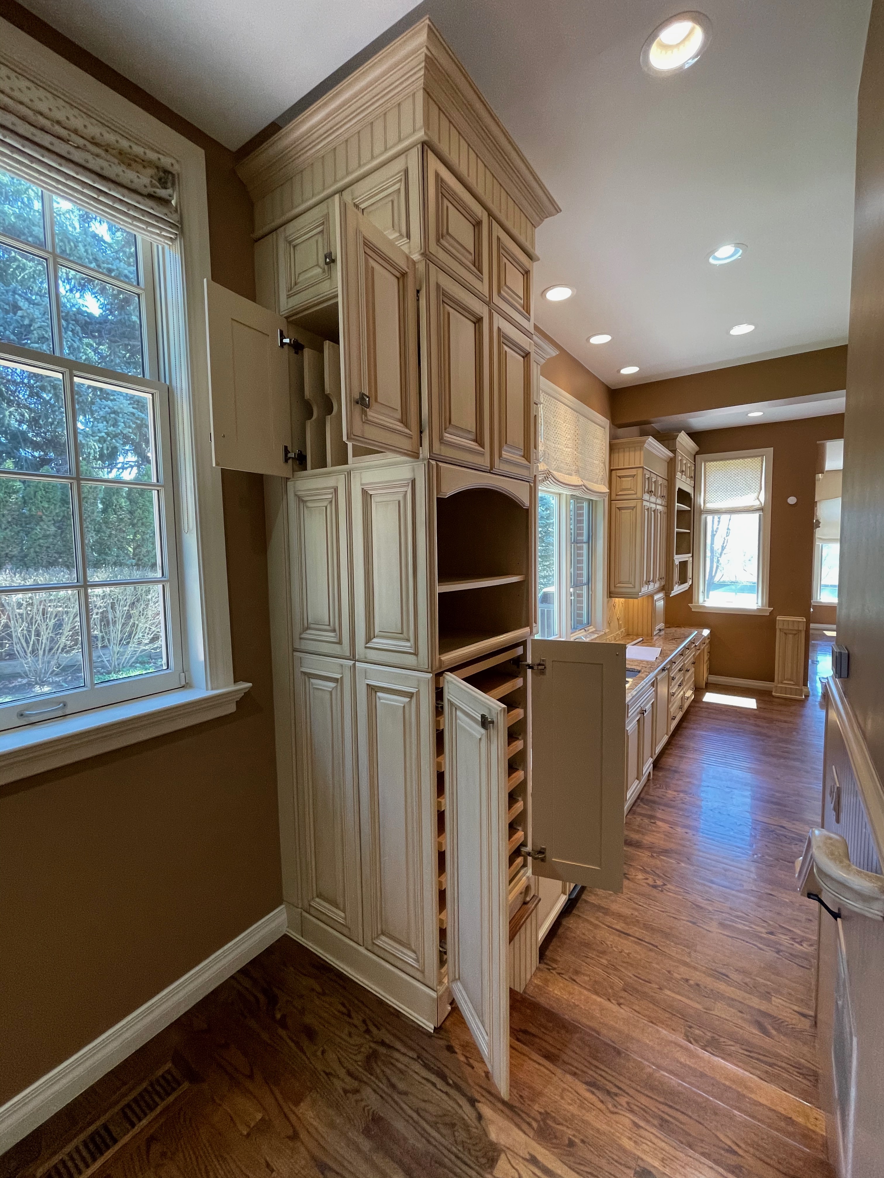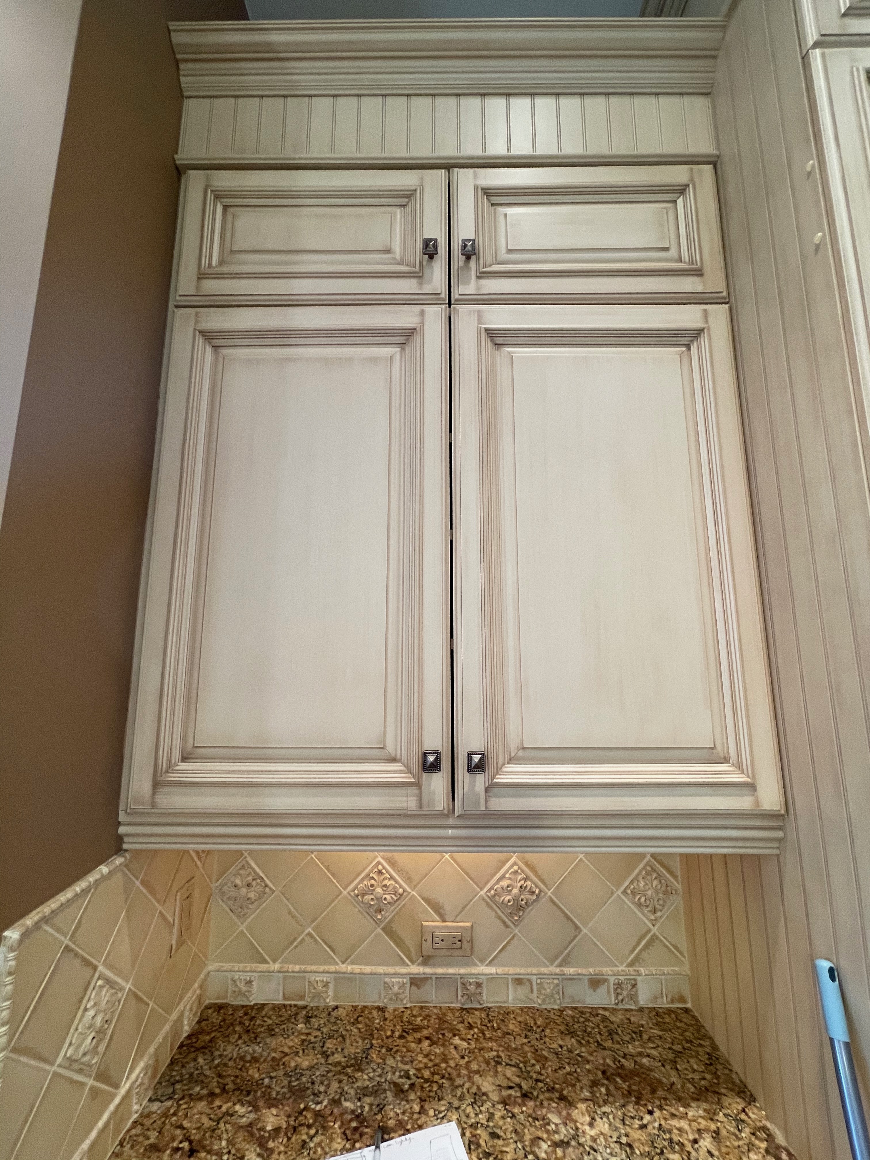 1-Four door wall cabinet to the left of the sink Dim.:25”w/26”w x 61 ½”h w/ crown x 15”d