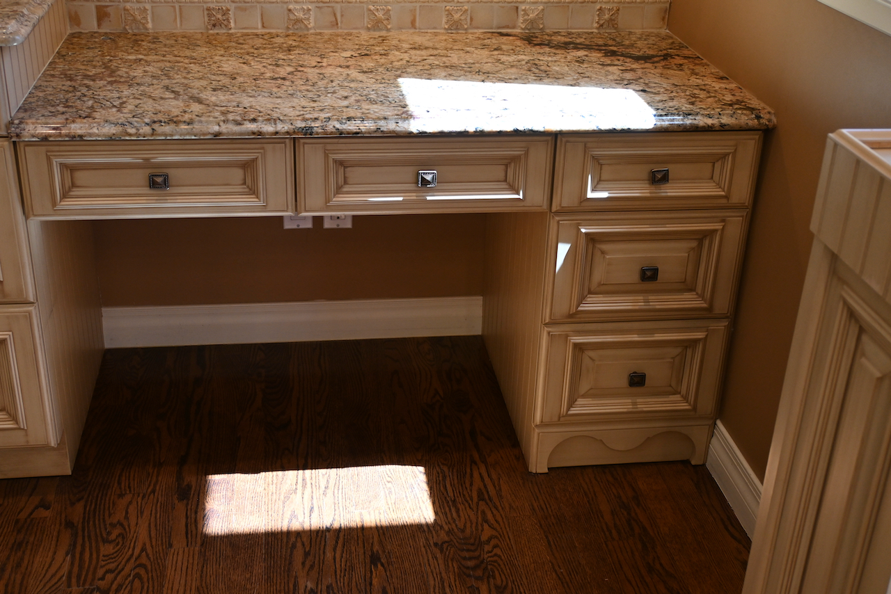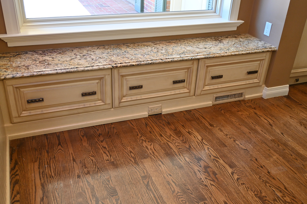 Window seat cabinets with three drawers and granite top Dim.: 70”w x 18”h x 12”d