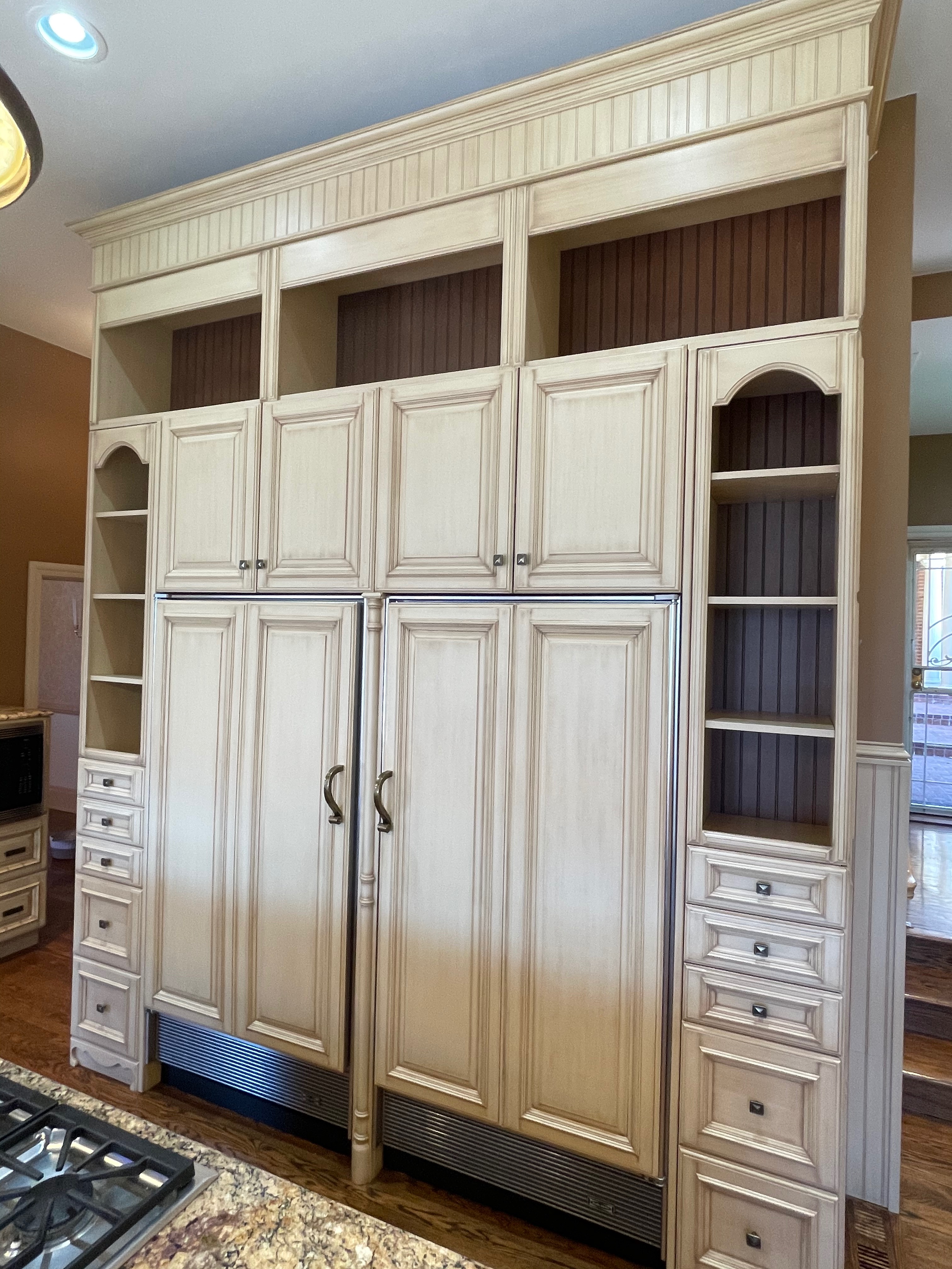 2-Shelving and 5 drawer tall cabinet on either side of the Refrigerator/Freezer Dim. 15”w x 99”h x 15”d