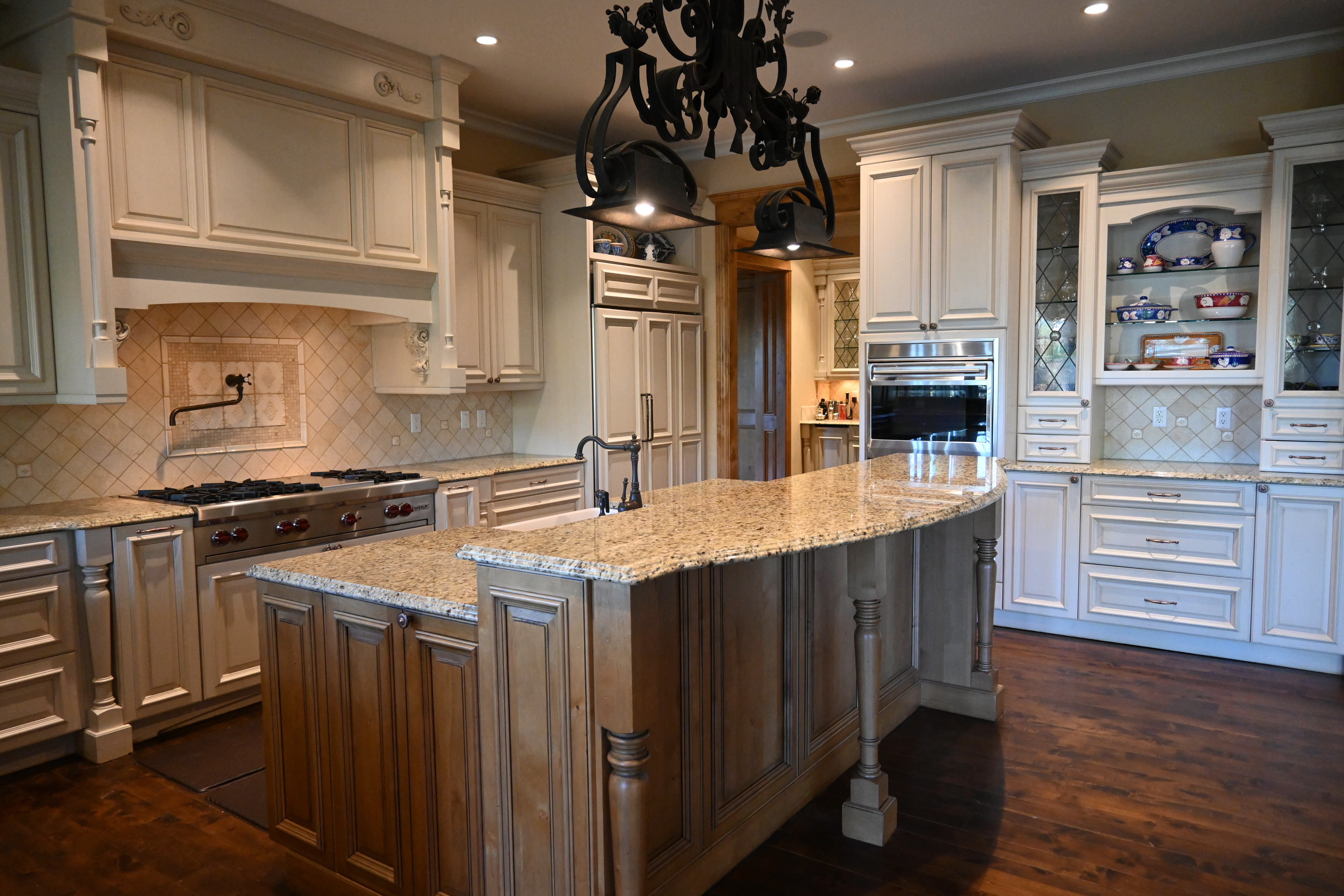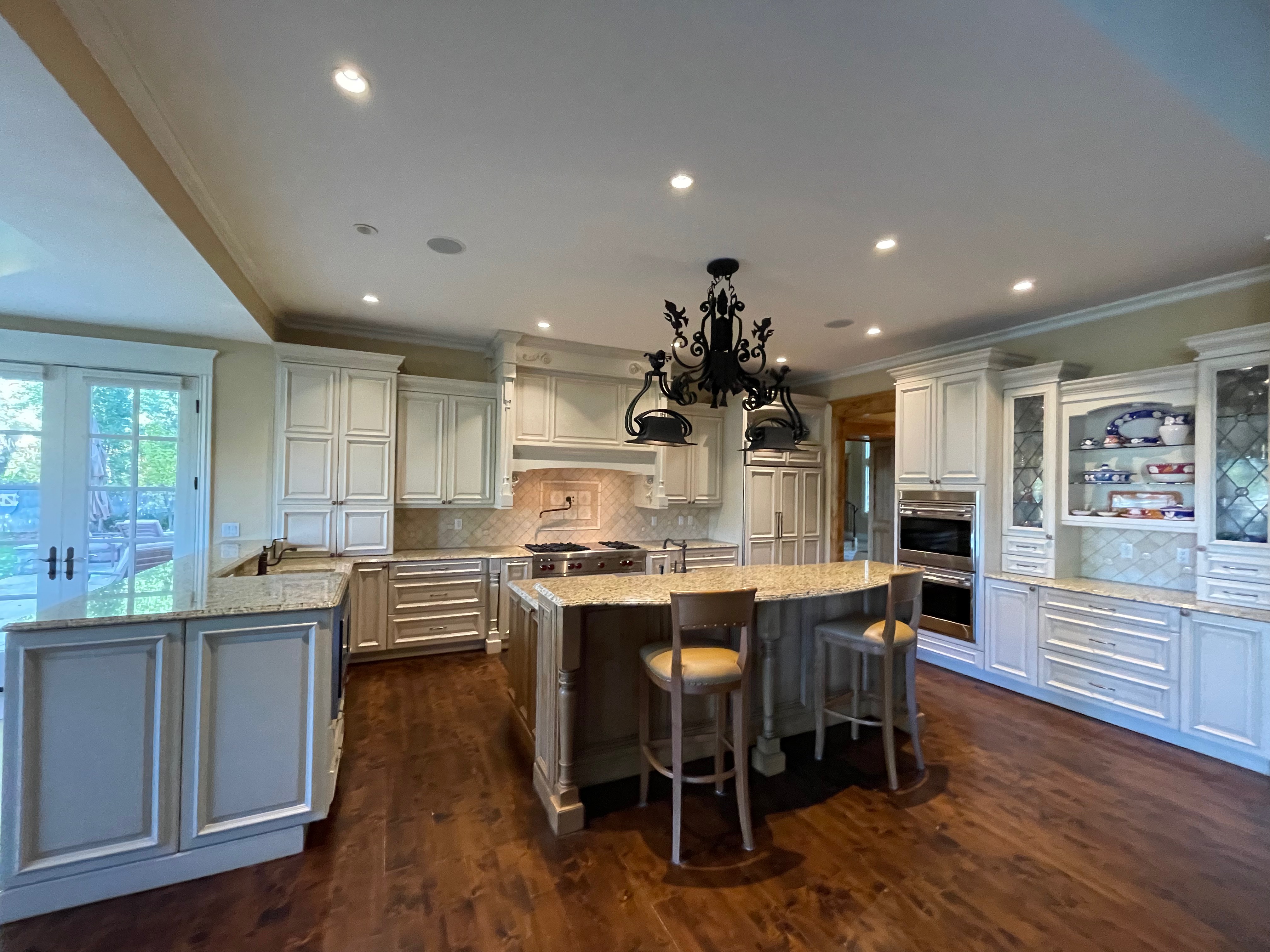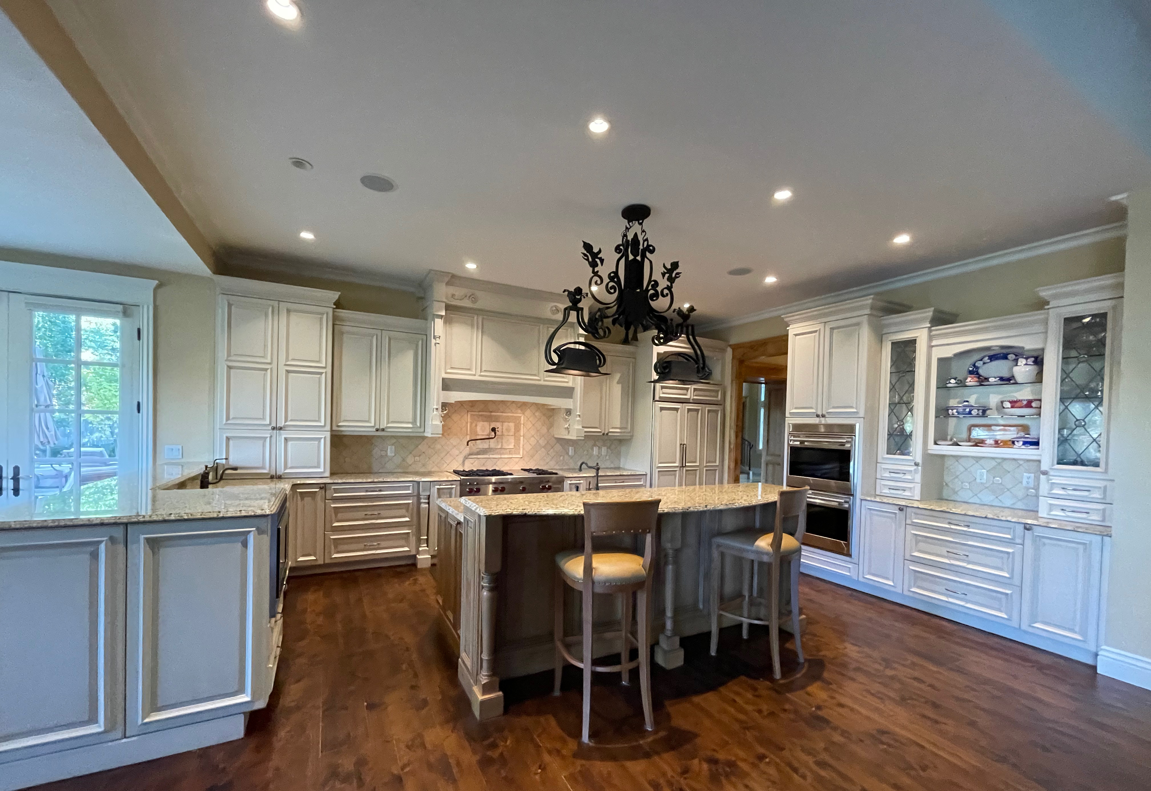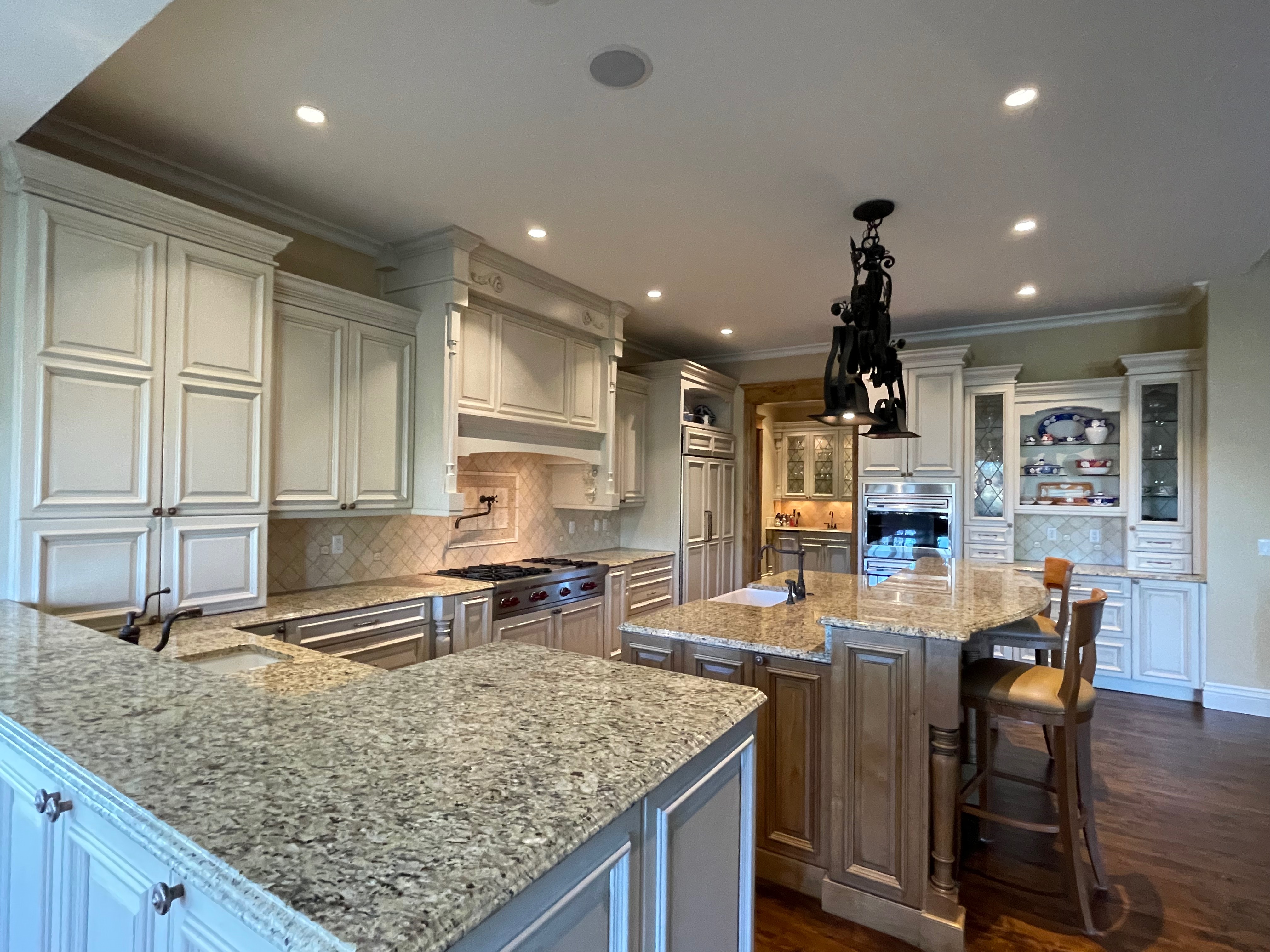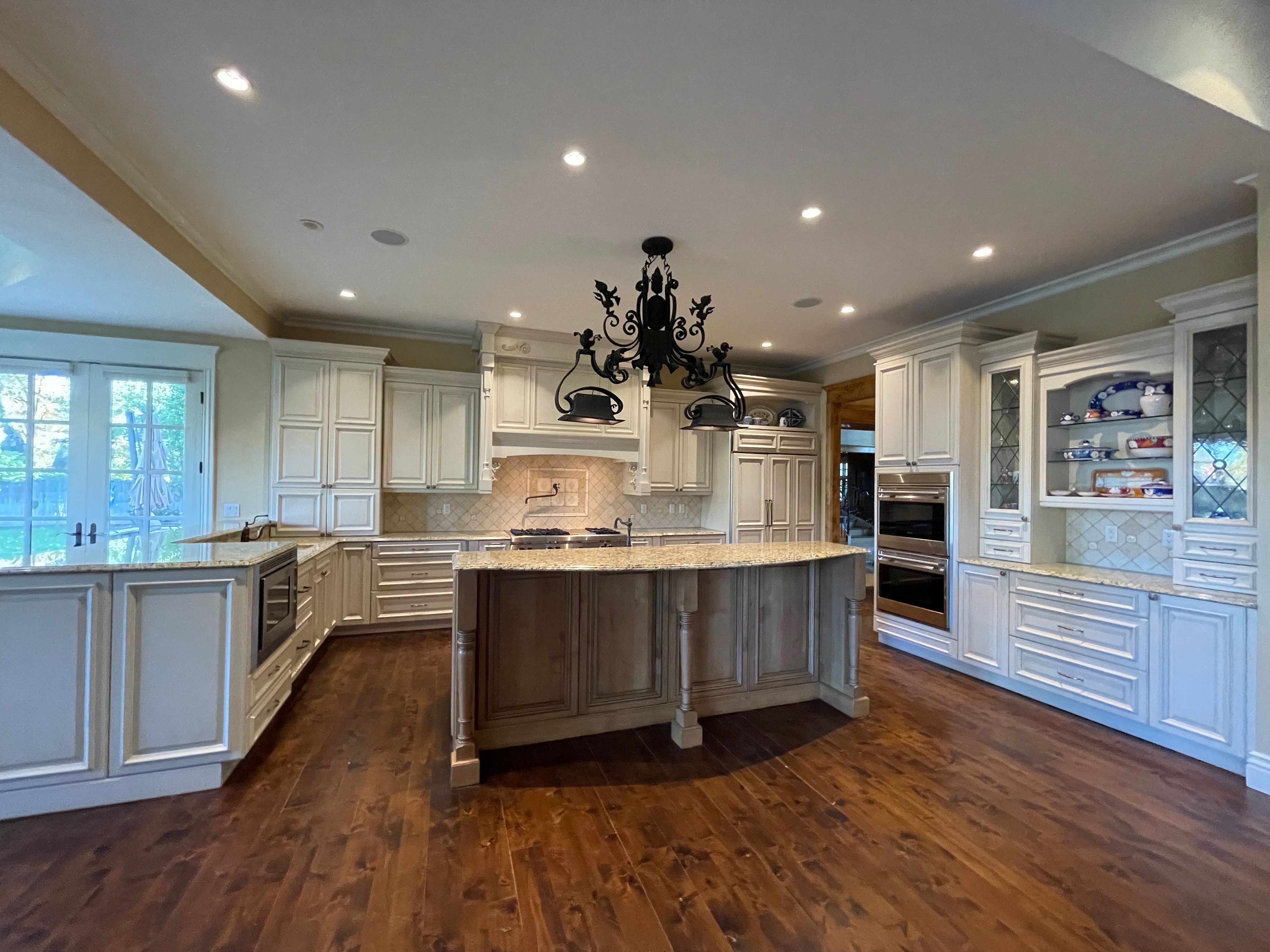 Very Nice! French country style kitchen with Crestwood cabinets, island & matching wet bar coming out of an exclusive estate. The cabinetry was made in Salina, Kansas. This beautiful set features perimeter and wet bar cabinets in a creamy off-white with the island having contrasting wood cabinets. The appliances included are the Scotsman ice maker, Asko dishwasher, hood insert and microwave. The slab granite counter tops, sinks, faucets sets and disposal are part of the set. The iron chandelier over the island could be included. The kitchen will be available to be removed by a qualified buyer or sub-contractors are available to be hired tbd late February/March.