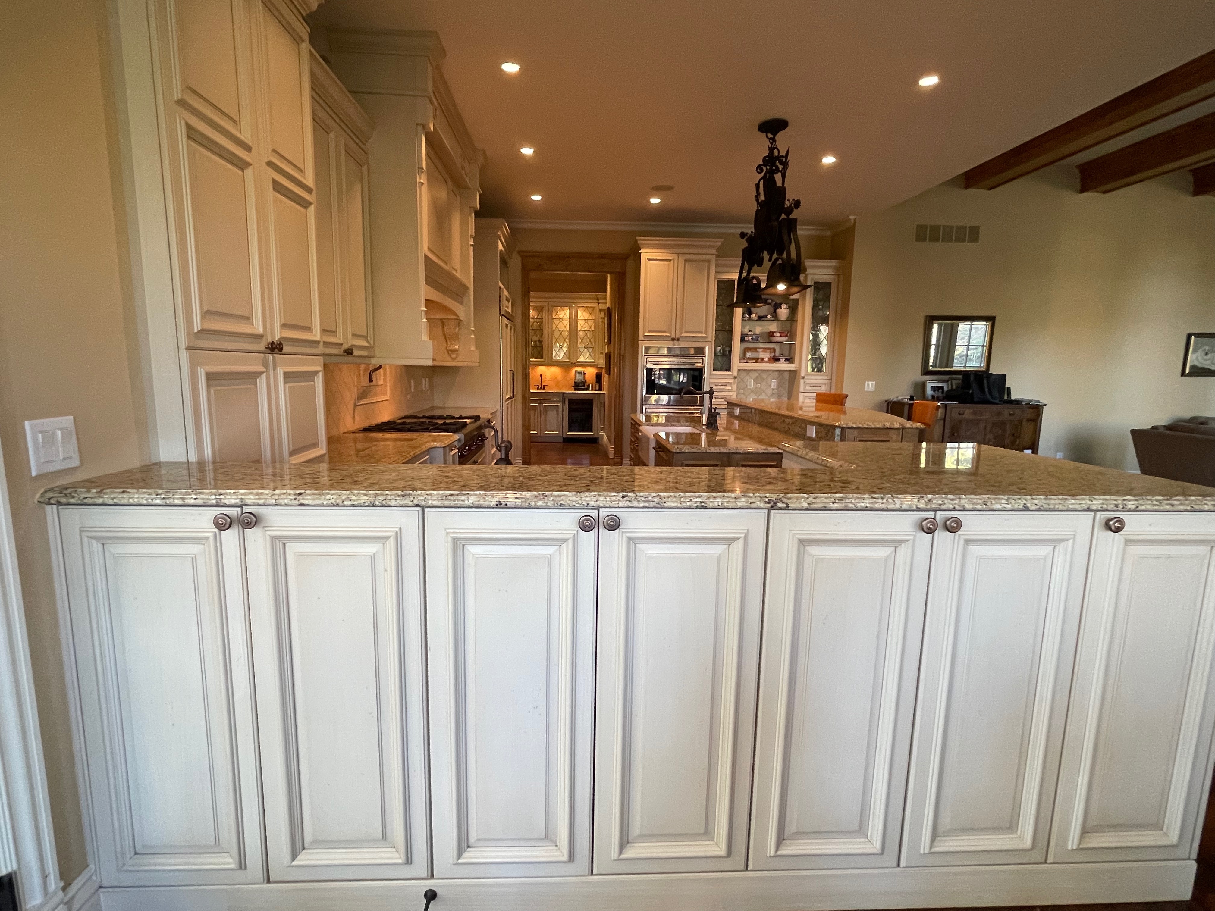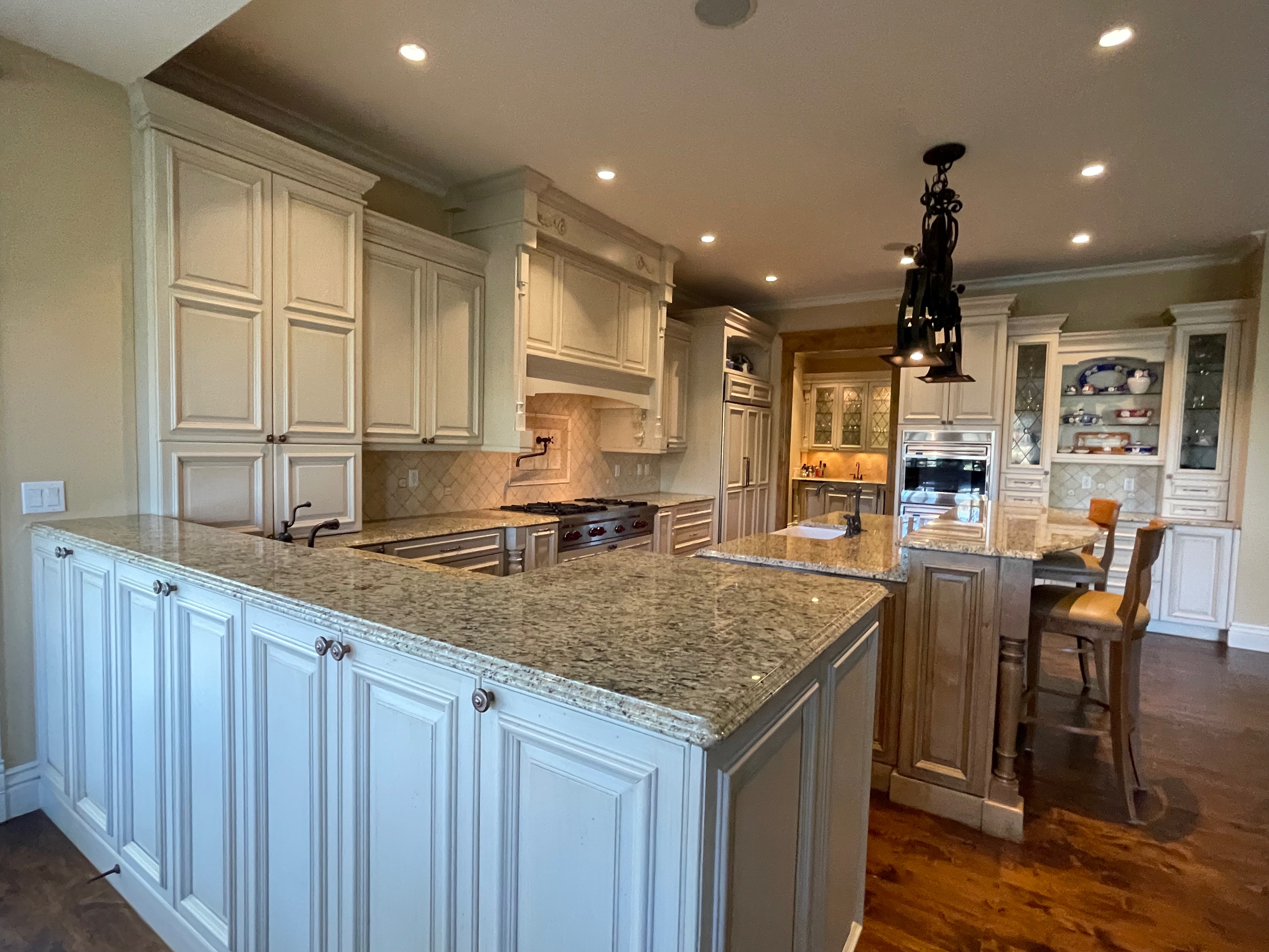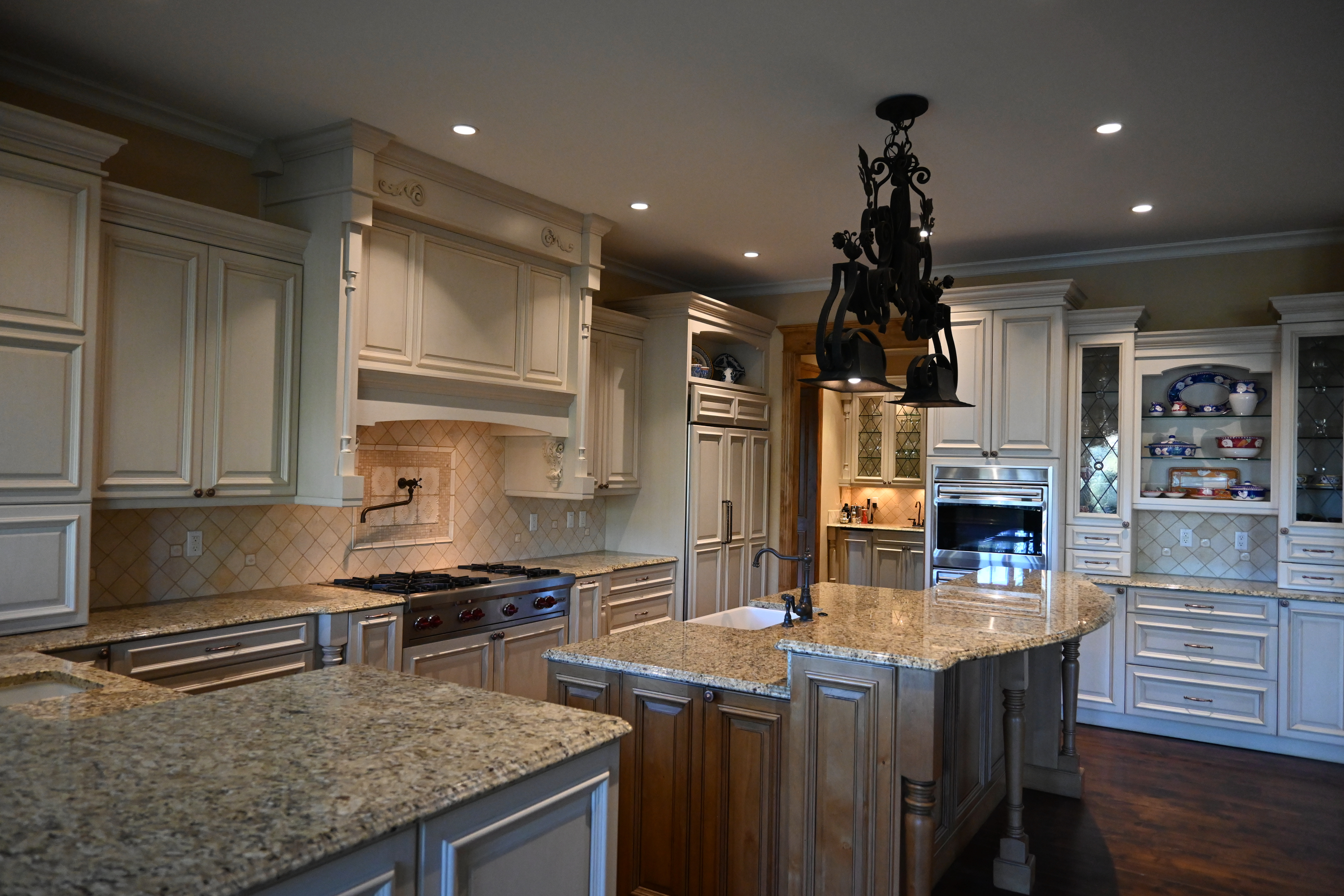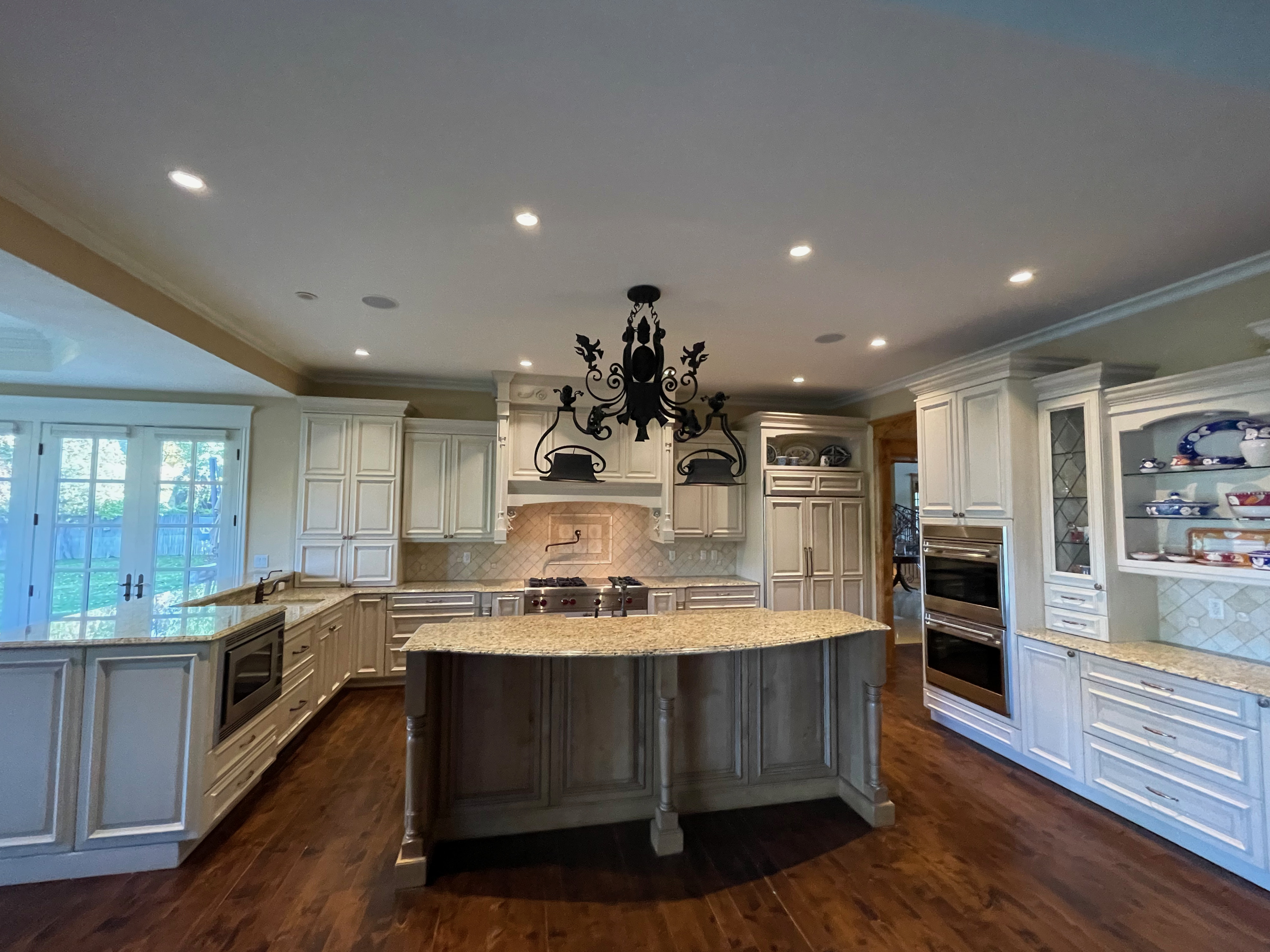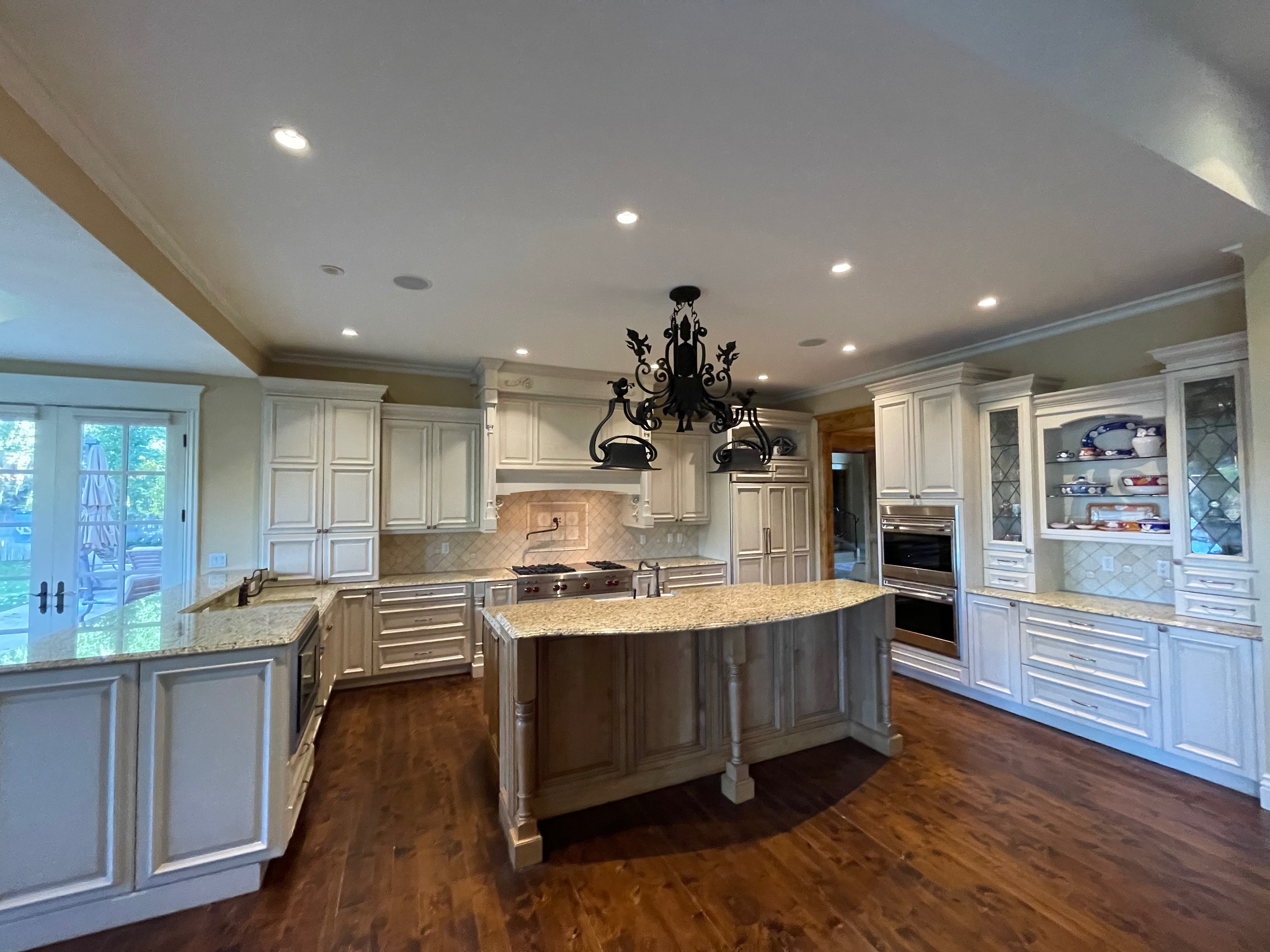 Very Nice! French country style kitchen with Crestwood cabinets, island & matching wet bar coming out of an exclusive estate. The cabinetry was made in Salina, Kansas. This beautiful set features perimeter and wet bar cabinets in a creamy off-white with the island having contrasting wood cabinets. The appliances included are the Scotsman ice maker, Asko dishwasher, hood insert and microwave. The slab granite counter tops, sinks, faucets sets and disposal are part of the set. The iron chandelier over the island could be included. The kitchen will be available to be removed by a qualified buyer or sub-contractors are available to be hired tbd late February/March.