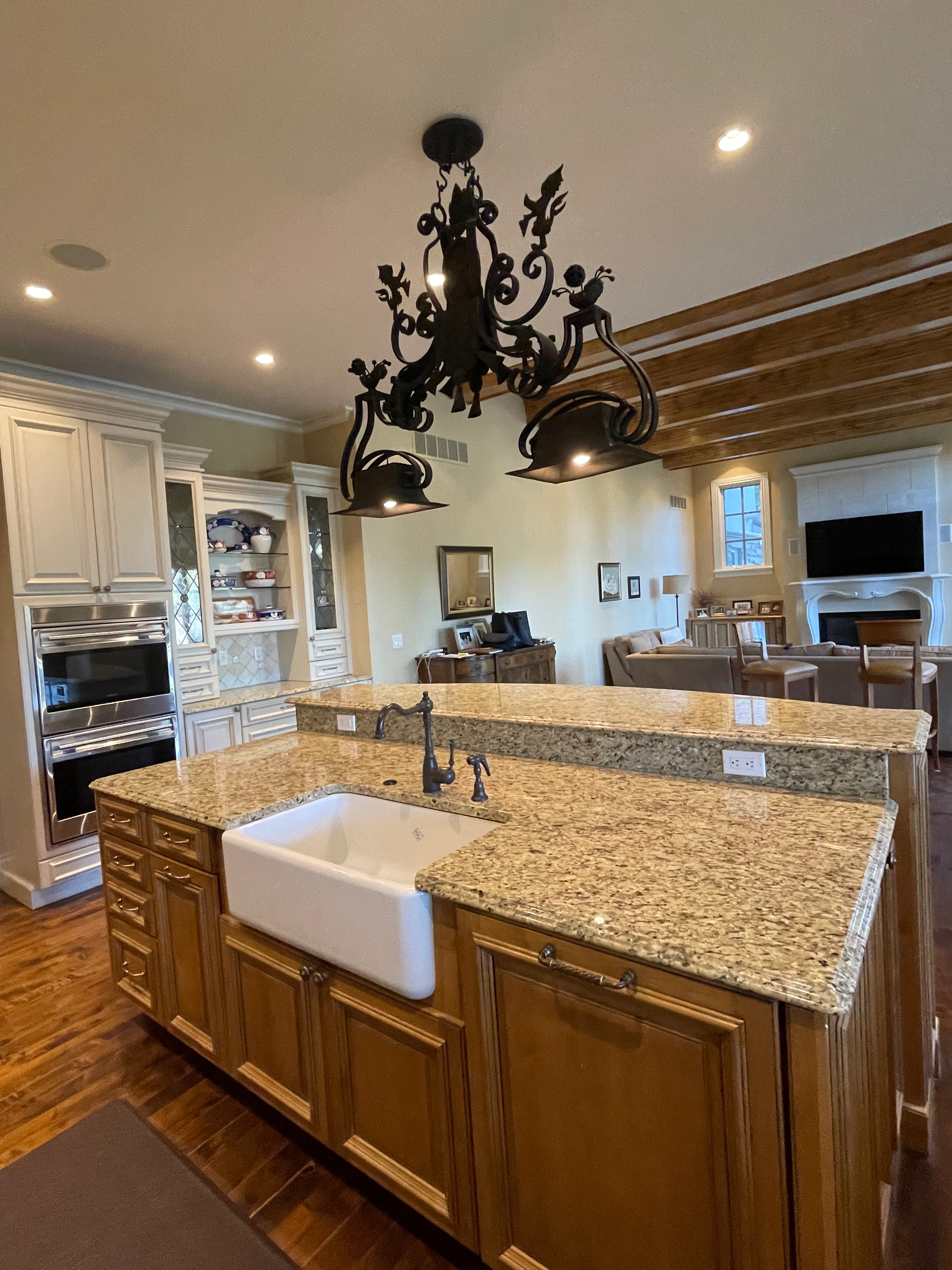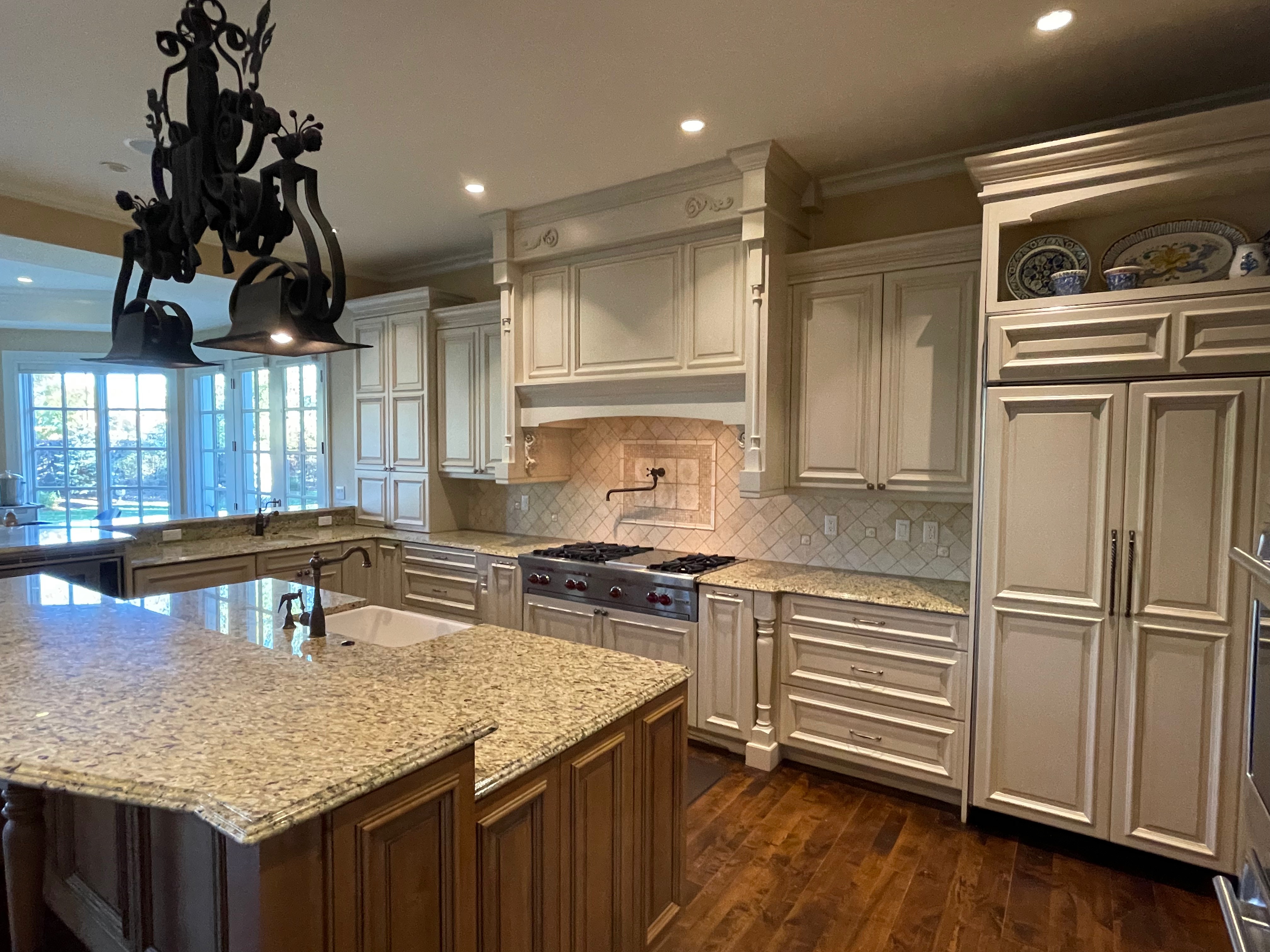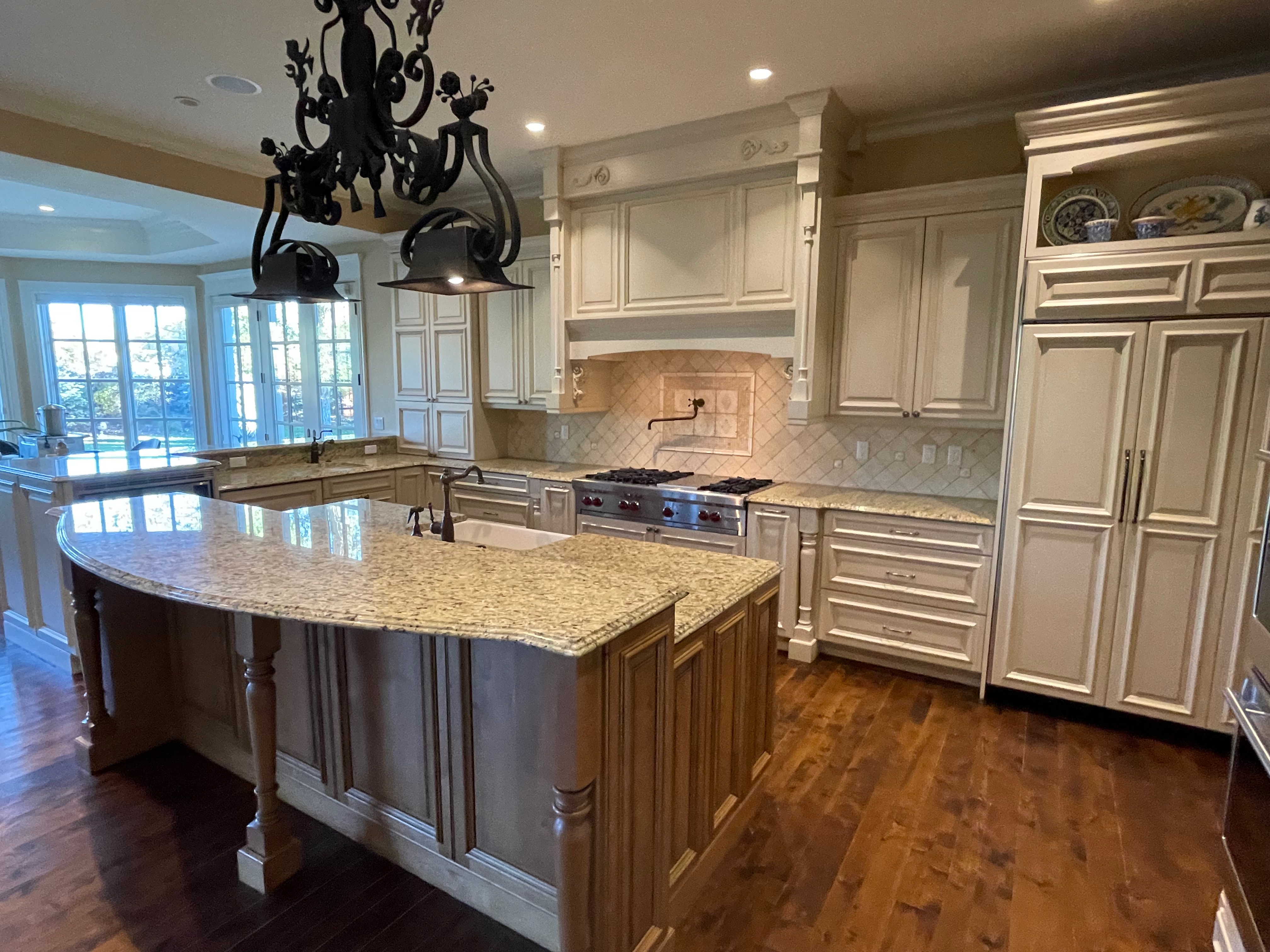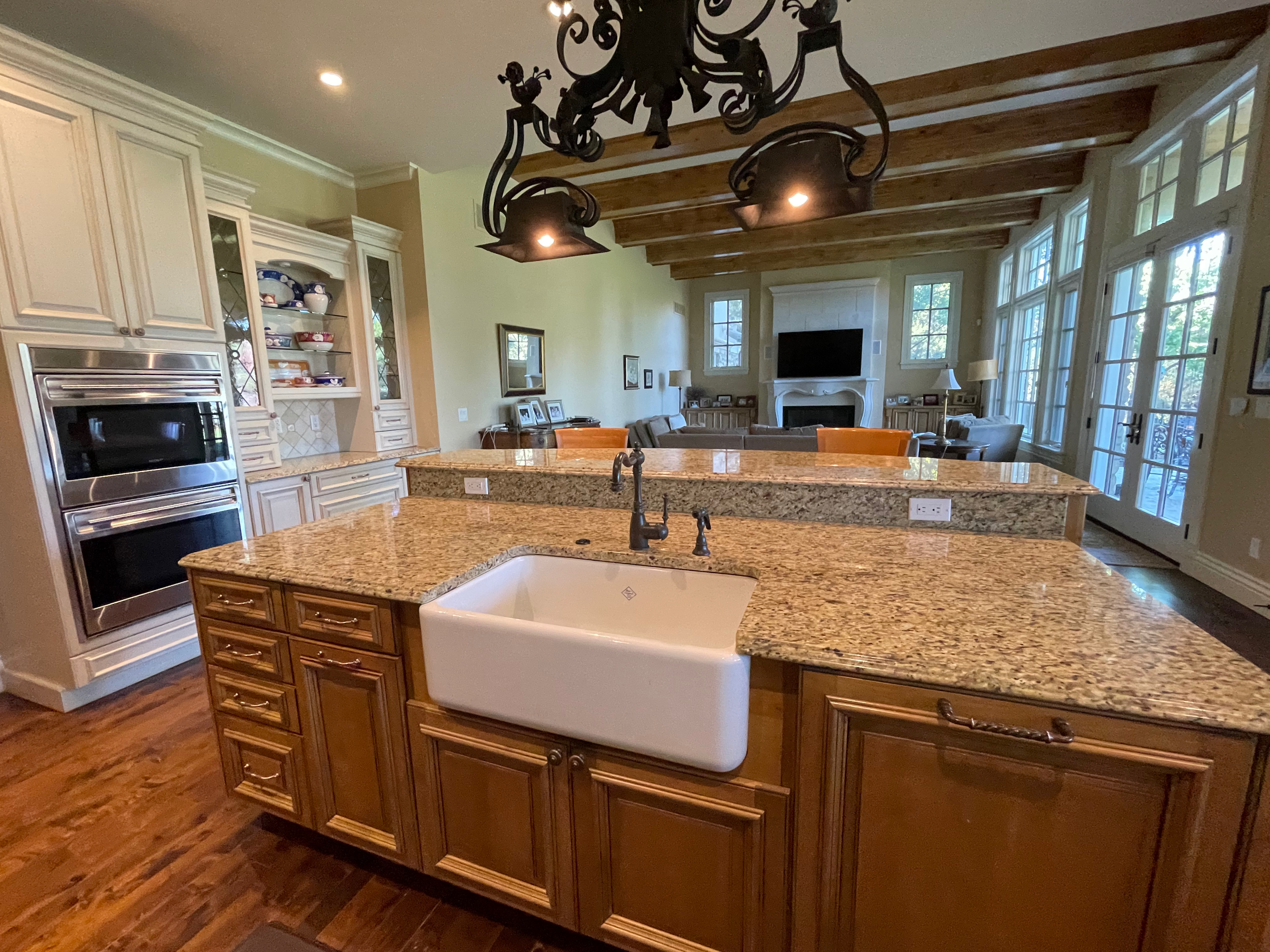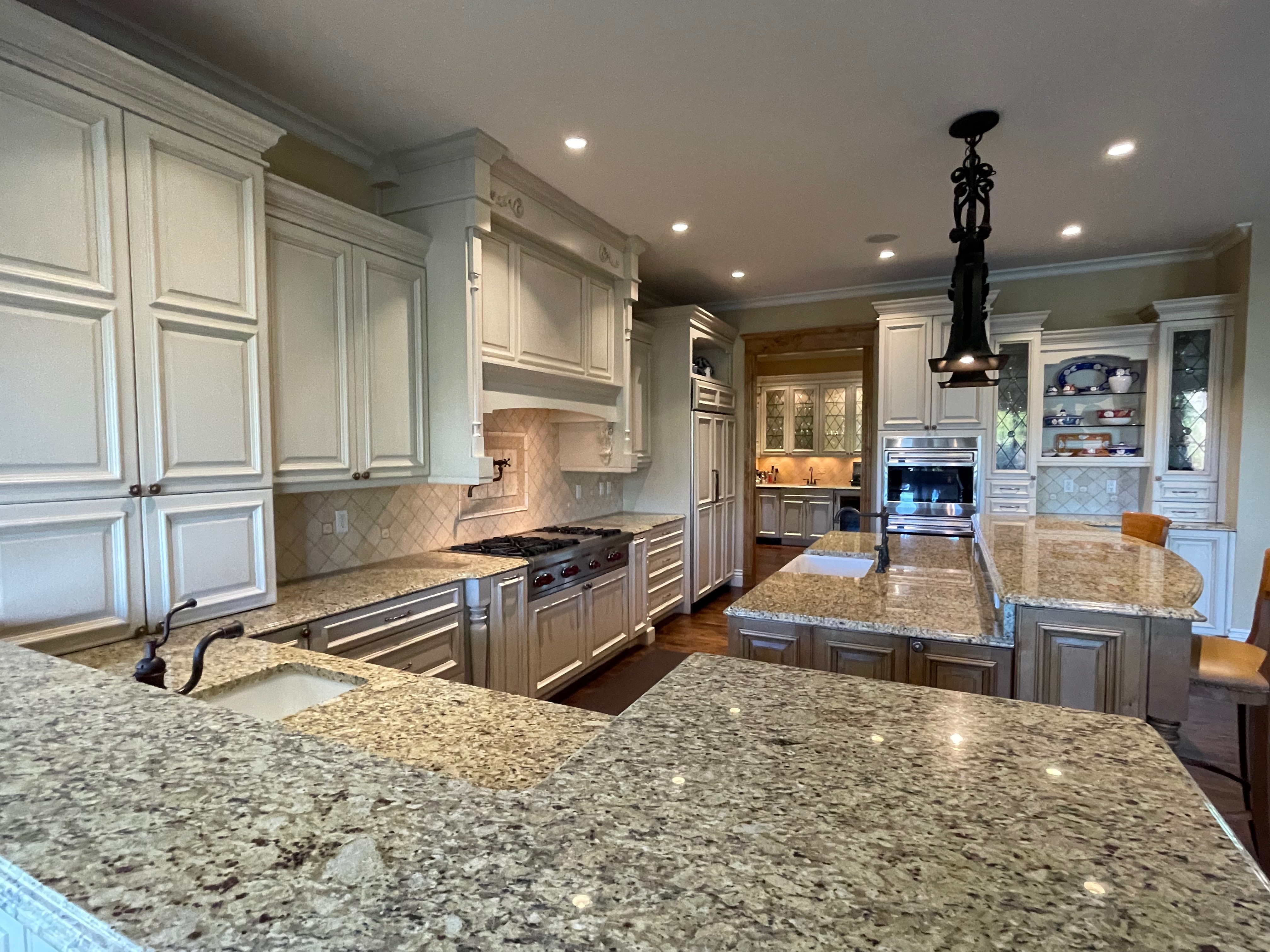 Very Nice! French country style kitchen with Crestwood cabinets, island & matching wet bar coming out of an exclusive estate. The cabinetry was made in Salina, Kansas. This beautiful set features perimeter and wet bar cabinets in a creamy off-white with the island having contrasting wood cabinets. The appliances included are the Scotsman ice maker, Asko dishwasher, hood insert and microwave. The slab granite counter tops, sinks, faucets sets and disposal are part of the set. The iron chandelier over the island could be included. The kitchen will be available to be removed by a qualified buyer or sub-contractors are available to be hired tbd late February/March.