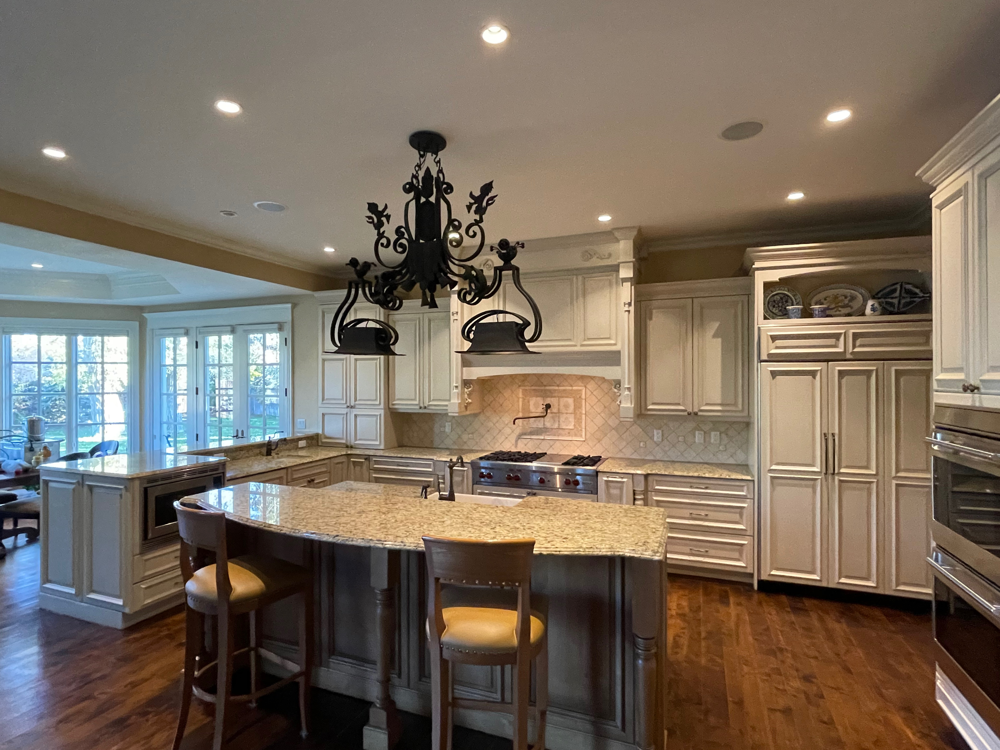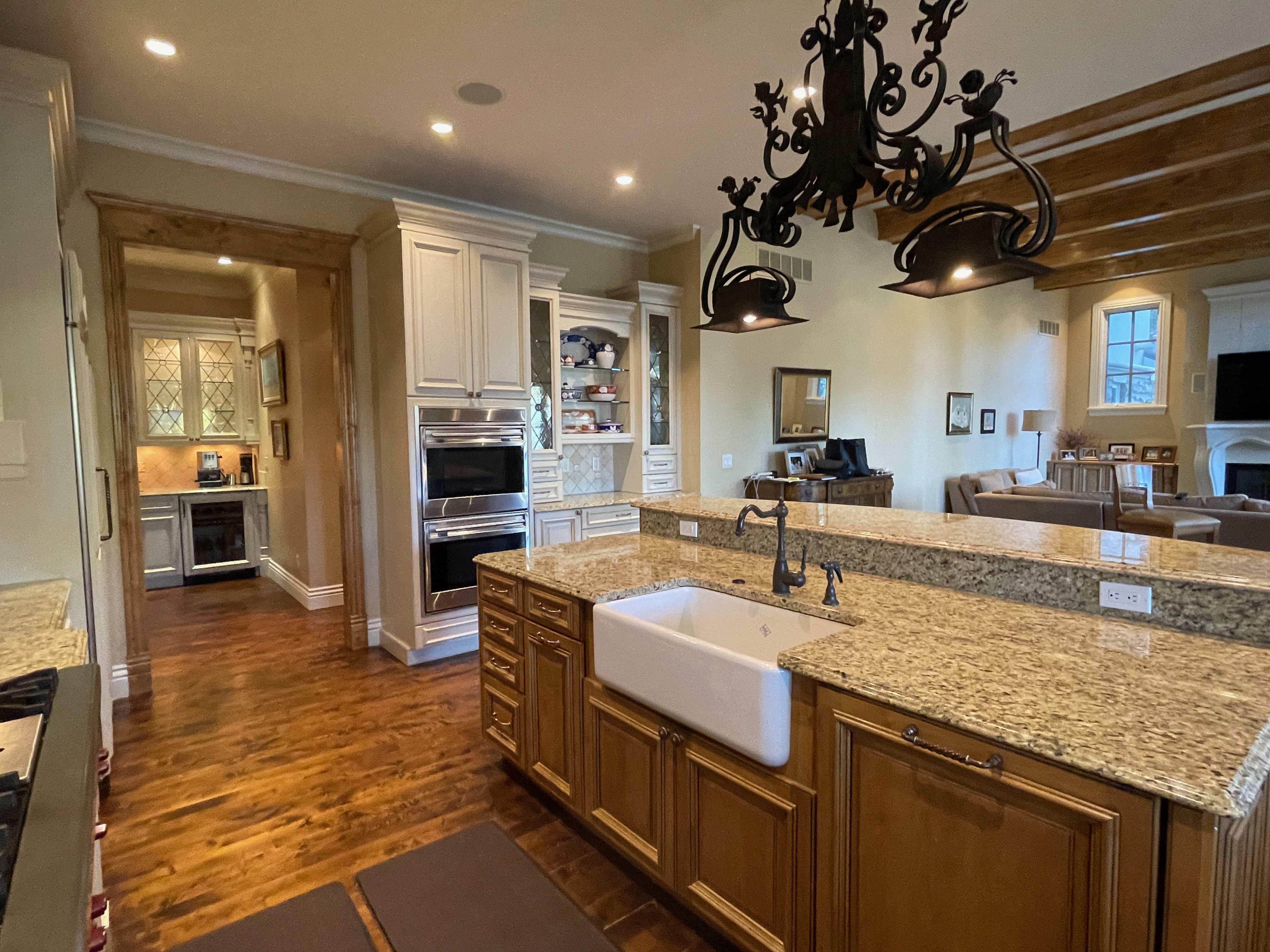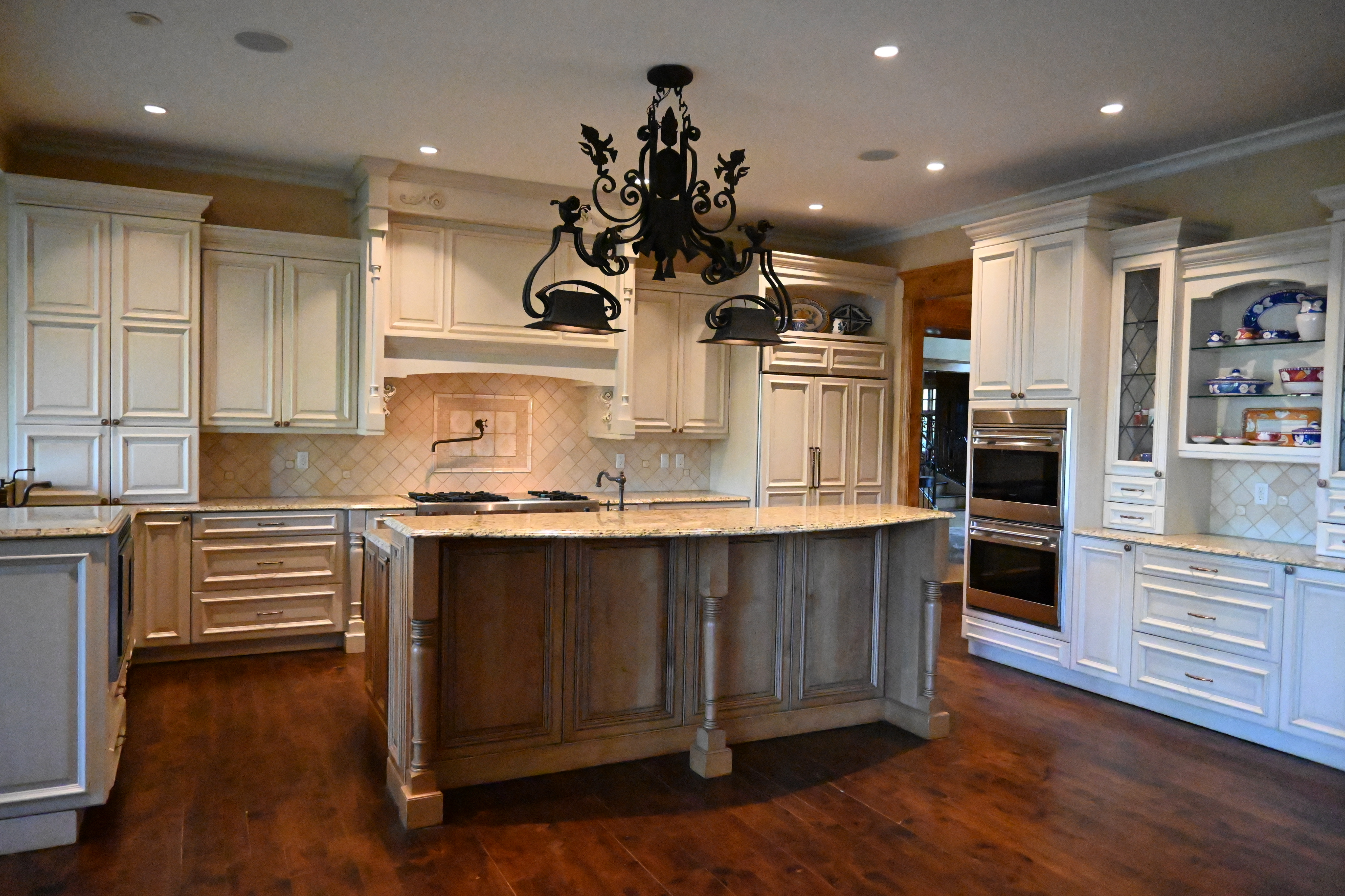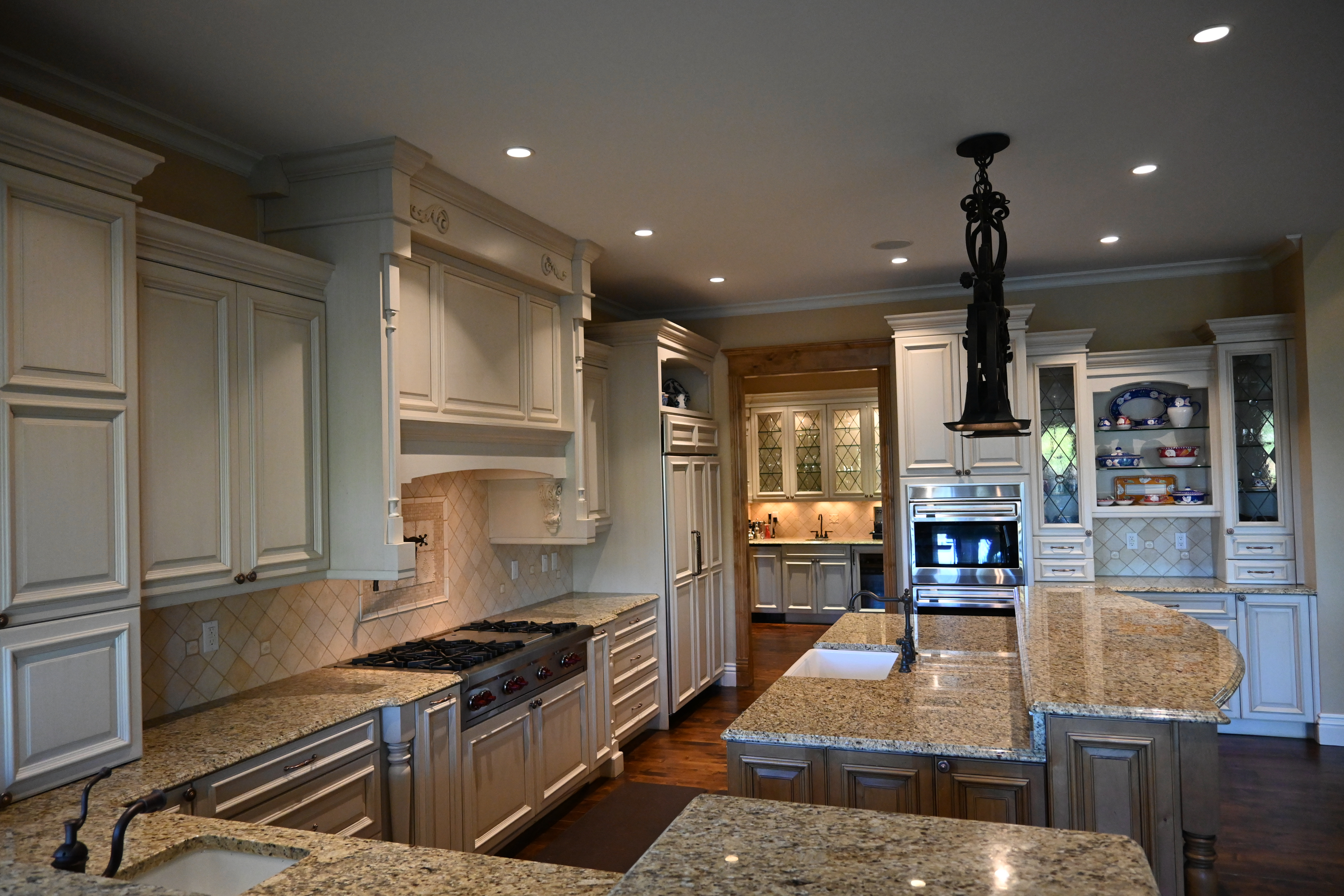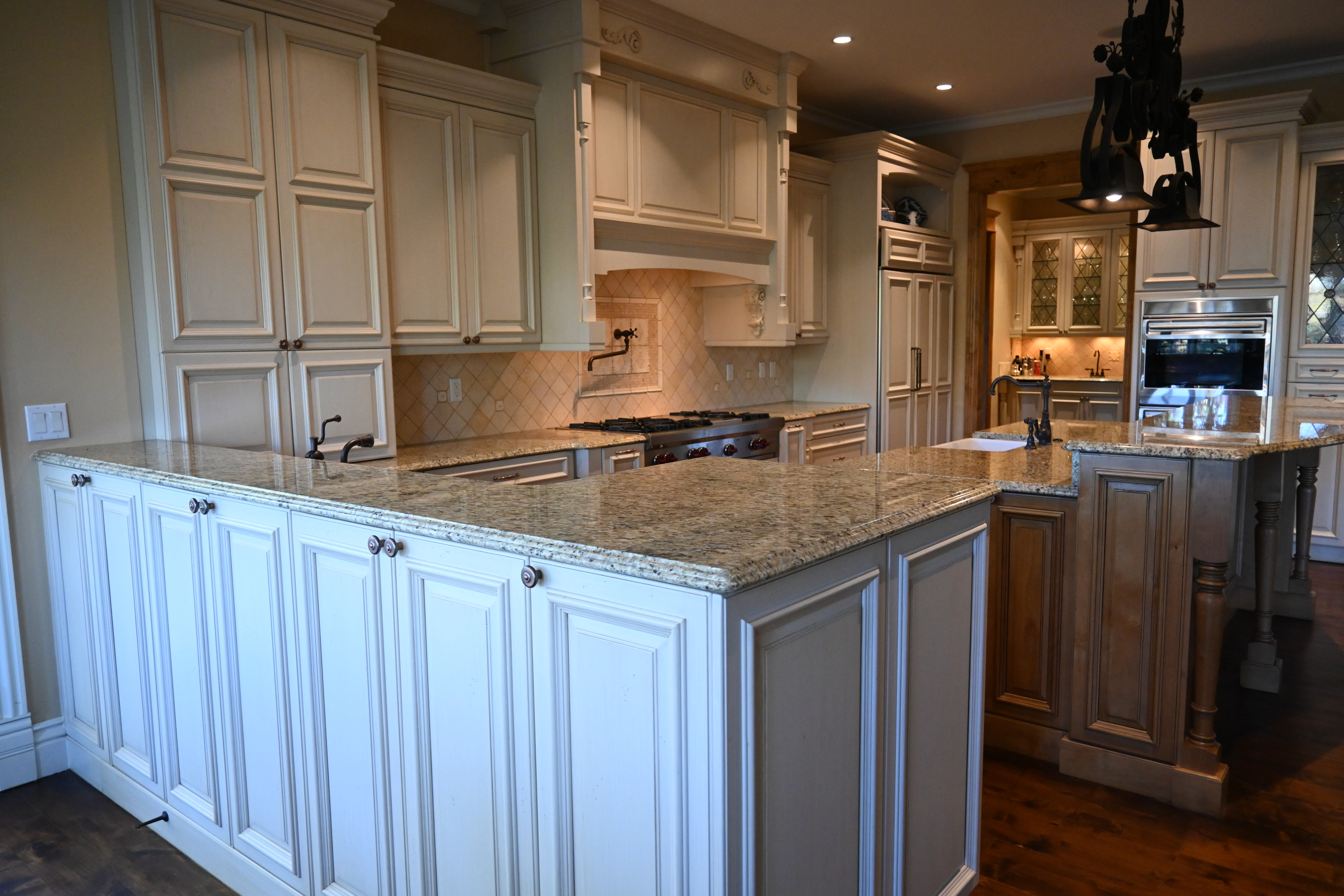 Very Nice! French country style kitchen with Crestwood cabinets, island & matching wet bar coming out of an exclusive estate. The cabinetry was made in Salina, Kansas. This beautiful set features perimeter and wet bar cabinets in a creamy off-white with the island having contrasting wood cabinets. The appliances included are the Scotsman ice maker, Asko dishwasher, hood insert and microwave. The slab granite counter tops, sinks, faucets sets and disposal are part of the set. The iron chandelier over the island could be included. The kitchen will be available to be removed by a qualified buyer or sub-contractors are available to be hired tbd late February/March.