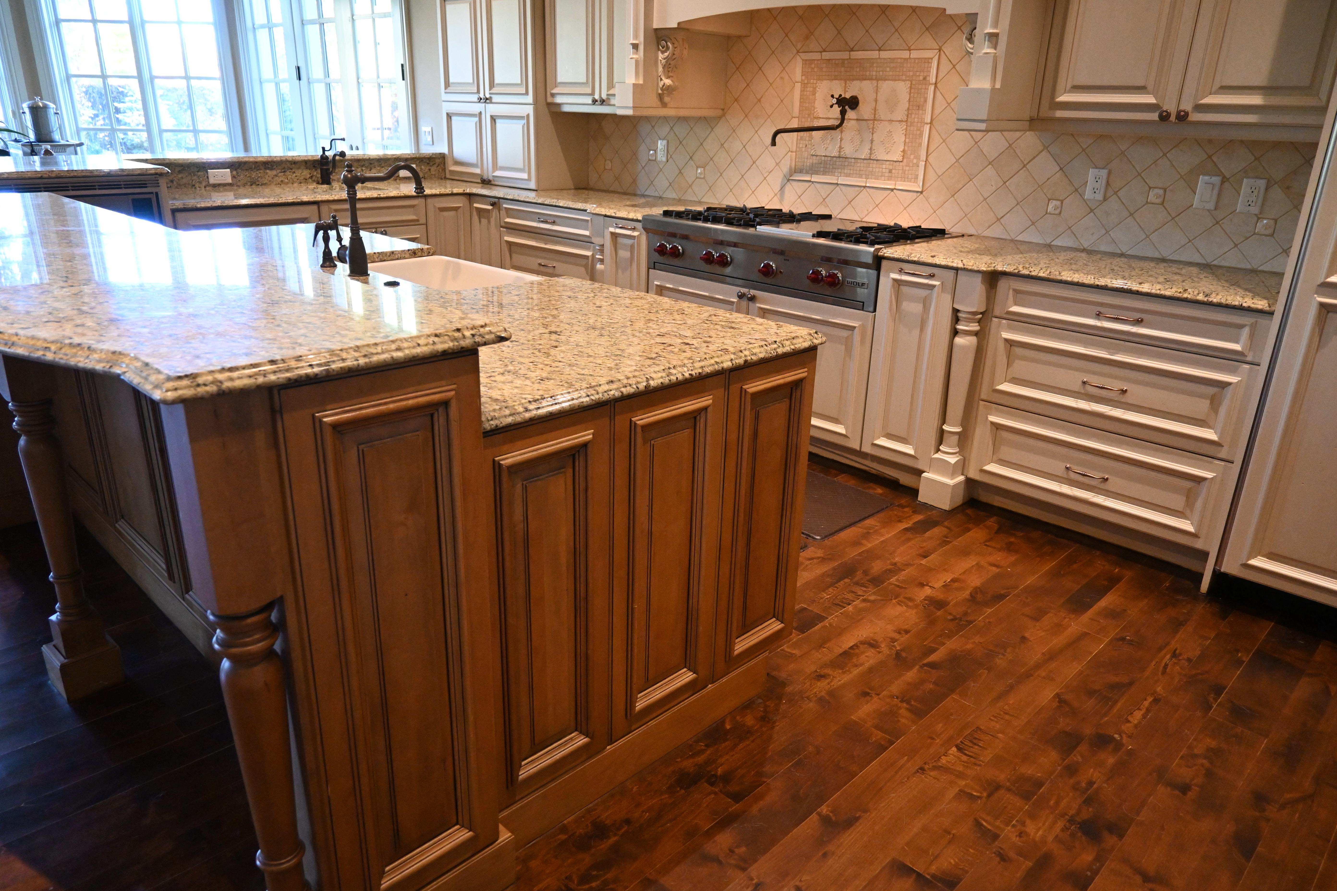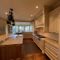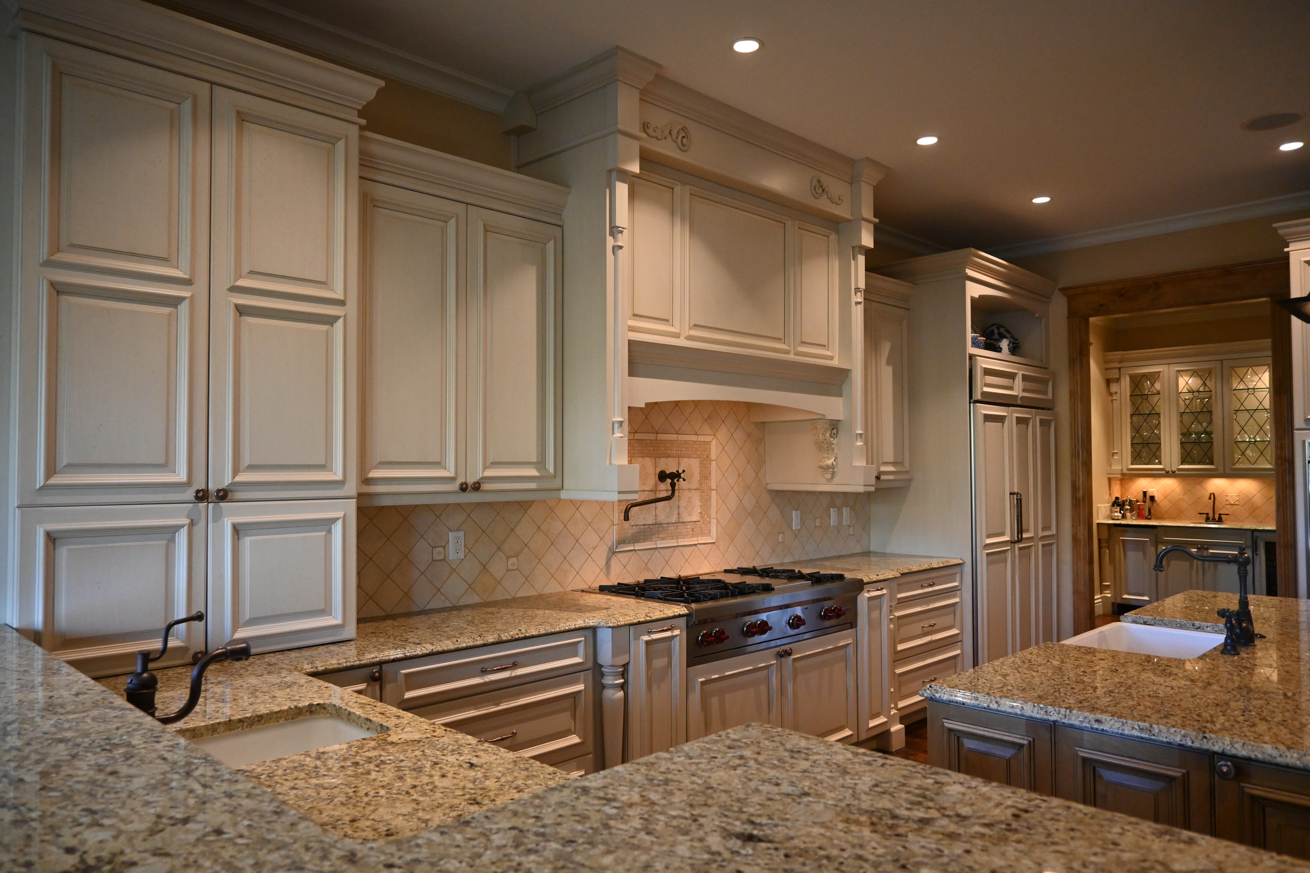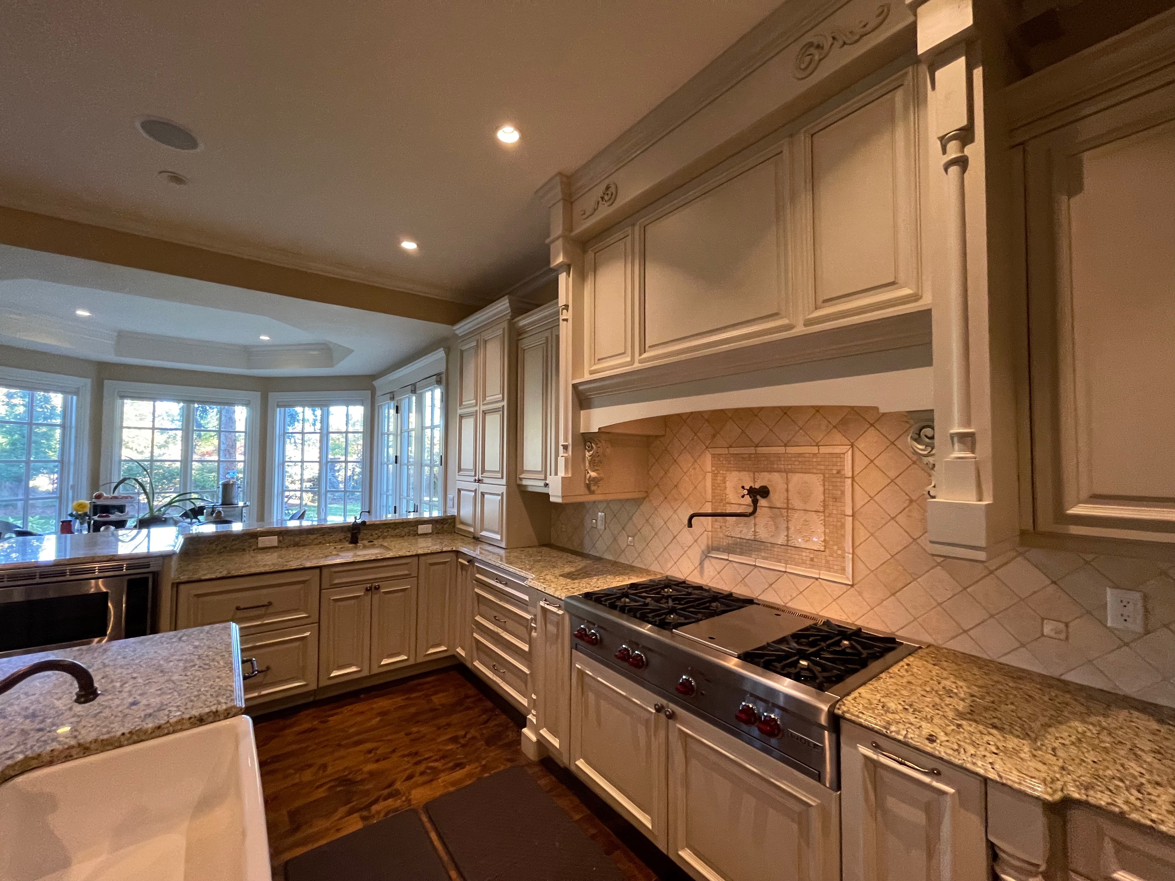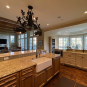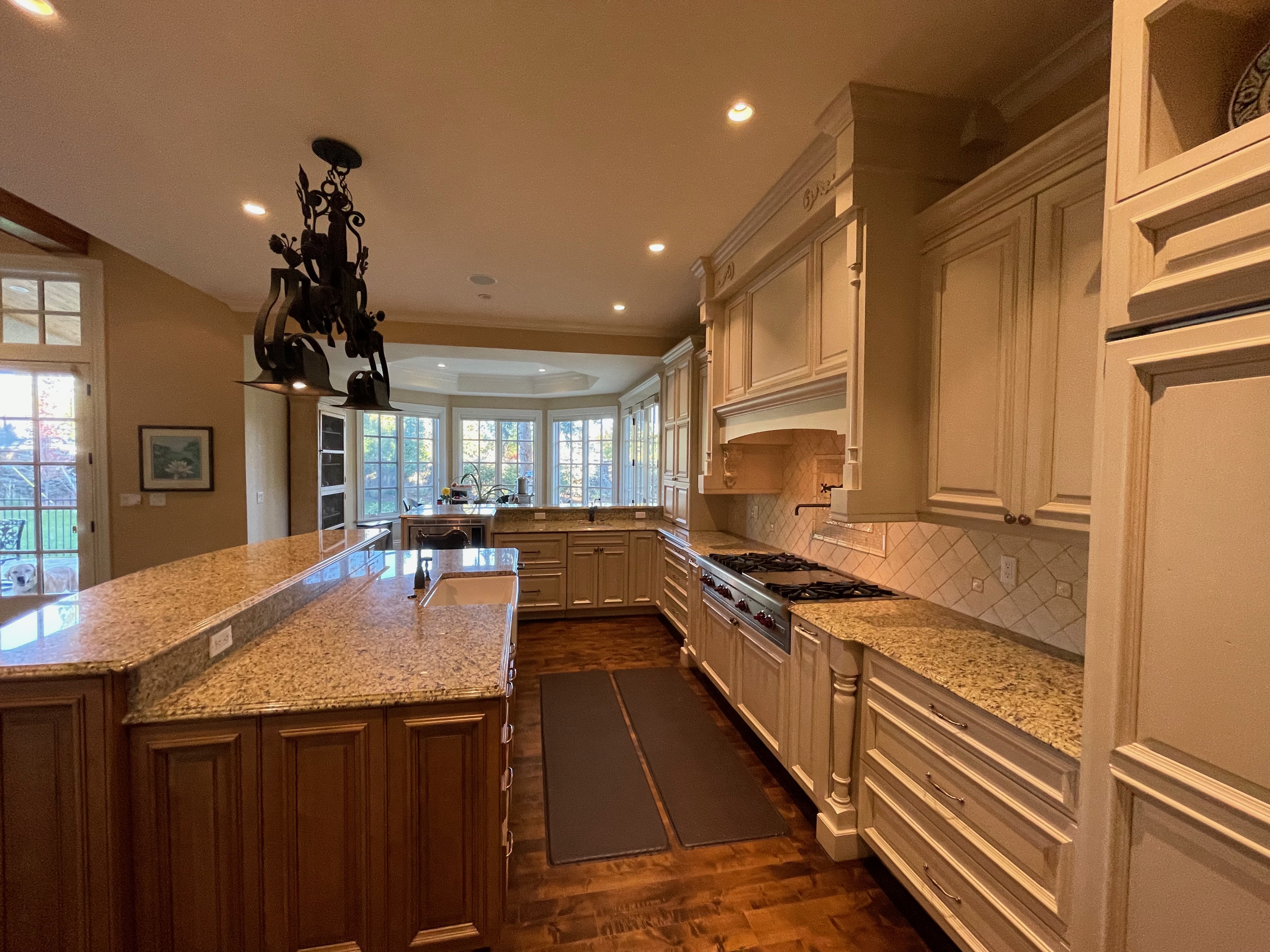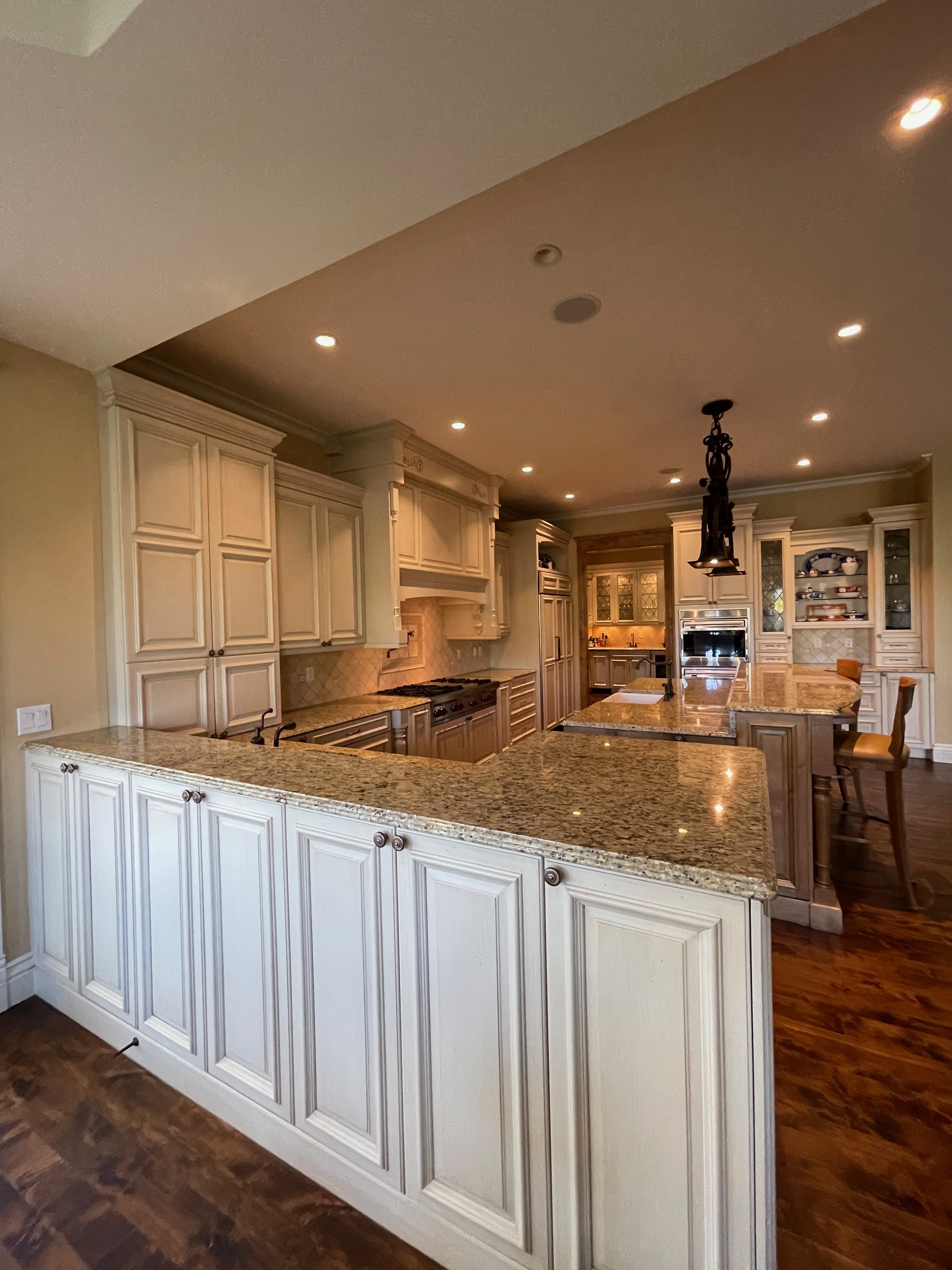 Very Nice! French country style kitchen with Crestwood cabinets, island & matching wet bar coming out of an exclusive estate. The cabinetry was made in Salina, Kansas. This beautiful set features perimeter and wet bar cabinets in a creamy off-white with the island having contrasting wood cabinets. The appliances included are the Scotsman ice maker, Asko dishwasher, hood insert and microwave. The slab granite counter tops, sinks, faucets sets and disposal are part of the set. The iron chandelier over the island could be included. The kitchen will be available to be removed by a qualified buyer or sub-contractors are available to be hired tbd late February/March.