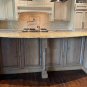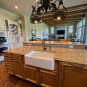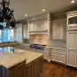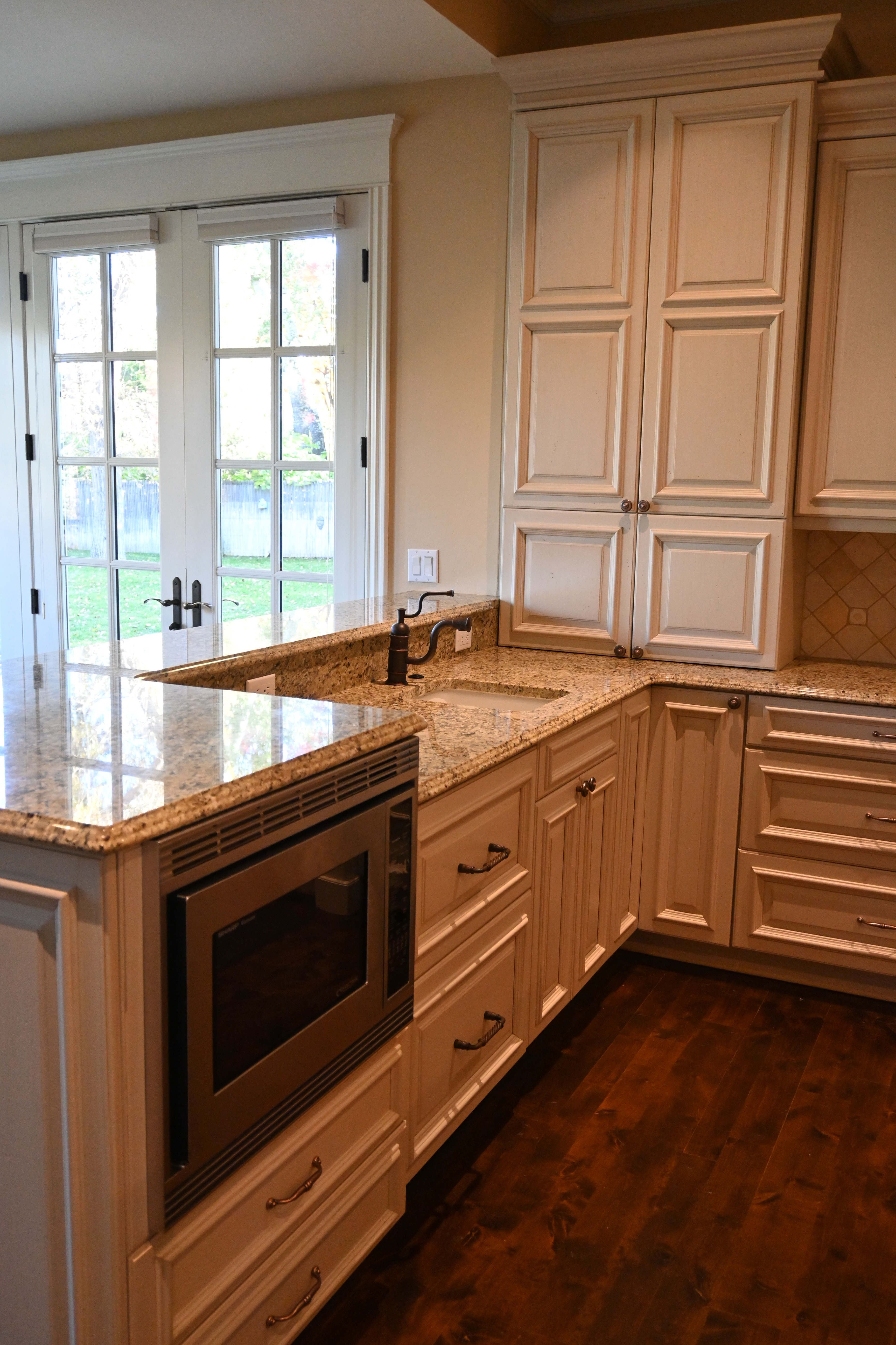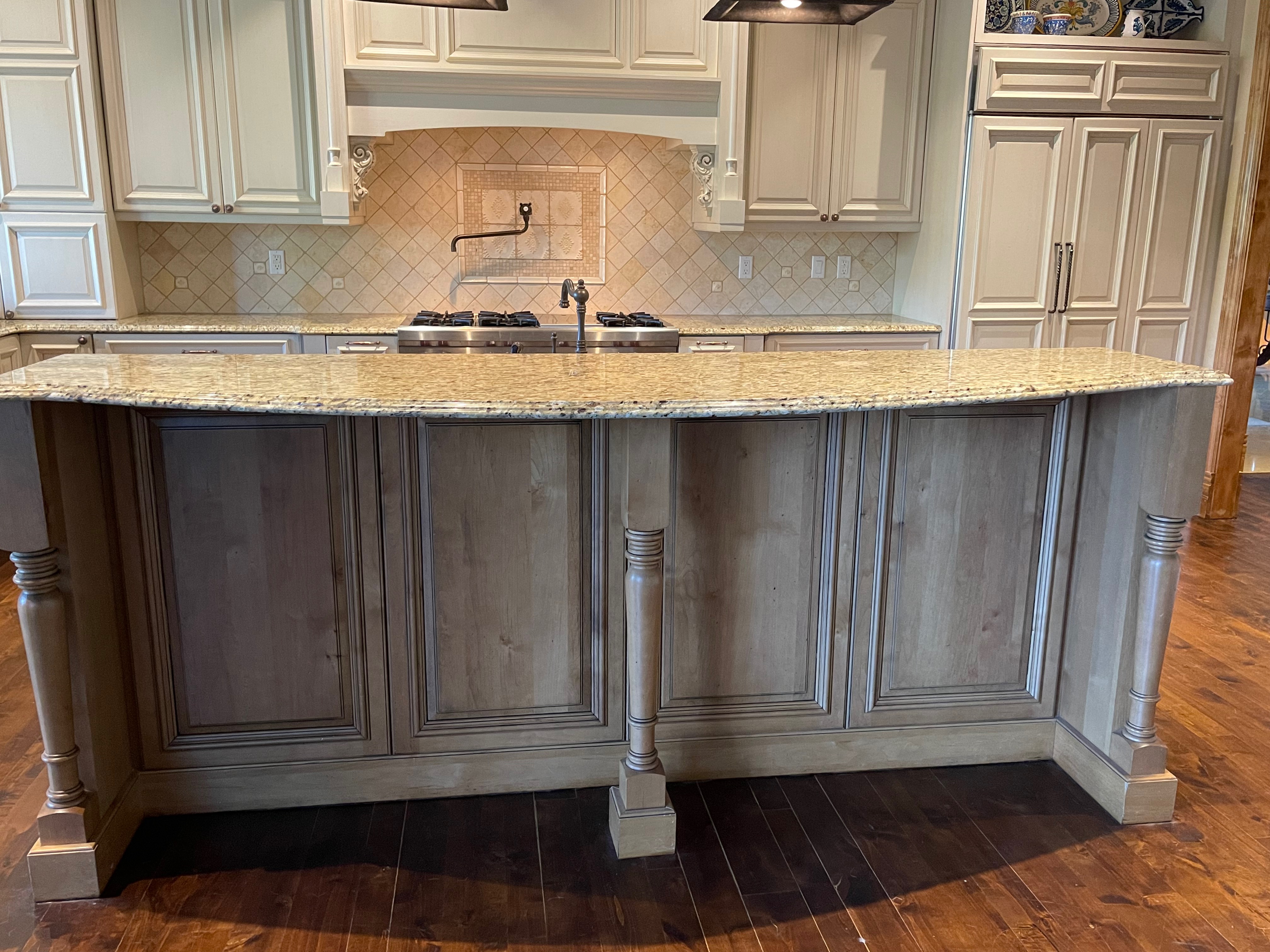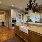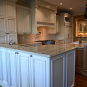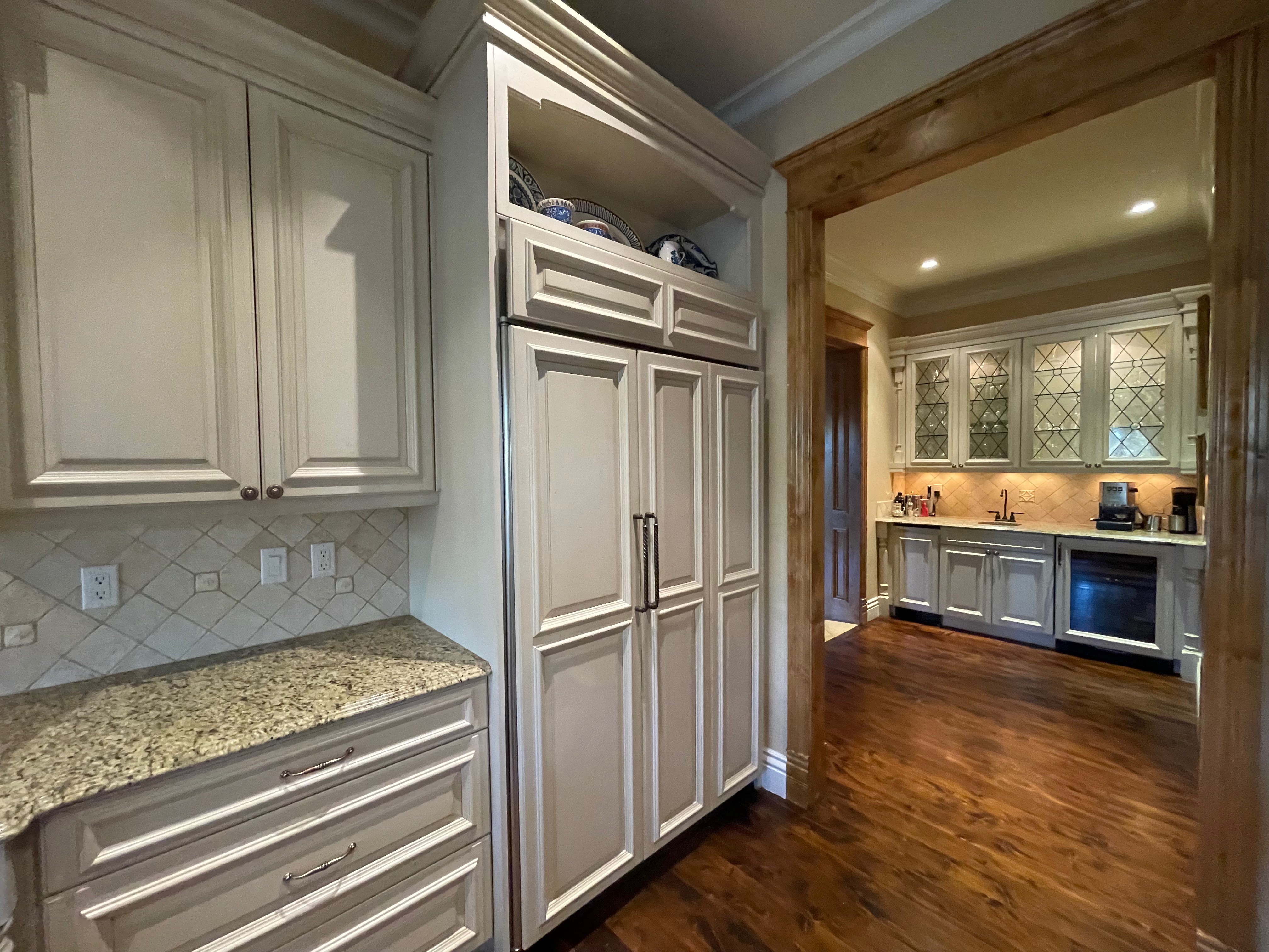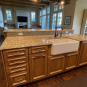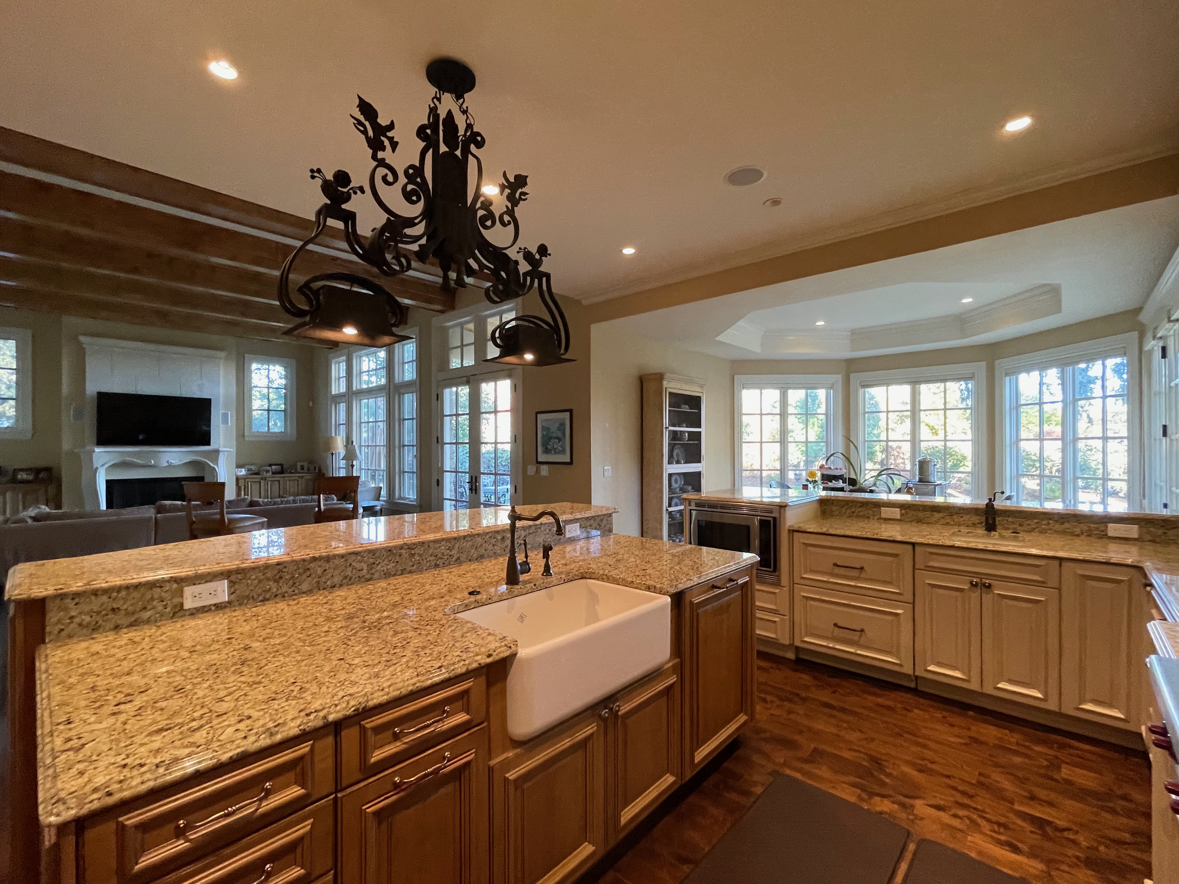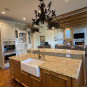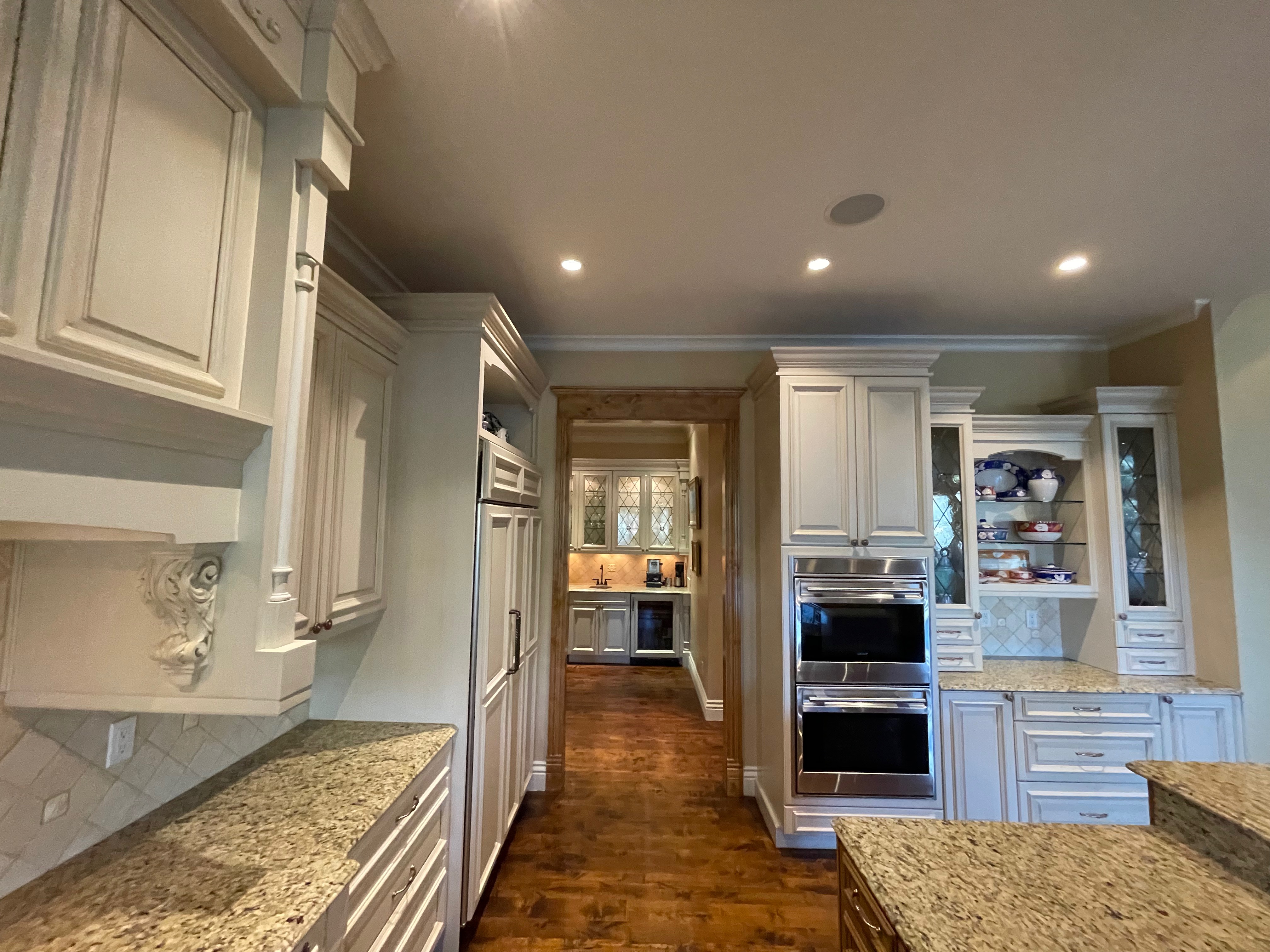 Very Nice! French country style kitchen with Crestwood cabinets, island & matching wet bar coming out of an exclusive estate. The cabinetry was made in Salina, Kansas. This beautiful set features perimeter and wet bar cabinets in a creamy off-white with the island having contrasting wood cabinets. The appliances included are the Scotsman ice maker, Asko dishwasher, hood insert and microwave. The slab granite counter tops, sinks, faucets sets and disposal are part of the set. The iron chandelier over the island could be included. The kitchen will be available to be removed by a qualified buyer or sub-contractors are available to be hired tbd late February/March.
