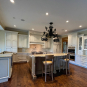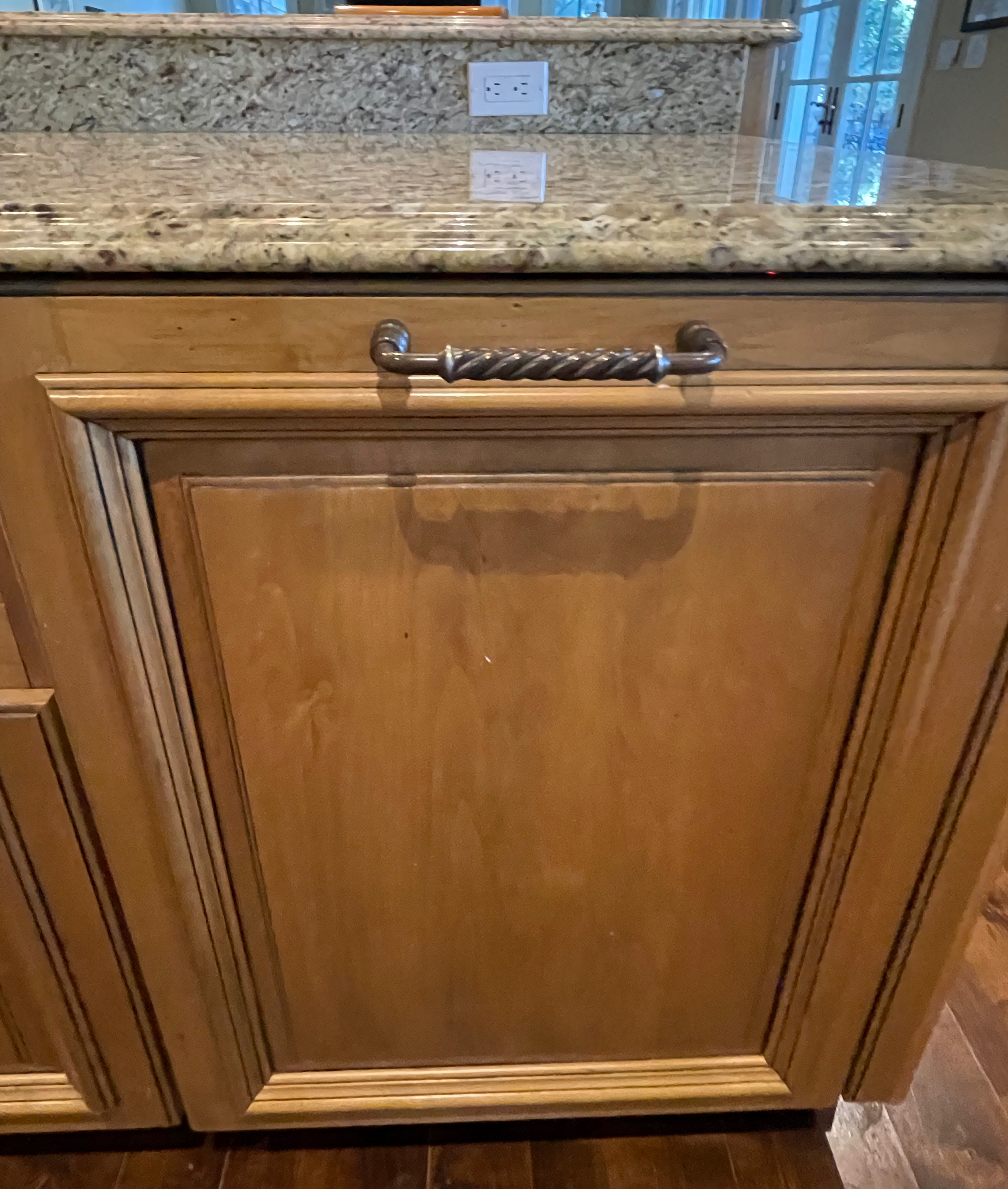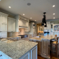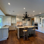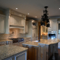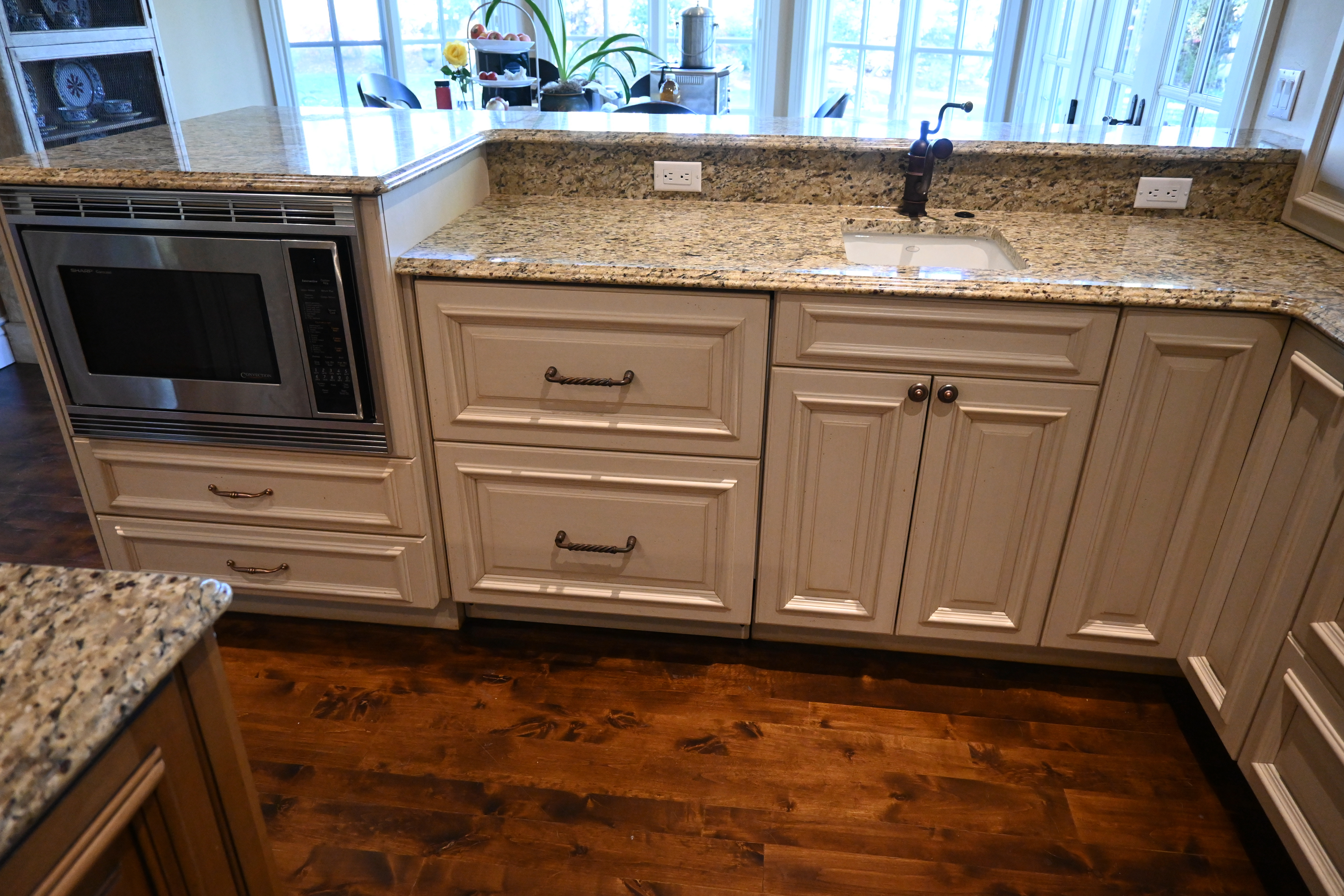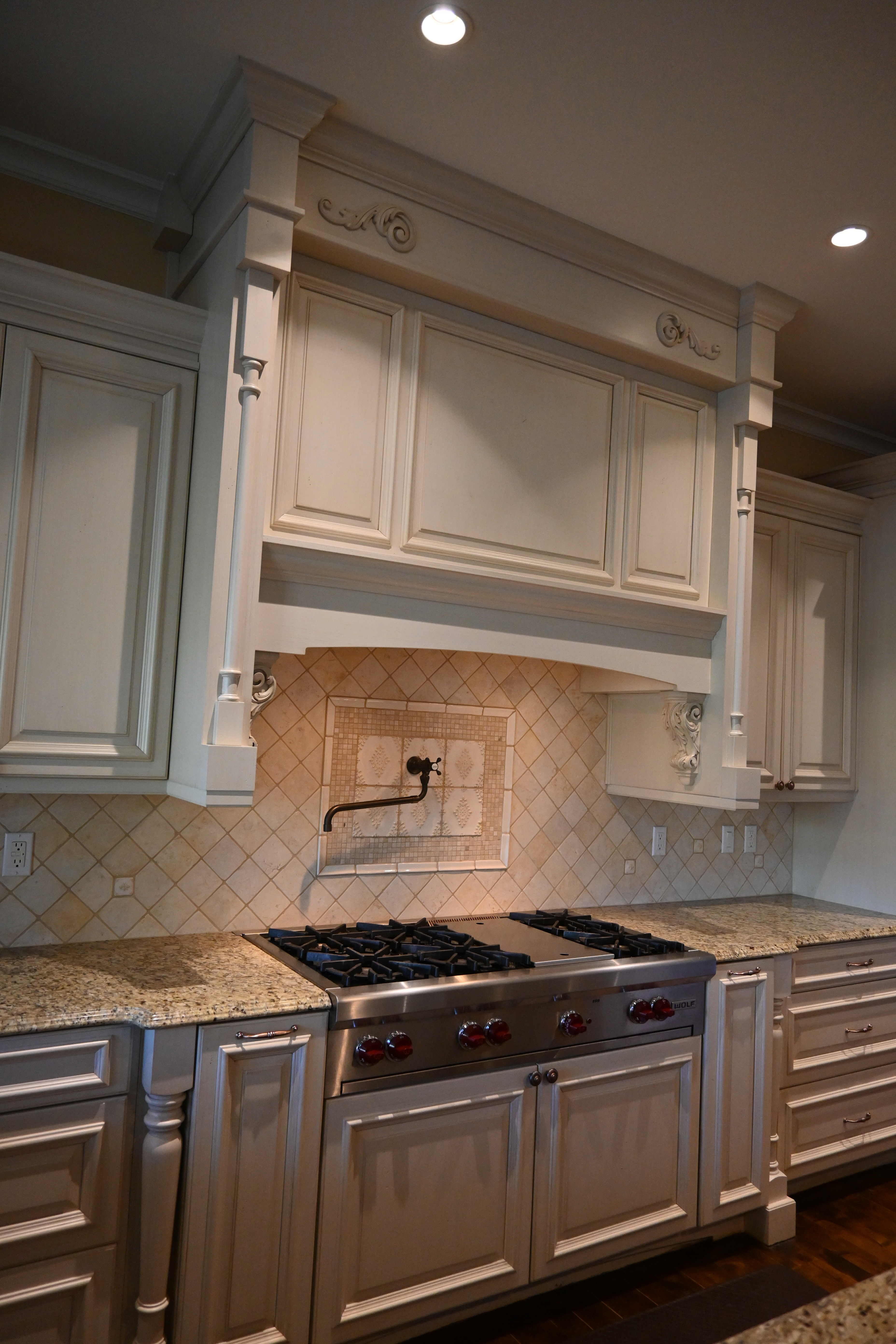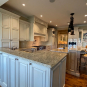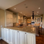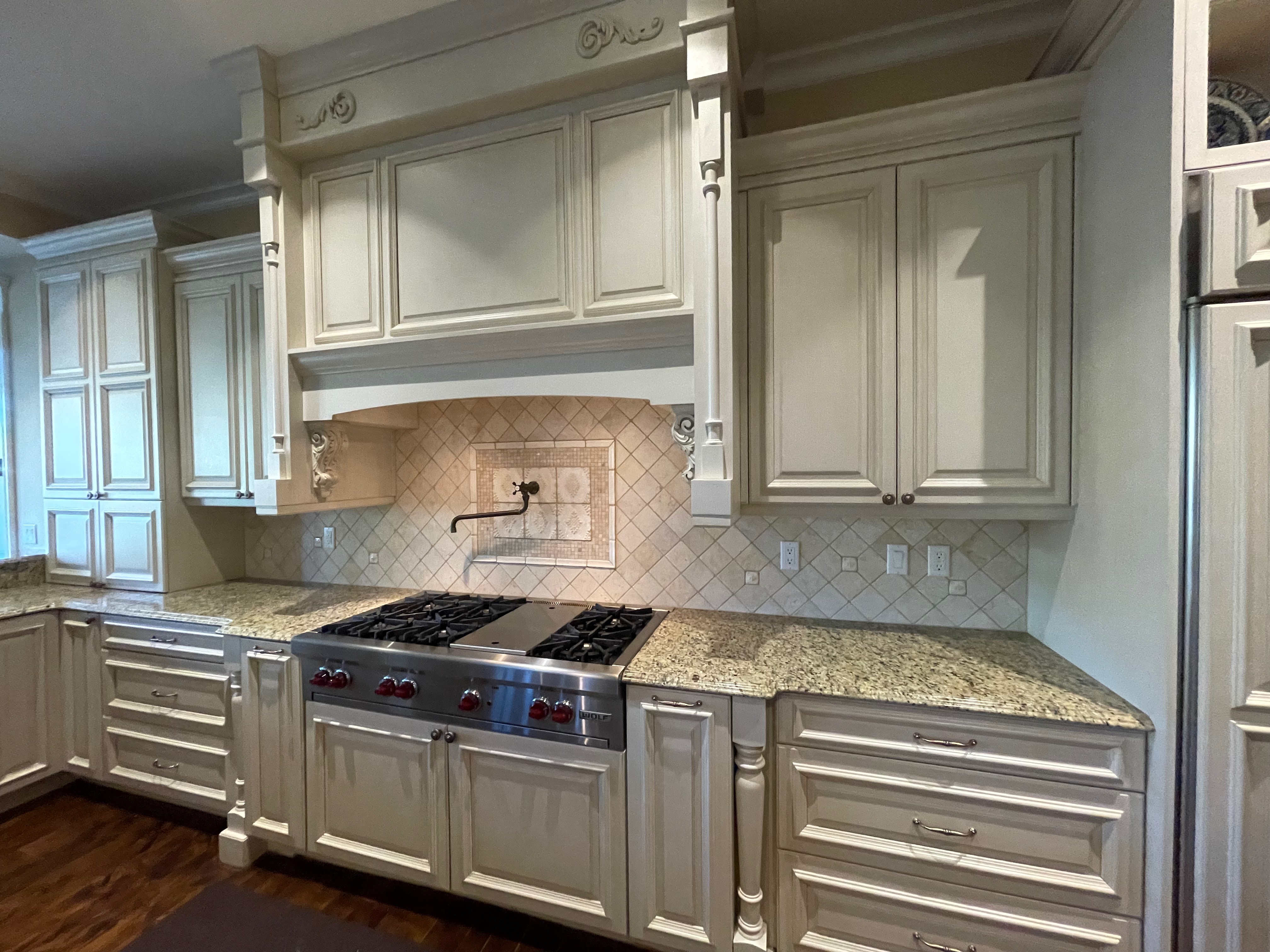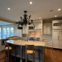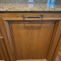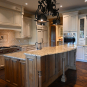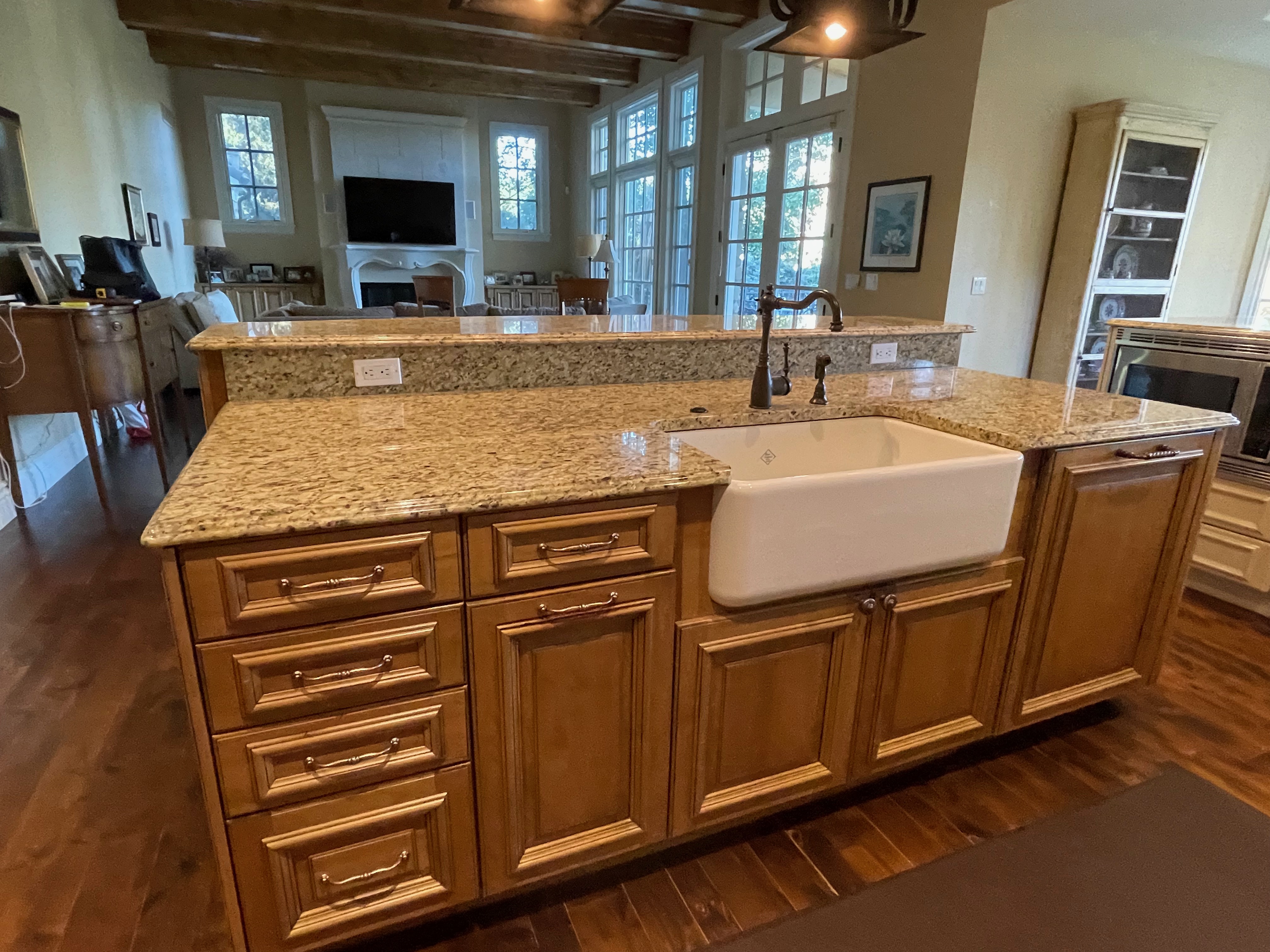 Very Nice! French country style kitchen with Crestwood cabinets, island & matching wet bar coming out of an exclusive estate. The cabinetry was made in Salina, Kansas. This beautiful set features perimeter and wet bar cabinets in a creamy off-white with the island having contrasting wood cabinets. The appliances included are the Scotsman ice maker, Asko dishwasher, hood insert and microwave. The slab granite counter tops, sinks, faucets sets and disposal are part of the set. The iron chandelier over the island could be included. The kitchen will be available to be removed by a qualified buyer or sub-contractors are available to be hired tbd late February/March.
