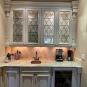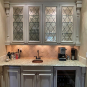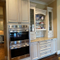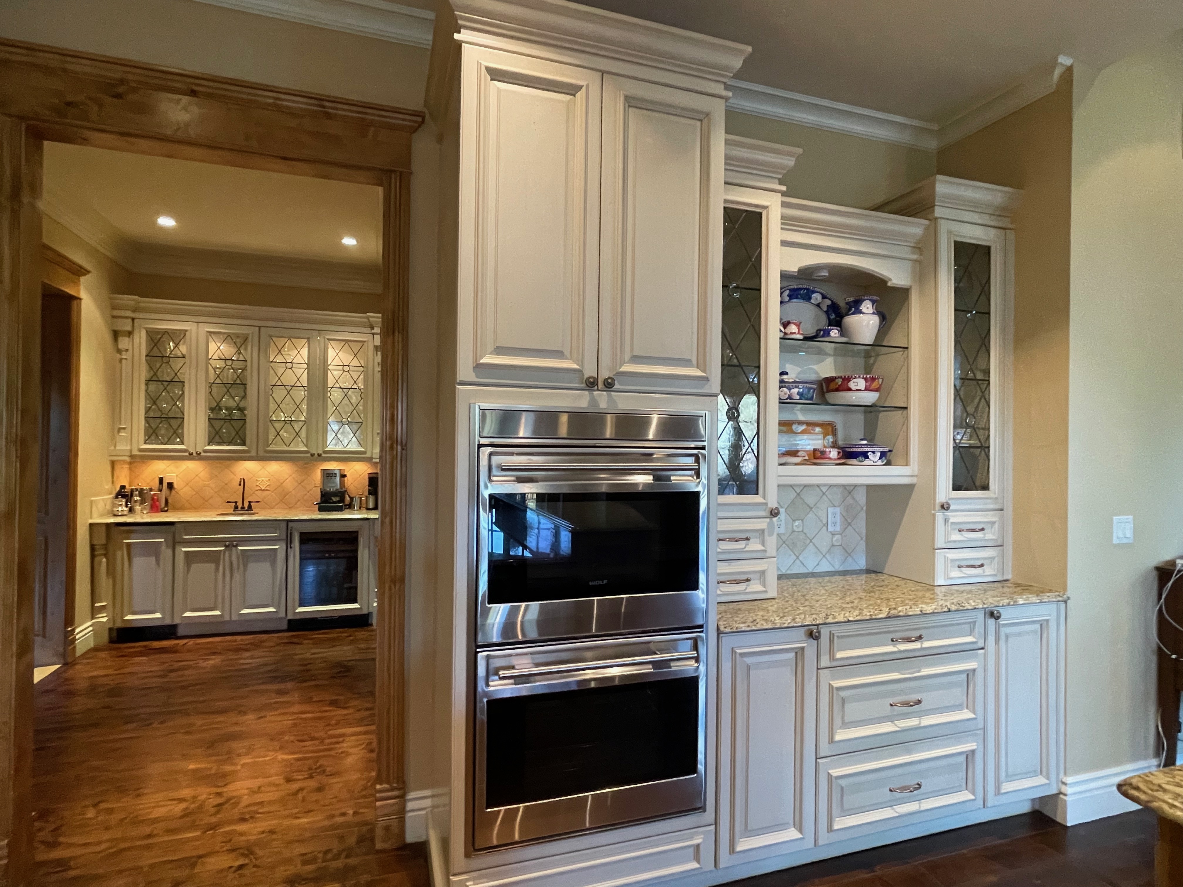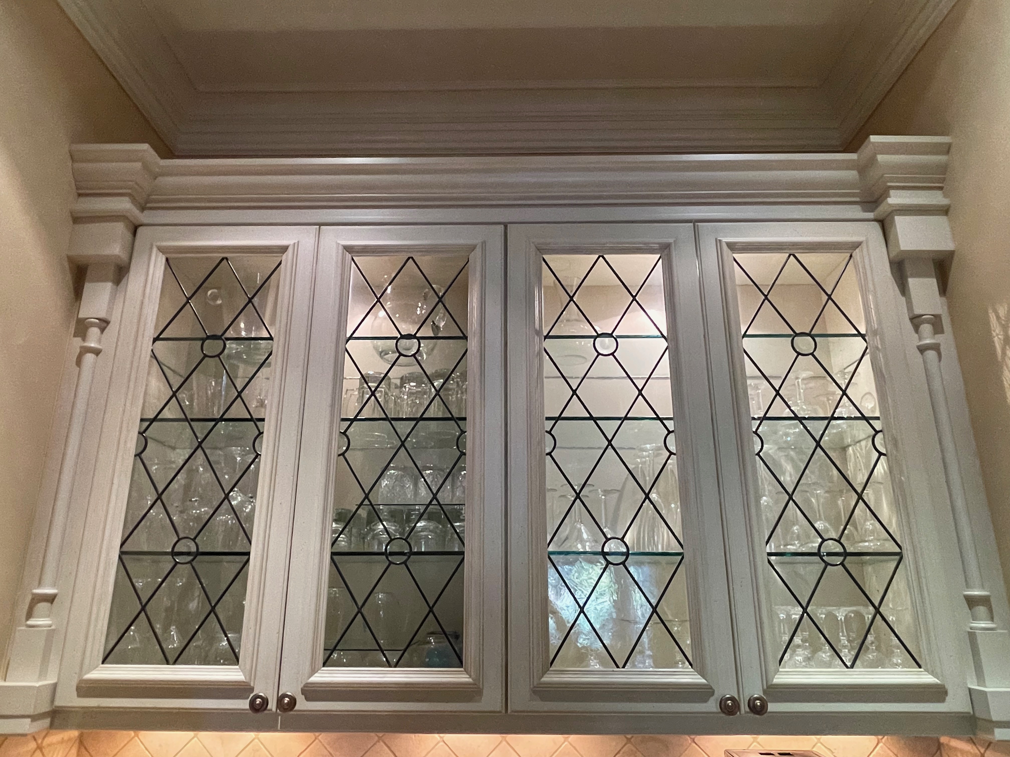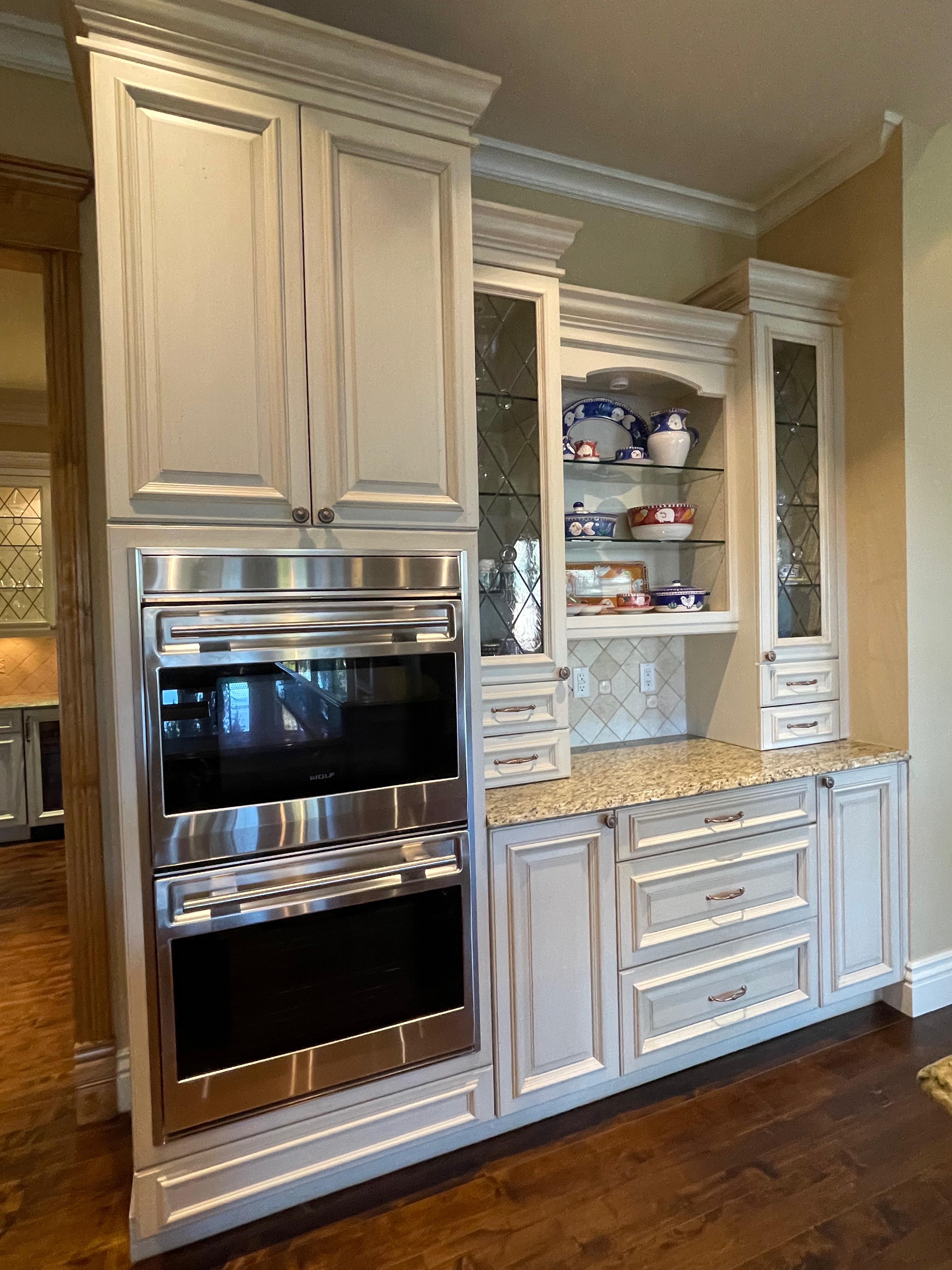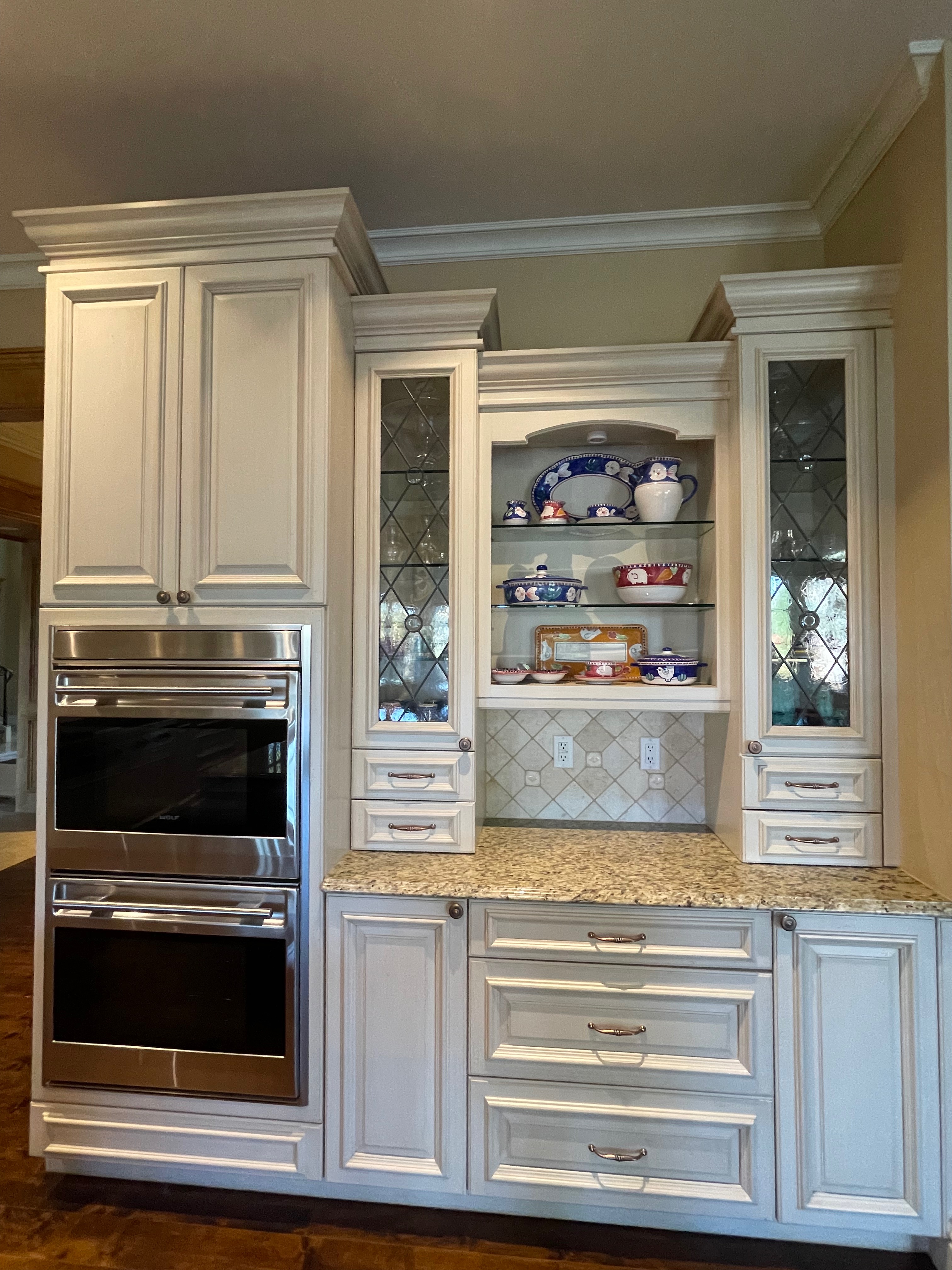 2-One door glass front counter cabinets w/ two drawers below (oven wall) Dim.: 15” w x 60” h cabinet only/65 7/8”h w/ crown x 16” d