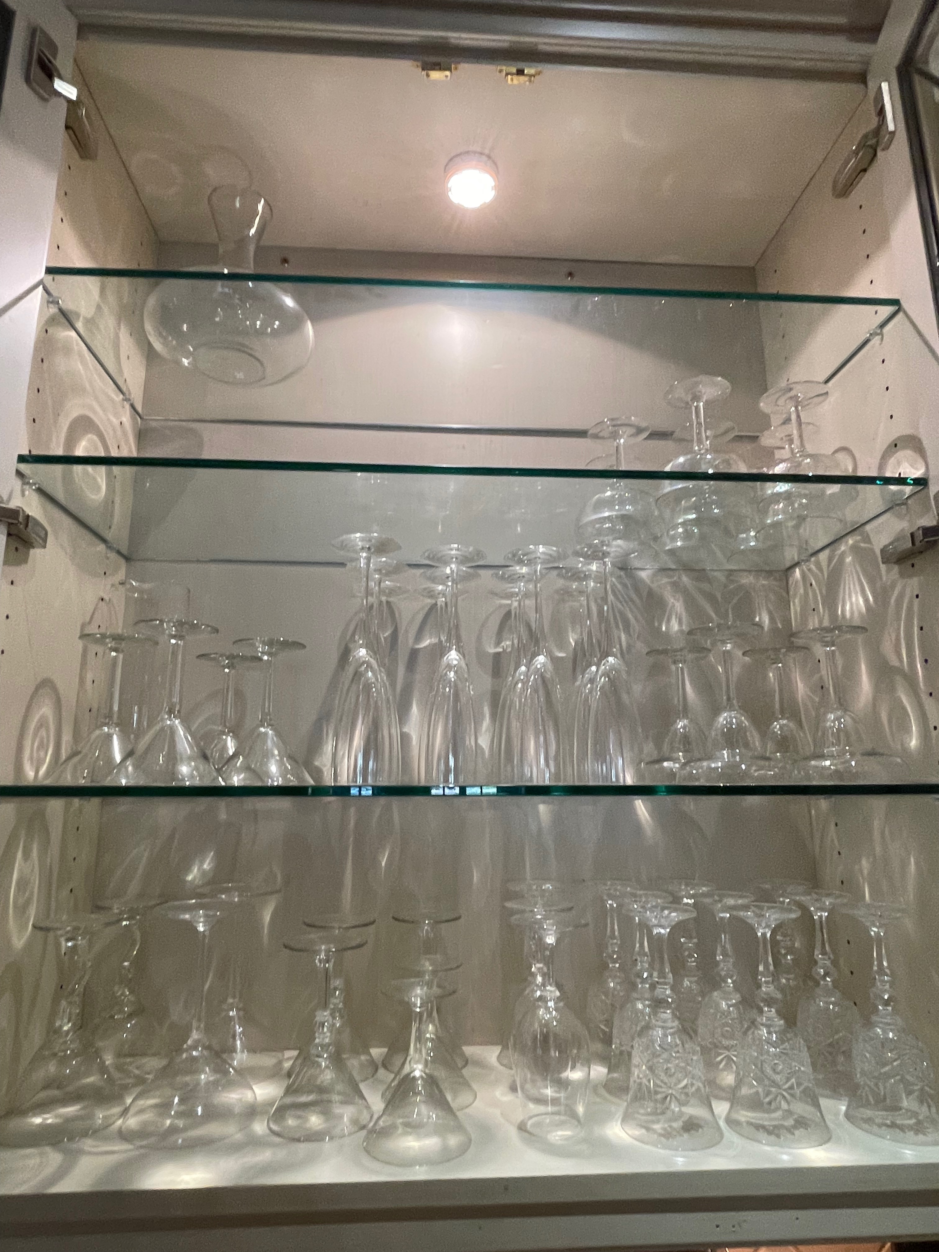 1-Two door glass front wet bar wall cabinets w/ puck lights Dim.: 35”w x 42”h/49”h w/crown x13’d