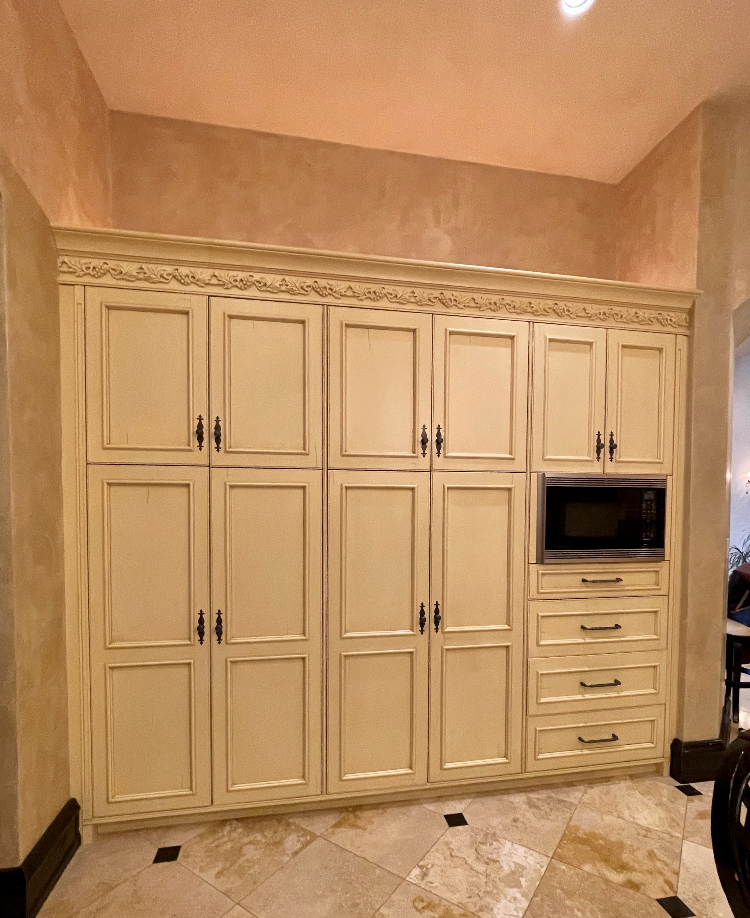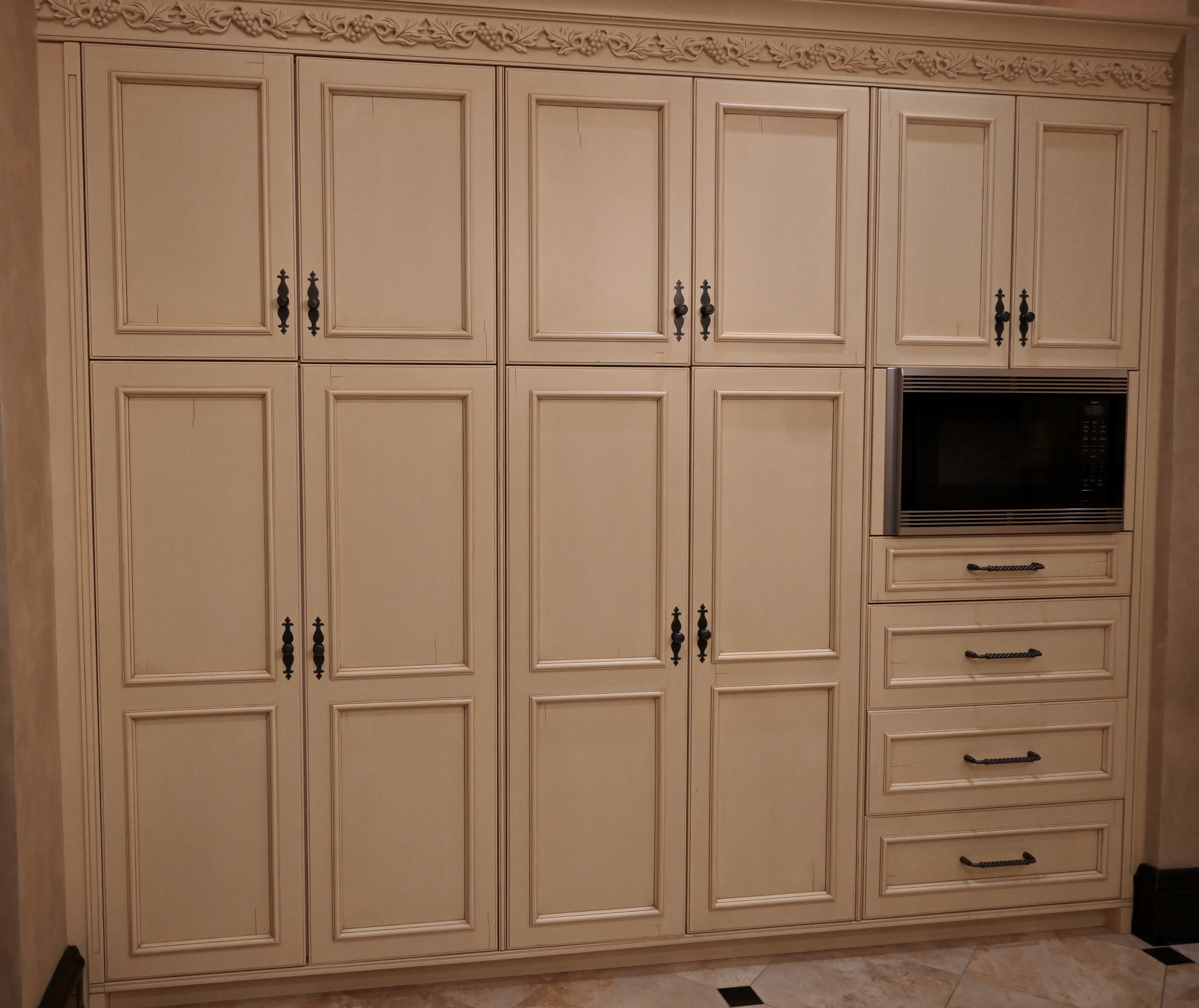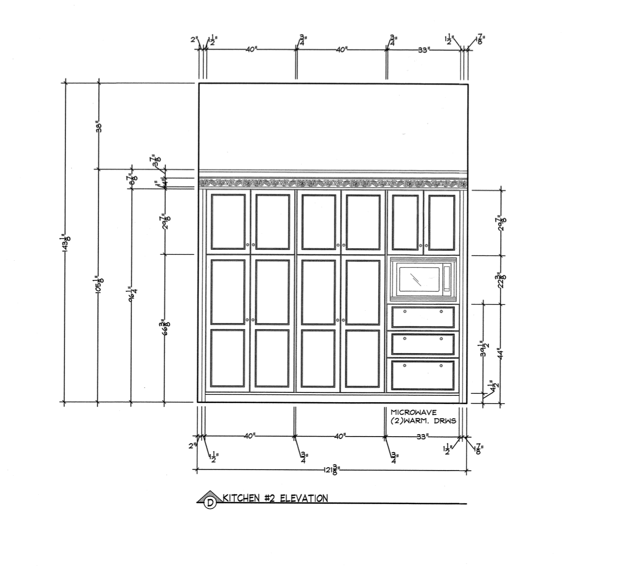 1-Two door, Four drawer double tall cabinet, holding the Wolf microwave and two Wolf warming drawers Dim.: 33”w x 96”h cab.only/101 ¾”h top of the middle crown/105”h to top of crown x 24”d
