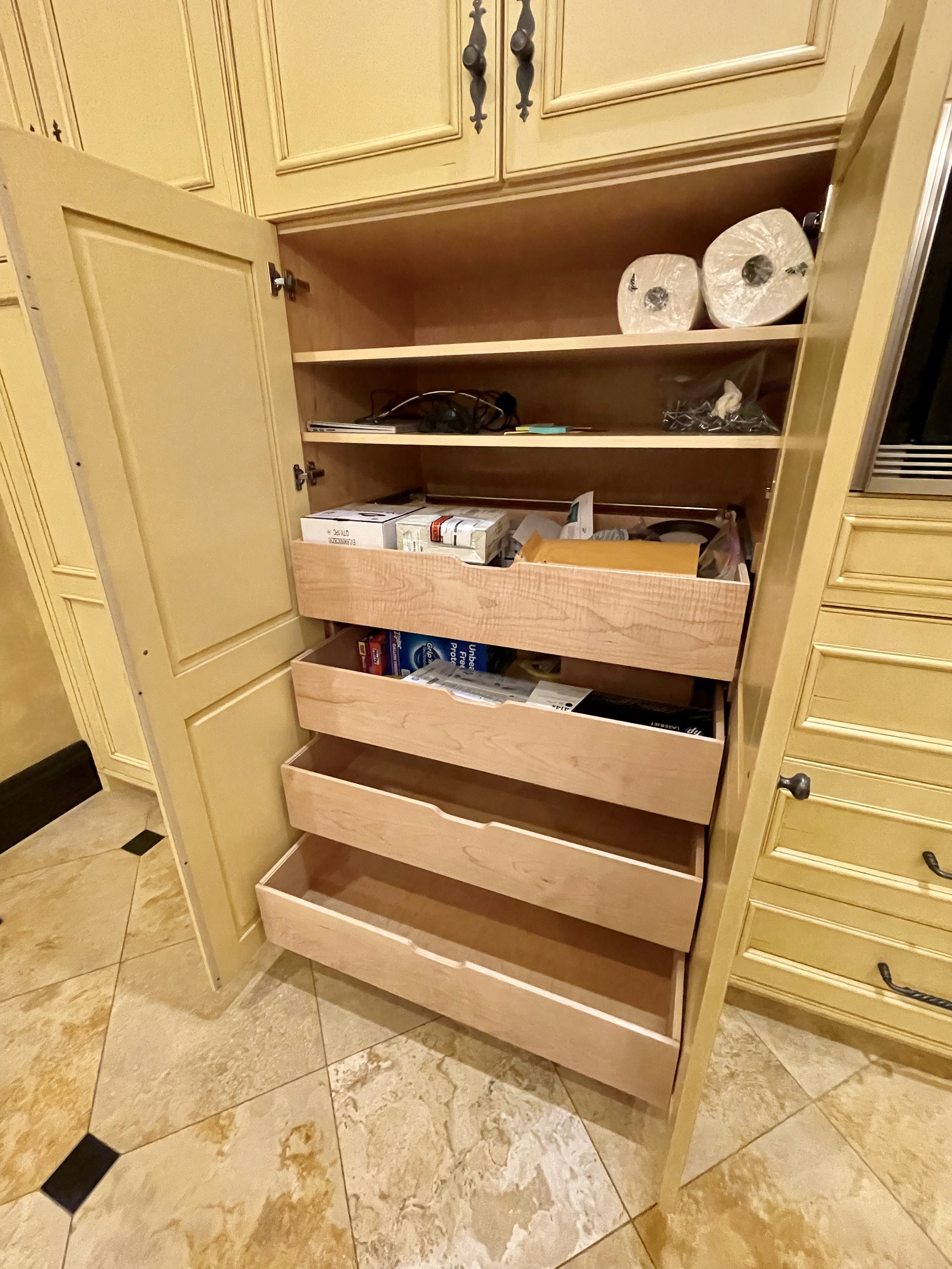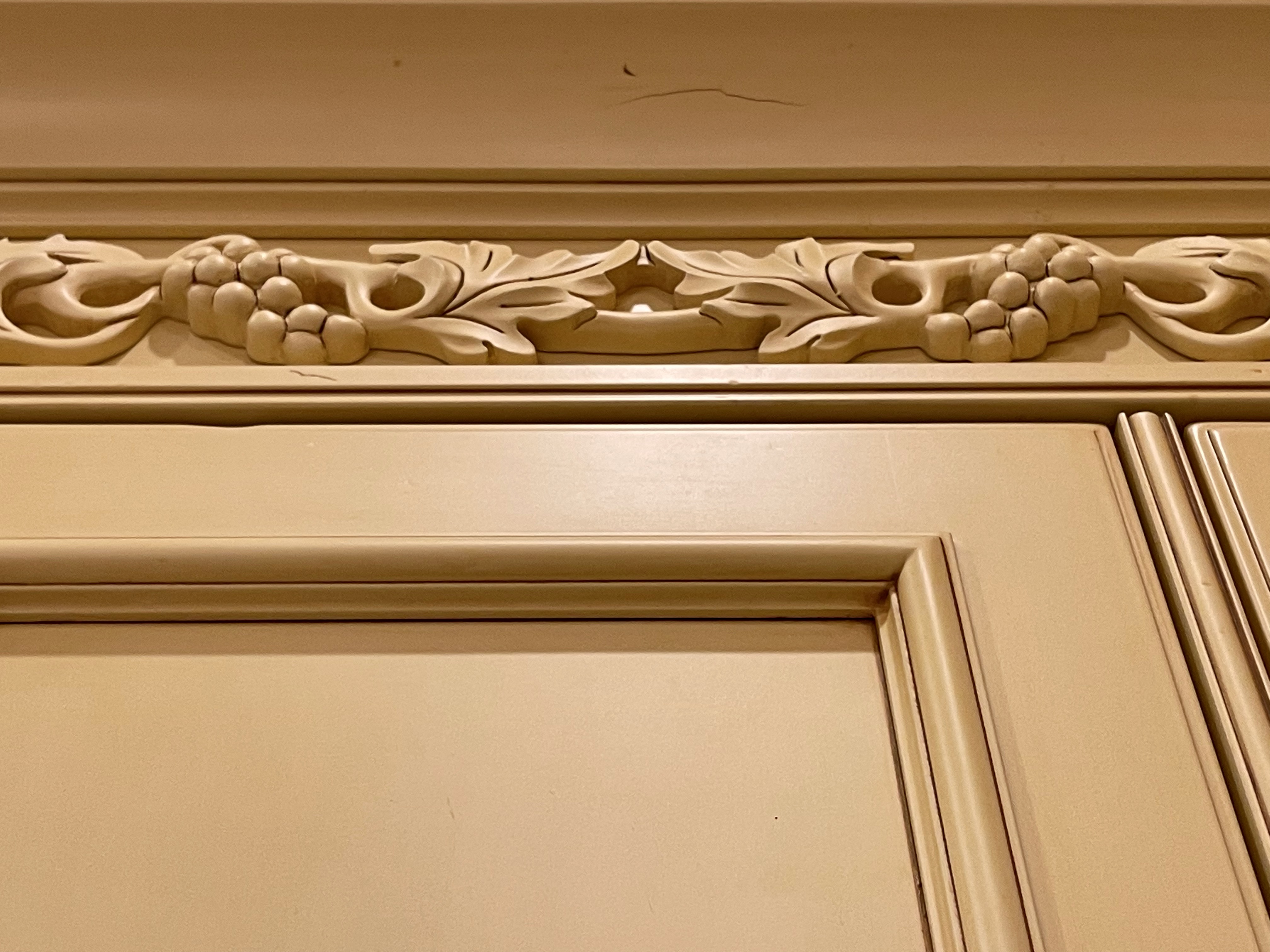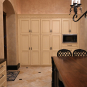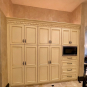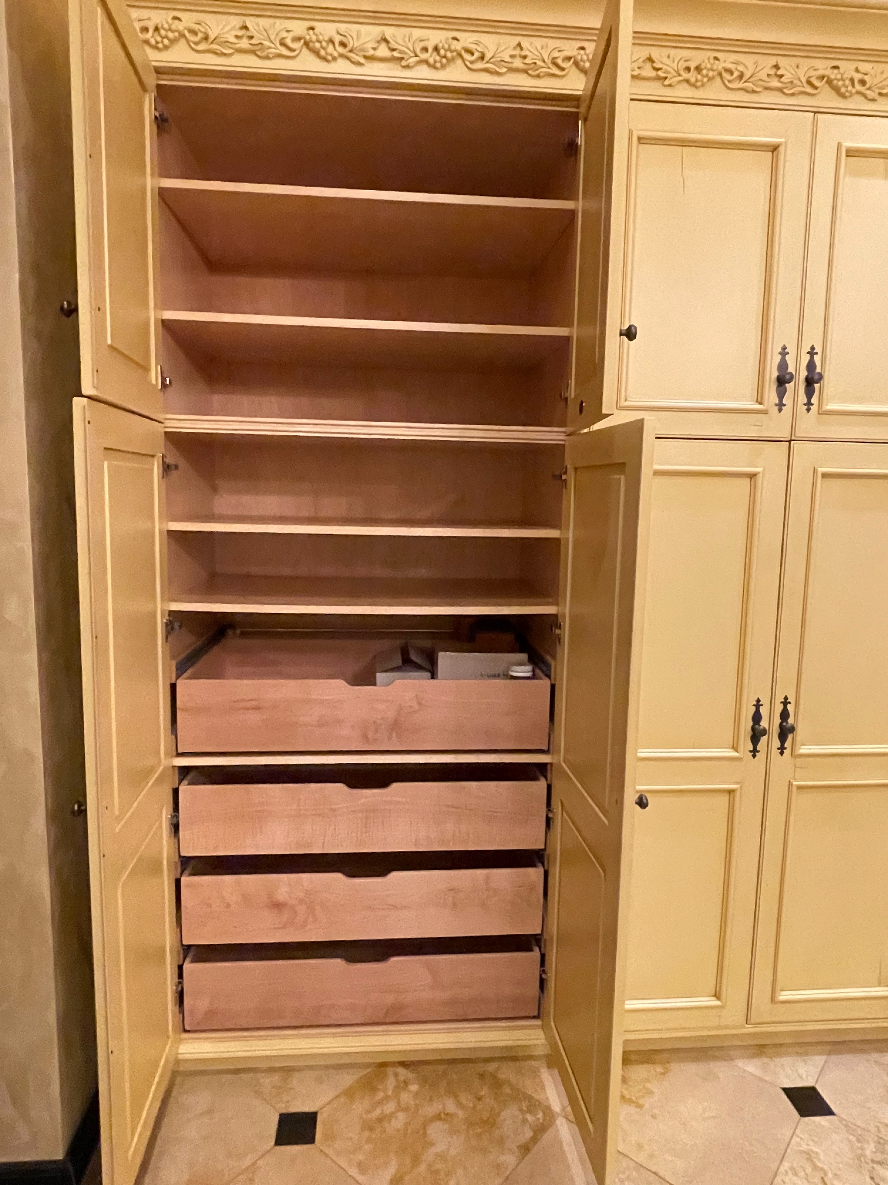 1-Two door, Four drawer double tall cabinet, holding the Wolf microwave and two Wolf warming drawers Dim.: 33”w x 96”h cab.only/101 ¾”h top of the middle crown/105”h to top of crown x 24”d