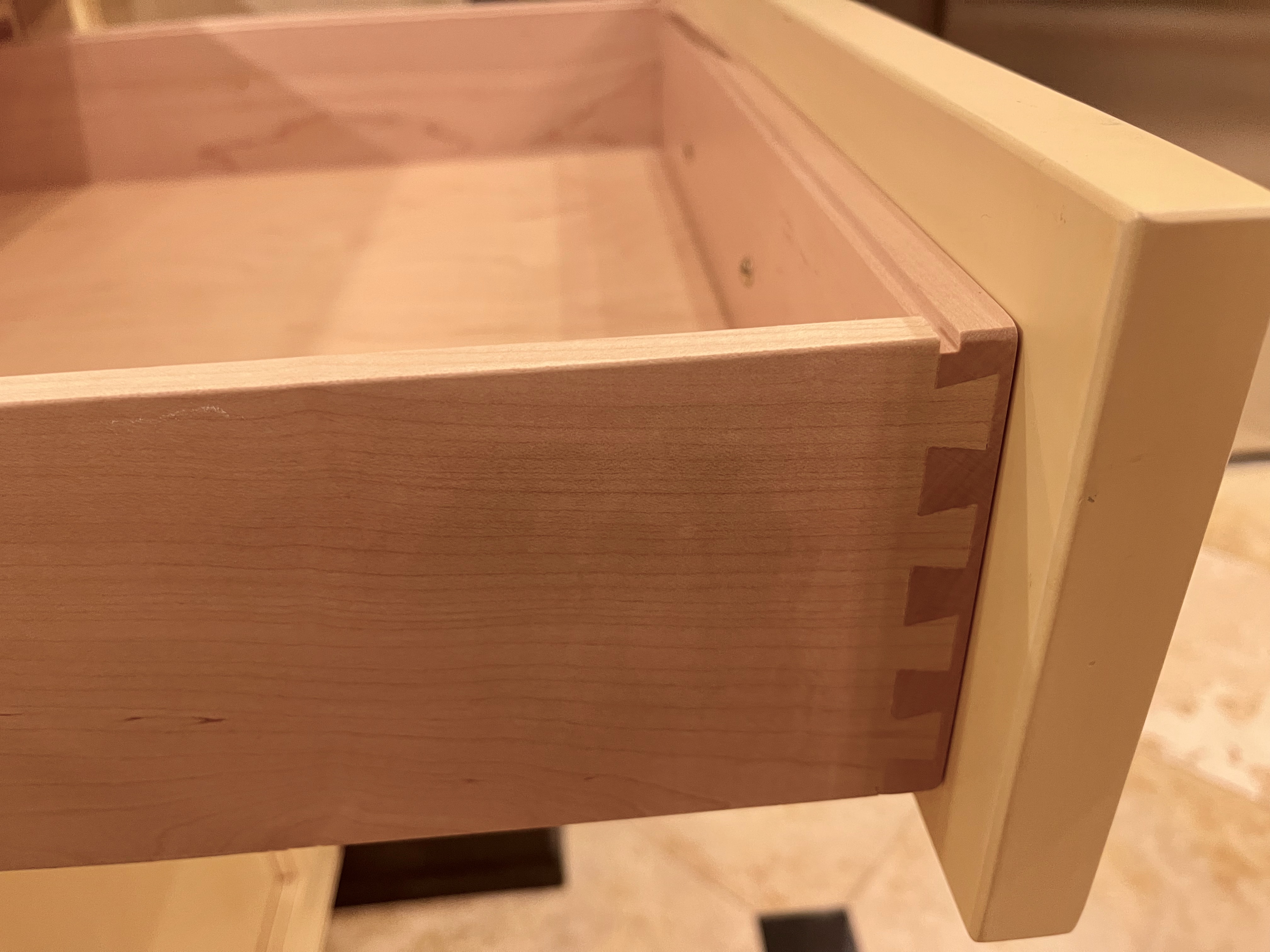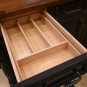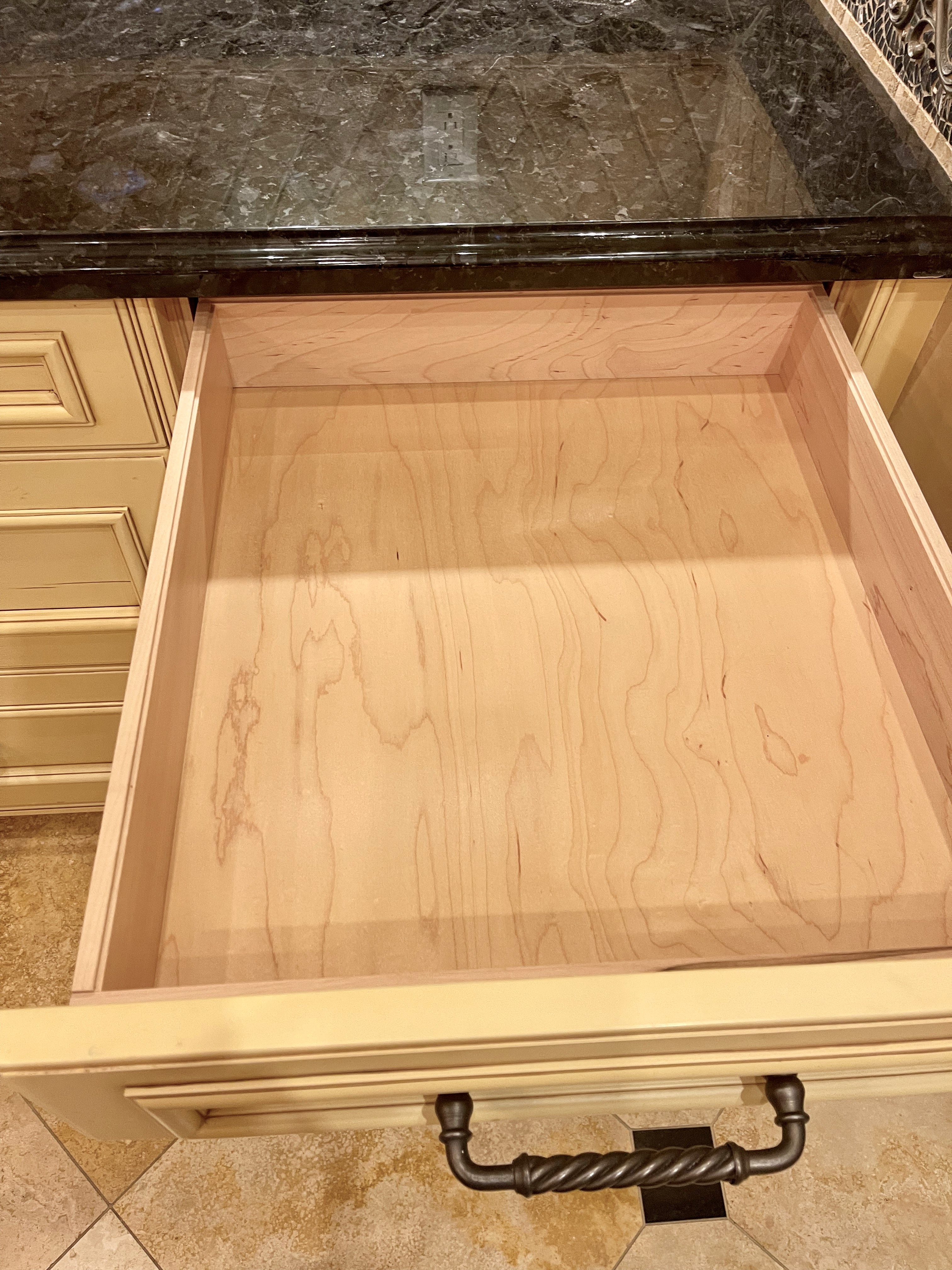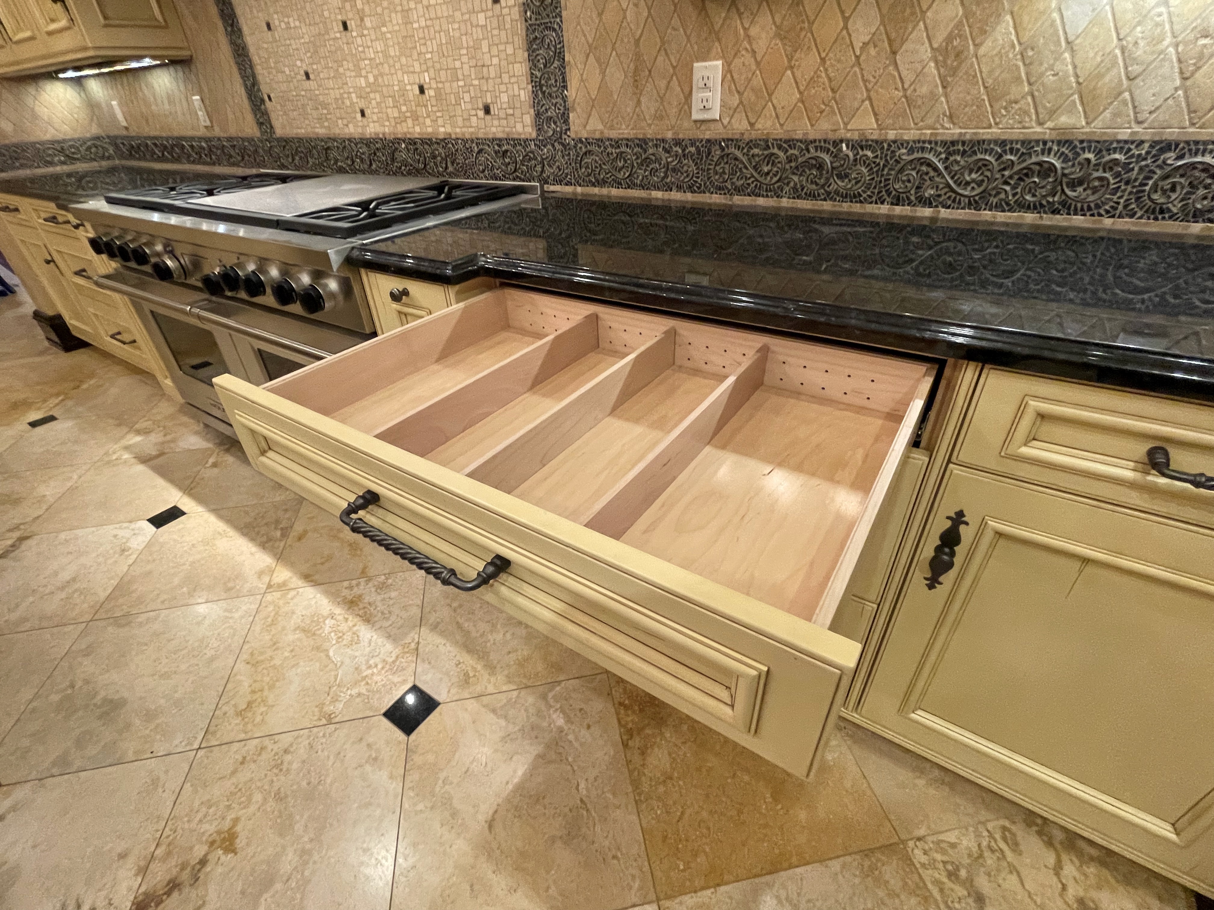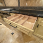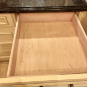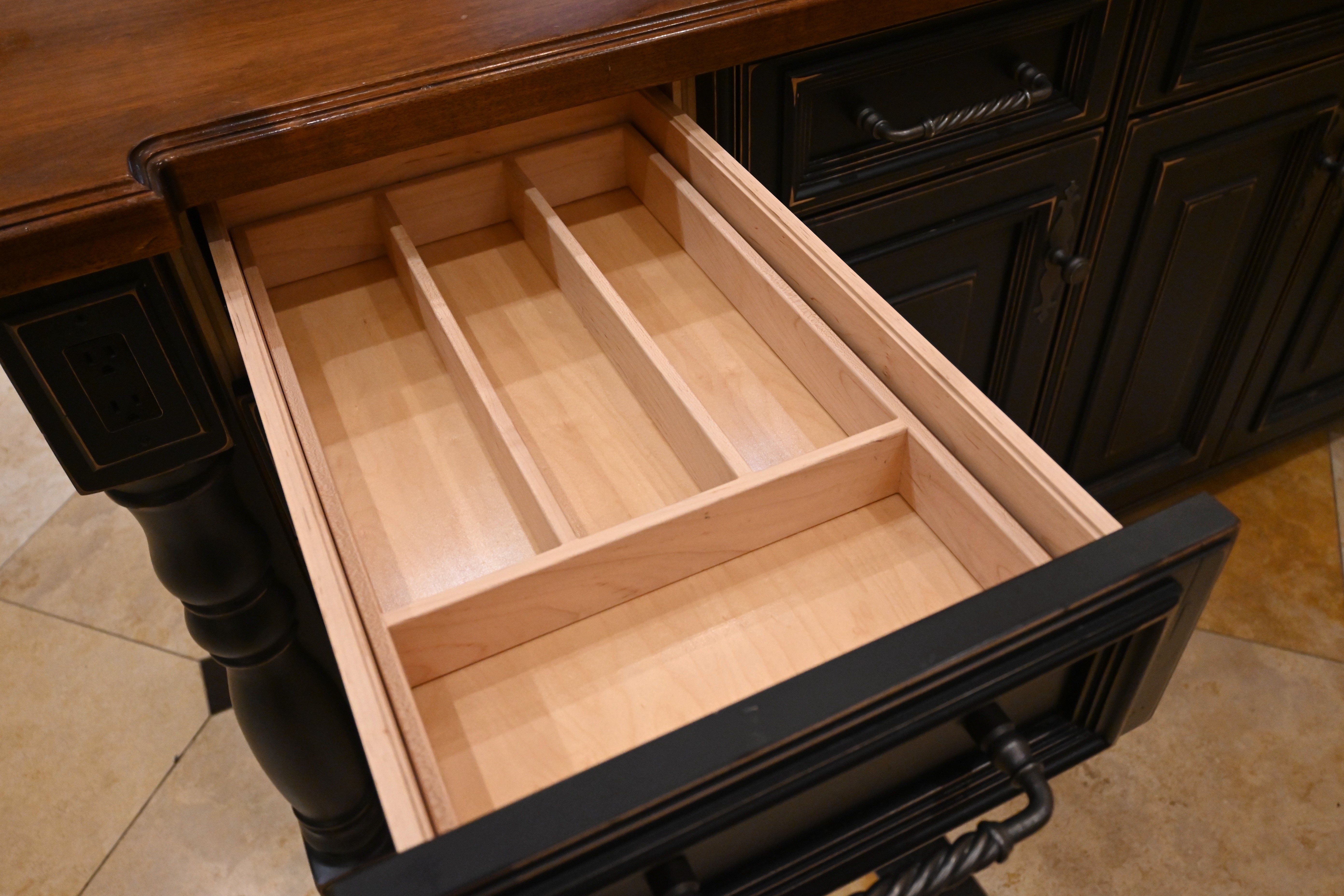 1-Three drawer base cabinet, top drawer has wood dividers for utensils Dim.: 27”w x 36”h x 24”d