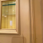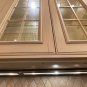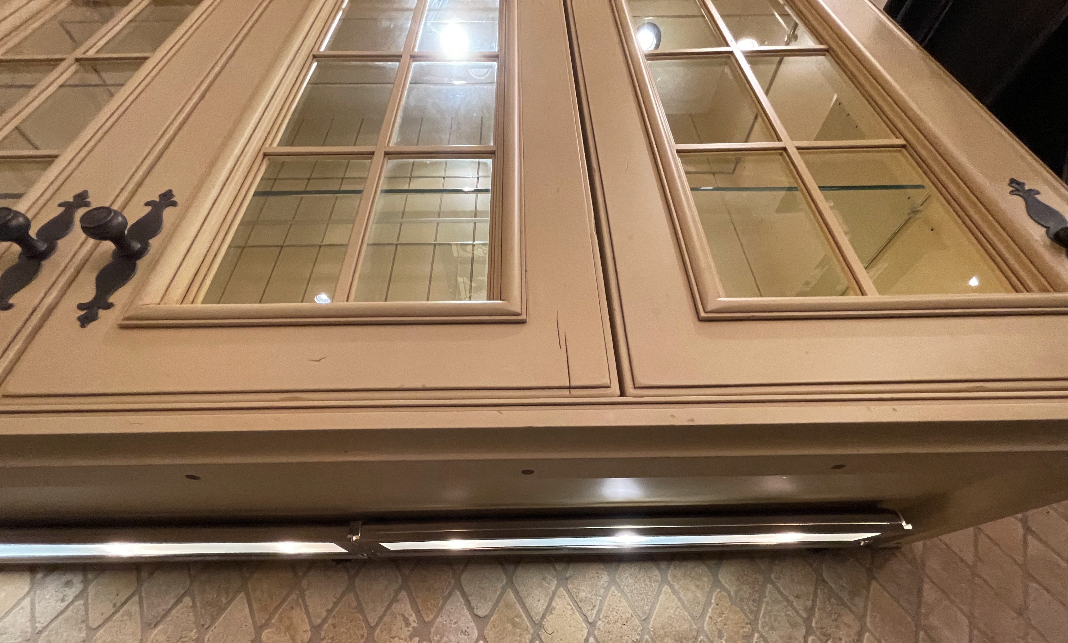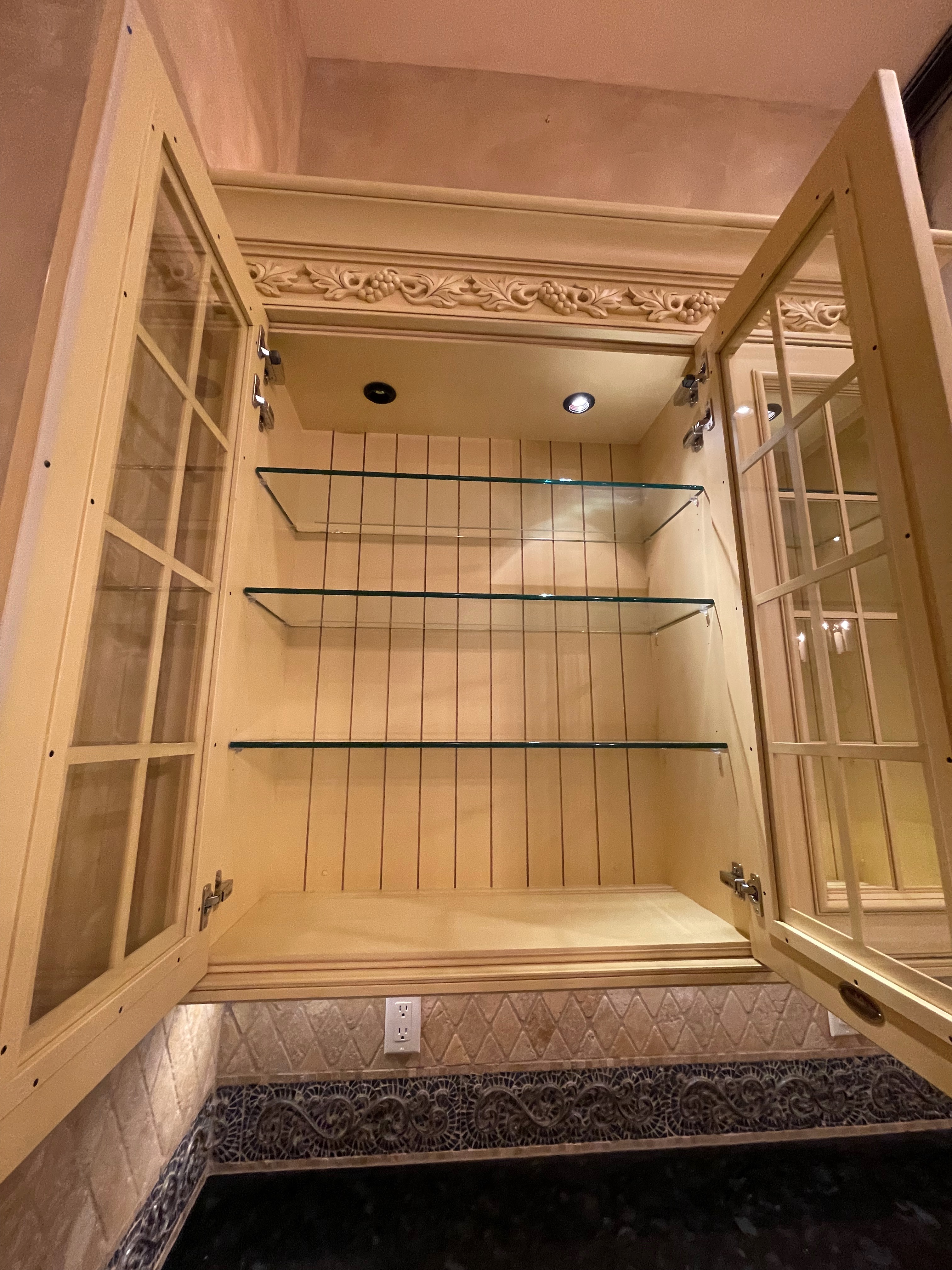 2-Three glass front wall cabinets Dim.:54 ¼”w x 41 7/8”h cab.only/44 7/8"h with center crown/48 7/8" with top crown x 14”d*Could be separated to 2-Two door 34”w and one door 17”w