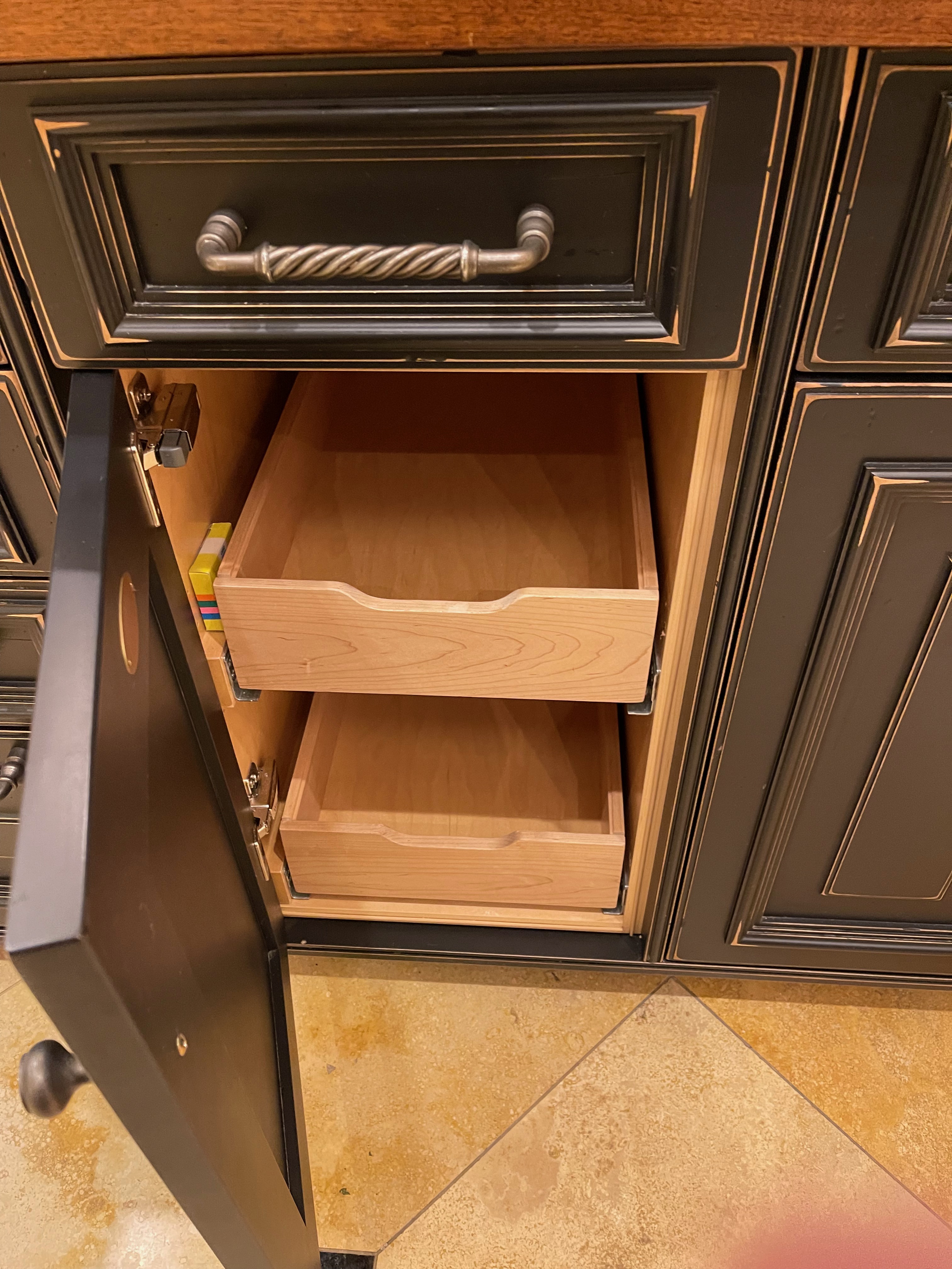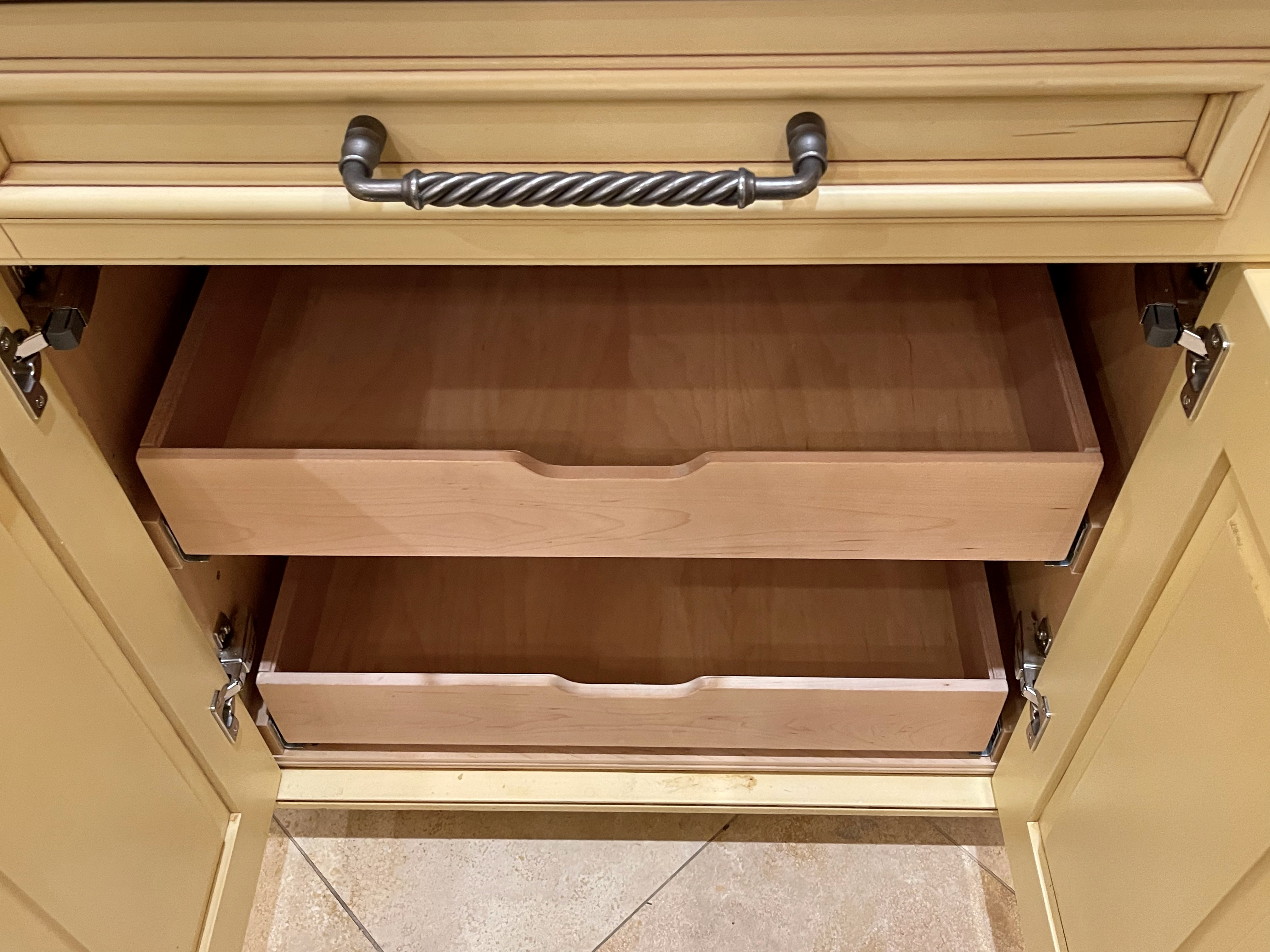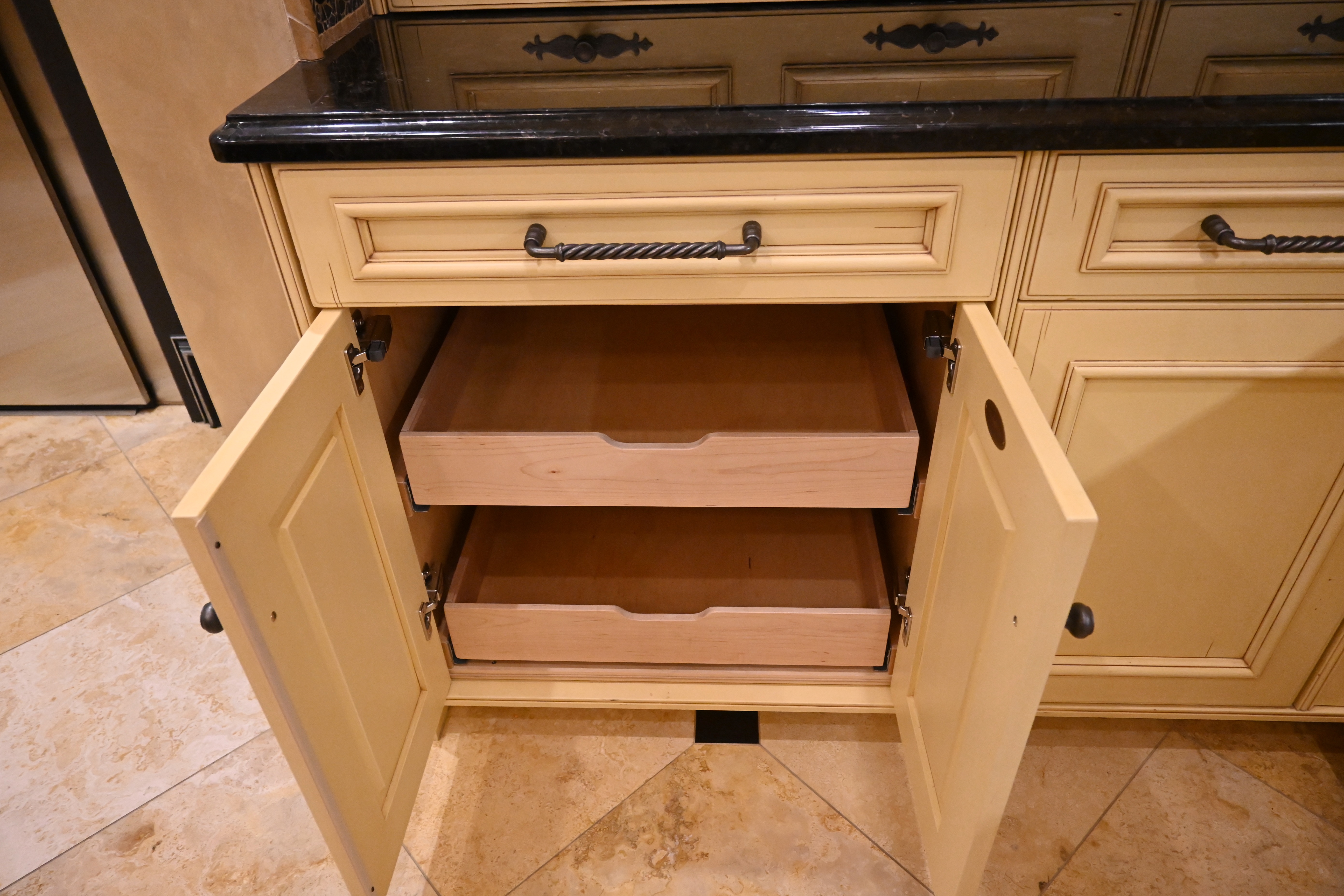 1-One drawer, Two door base cabinet w/ two pull out wood soft close drawers inside Dim.: 28”w x 36”h x 24”d
