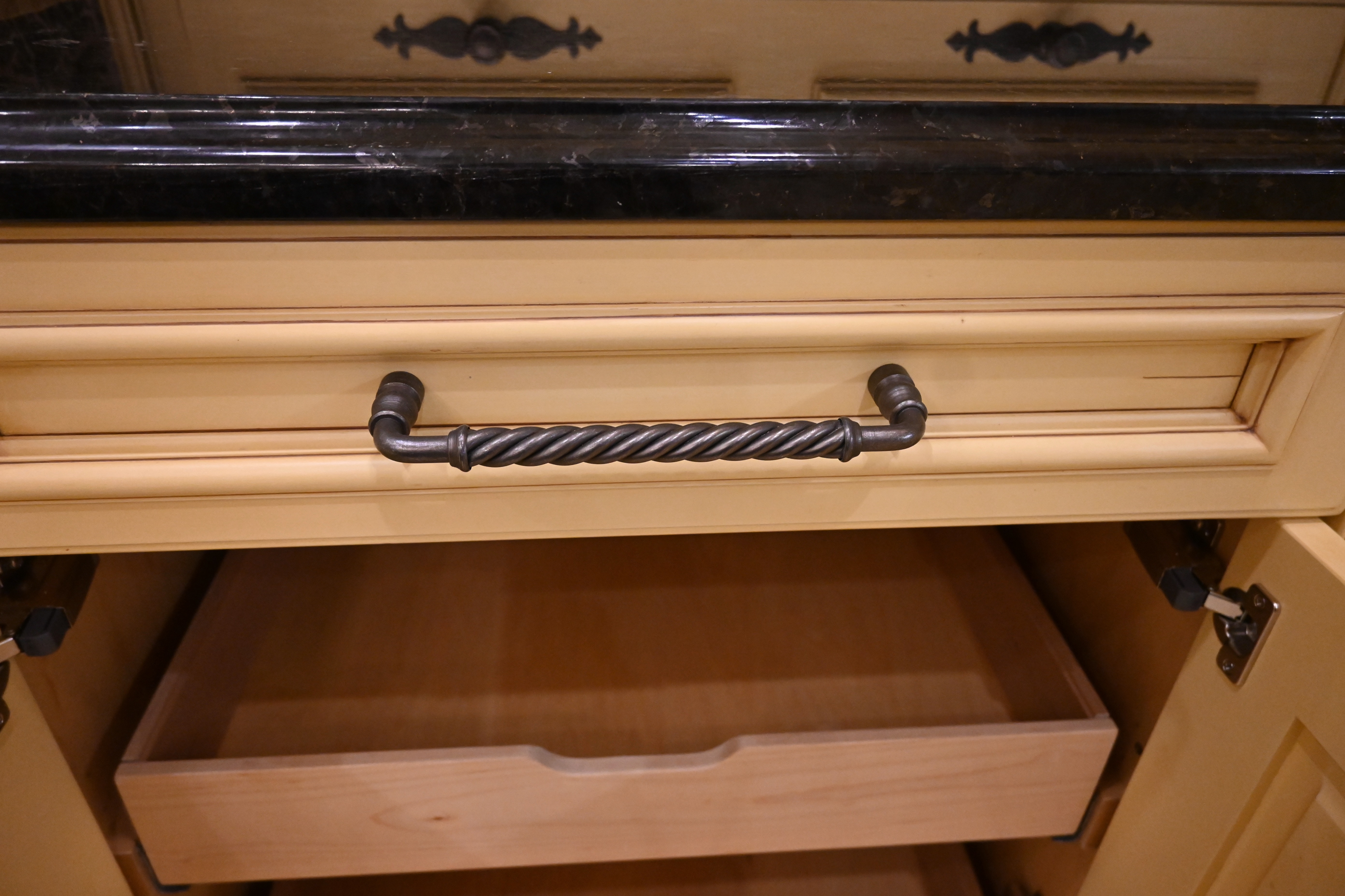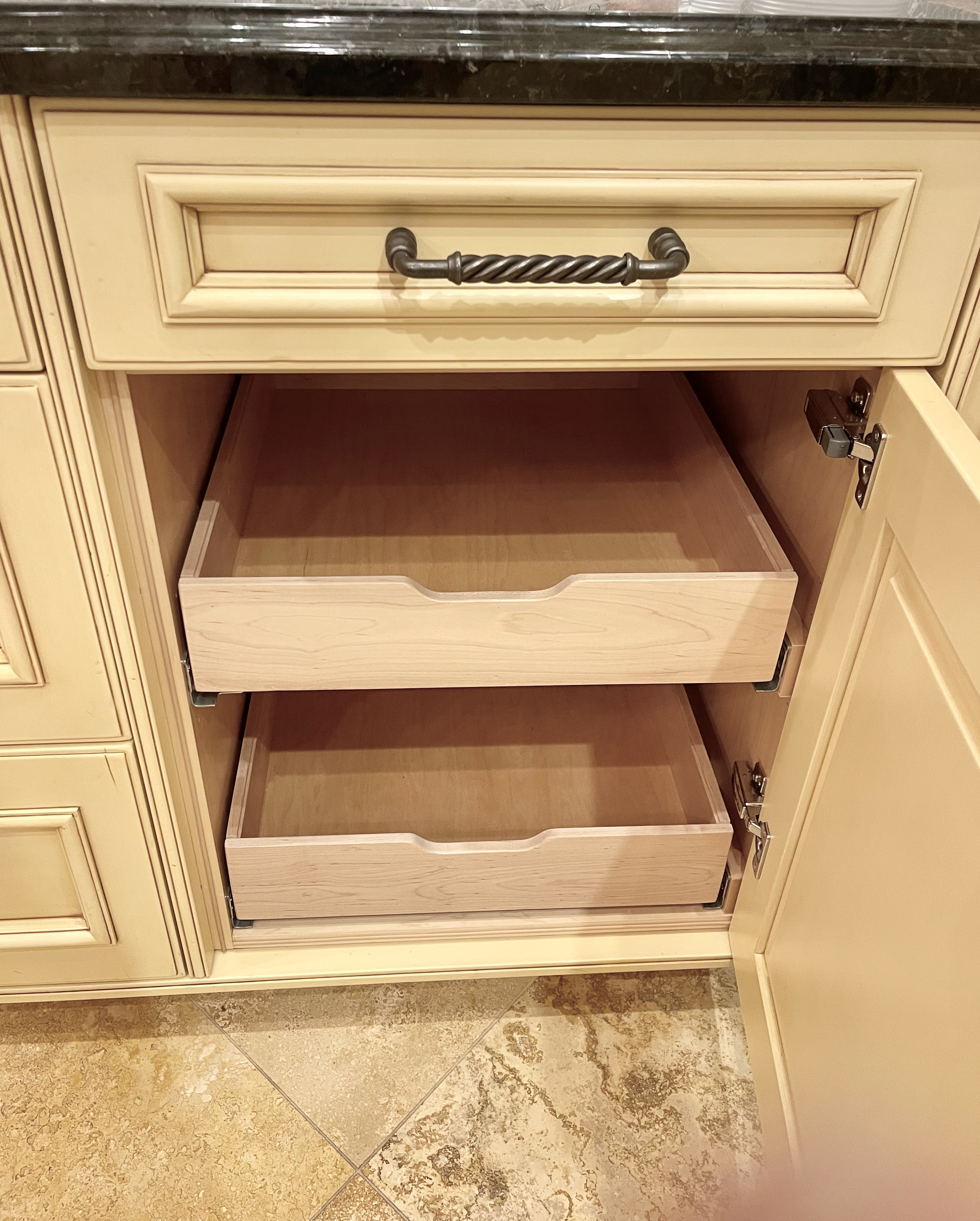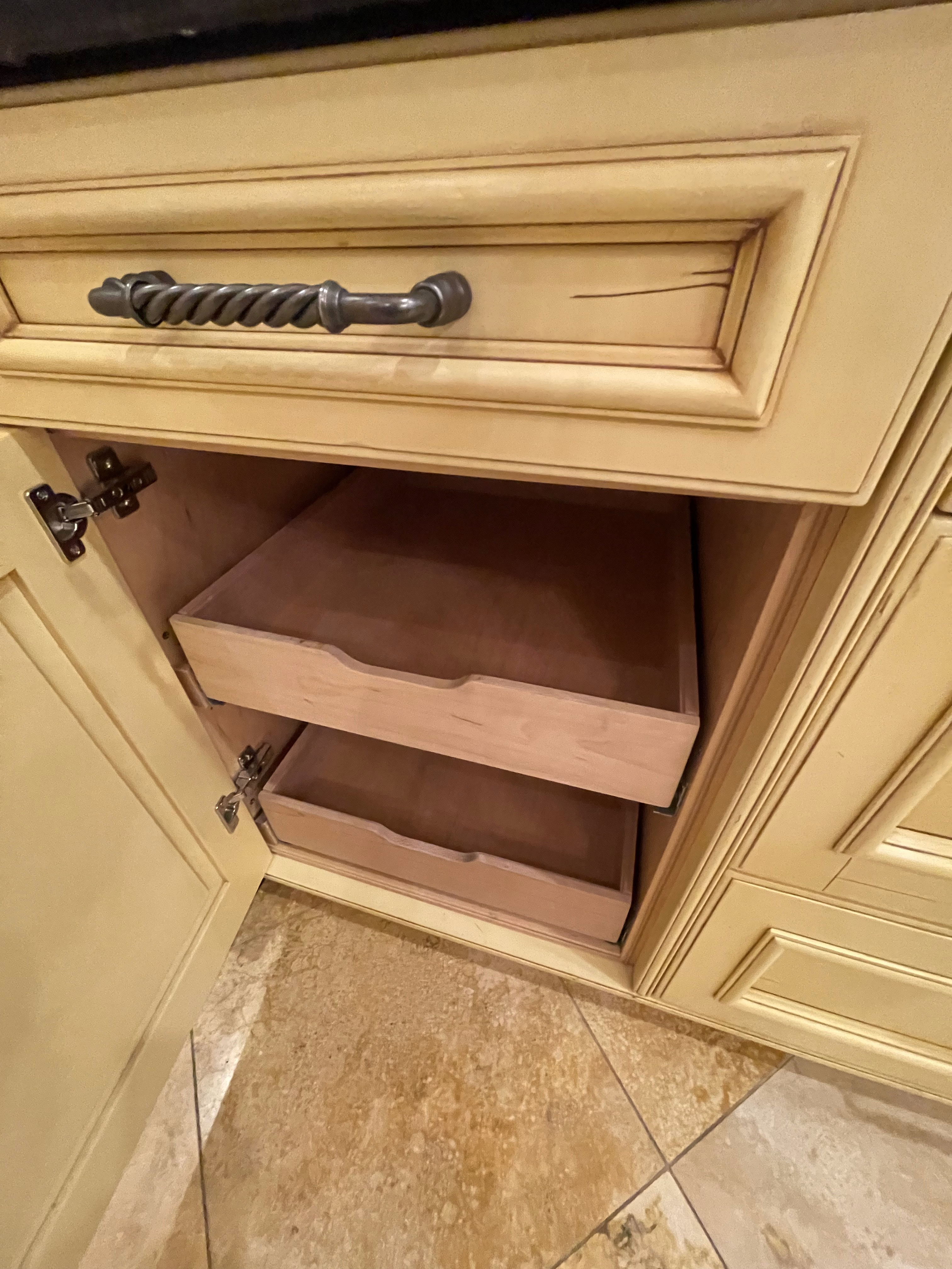 1-One drawer, Two door base cabinet w/ two pull out wood soft close drawers inside Dim.: 28”w x 36”h x 24”d