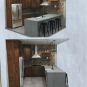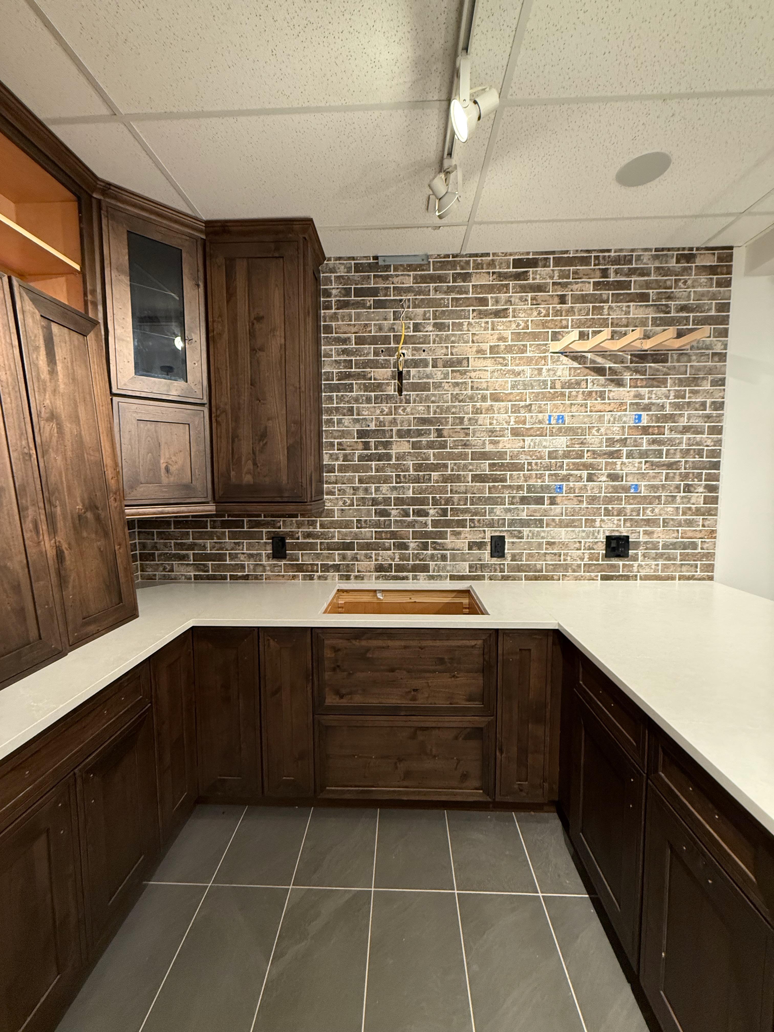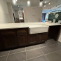 Like New, "Decora" Kitchen cabinety, Kitchen Showroom display! The kitchen cabinetry is a shaker style in the Airedale door style in Rustic Alder wood with the Mink finish. The cabinets have upgraded insert organizers and all drawers have the soft close feature with dovetail joinery. The slab countertops are a Silestone with a waterfall countertop on the end of the peninsula. The set comes with a very nice Blanca white apron sink, along with three Kichler pendant lights. This is a great deal for new kitchen cabinetry, countertops and apron sink that are only 5 years old! The kitchen showroom package can be purchased and uninstalled anytime. Trim carpenters and granite fabricators can be hired to uninstall the display. Cabinet drawings are attached. Price for the set below.