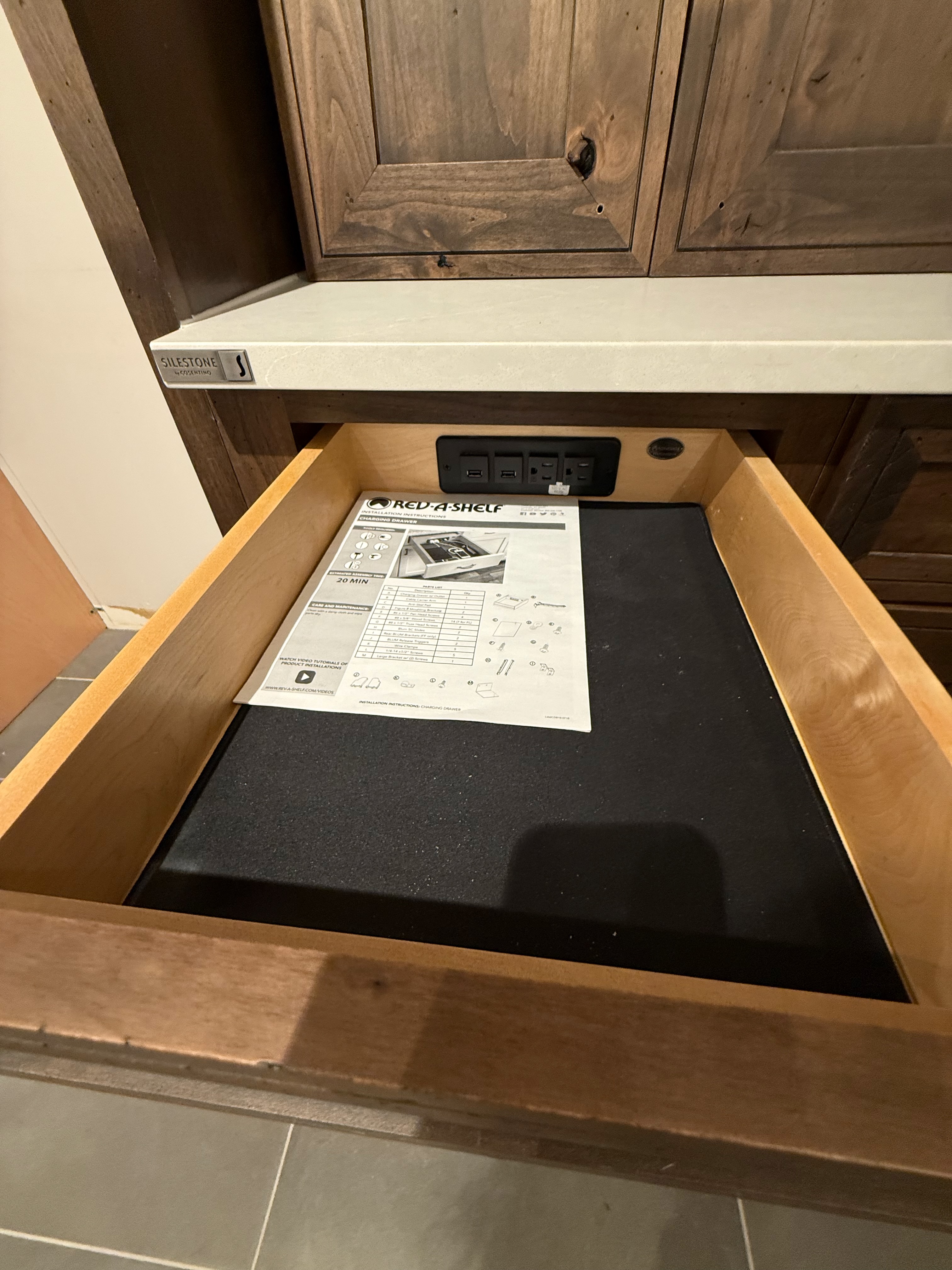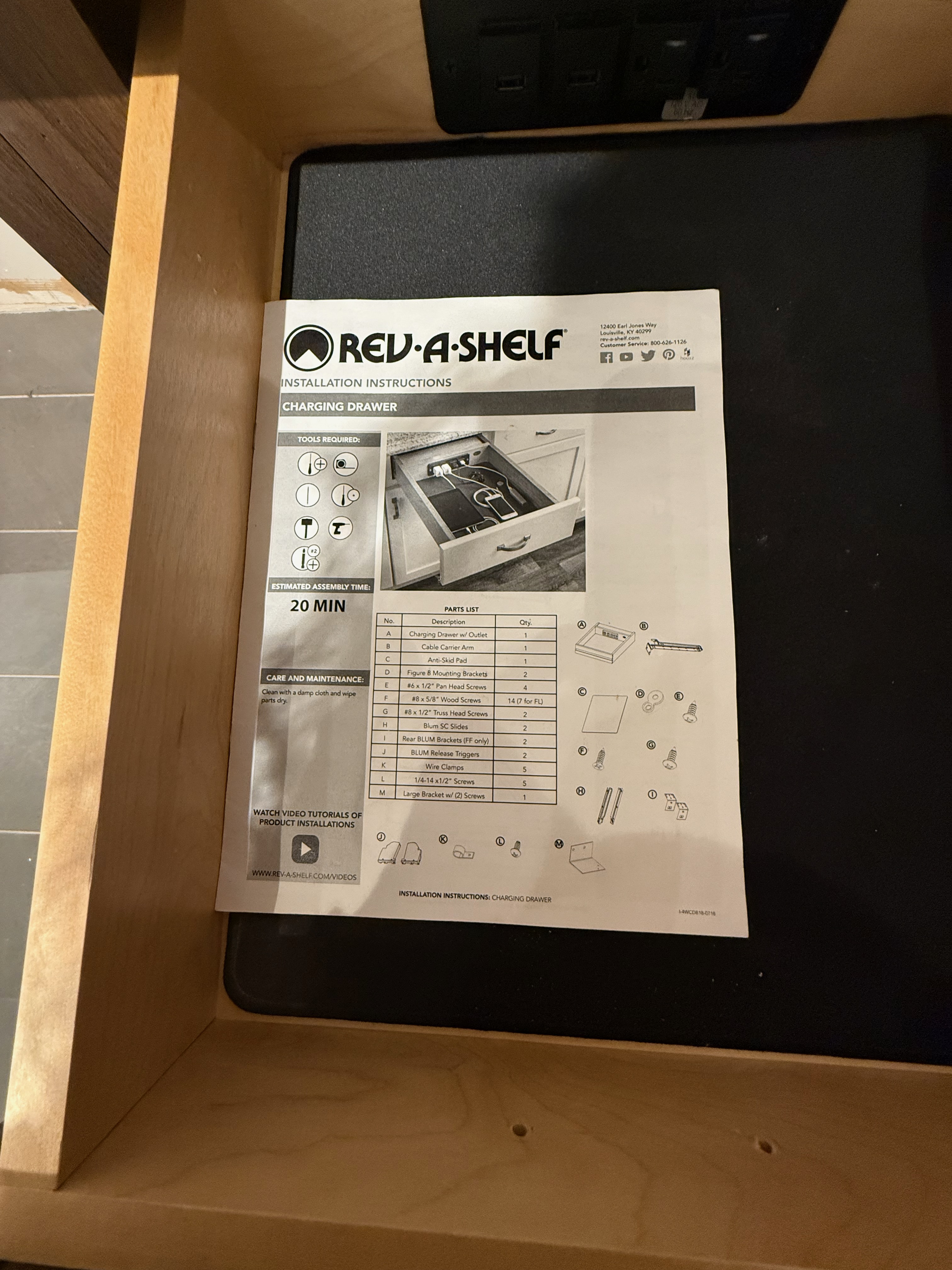 1-One drawer, One door base cabinet w/ Rev-A -shelf charging drawer with outlets Dim.: 18"w x 36"h x 24"d
