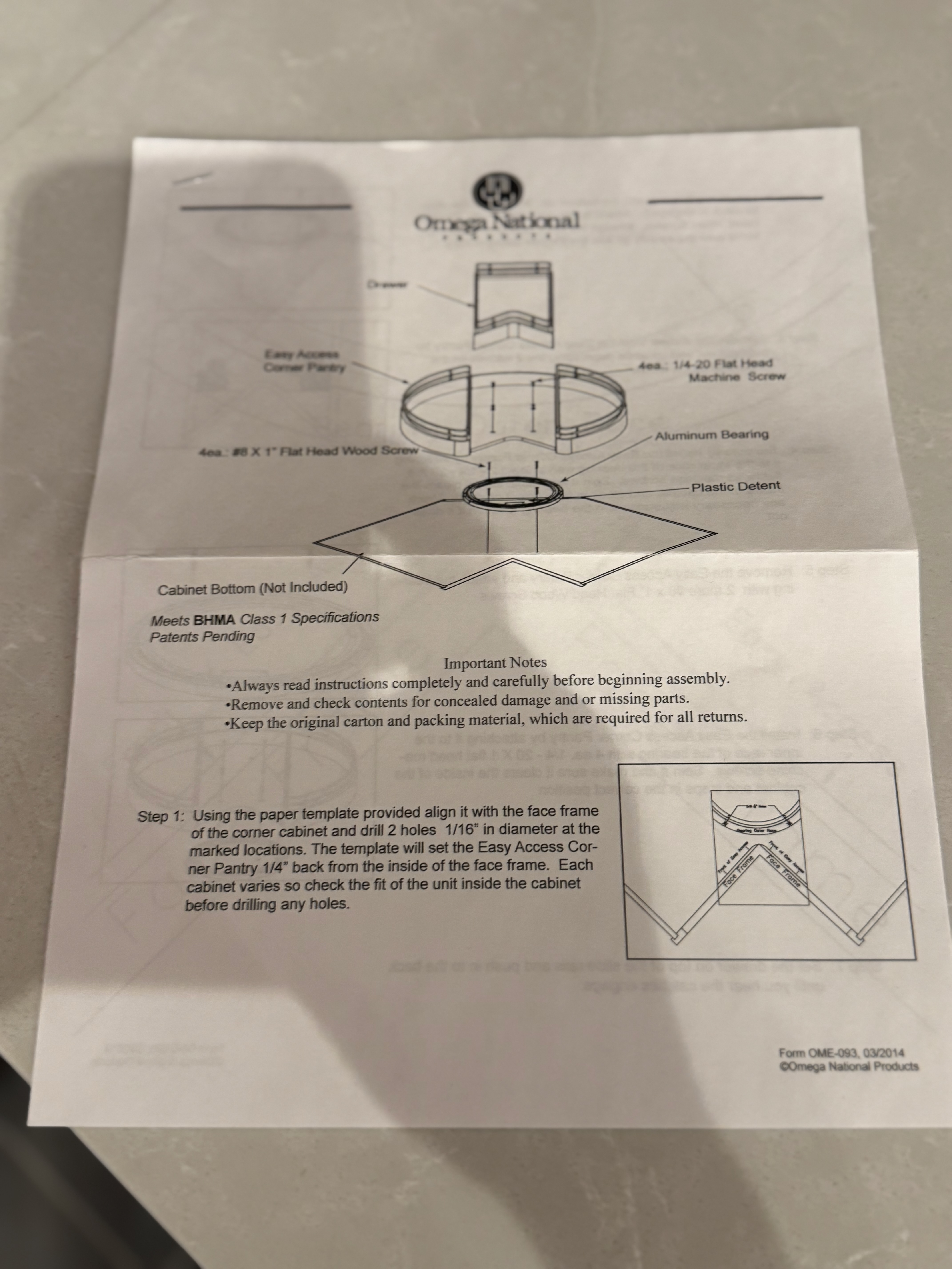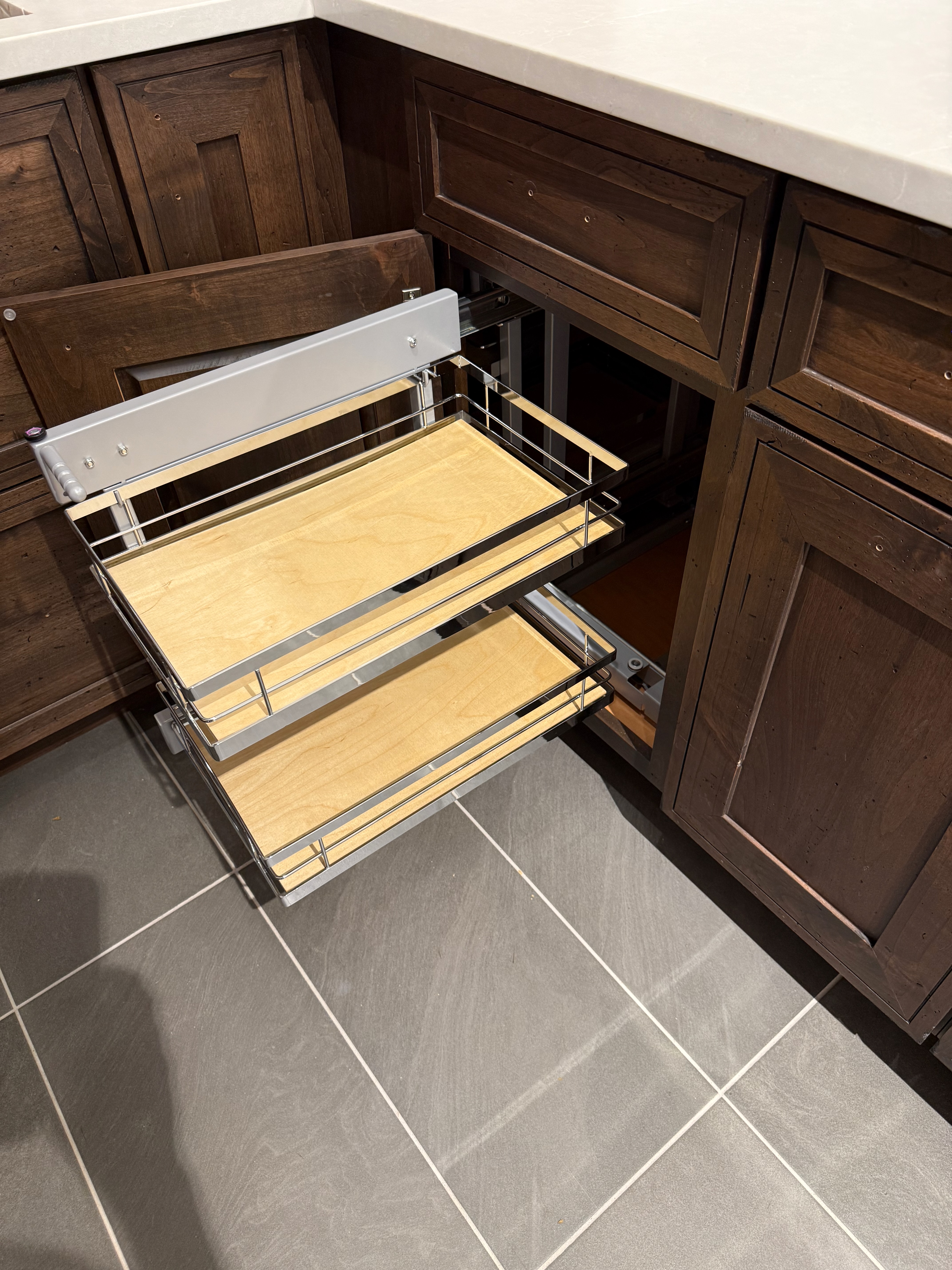 1-One drawer, one door blind corner left base cabinet w/ Omega 30” easy access corner pantry shelf blind corner left Dim.: 45:w x 36”h x 24”d