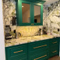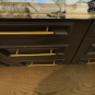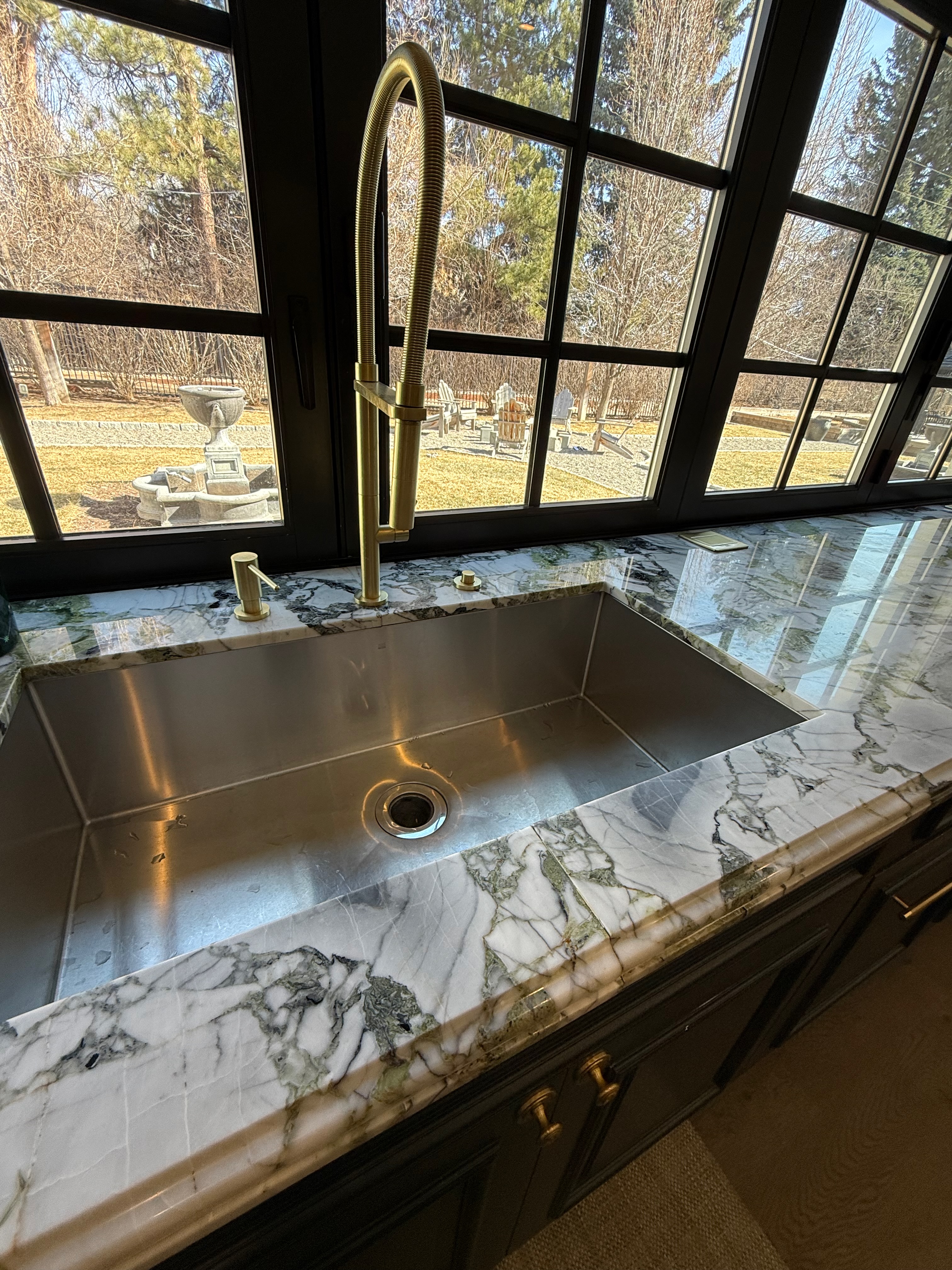 1-Two door main sink base cabinet Dimensions: 40” w 35 ¼”h cabinet only/37”h x 24” d, single basin stainless steel sink, California faucet set in brass and disposal