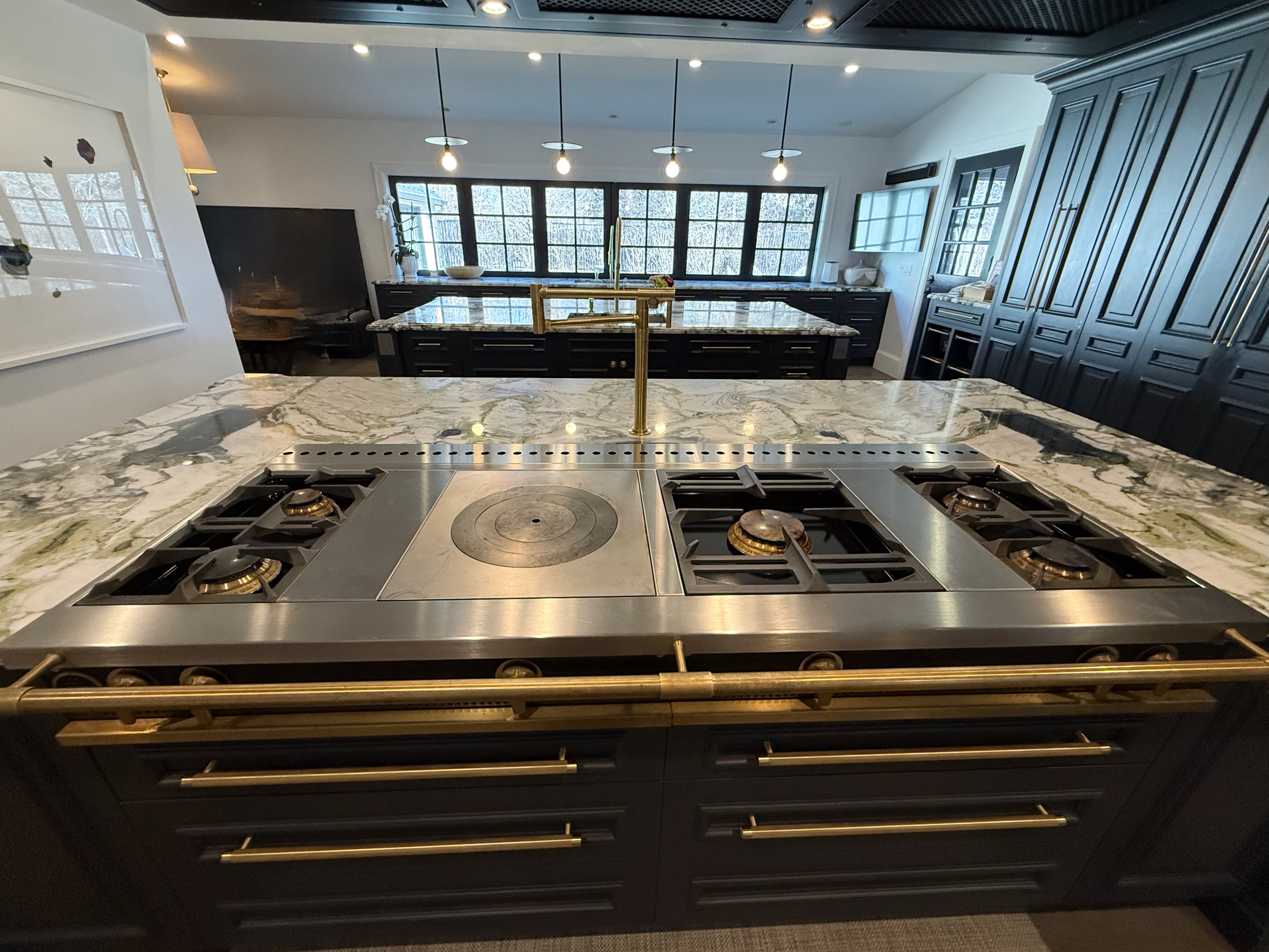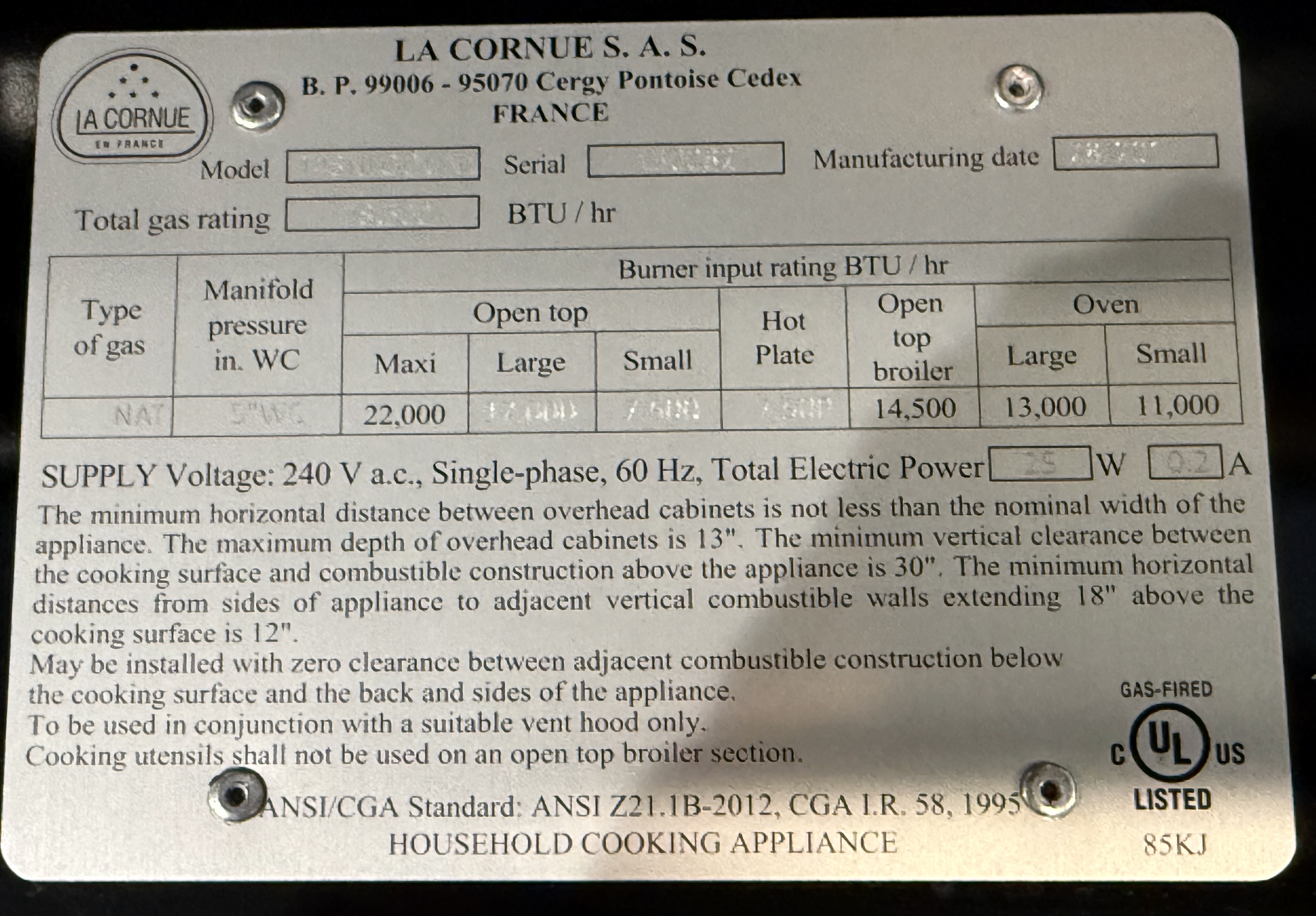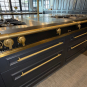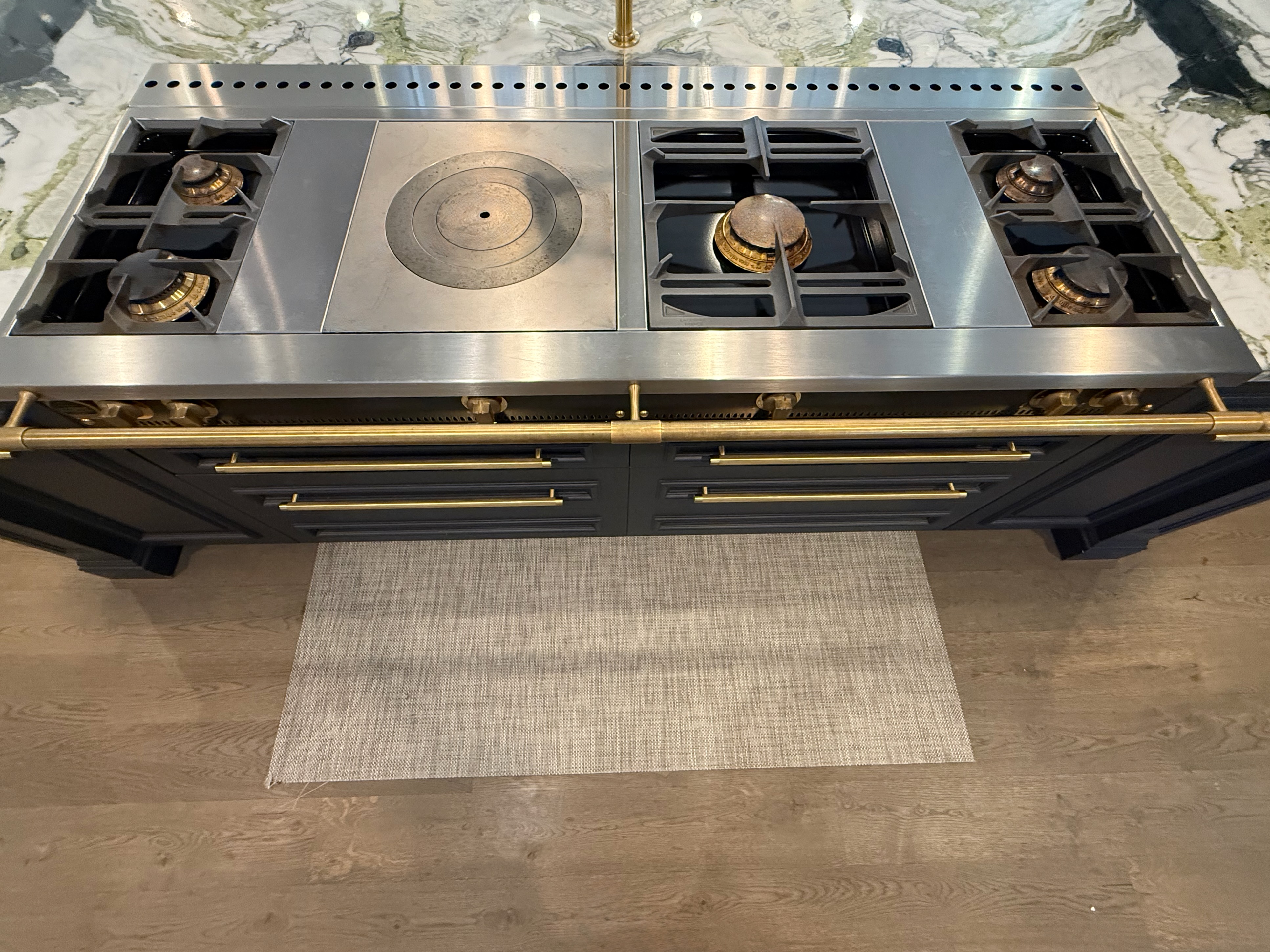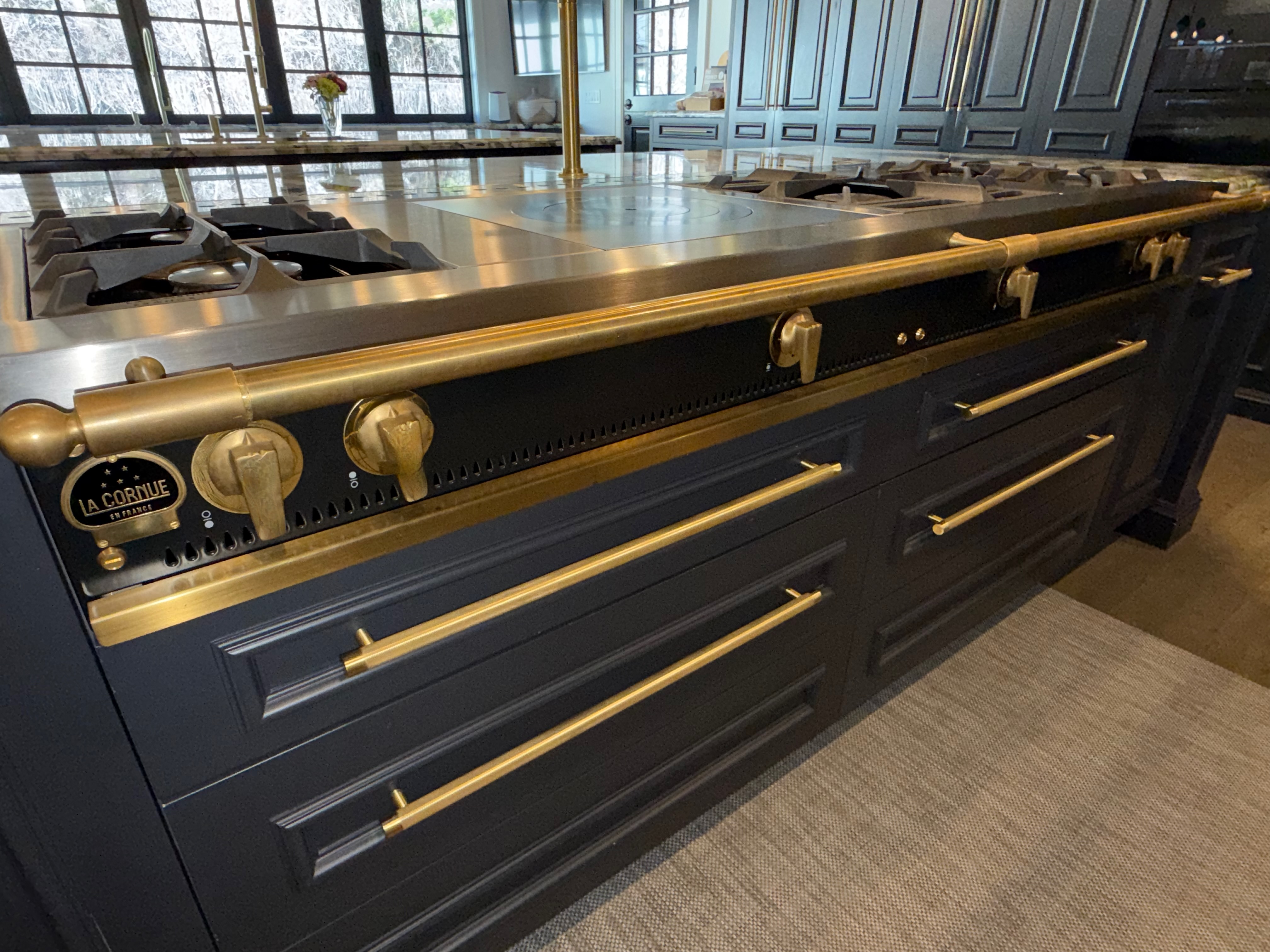 72” La Cornue Château Grand Palais custom-made Range Top in black with a polished brass trim package Model #T48NL000N1Serial#130082 11/17, 180 US N1 2 gas burners (small burner at the back) 1 Plaque “French Top” (large) 1 maxi burner, 2 gas burners La Cornue range top 180 T48 Dimensions: 70.9 w x 27.6 "d x 7.9" h (inches) La Cornue range tops are handcrafted in France to order by local artisans . Each unit is manufactured in a specialized workshop located in Saint-Ouen l'Aumône, just outside of Paris. The company has been producing these ranges in France since 1908.