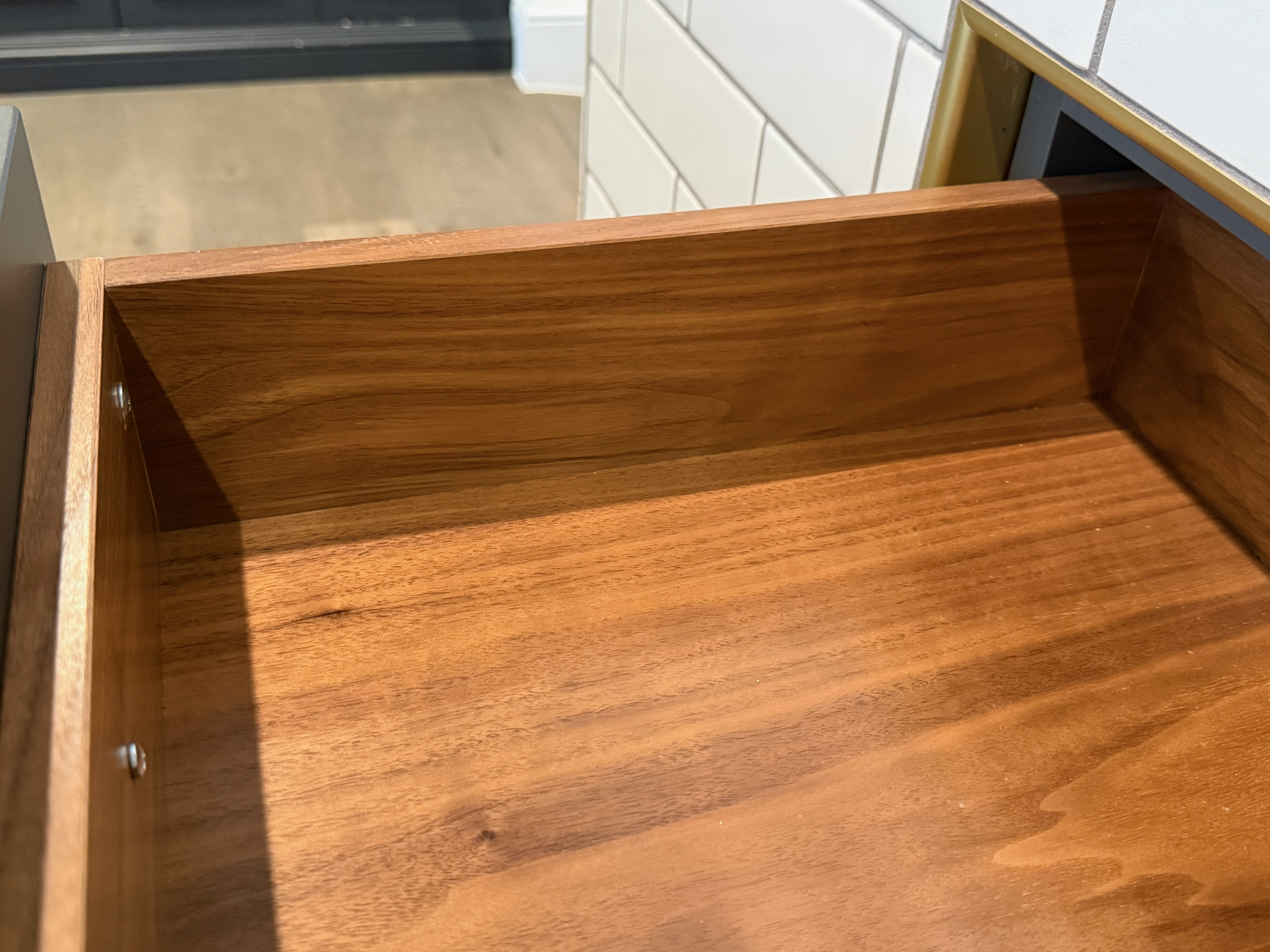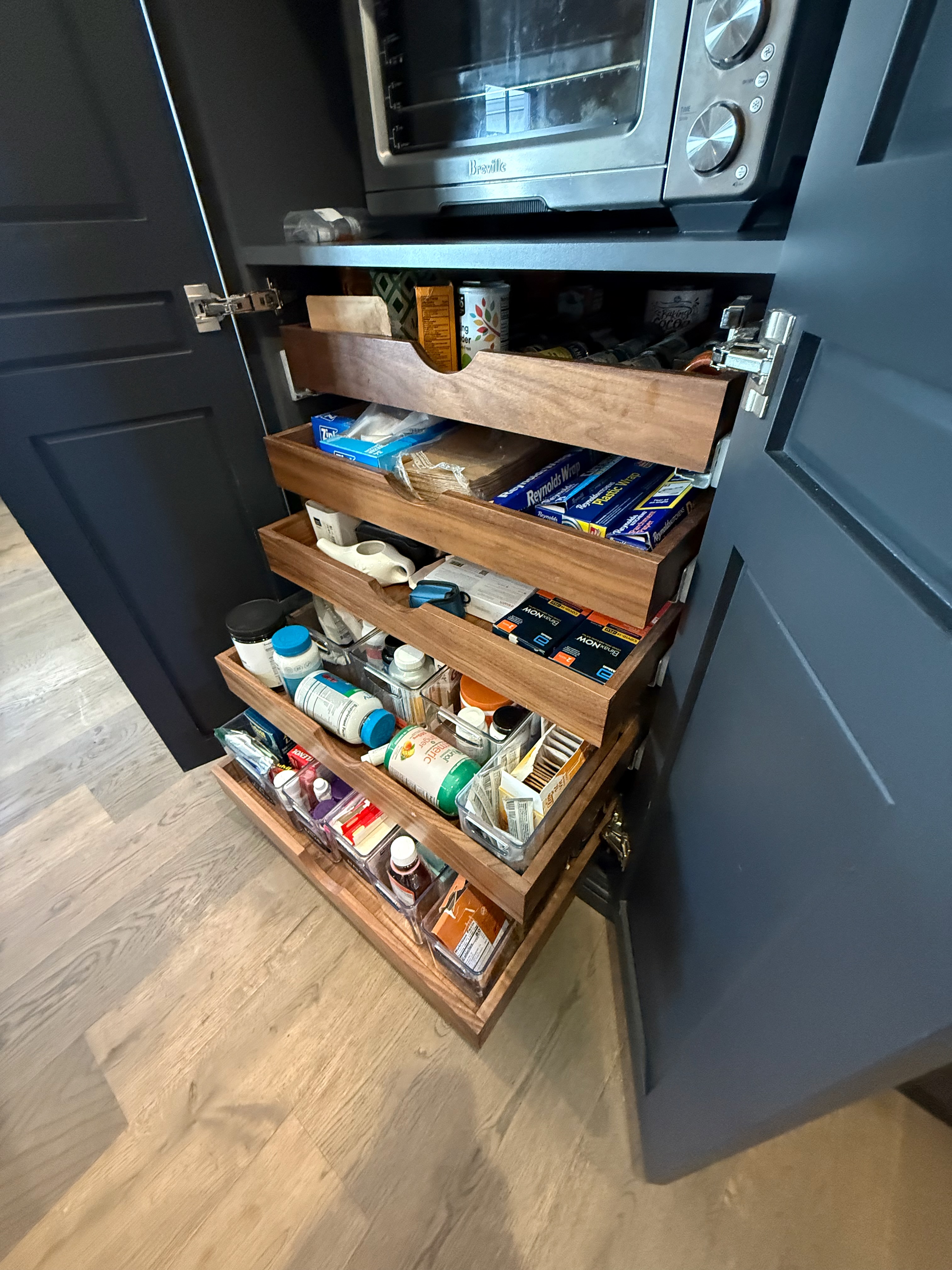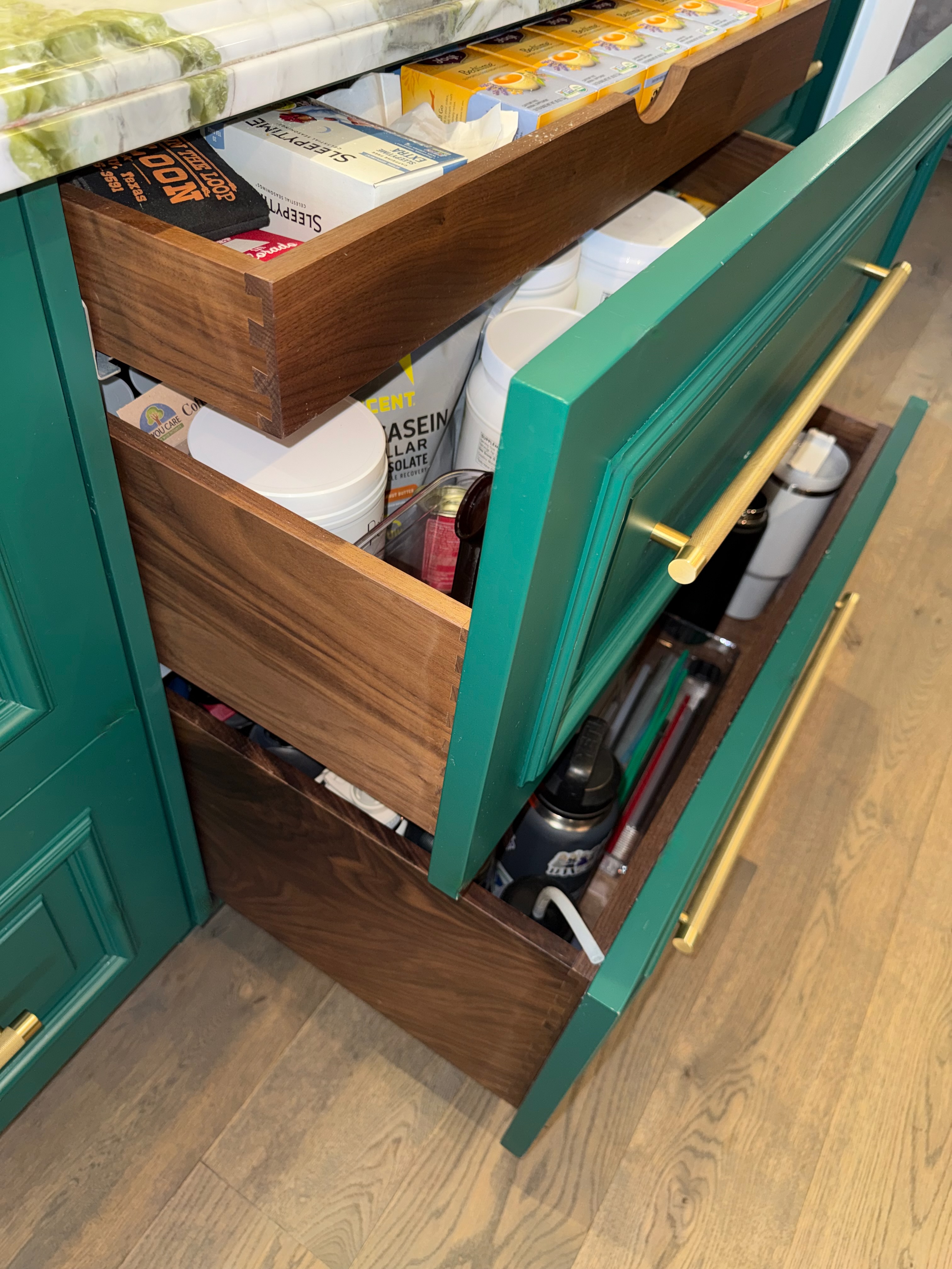 2-One door base cabinets on the back of the island with Walnut wood roll-out drawers inside +$600