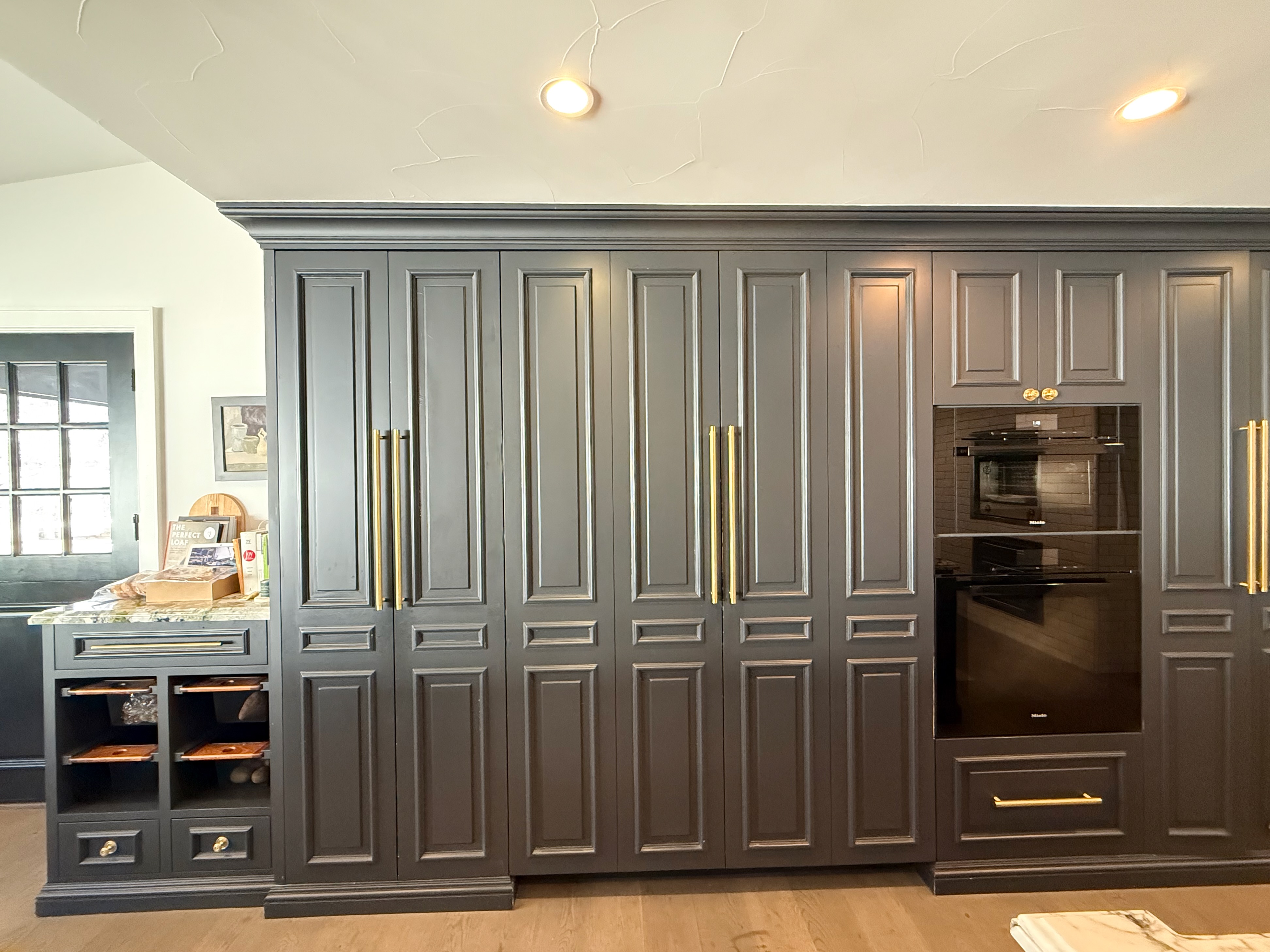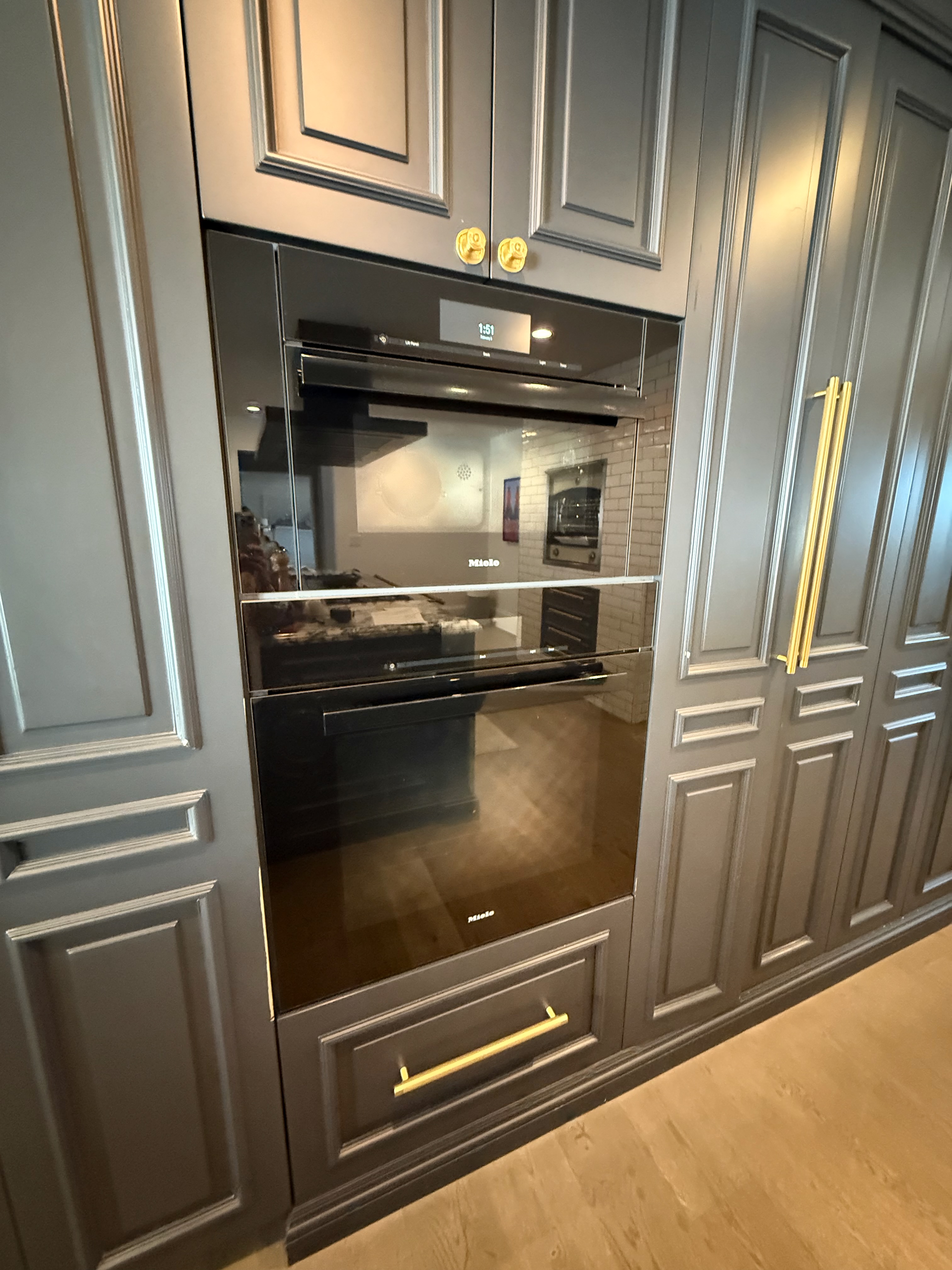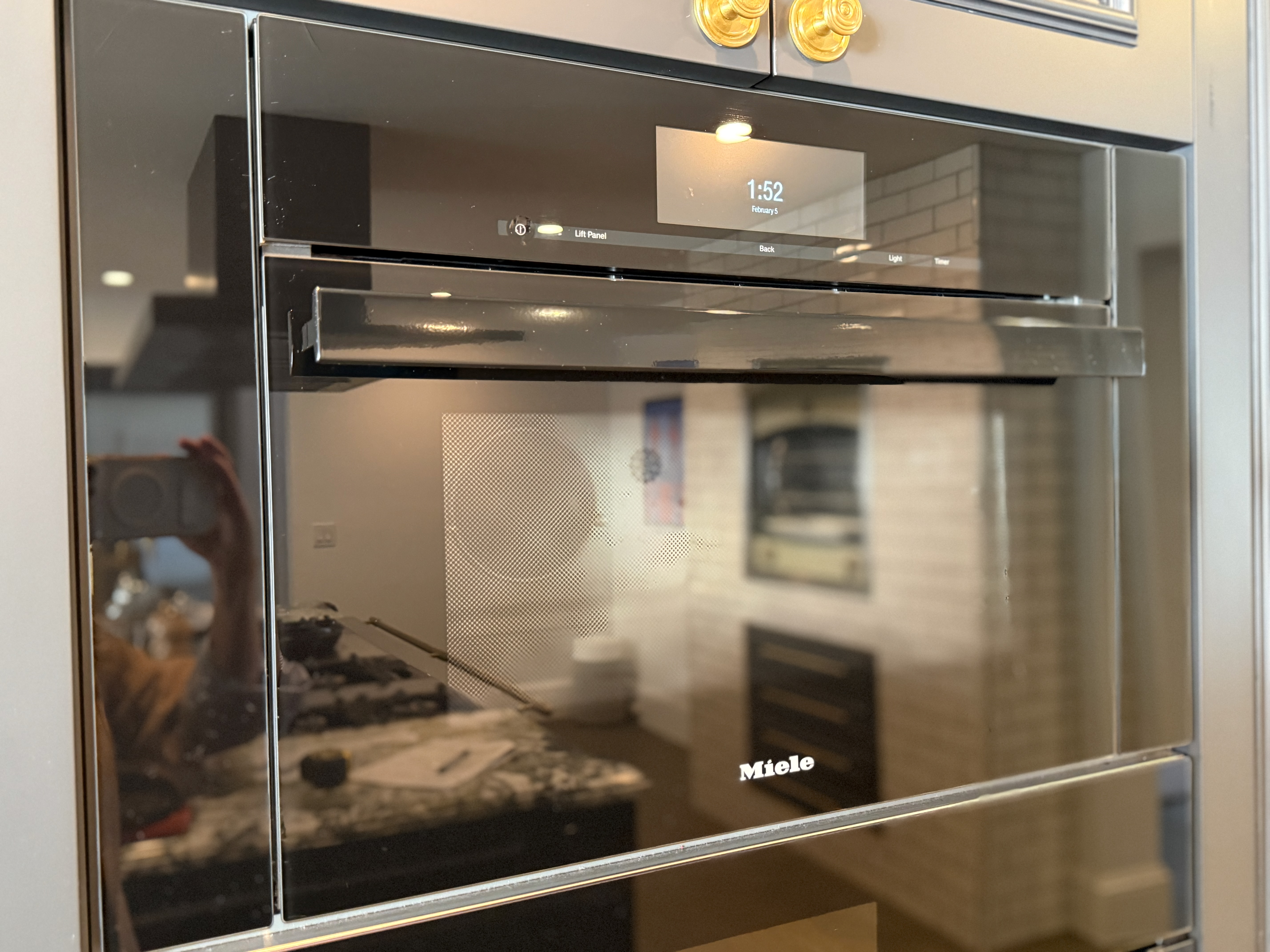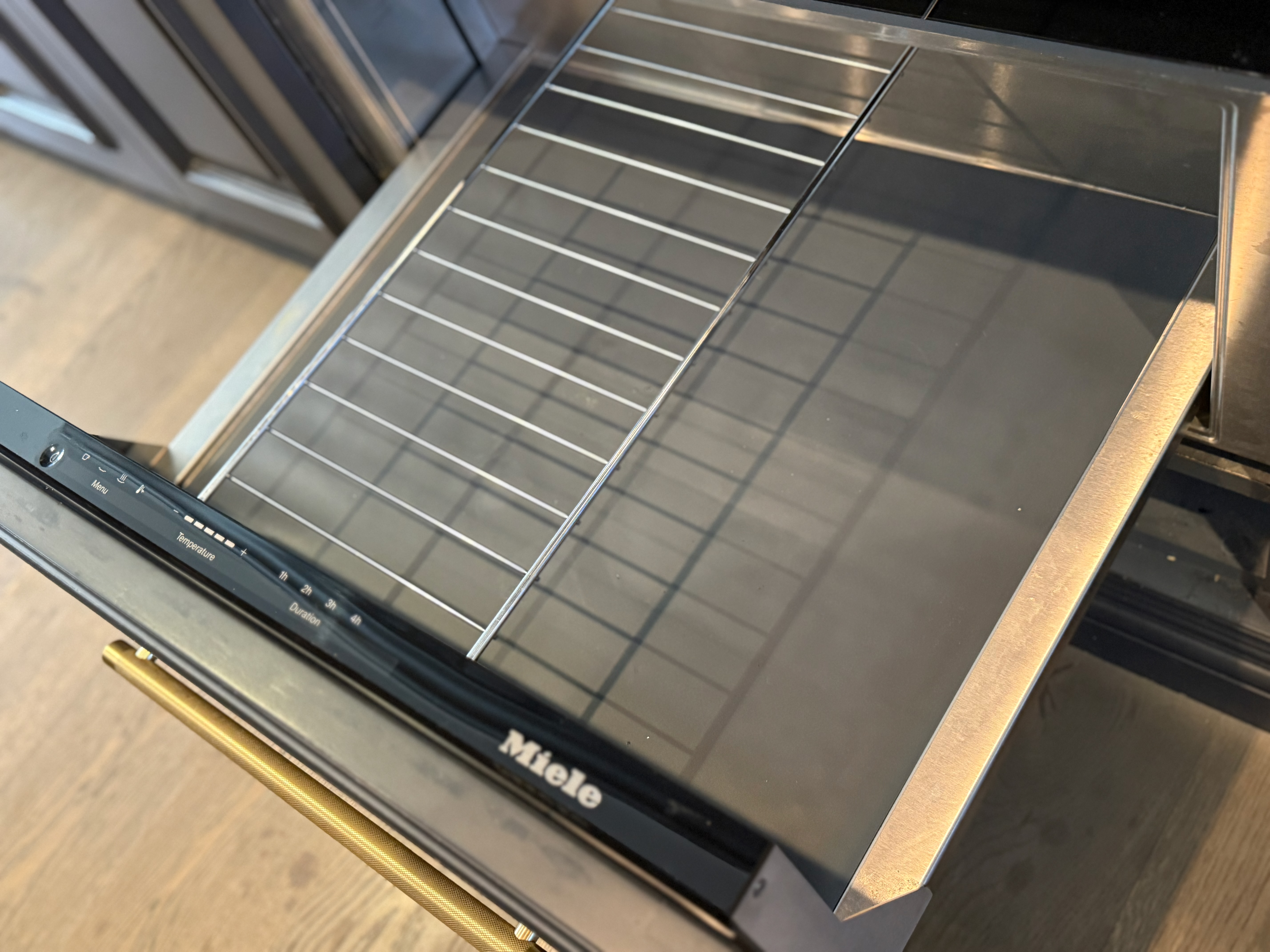 30” Miele warming drawer panel ready on the pantry wall below the oven