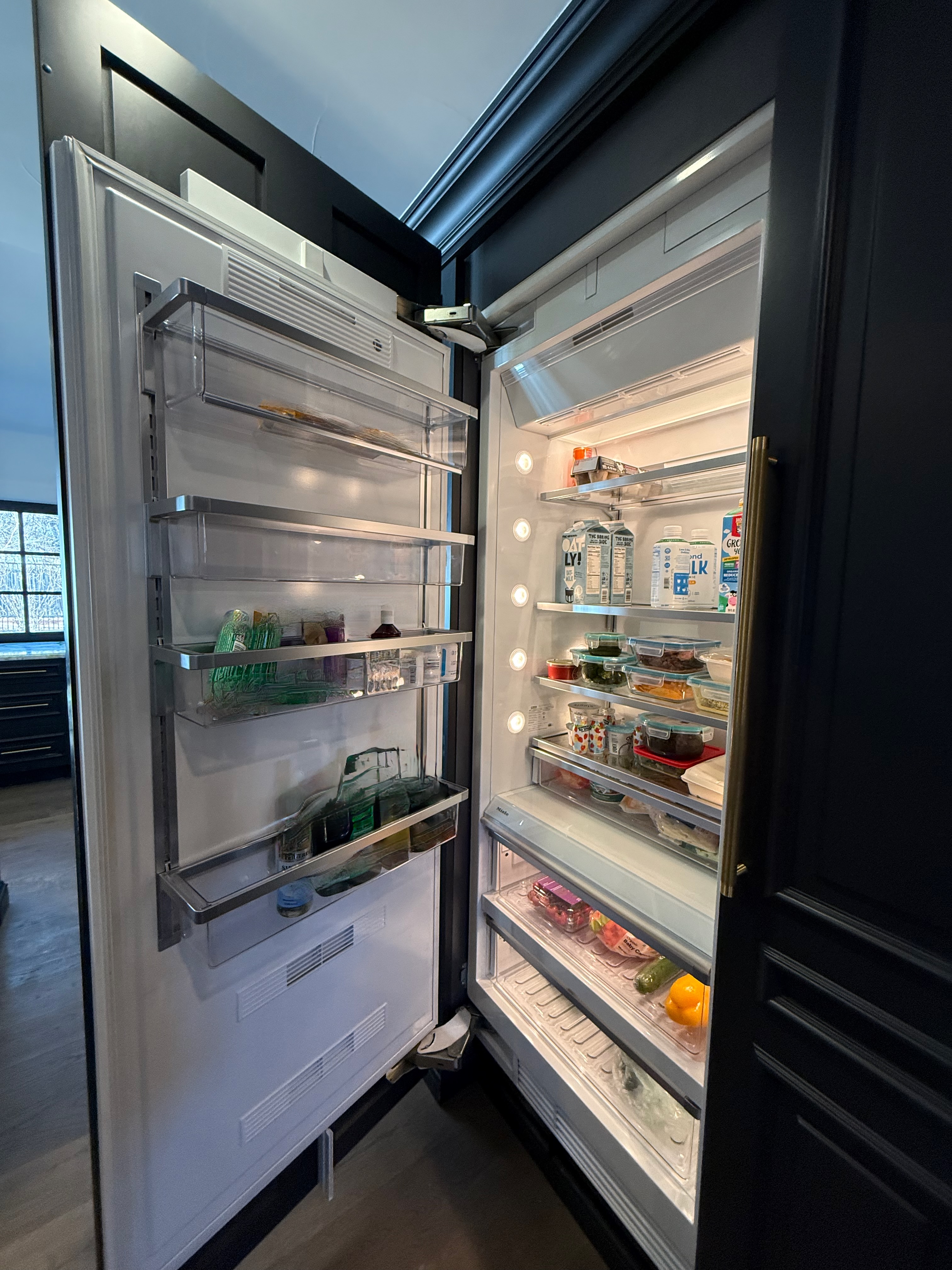 2-30” Miele Panel ready all Refrigerator columns on the pantry wall, with 15.9 Cu. Ft. Capacity, Spillproof Glass Shelving, Humidity-Controlled MasterCool Drawers, SuperCool, RemoteVision Capable, FullView Extendable Storage Drawers, and ENERGY STAR®: Panel Ready, Right Hinge & left hinge Door SwingModel #FD1612 57/780405600, Serial E Nr.#CIR30M1IR1/07, TYPE: KIMSDR30US K1803Vi