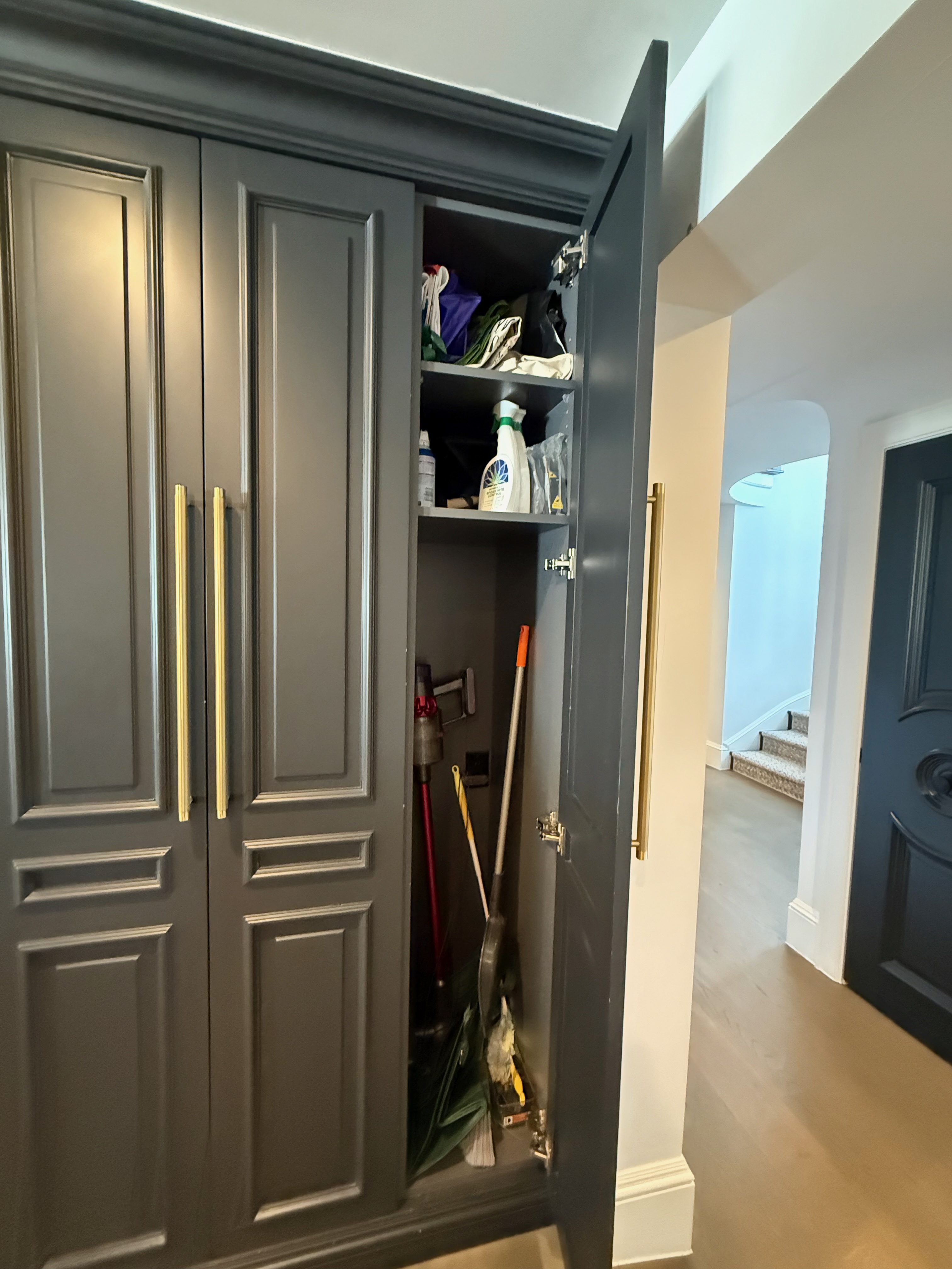 1-One door double tall broom closet with two shelves inside Dim.: 15”w x 89 ¾”h cabinet only/ 94 ½”h w/crown x 24”d