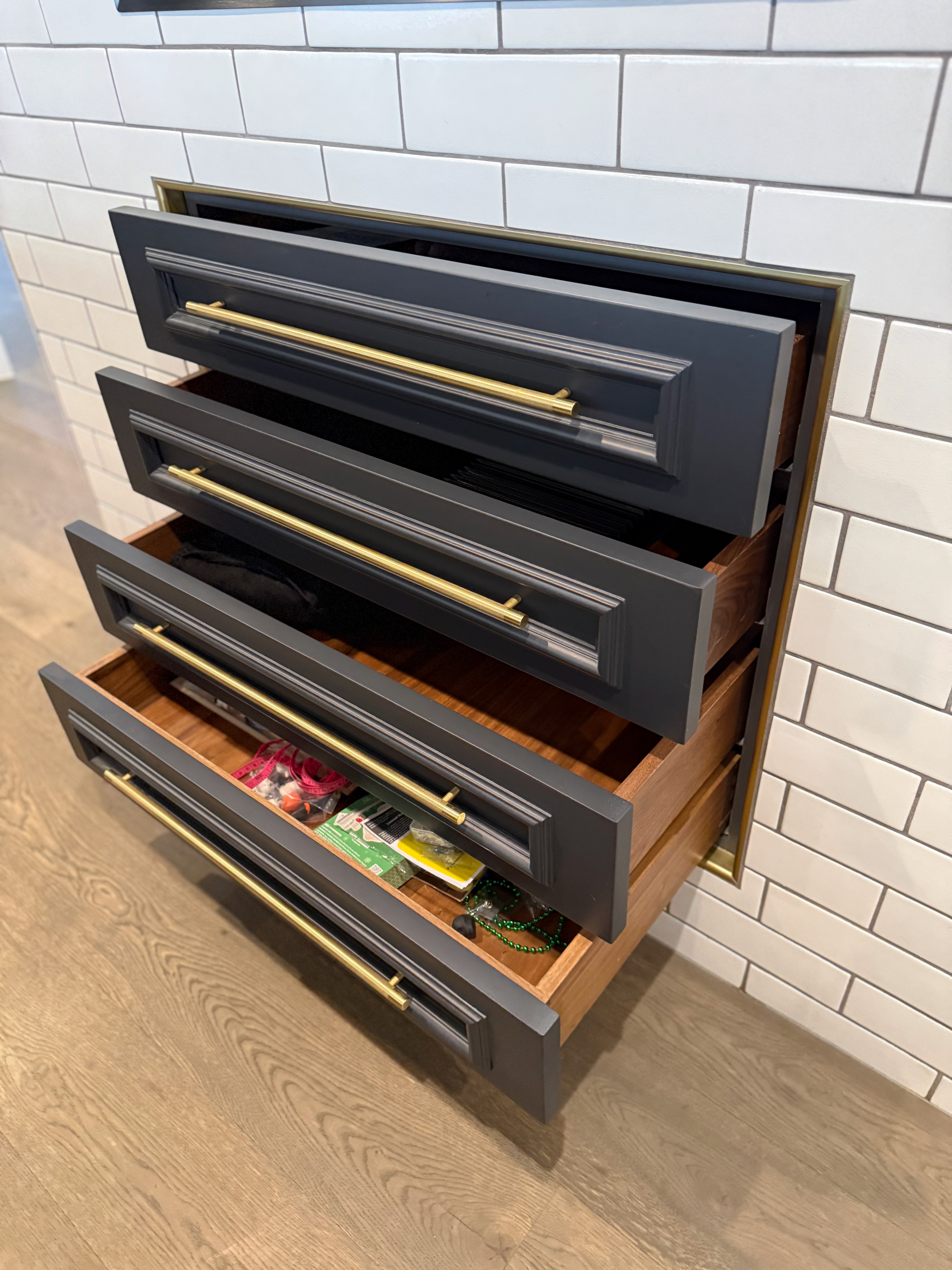 1-Four drawer base cabinet inset in the wall Dim.: 32”w x 26”h x 18 ½”d