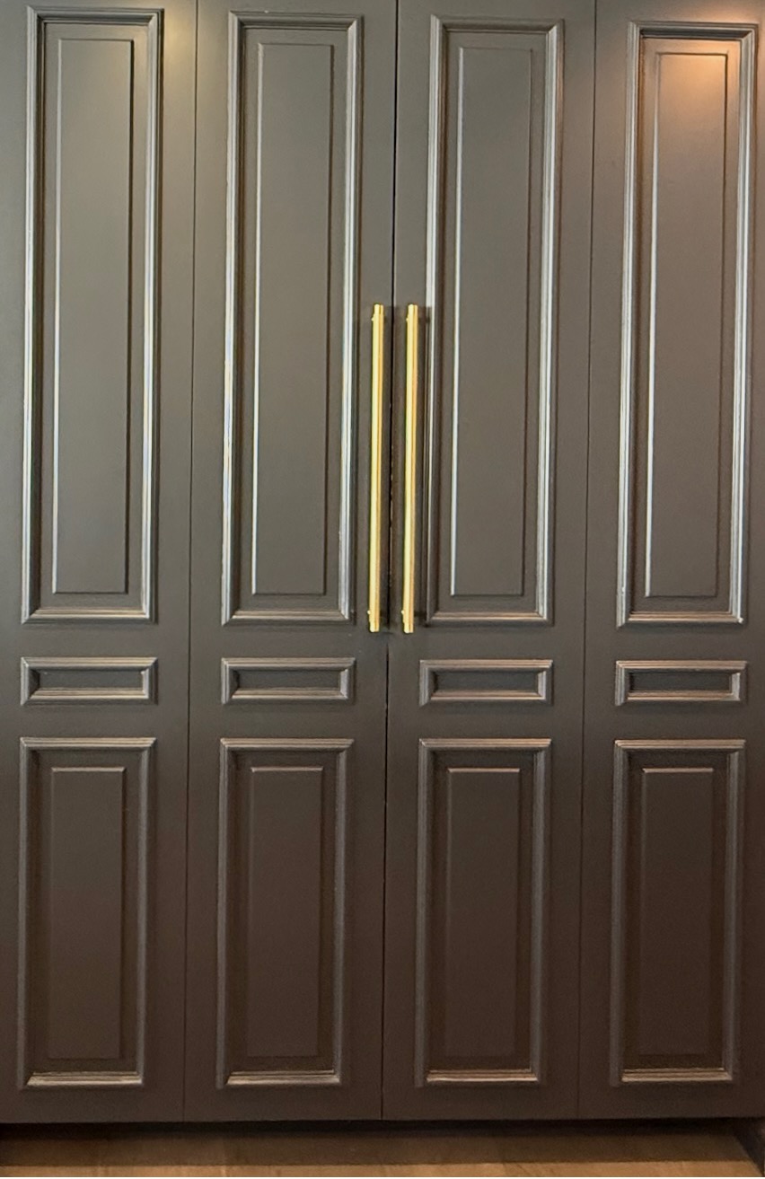 1-Two door double tall cabinet with 5 walnut wood soft-close pull-out drawers inside, walnut storage/organizer /shelving on the doors along with painted shelving inside Dim.:30” w x 89 ¾”h cabinet only/ 94 ½”h w/crown x 24”d