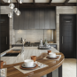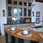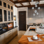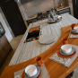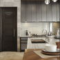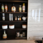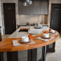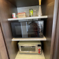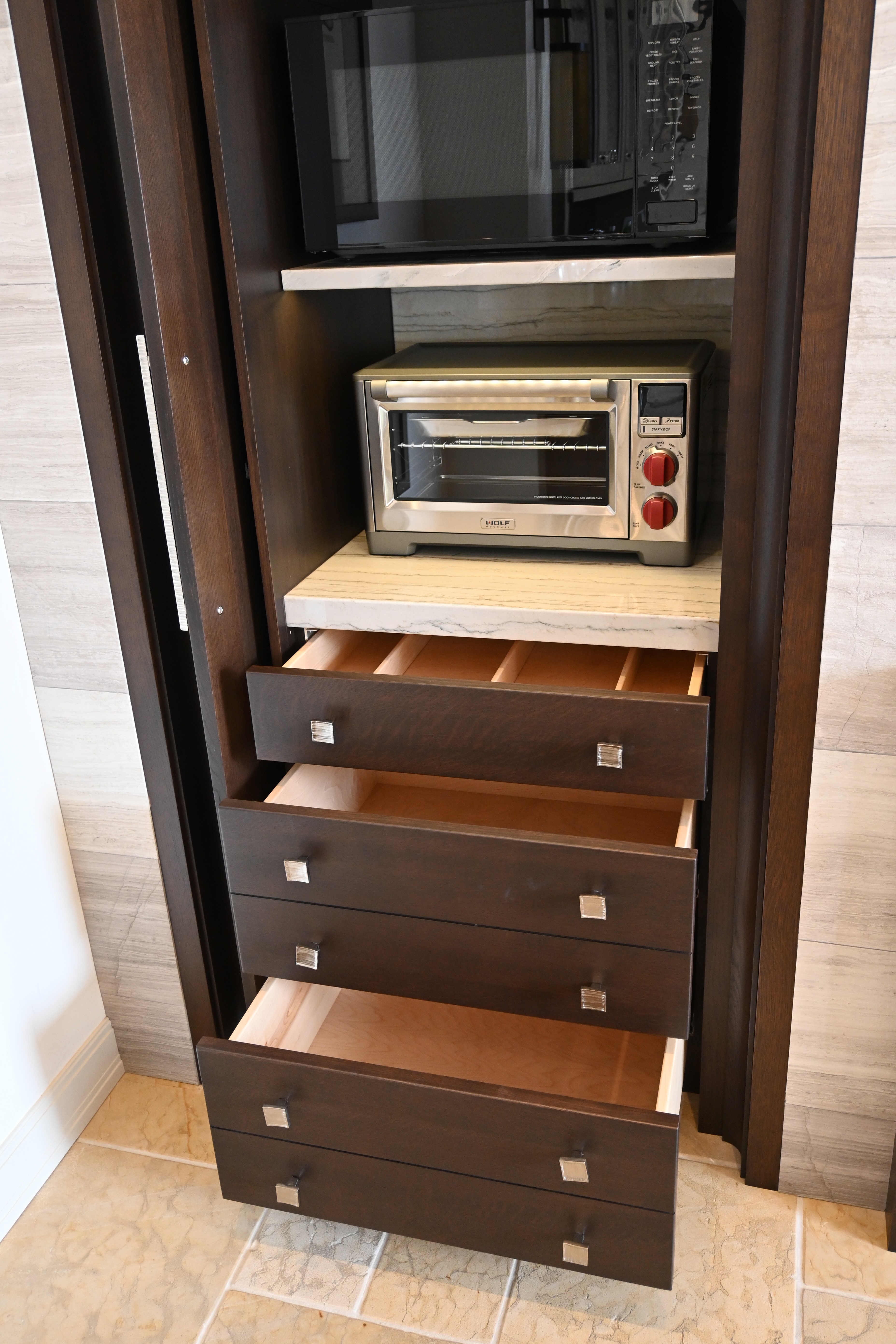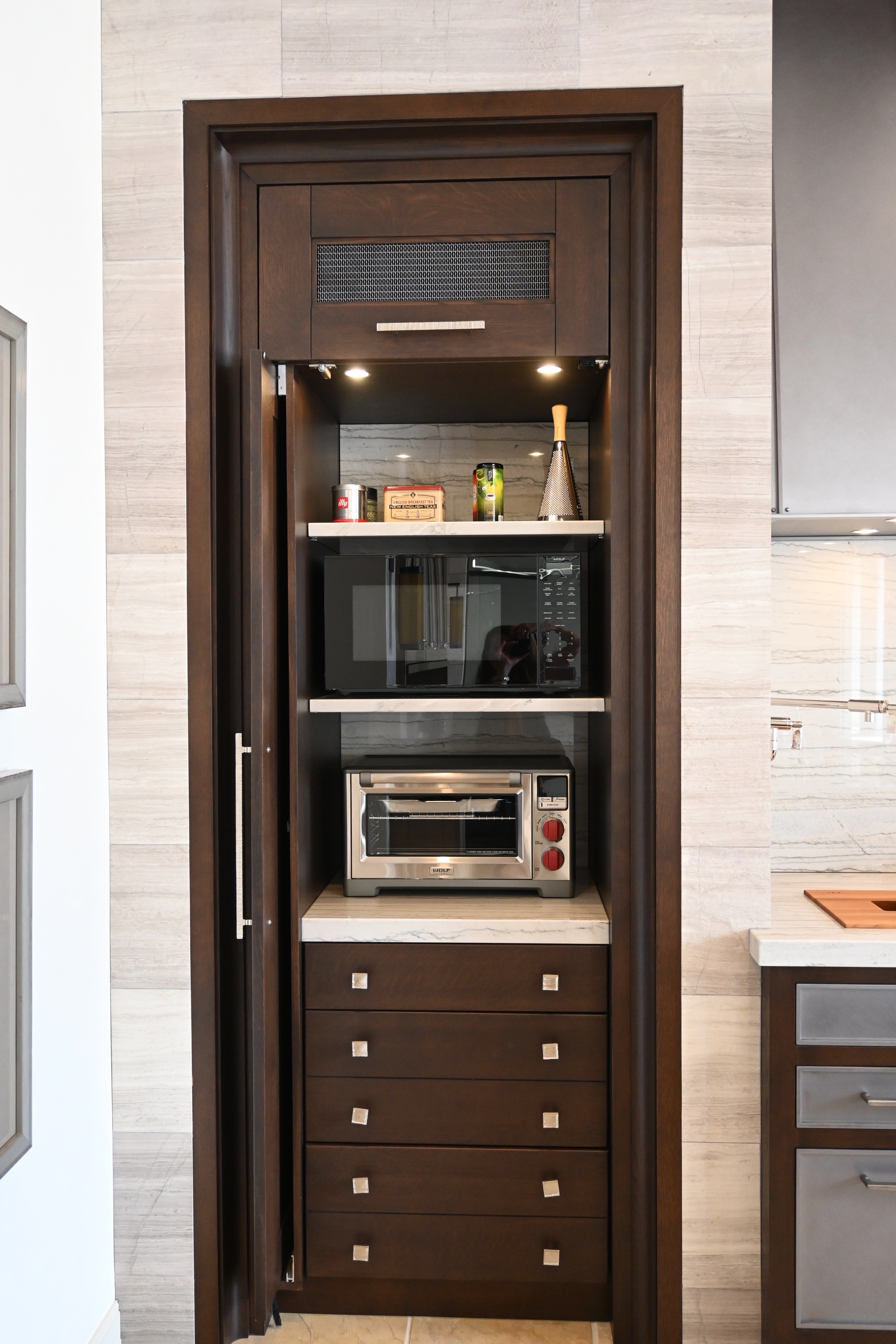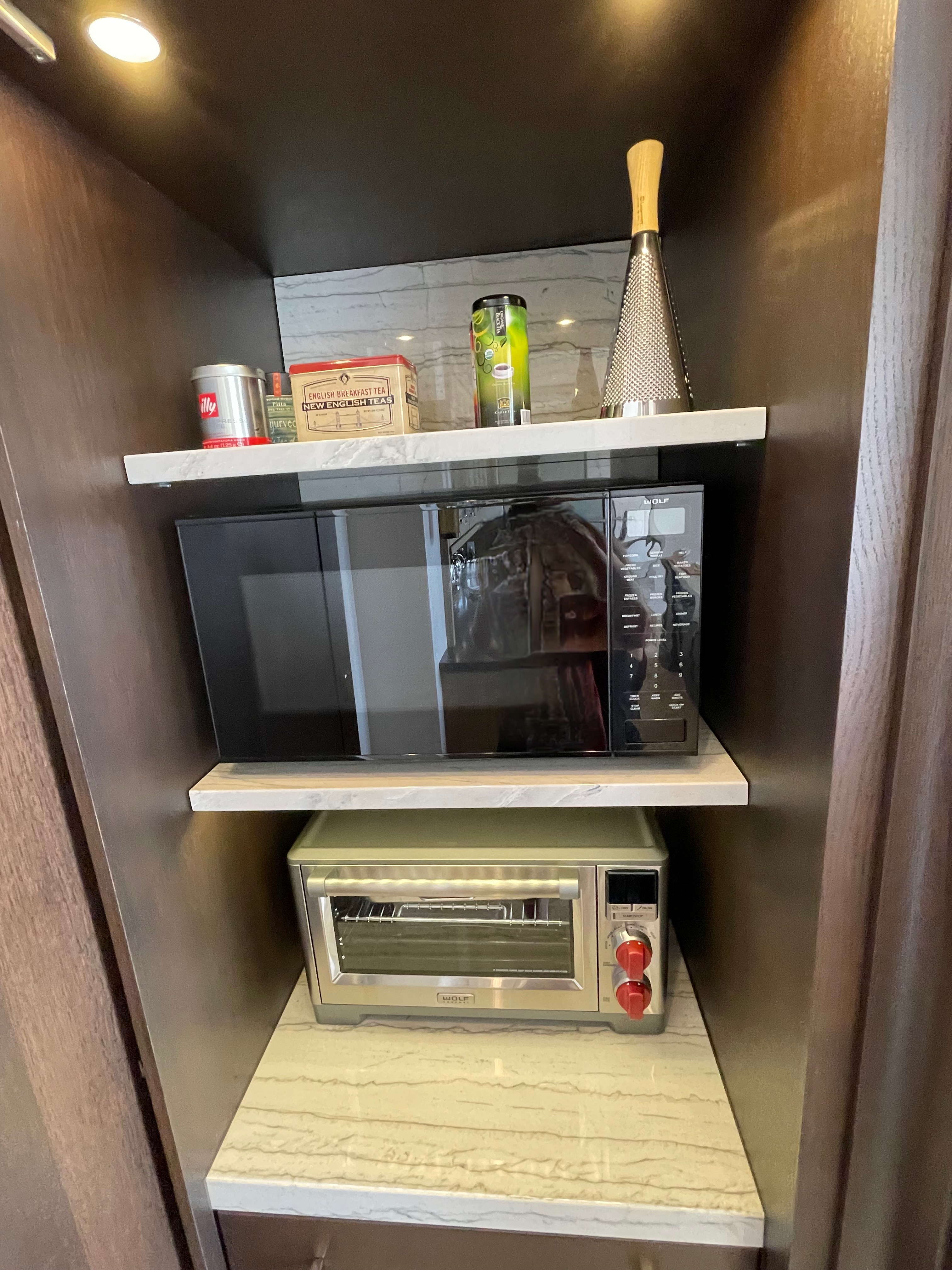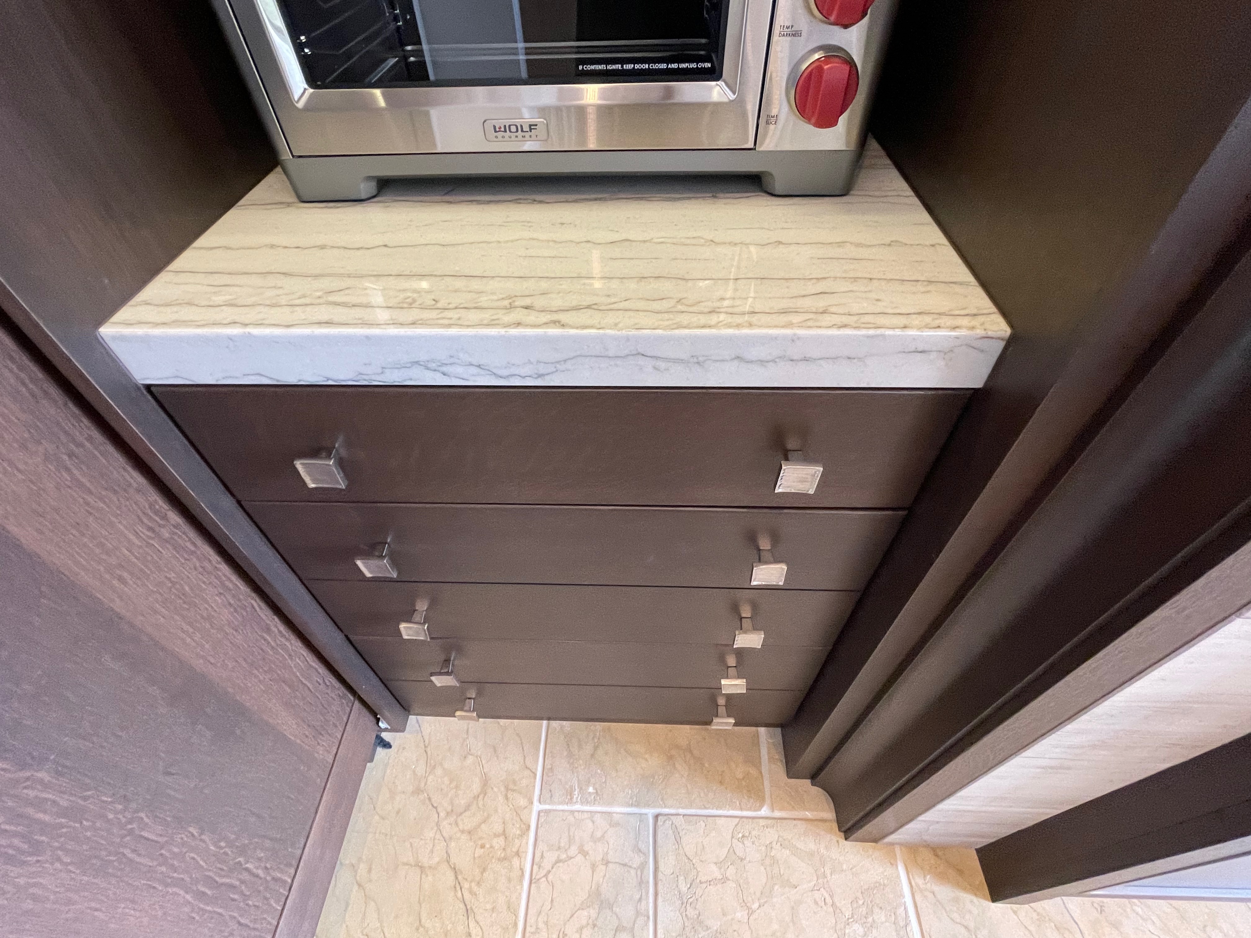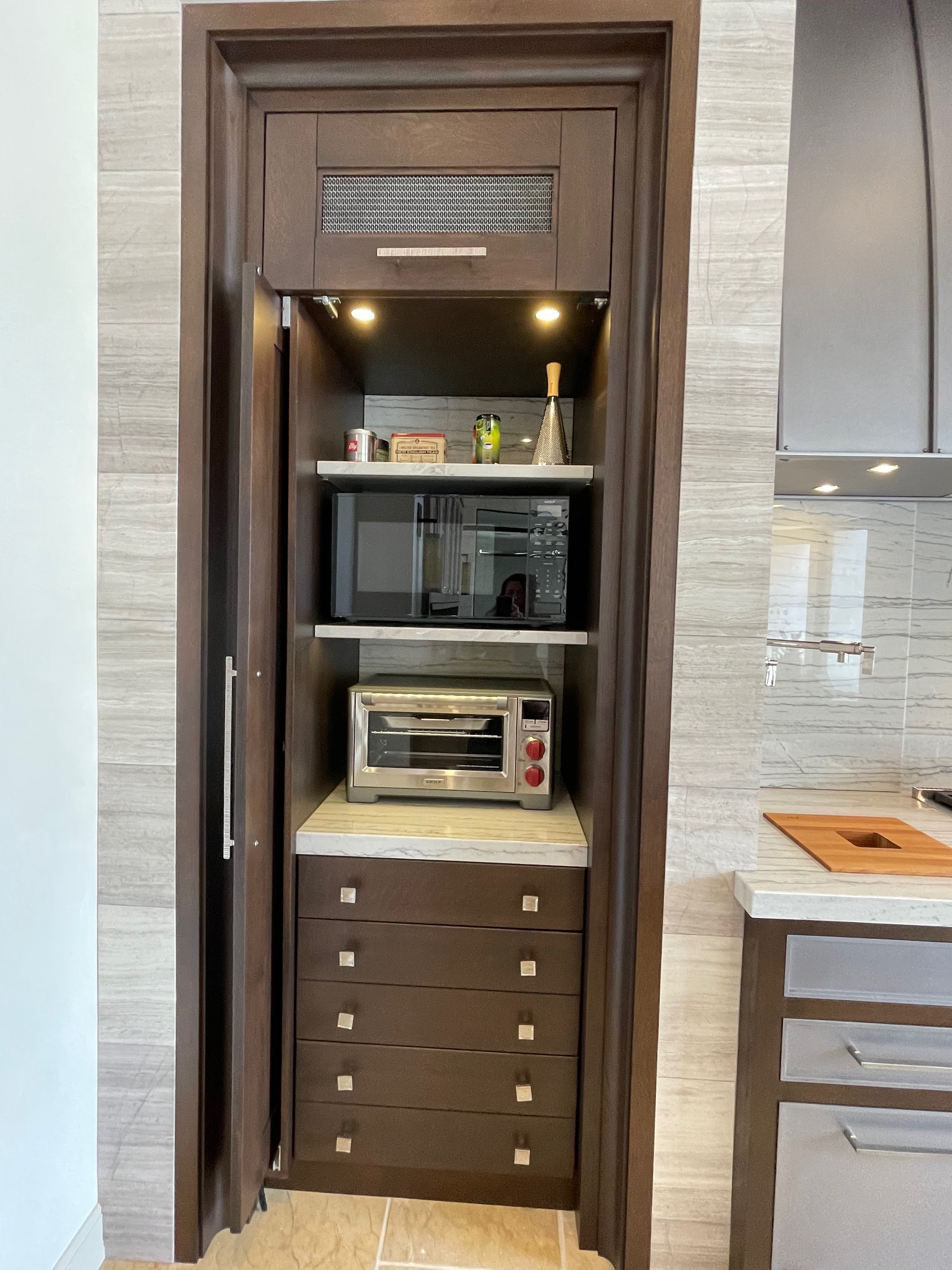 Behind the door on the left of the range wall is a breakfast bar with quartz shelves you can store your espresso maker, toaster oven or microwave.