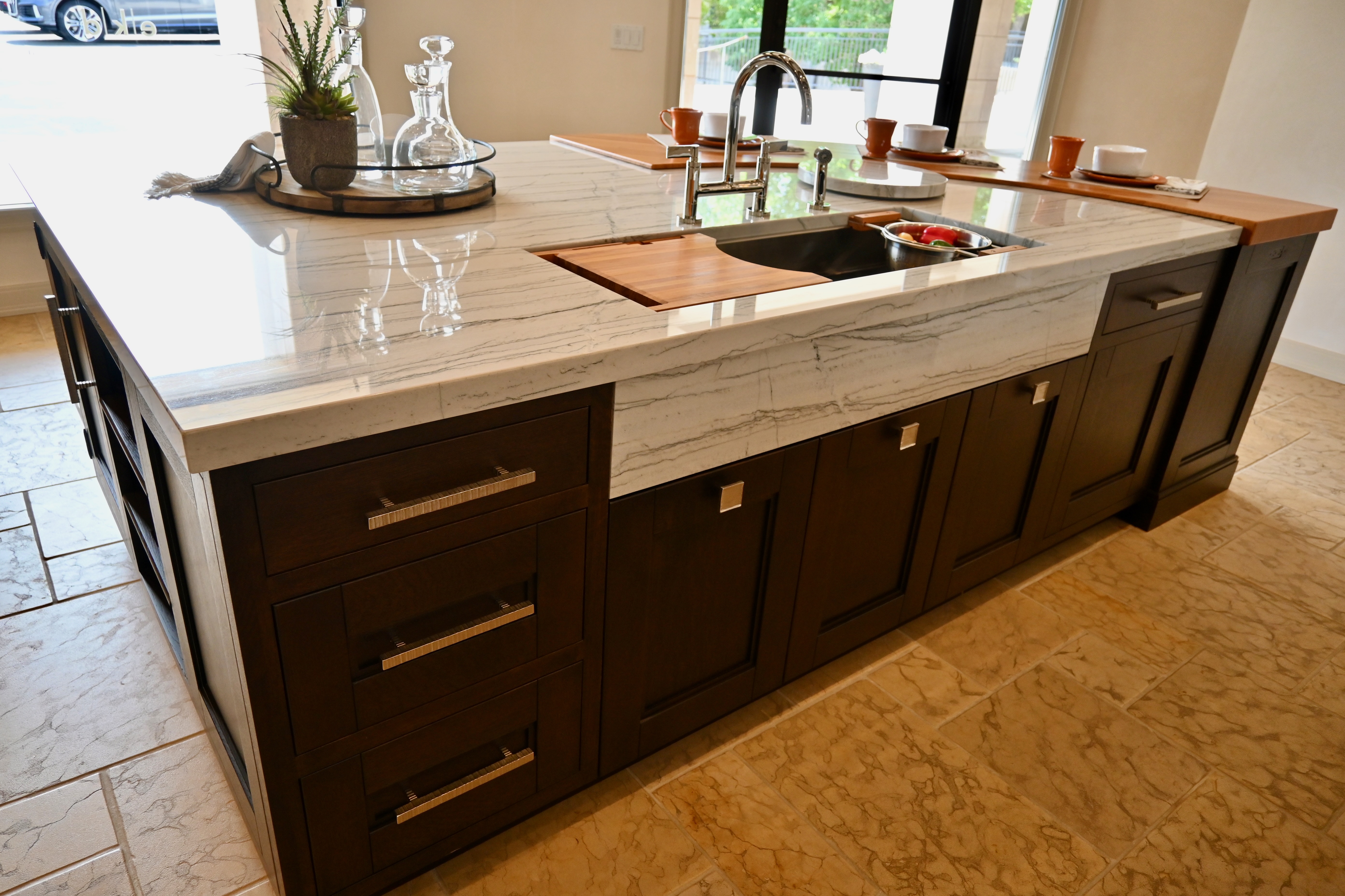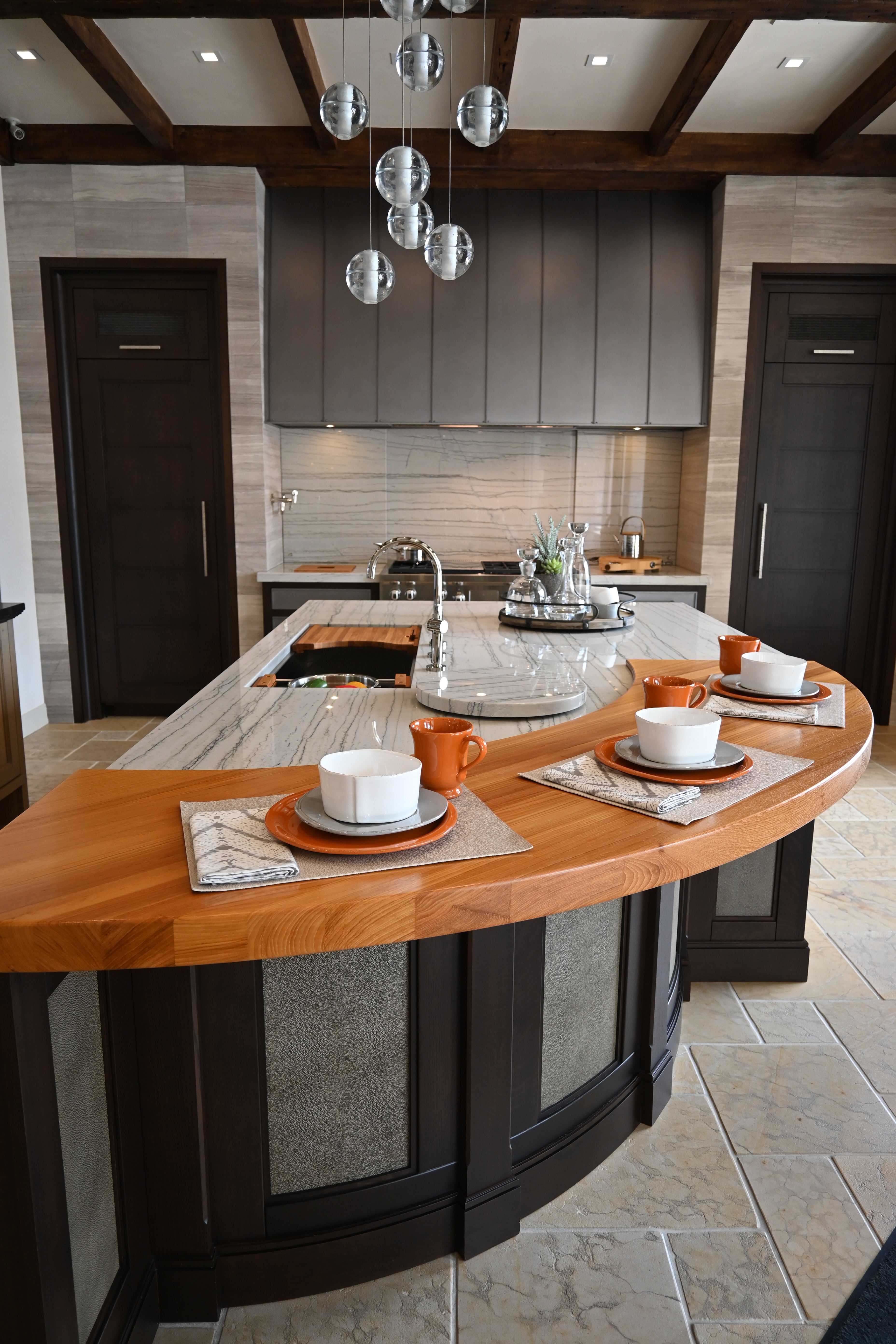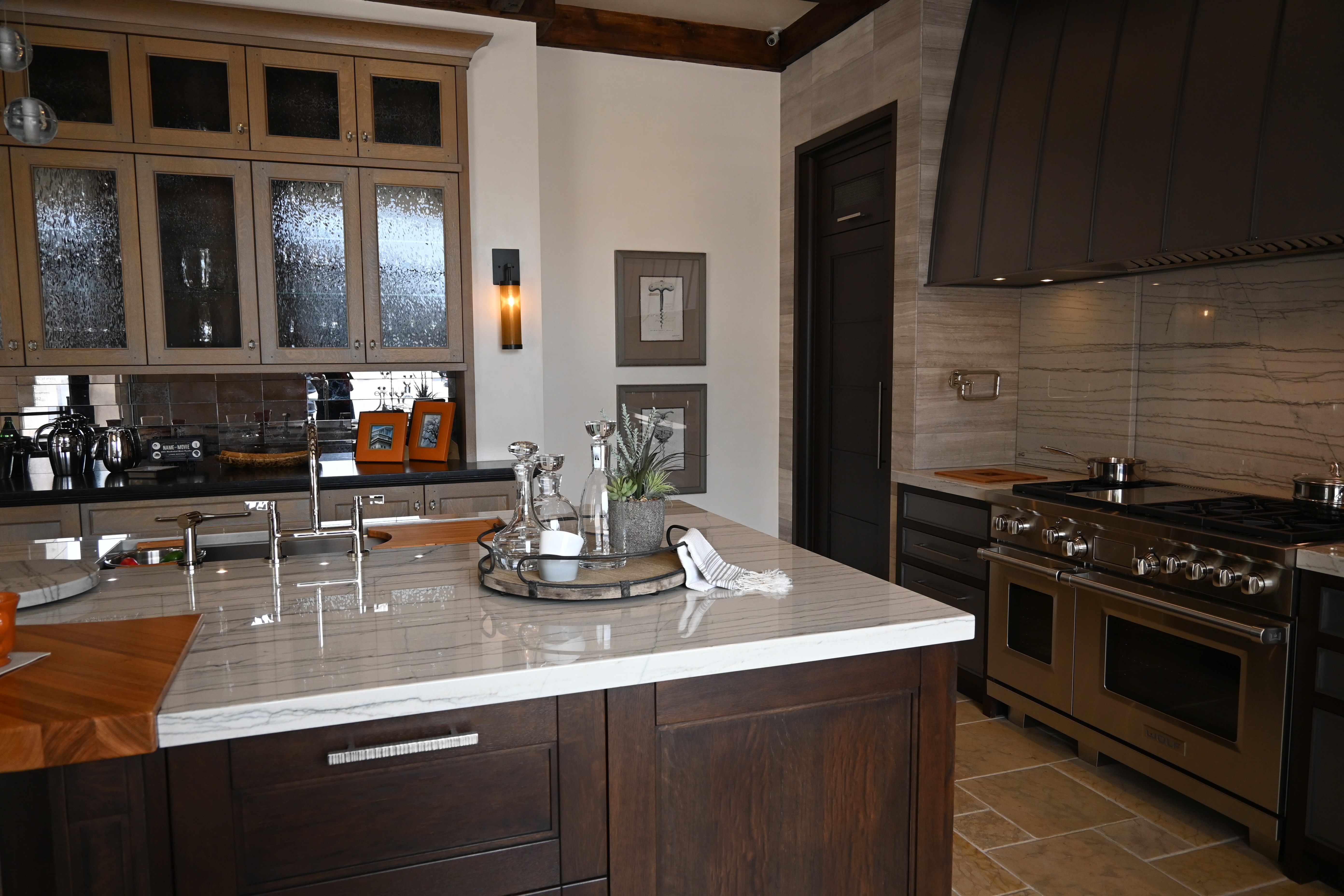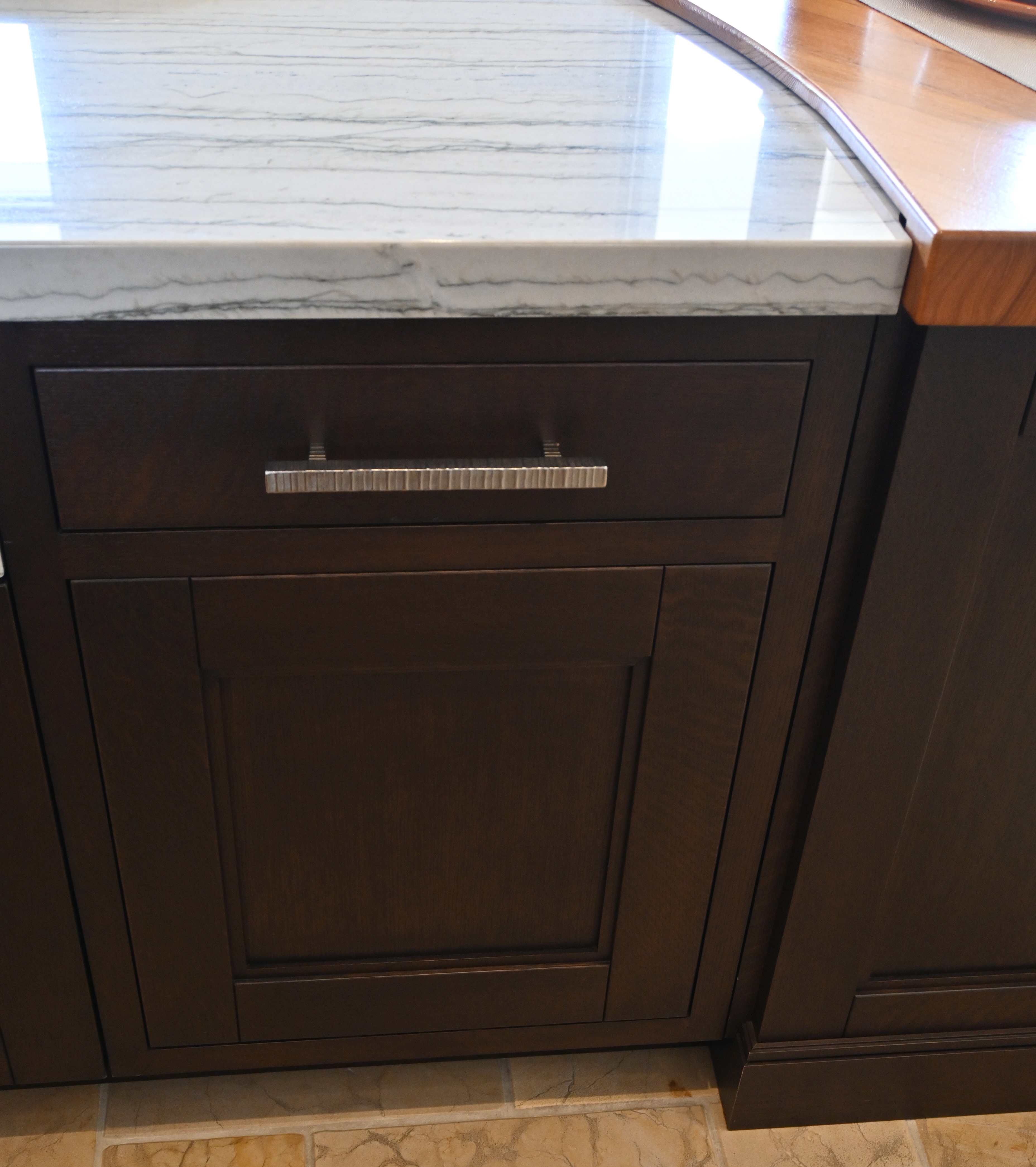 ISLAND-Quartzite countertops with quarter sawn white oak cabinetry and paneling with an espresso finish