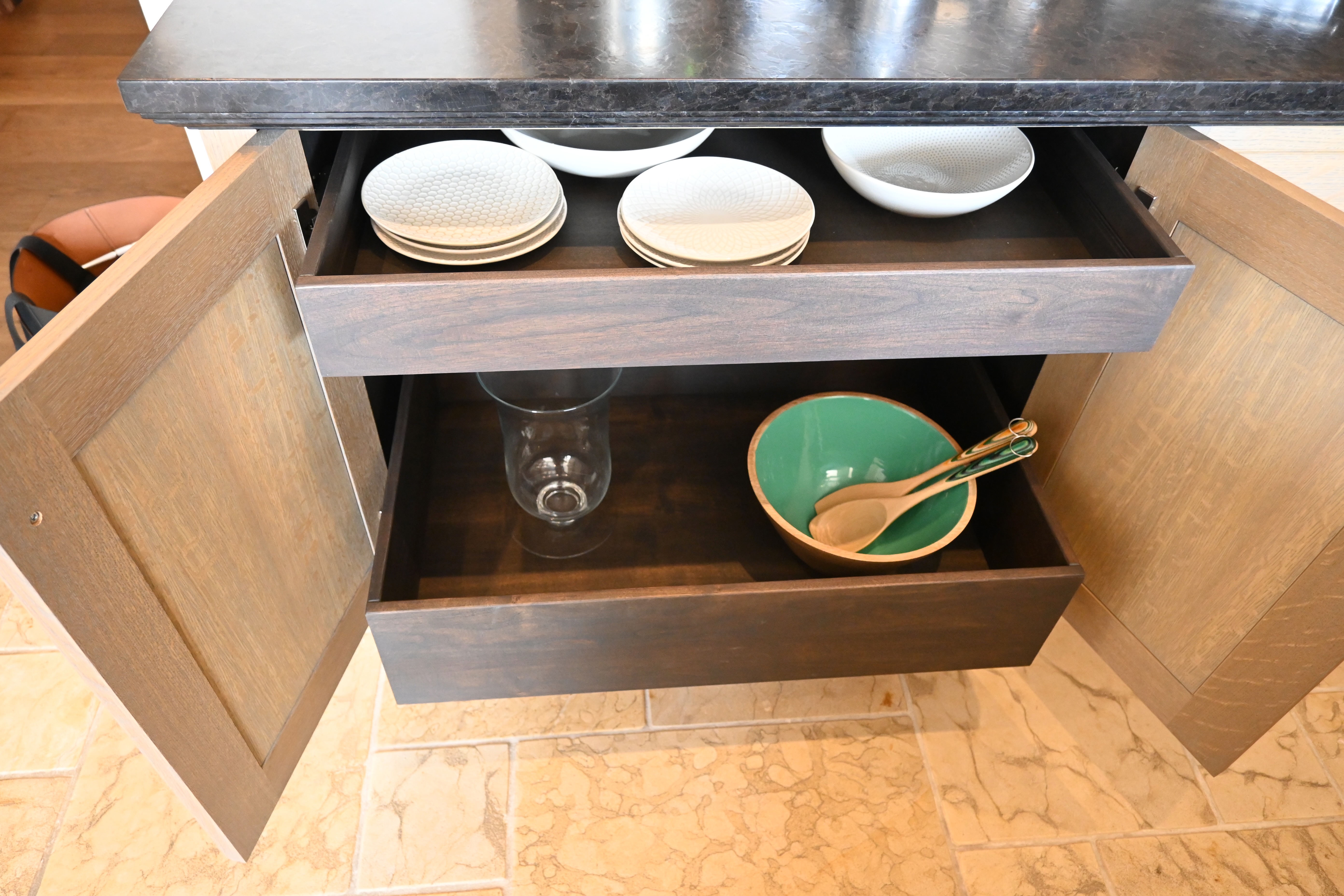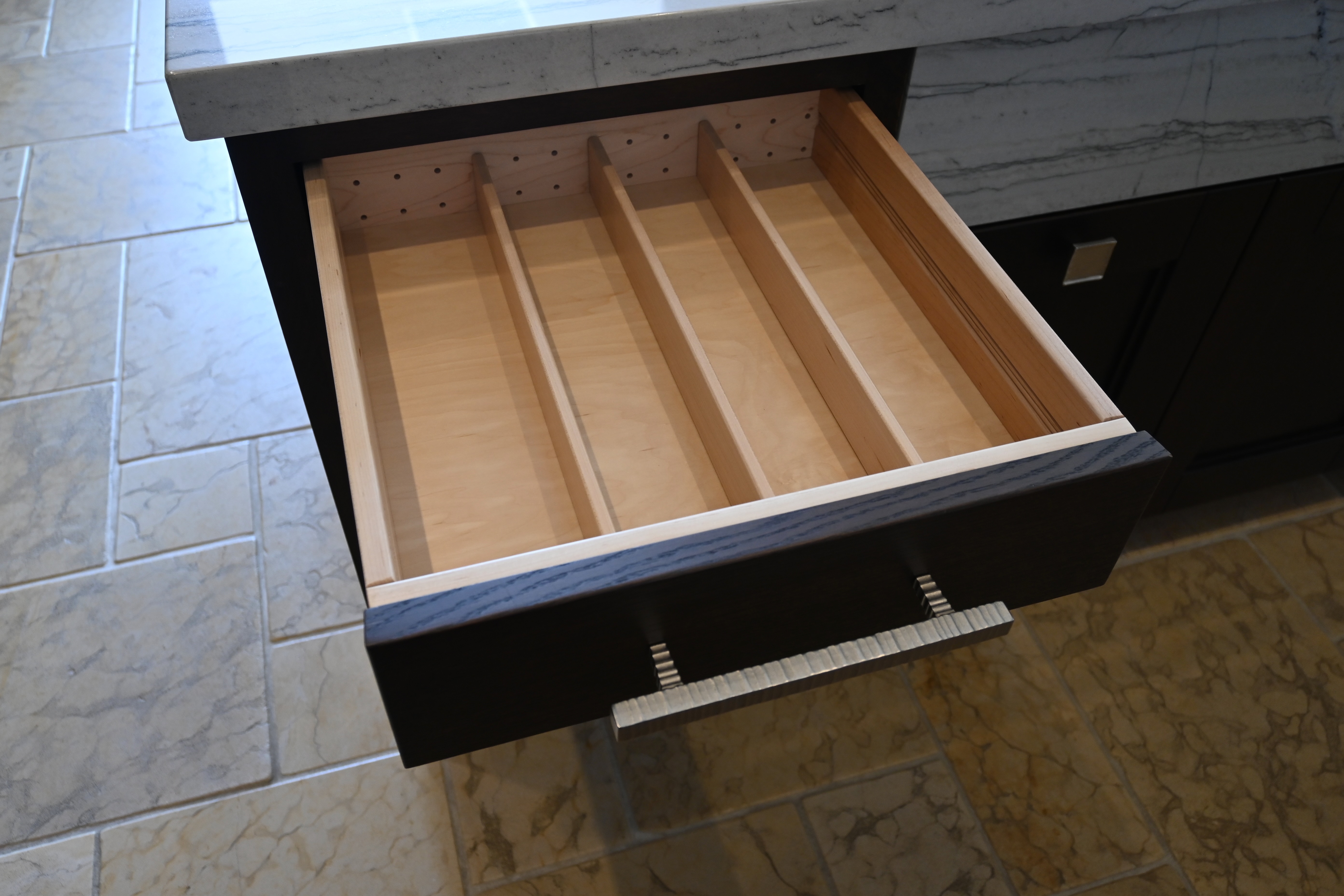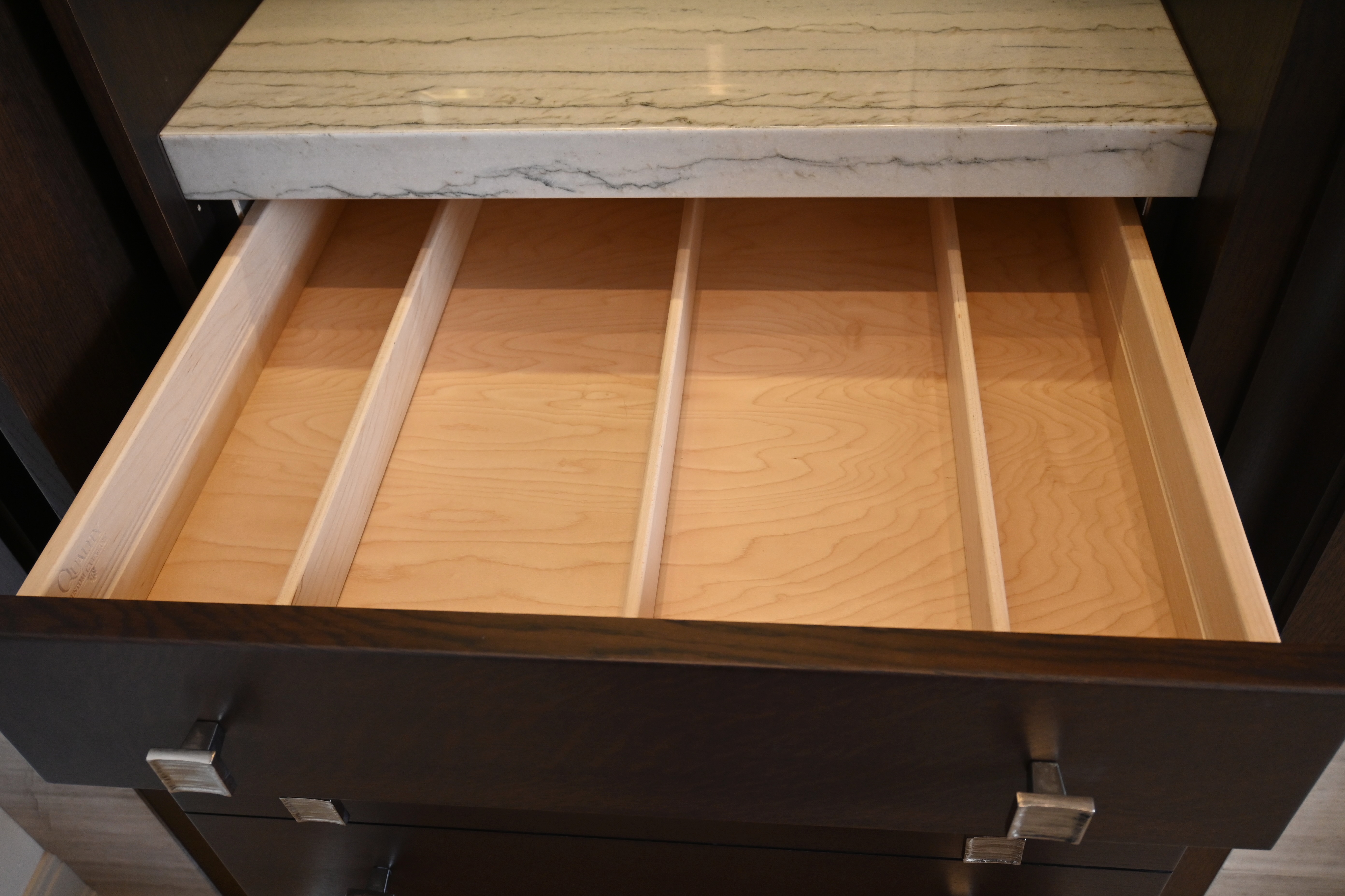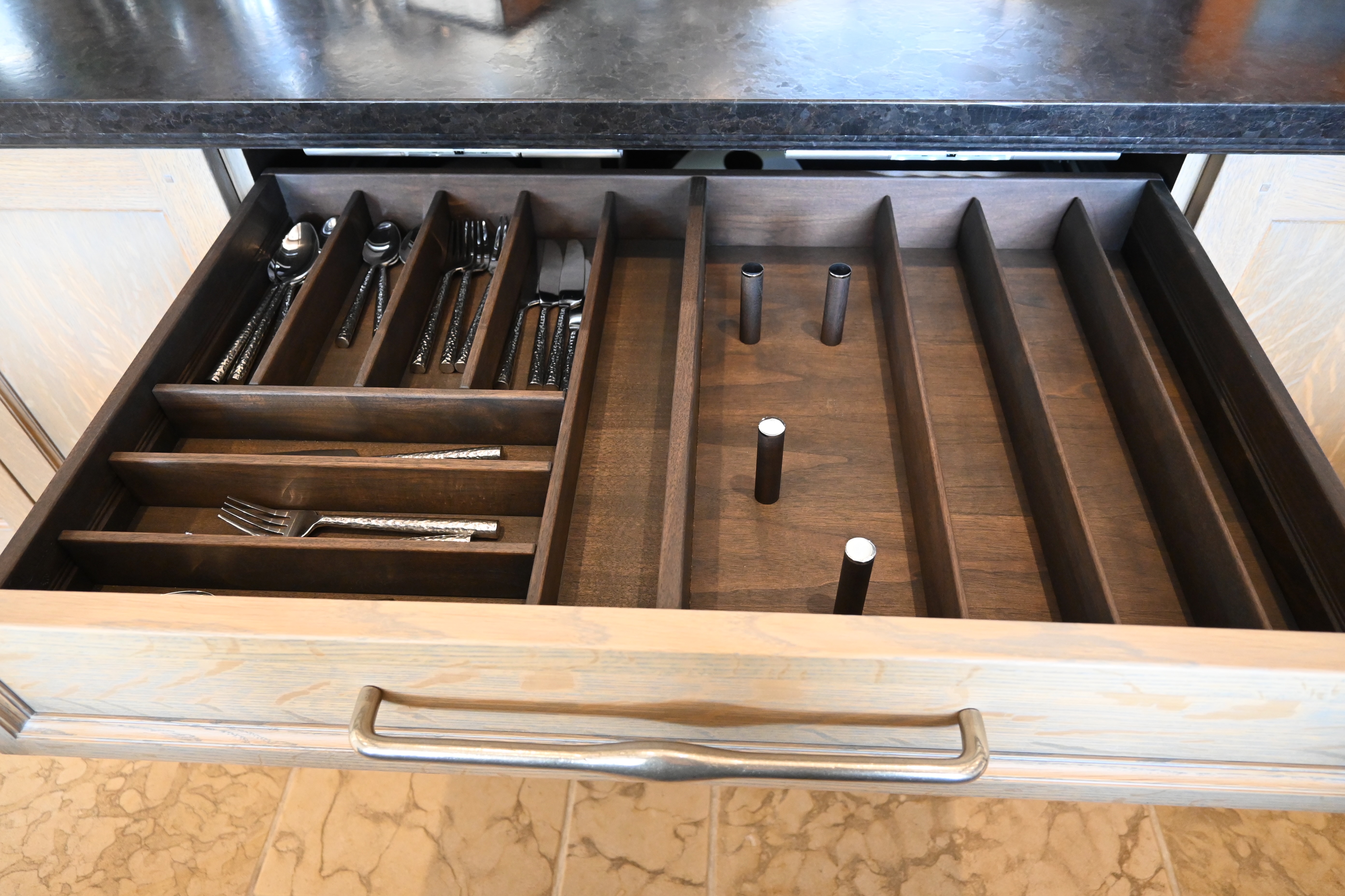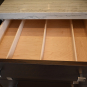 1-Three drawer base cabinets Dim.: 36”w x 36”h x 24”d, Top drawer walnut wood flatware/cutlery and utensil dividers, next drawer dish dividers
