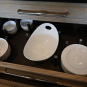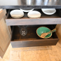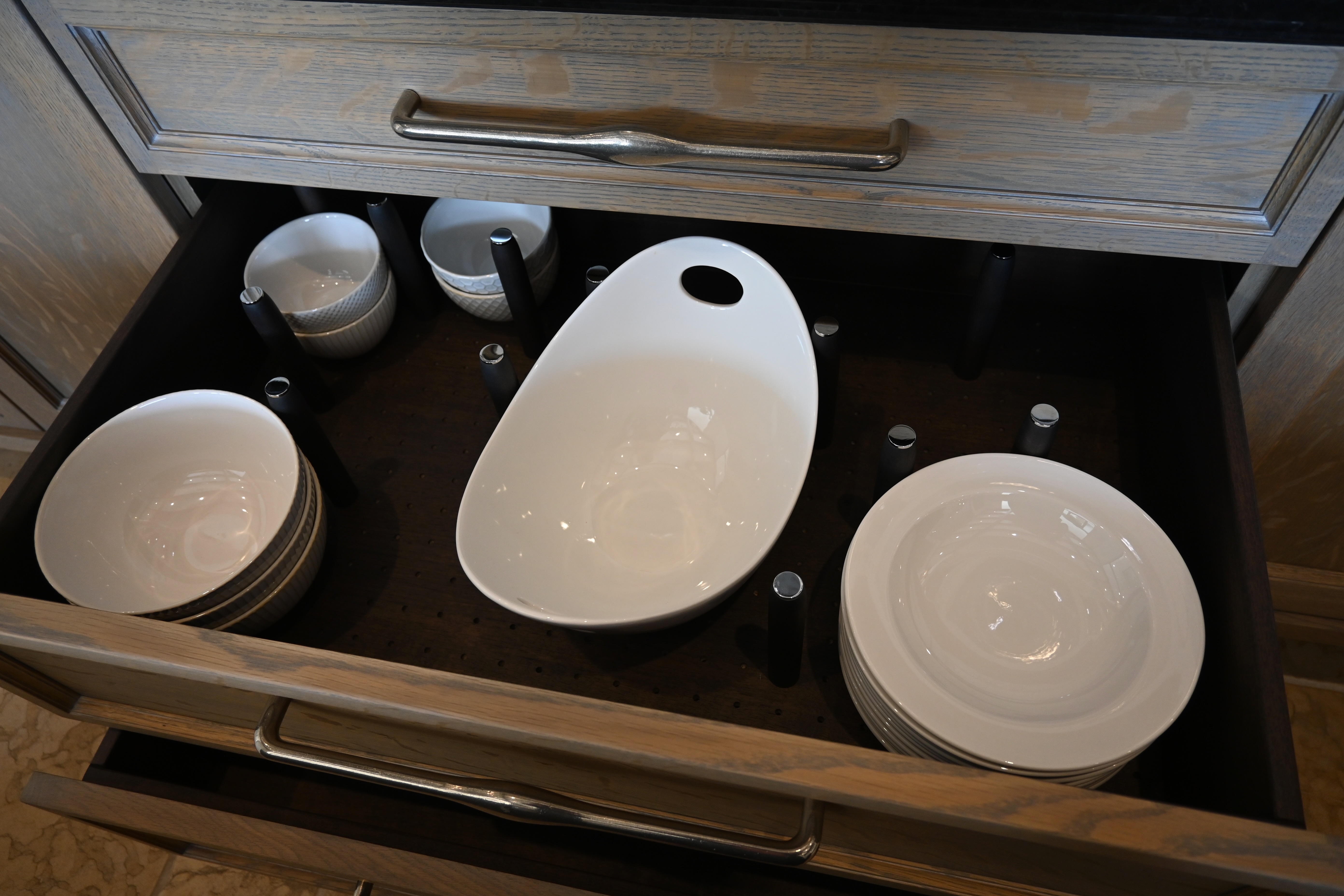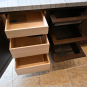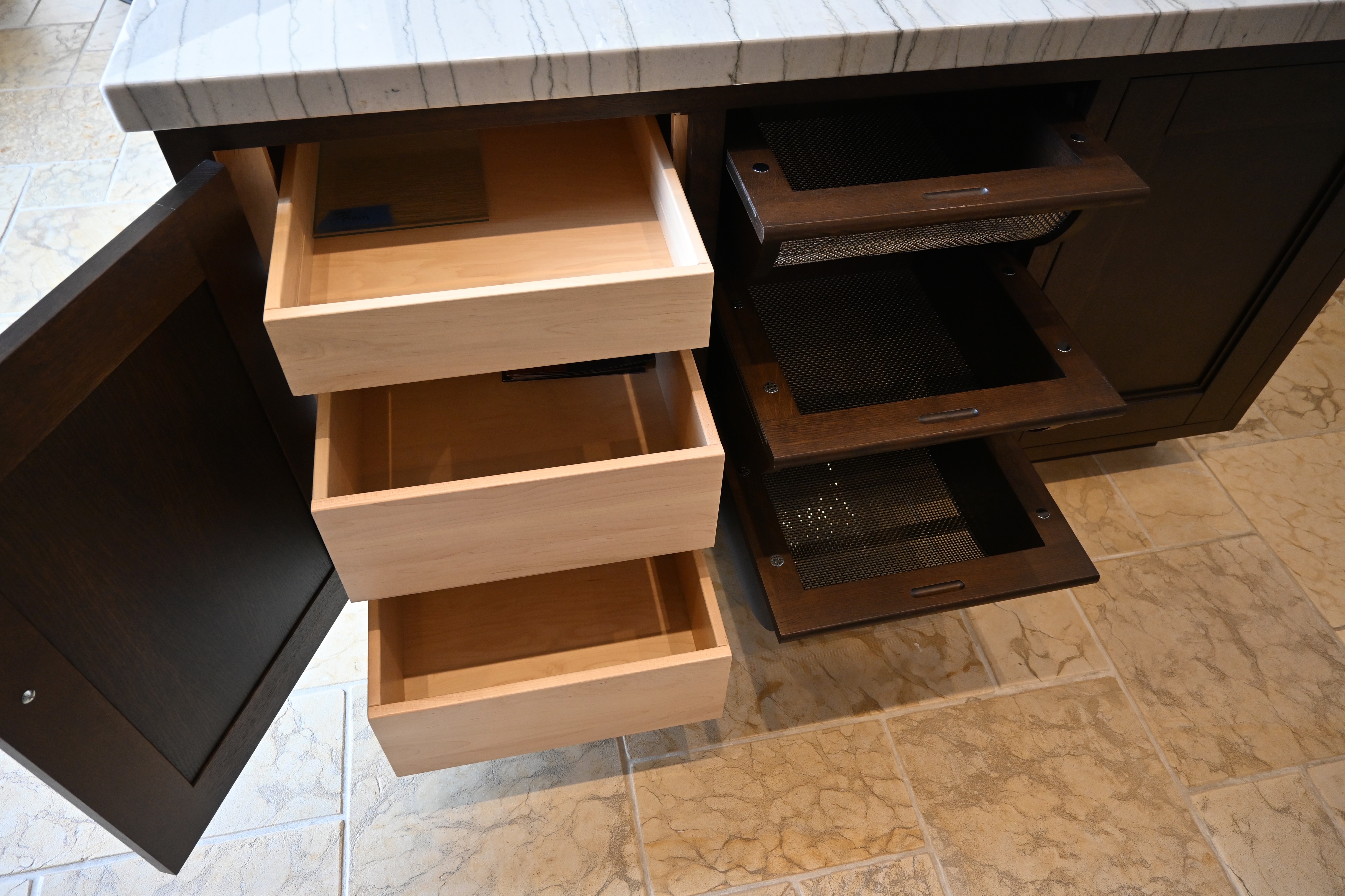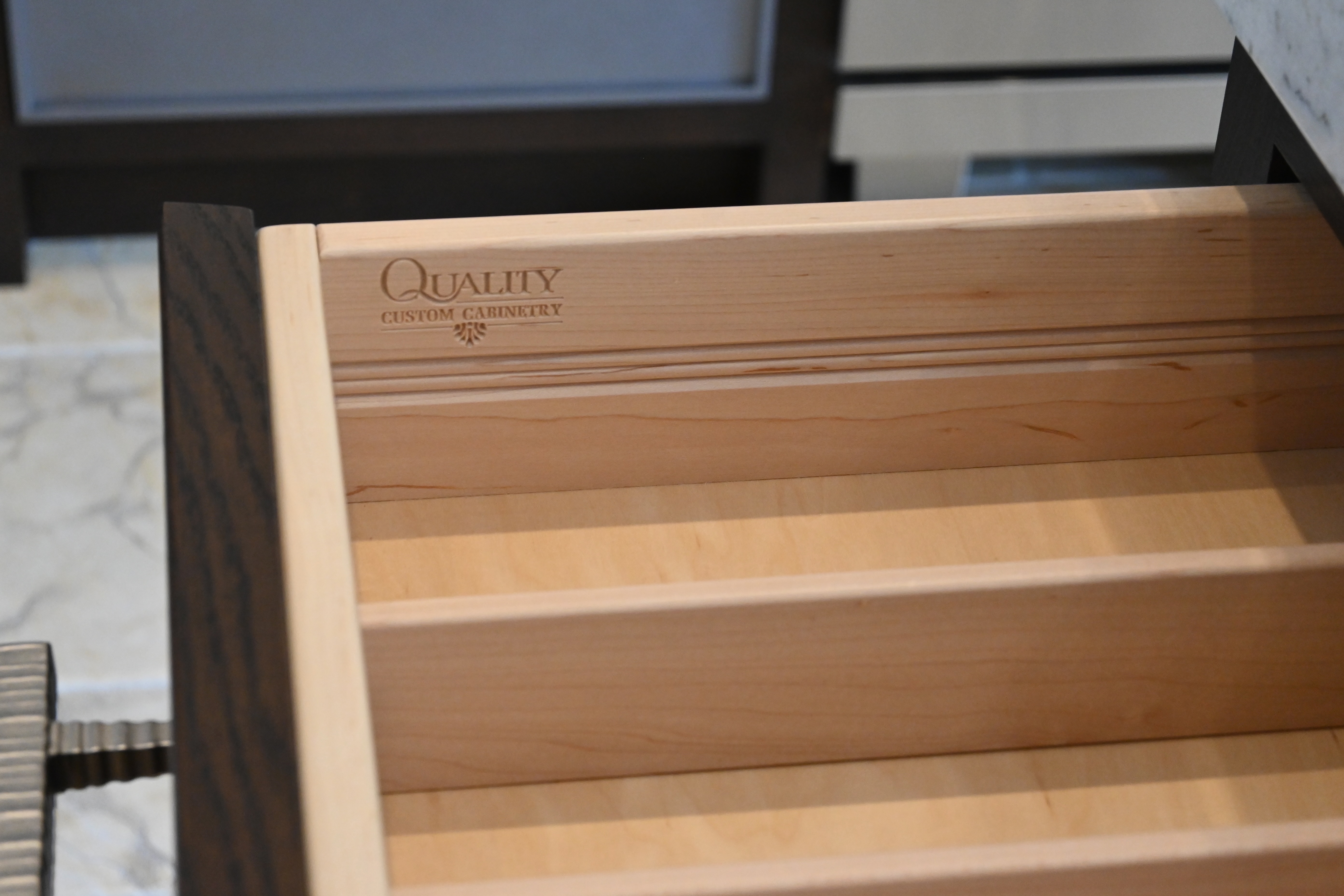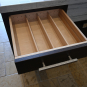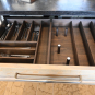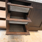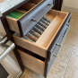 1-Three drawer base cabinets Dim.: 36”w x 36”h x 24”d, Top drawer walnut wood flatware/cutlery and utensil dividers, next drawer dish dividers