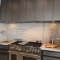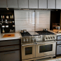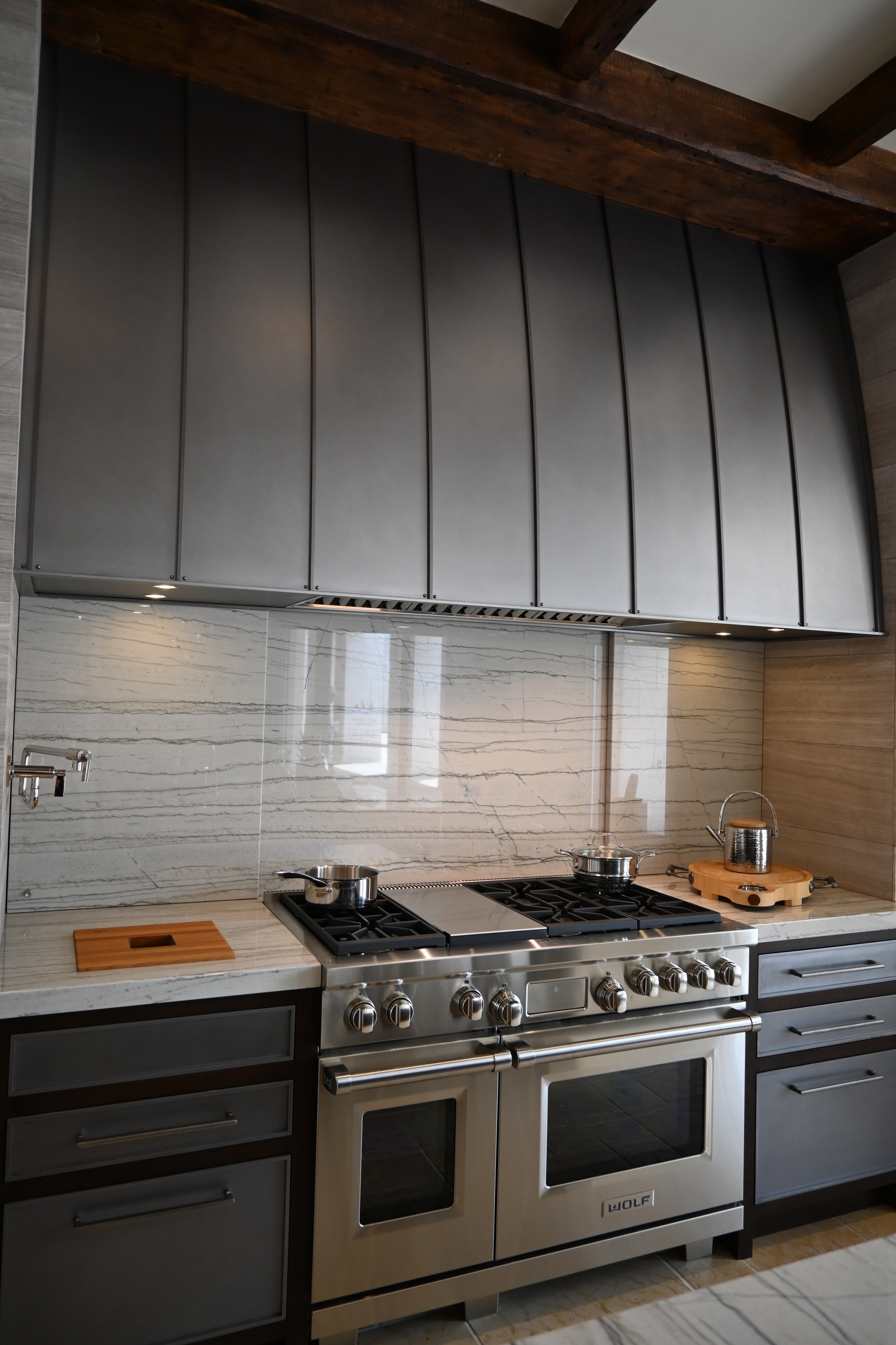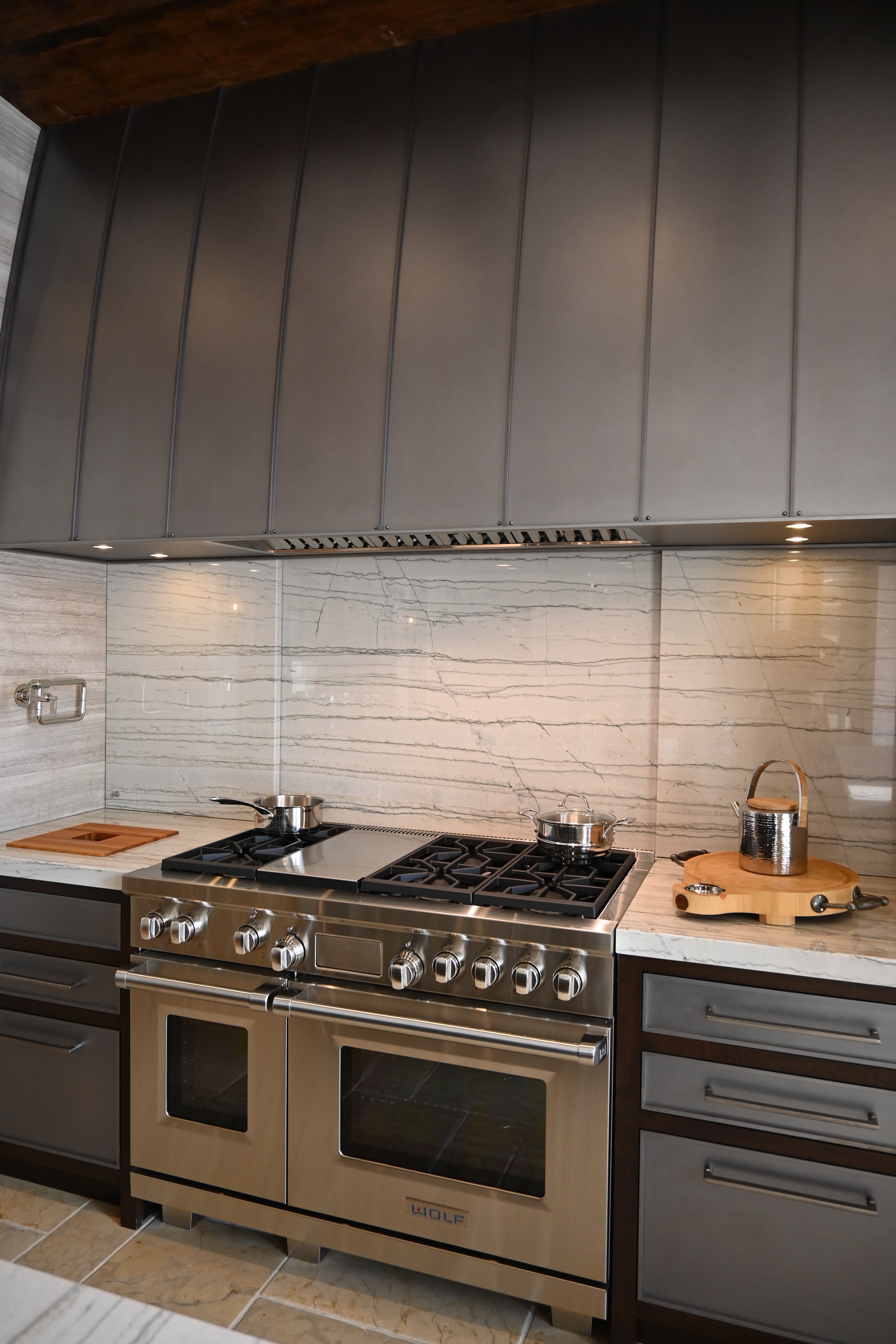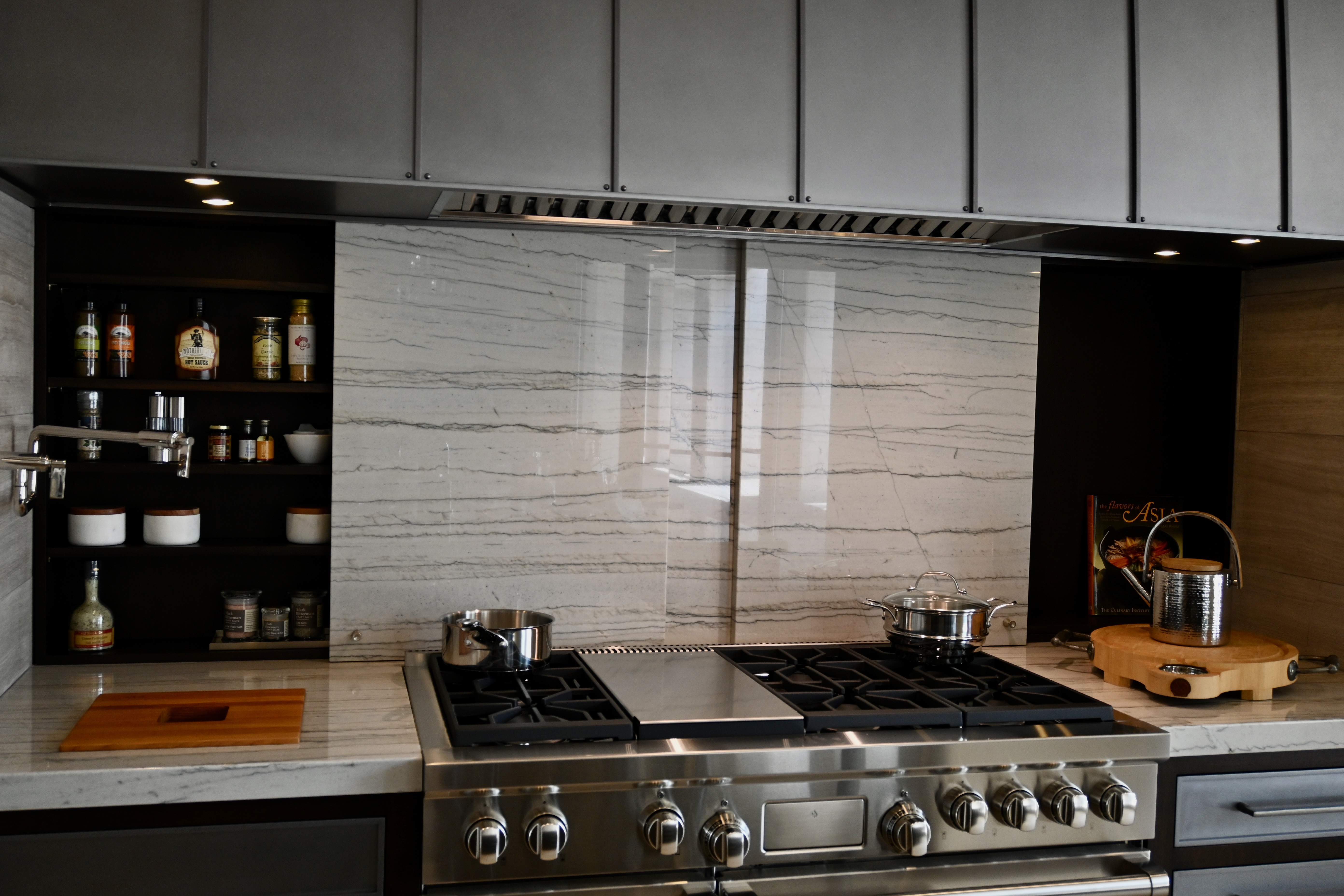 QUARTZITE SLIDING DOORS AND SHELVING BEHIND THE RANGE