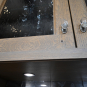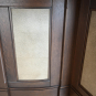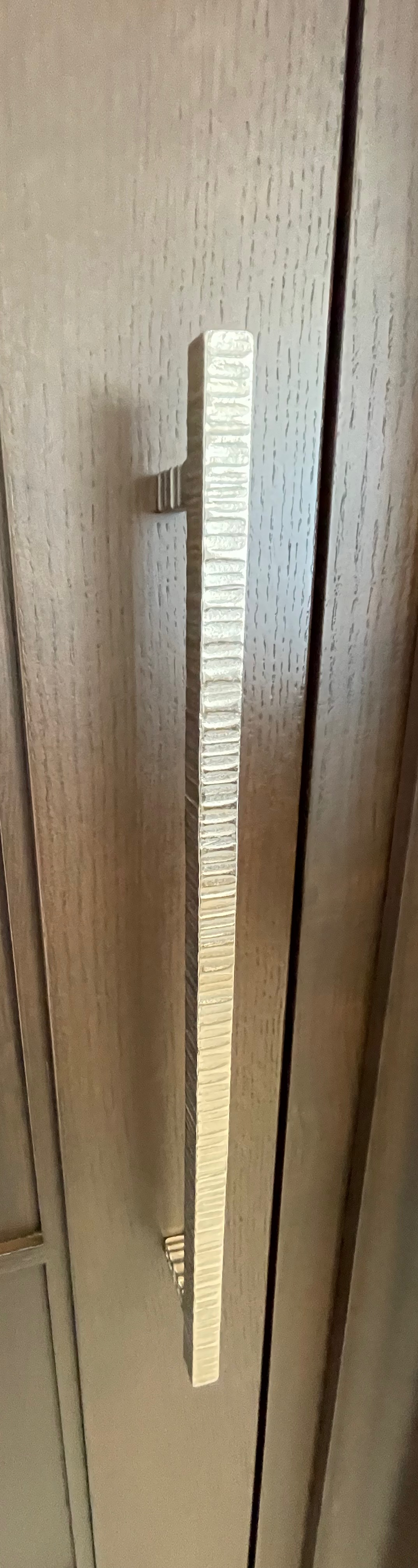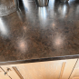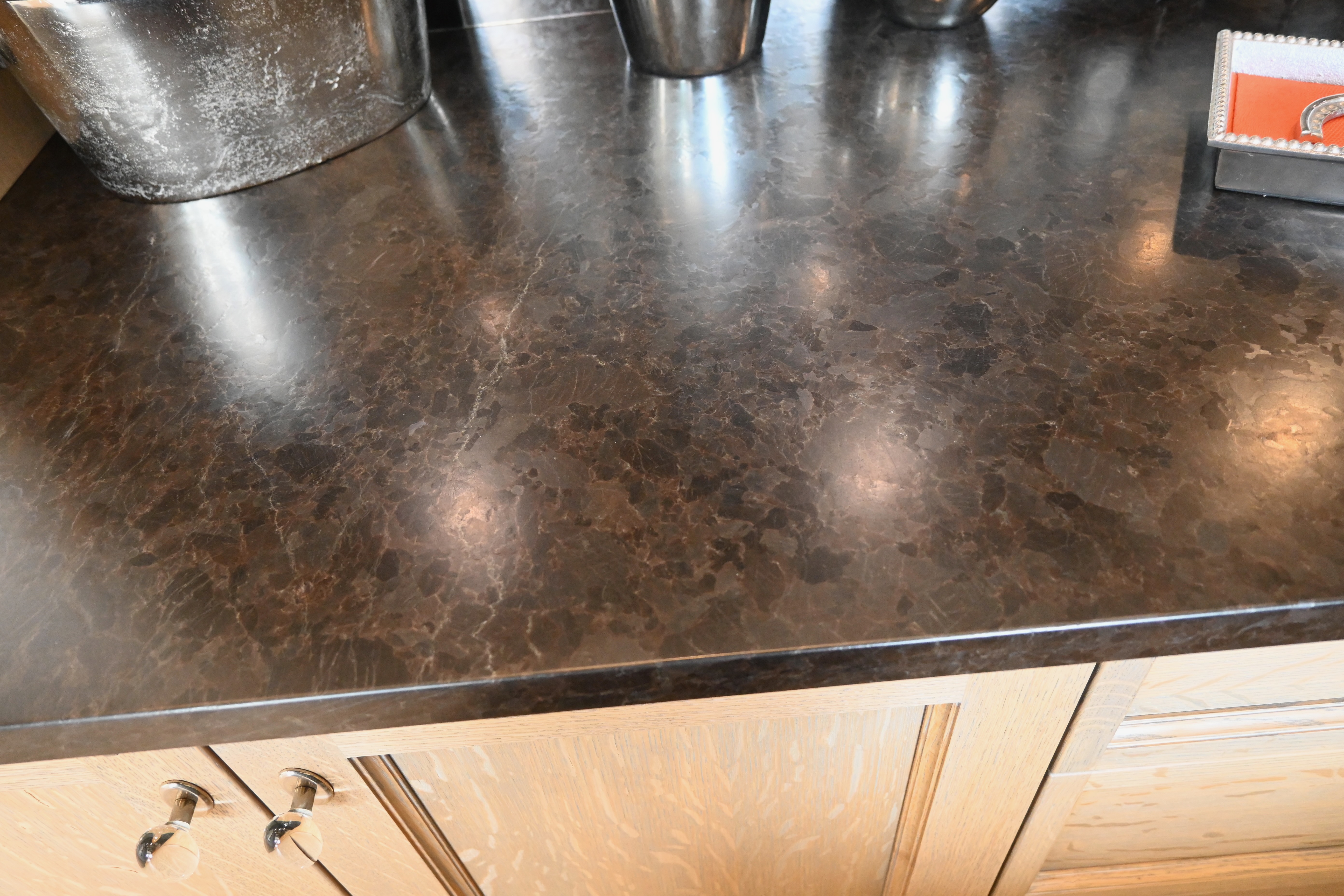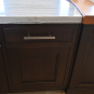 Antique Brown leathered granite slab on the lighter glass cabinet wall Dim.: 115”w x 26 ½”d, the inset section is 90”w