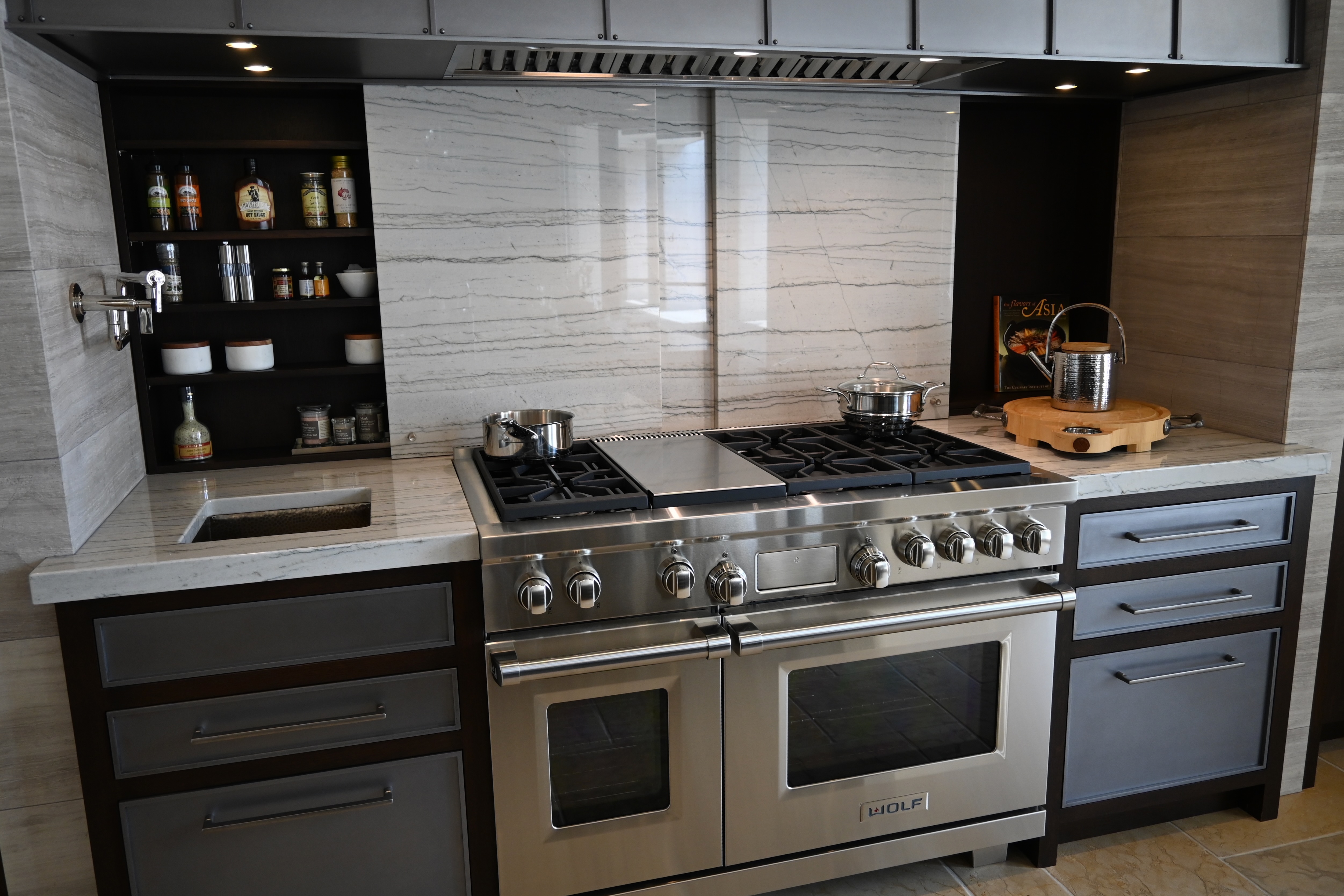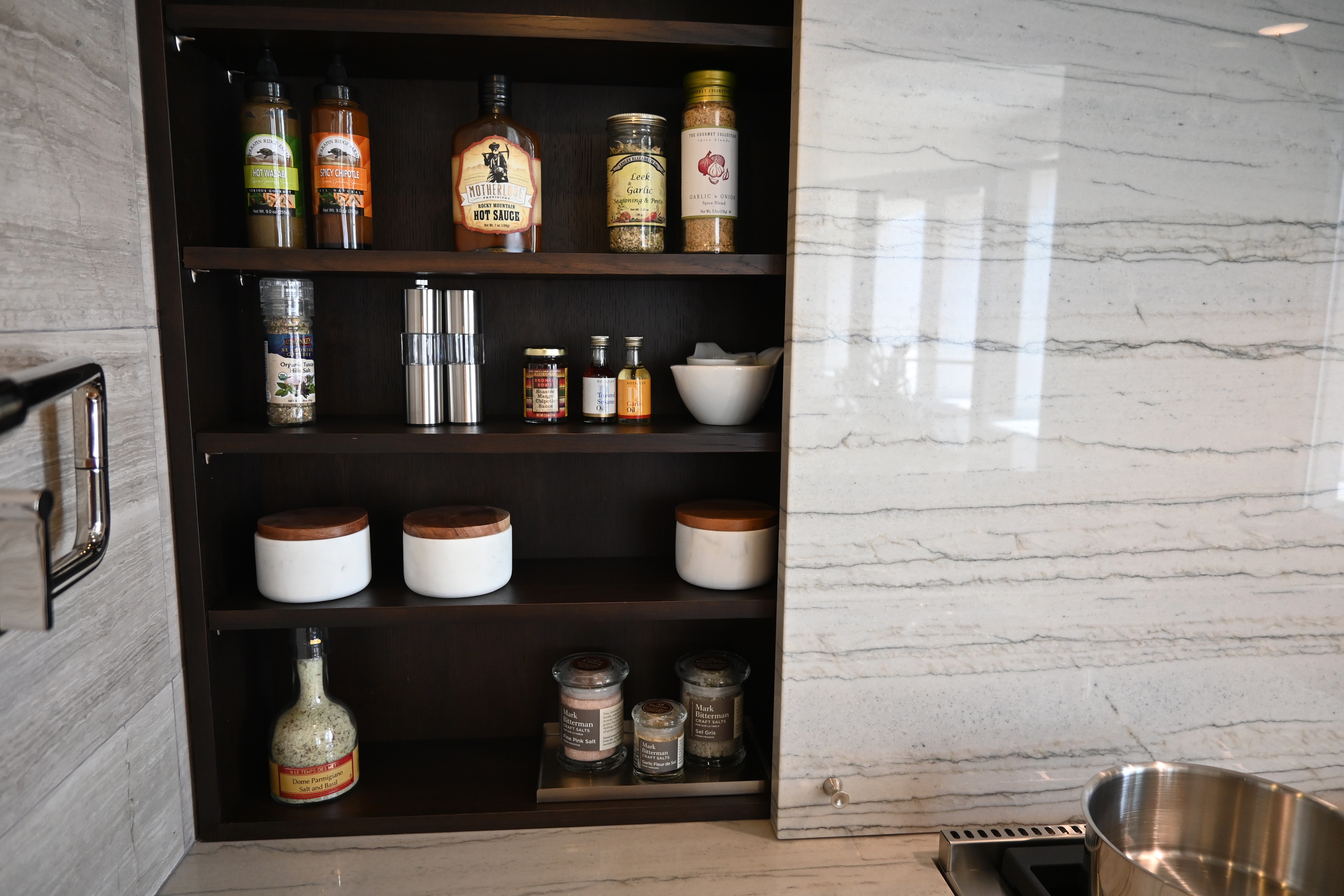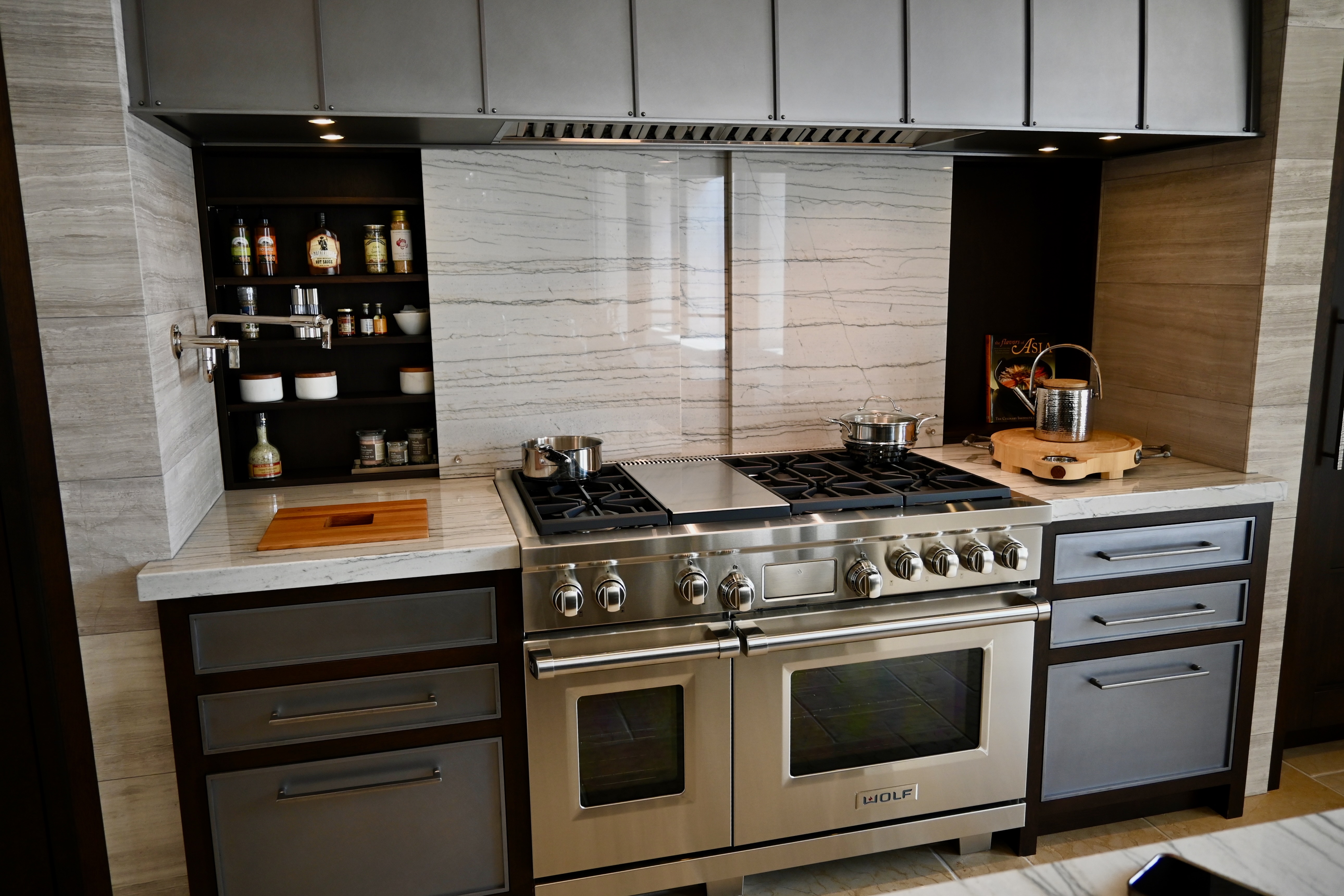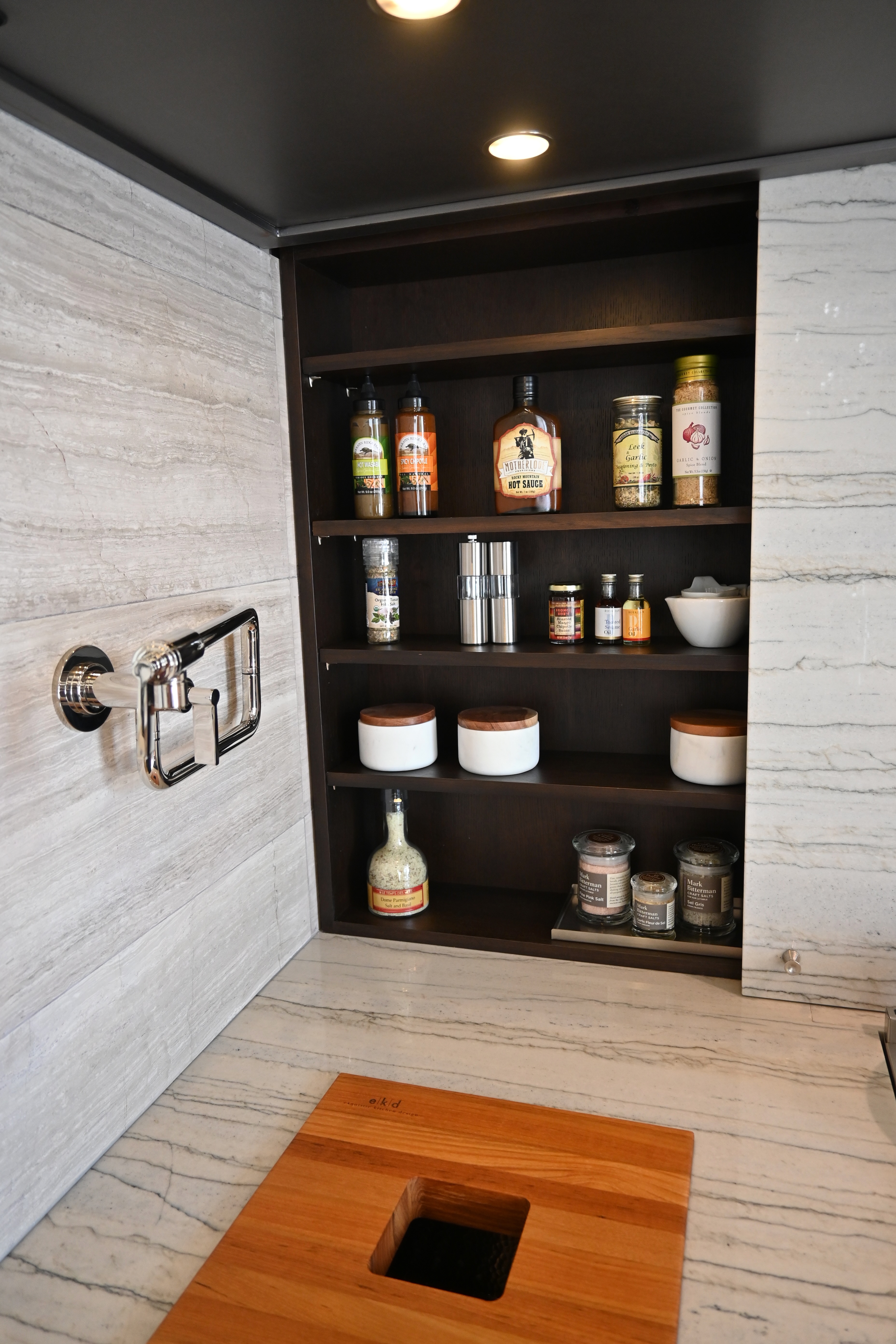 Behind on the range wall there is sliding quartzite slab doors that reveal shelving to conveniently access your spices and other culinary essentials.