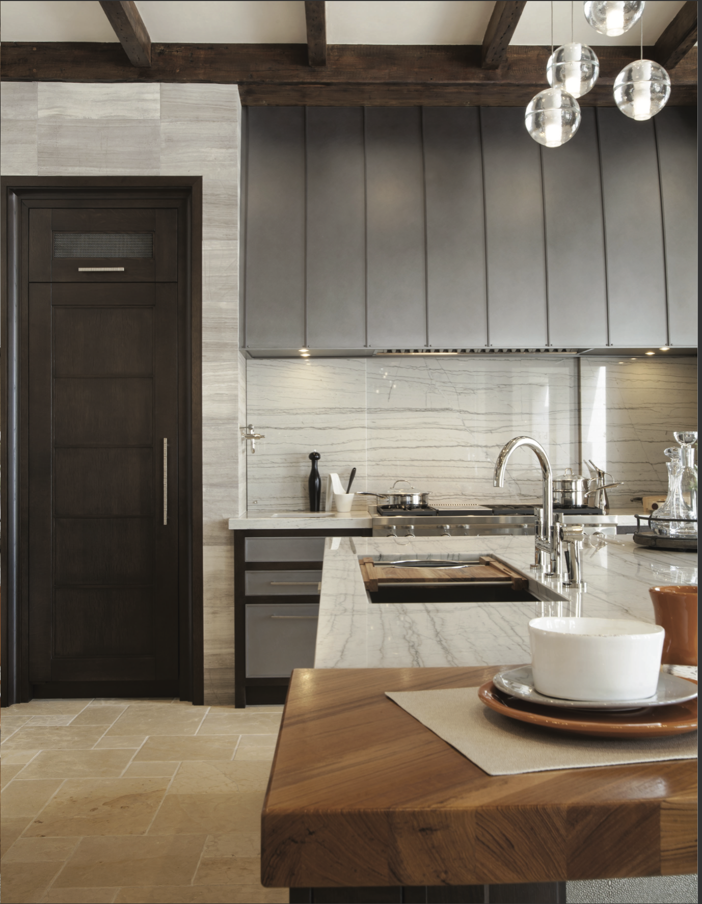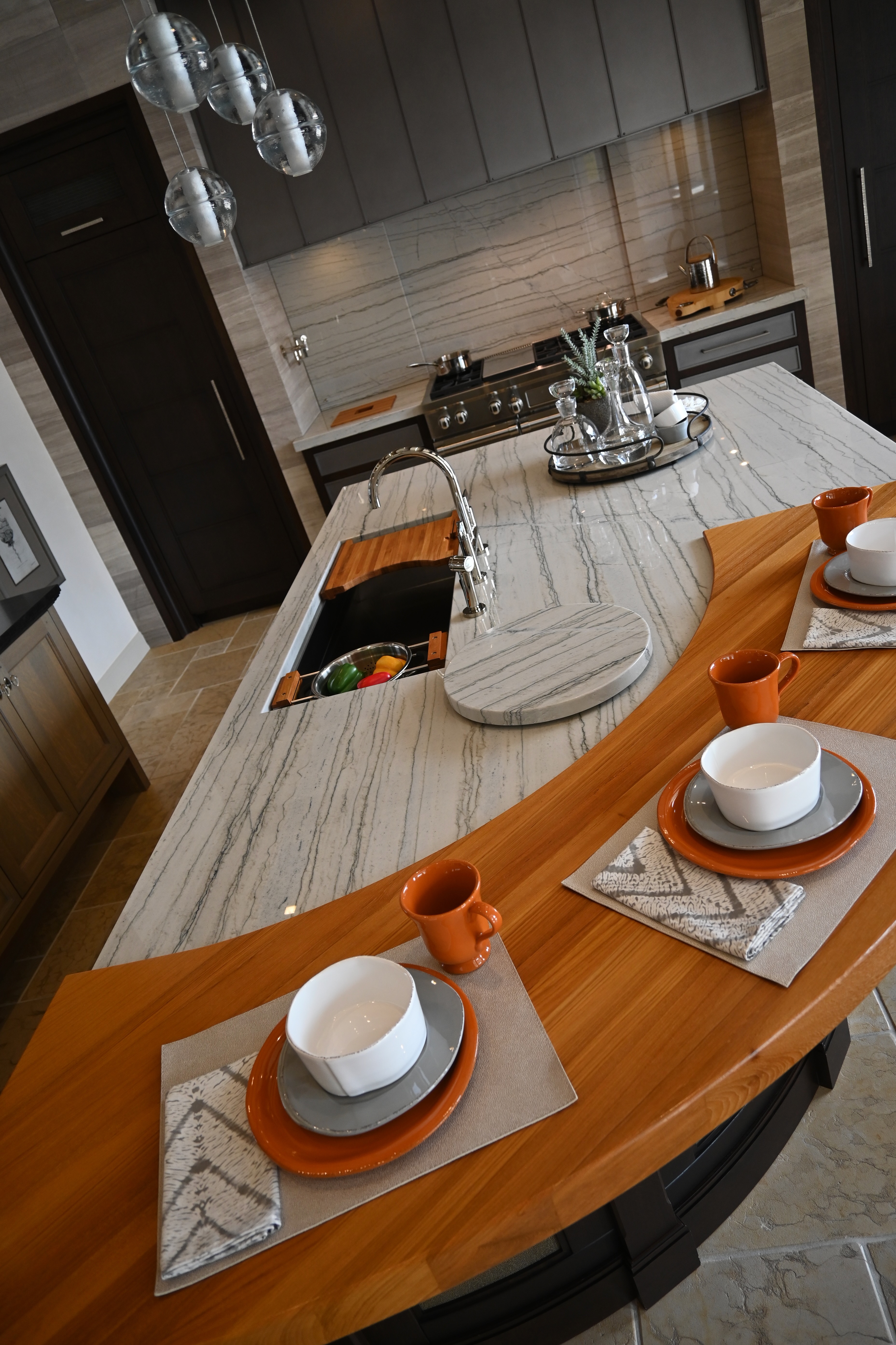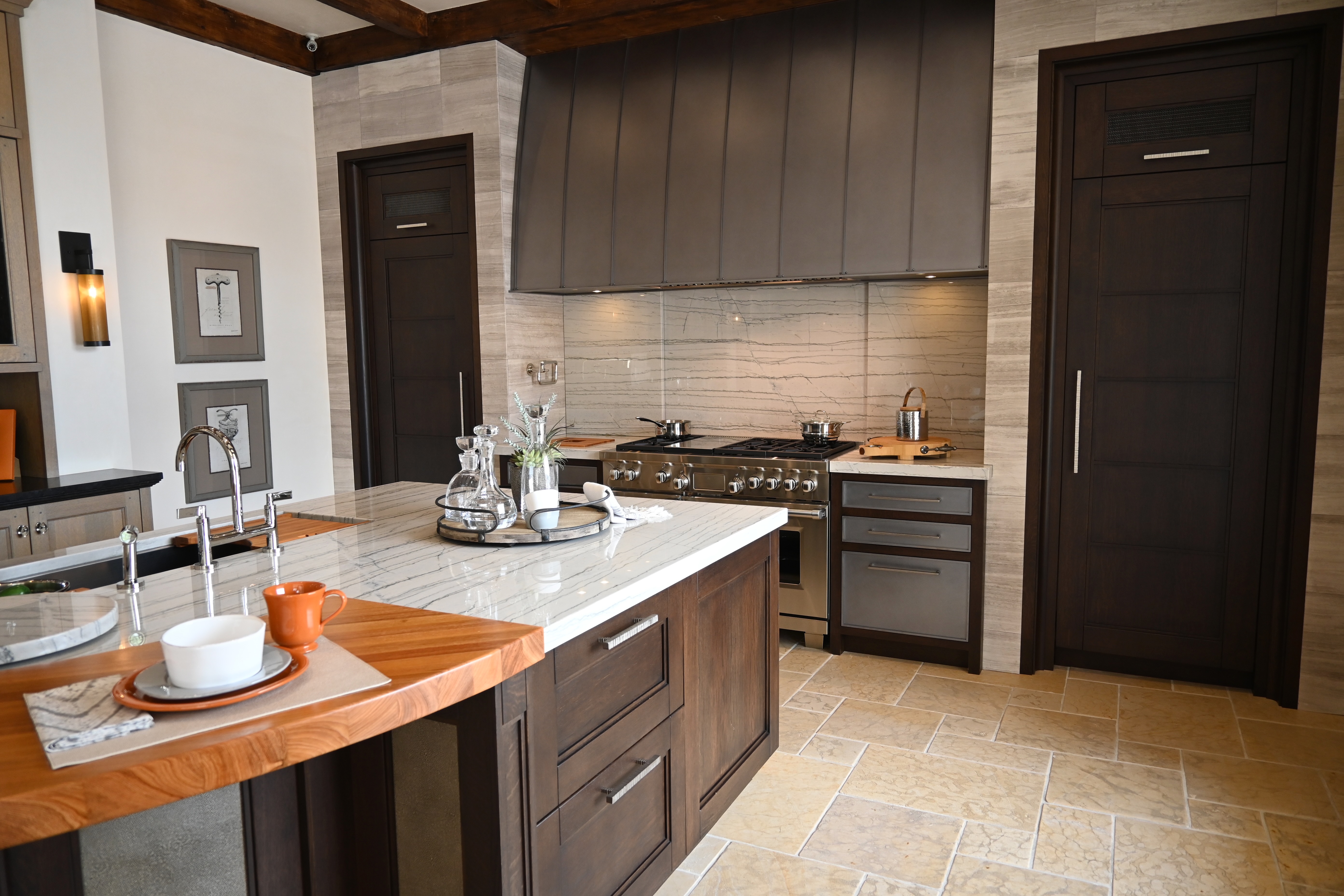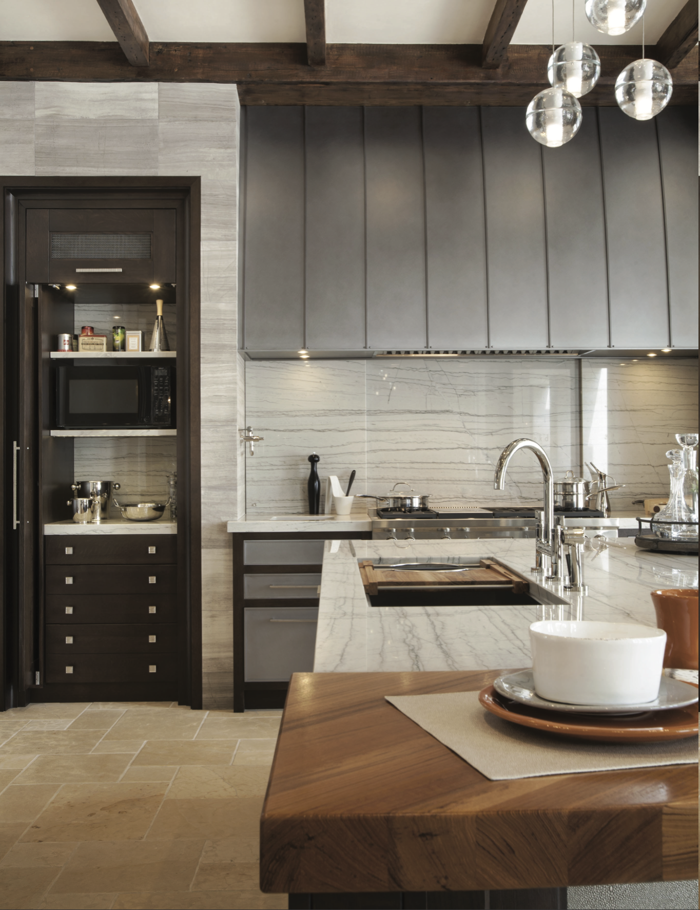 Behind on the range wall there is sliding quartzite slab doors that reveal shelving to conveniently access your spices and other culinary essentials.
