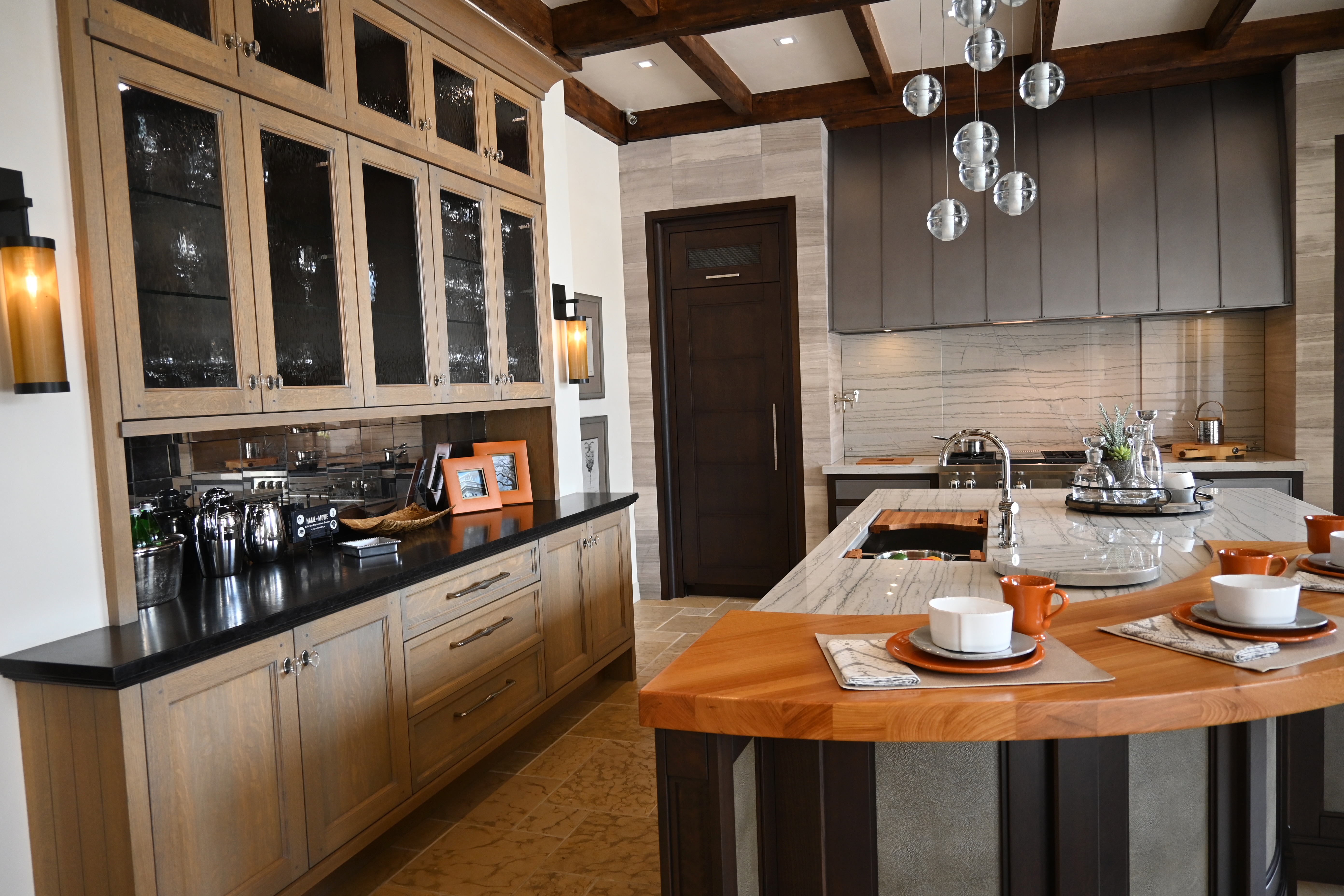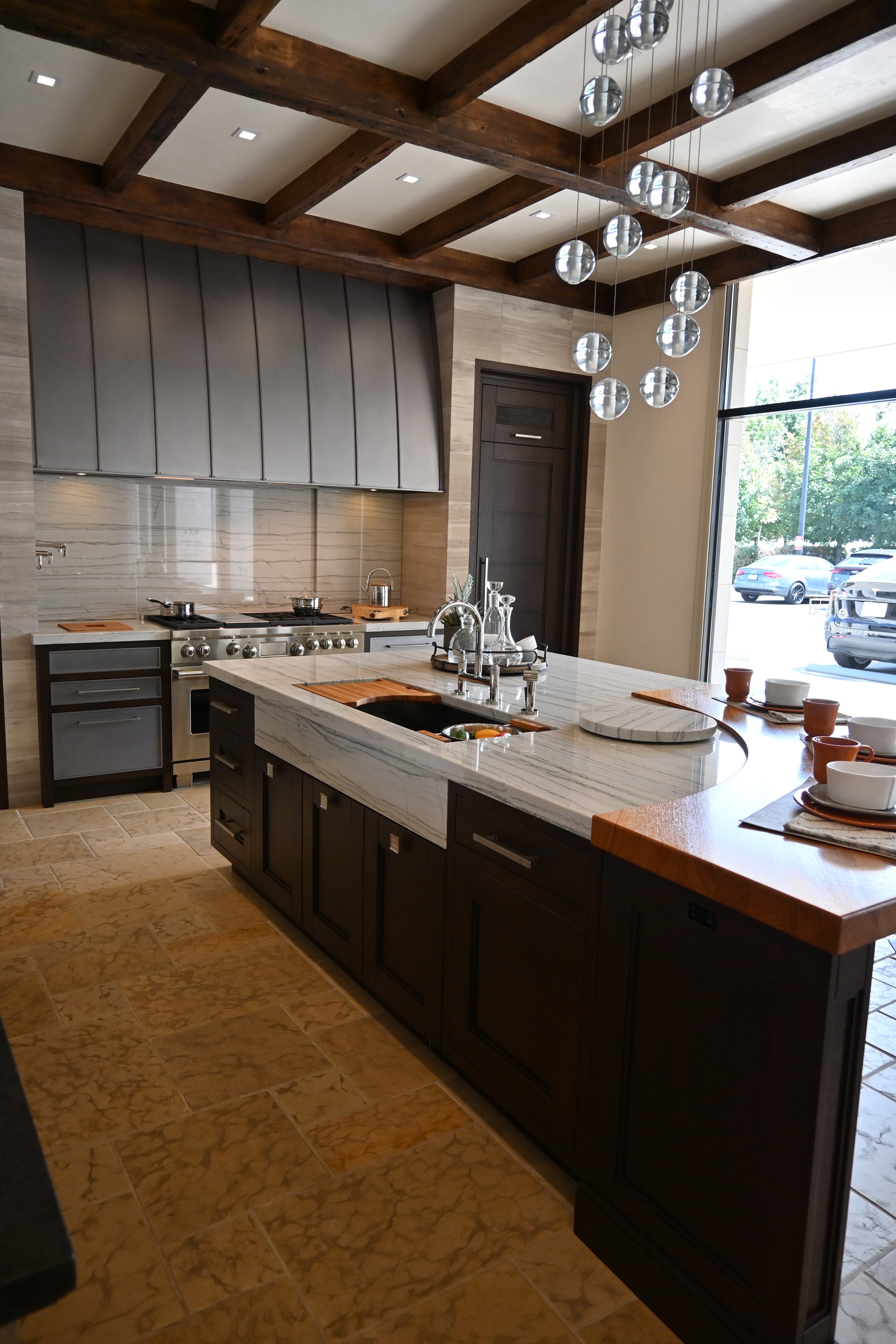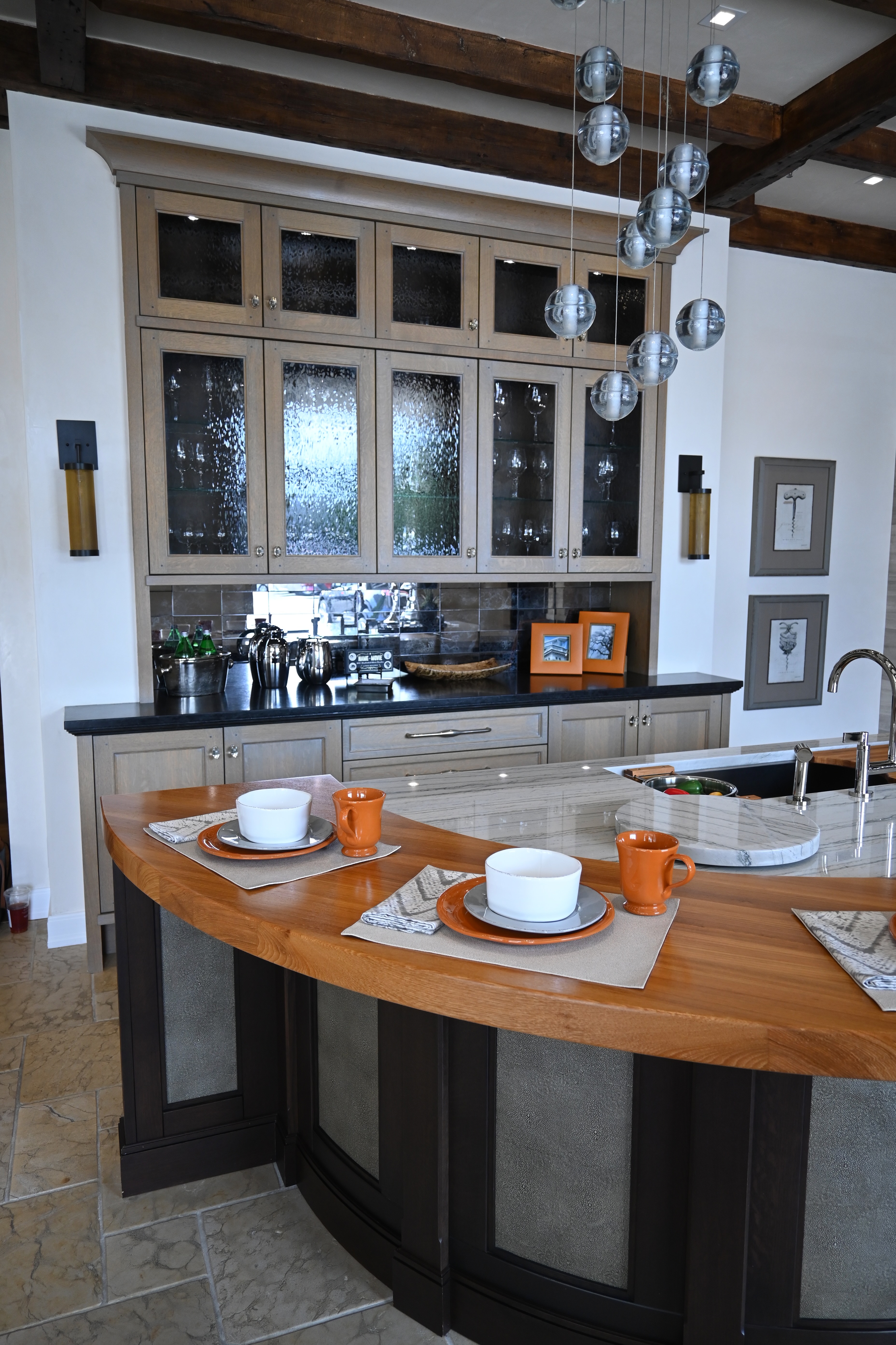 A rare opportunity to own an exquisite “Quality Custom Cabinetry” kitchen showroom display with high-end uprades from the top luxury kitchen design studio EKD in Denver, CO. The cabinetry is made of quarter sawn white oak with a silver/gray oiled finish on the lighter cabinets and an espresso finish on the darker cabinets. The cabinets have the soft close feature and dove-tail joinery. There is walnut pull out drawer insets, wood flatware dividers along with dowl dividers for crockery. The set includes a 48” Wolf Range, Raw Urth custom metal range hood, Sub-Zero all refrigerator, Sub-Zero freezer drawers & a Cove dishwasher. Along with gorgeous white Macaubas quartzite (natural stone) counter tops and a Teak Wood bar top by Grothouse! The stunning Bocci glass chandelier is included. This kitchen offering is mountain elegance at its finest worth $250,000.The kitchen display has been carefully removed by professional installers and is in a warehouse. The kitchen is only being sold as a package+ Kitchen drawings are available by email. Serious inquires by appt. only. Price for this set below.