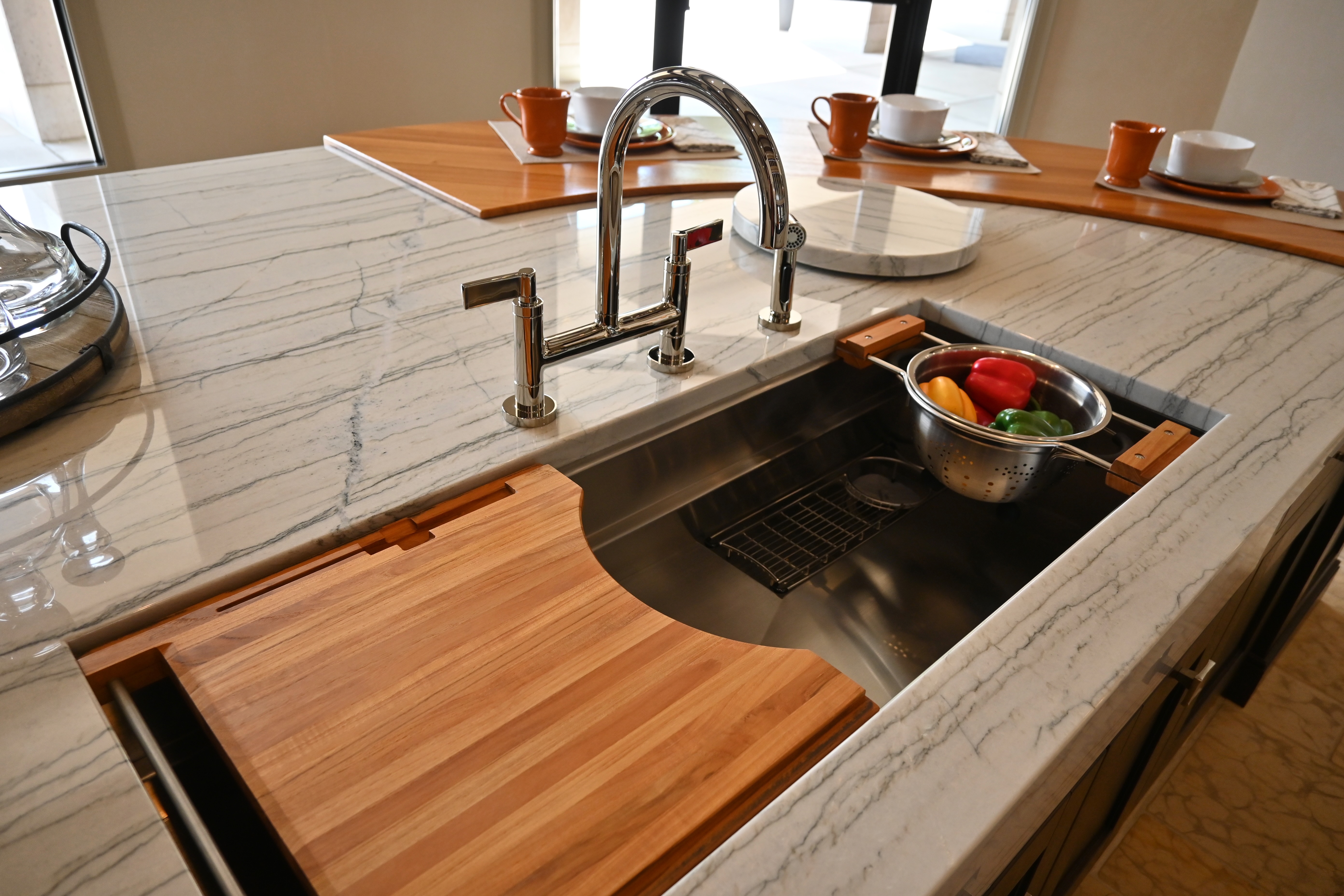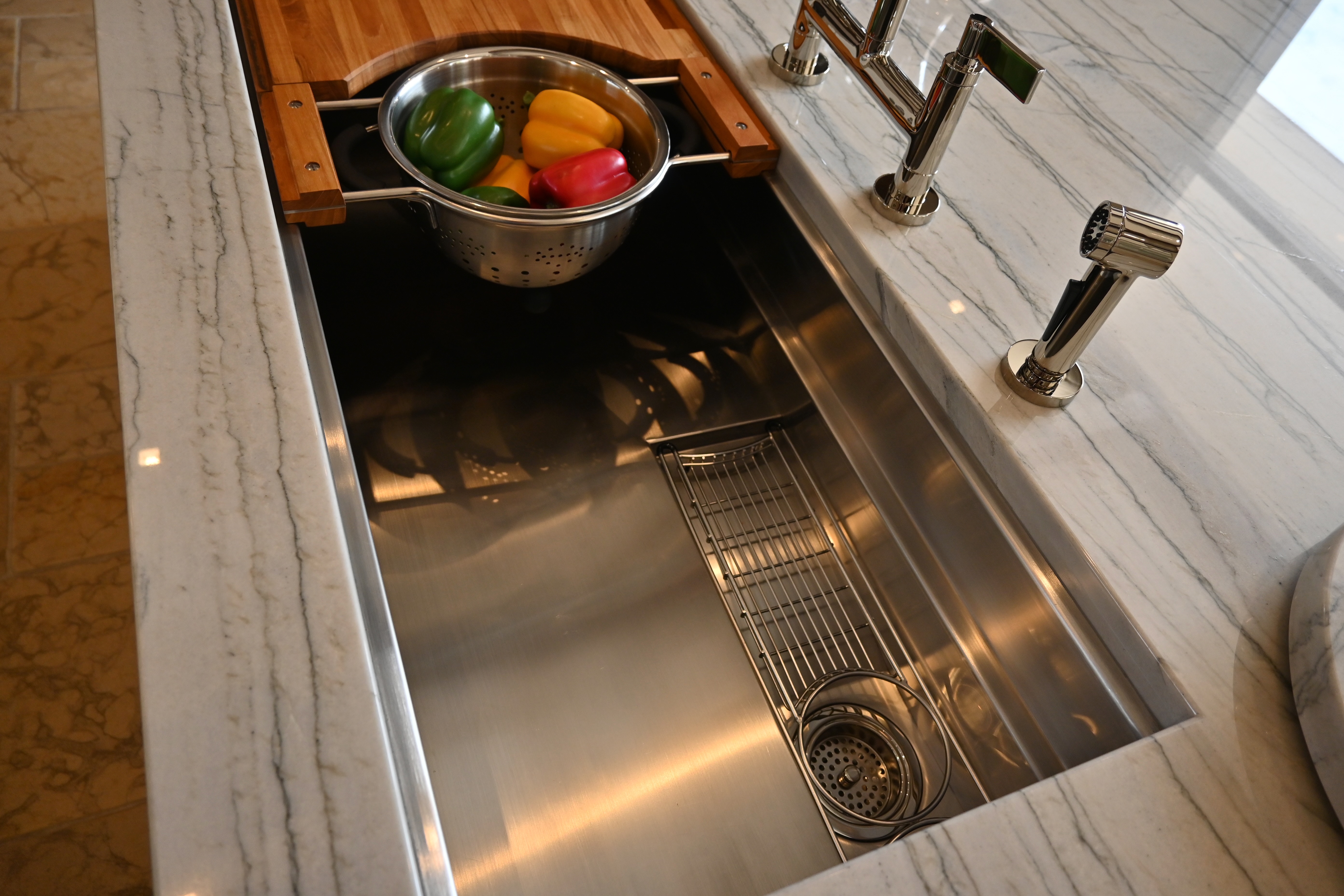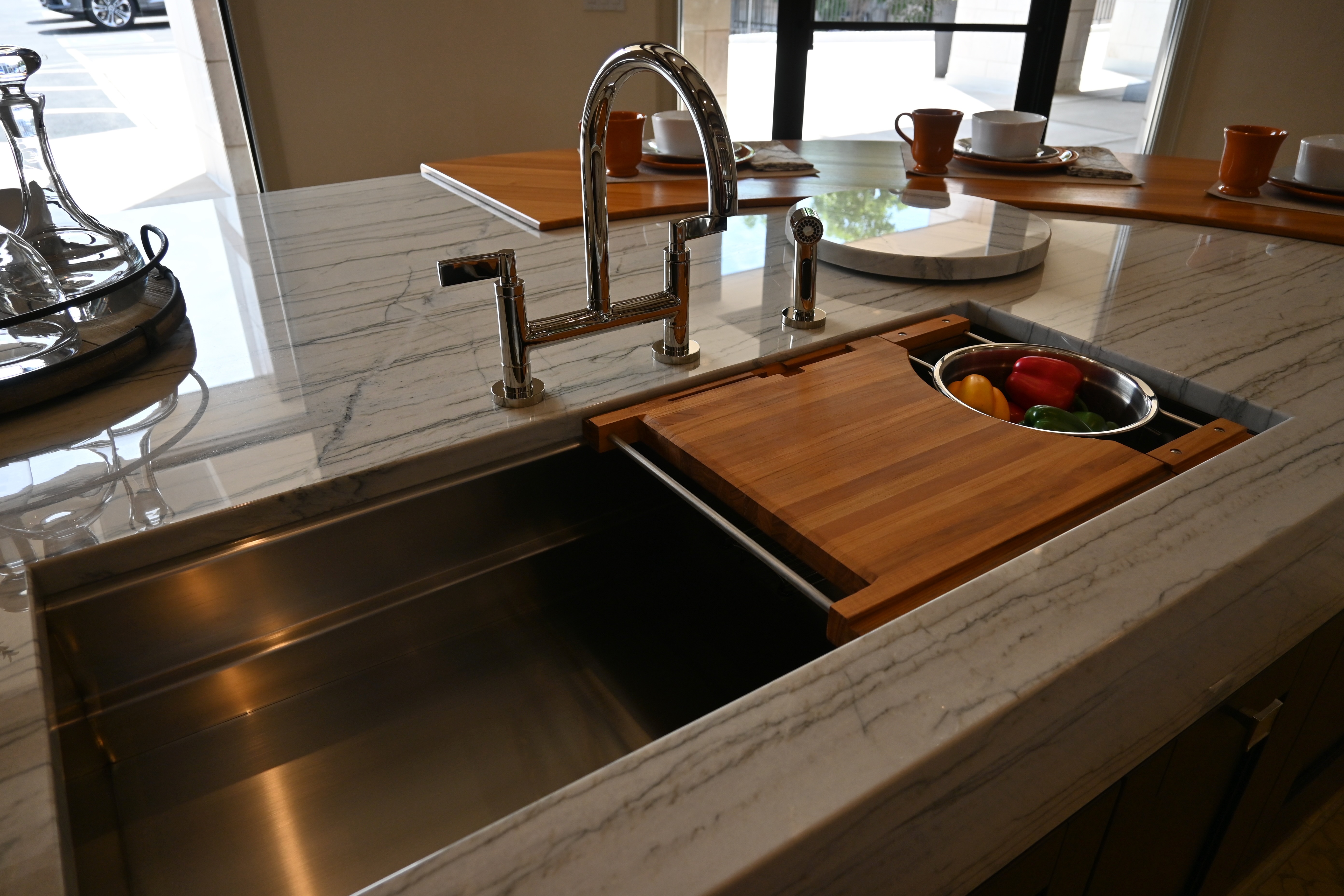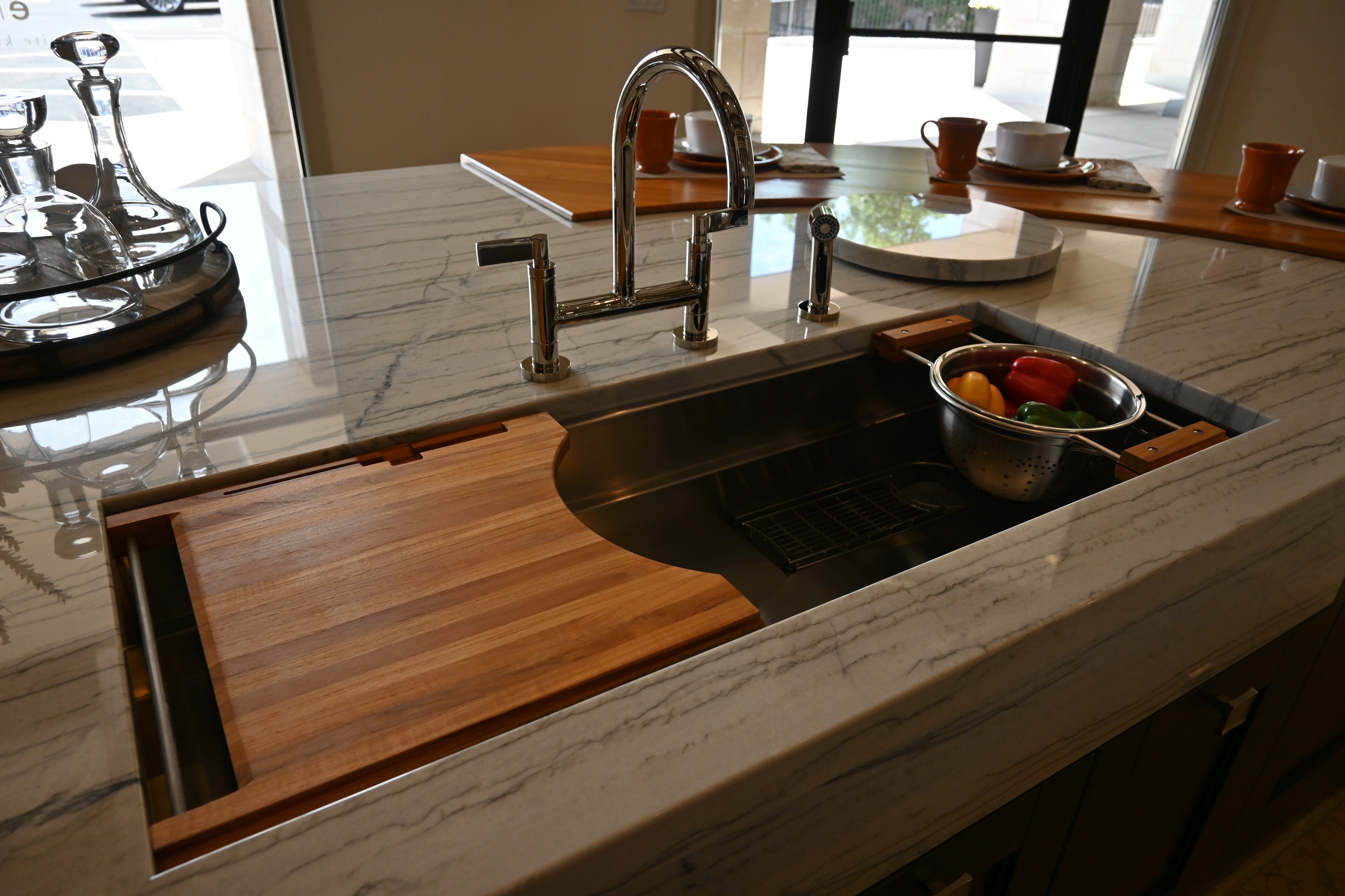 *Kallista Sink Multiere 45" Drop In Single Basin Stainless Steel Kitchen Sink with Basin Rack, Colander, Cutting Board Dim.: 45”w x 16” x 9”h, New list price $3,060 and Kallista faucet set