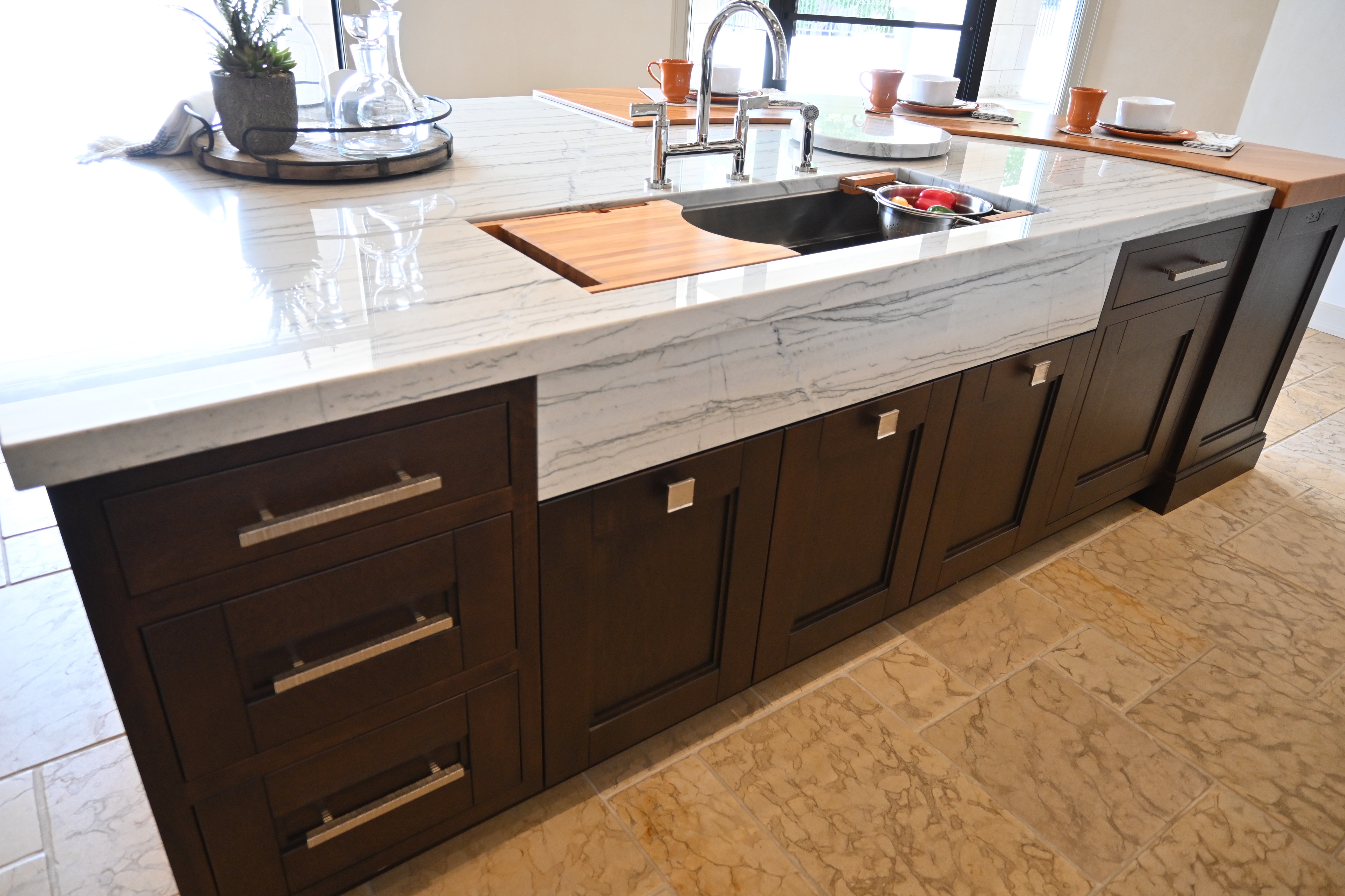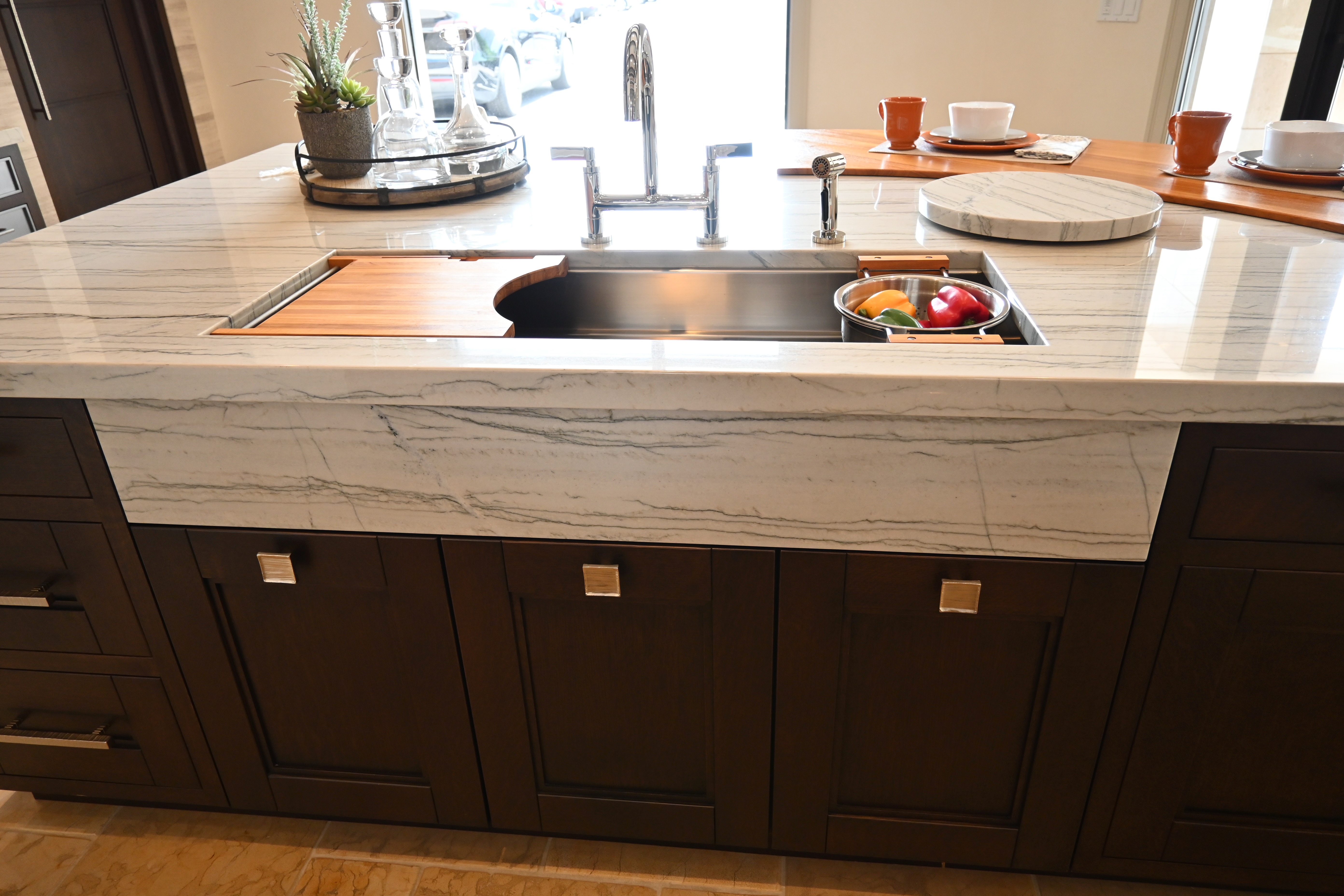 1-Two door base cabinet with an inset cutting board with a prep sink underneath Dim.: 27“w x 36”h x 24“d,