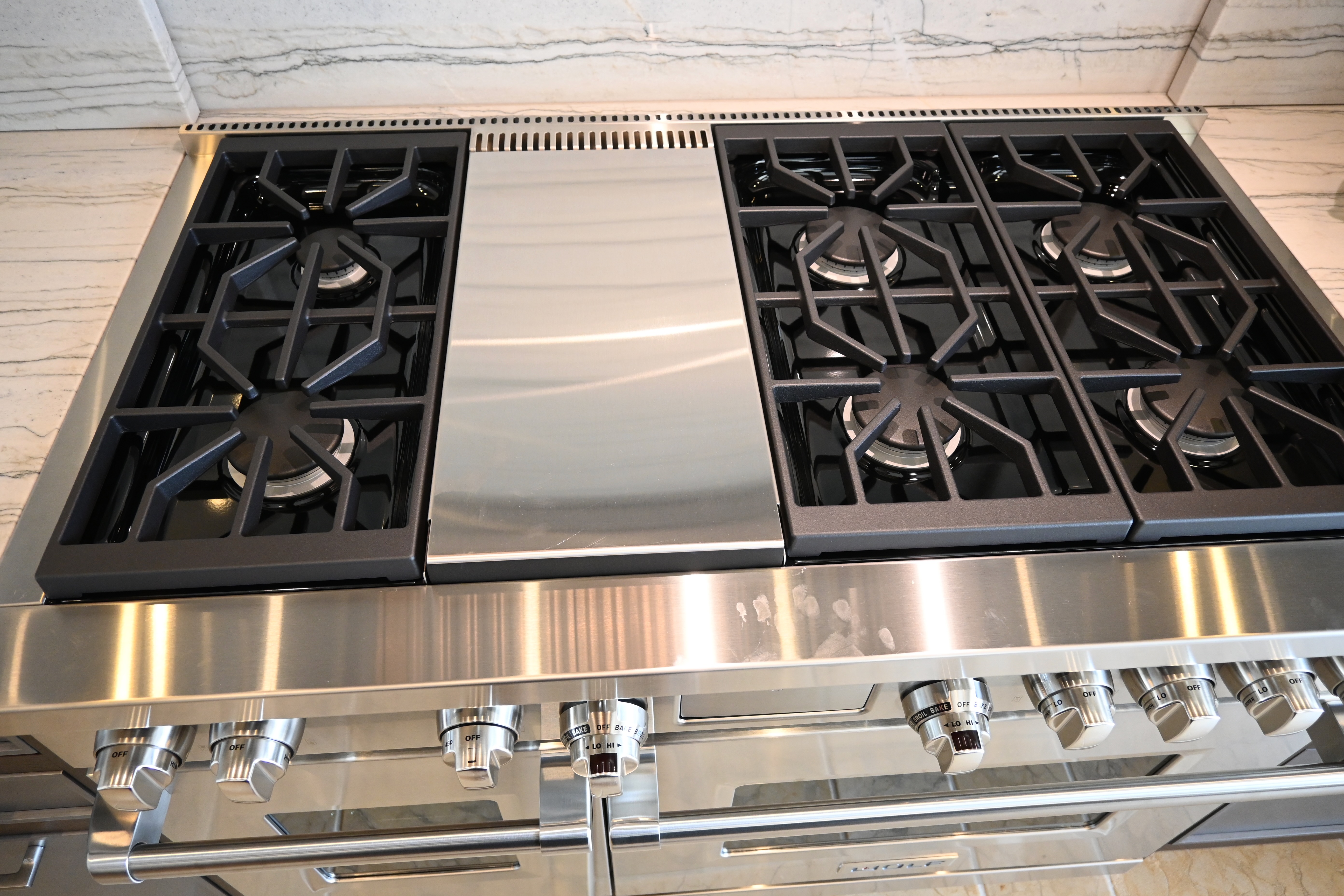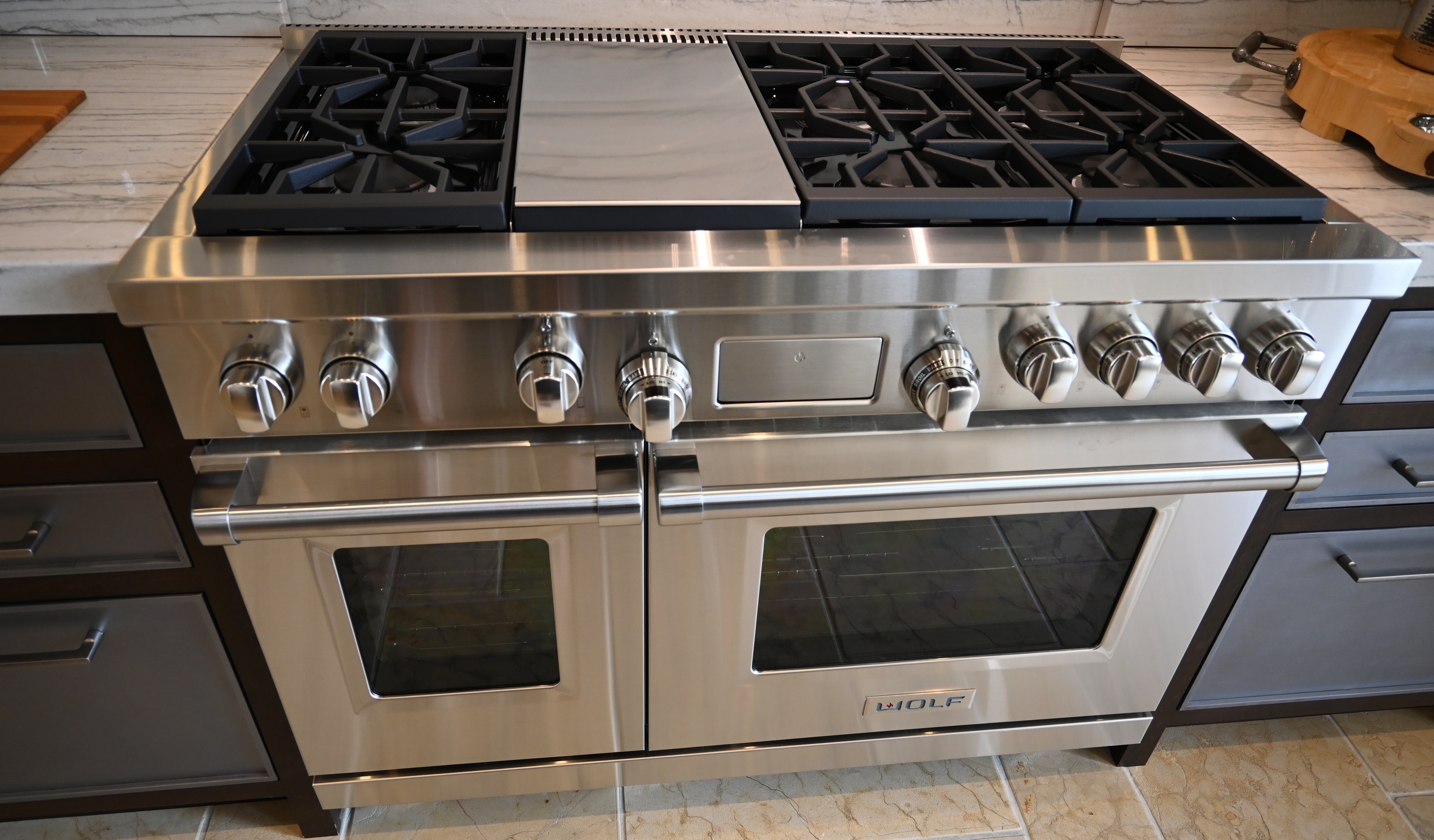 48” Wolf Stainless Steel Dual Fuel Range, 6 burners and infrared griddle Model #DF4860 Serial #18352825 Dim.: 48” Listing price new $16,330
