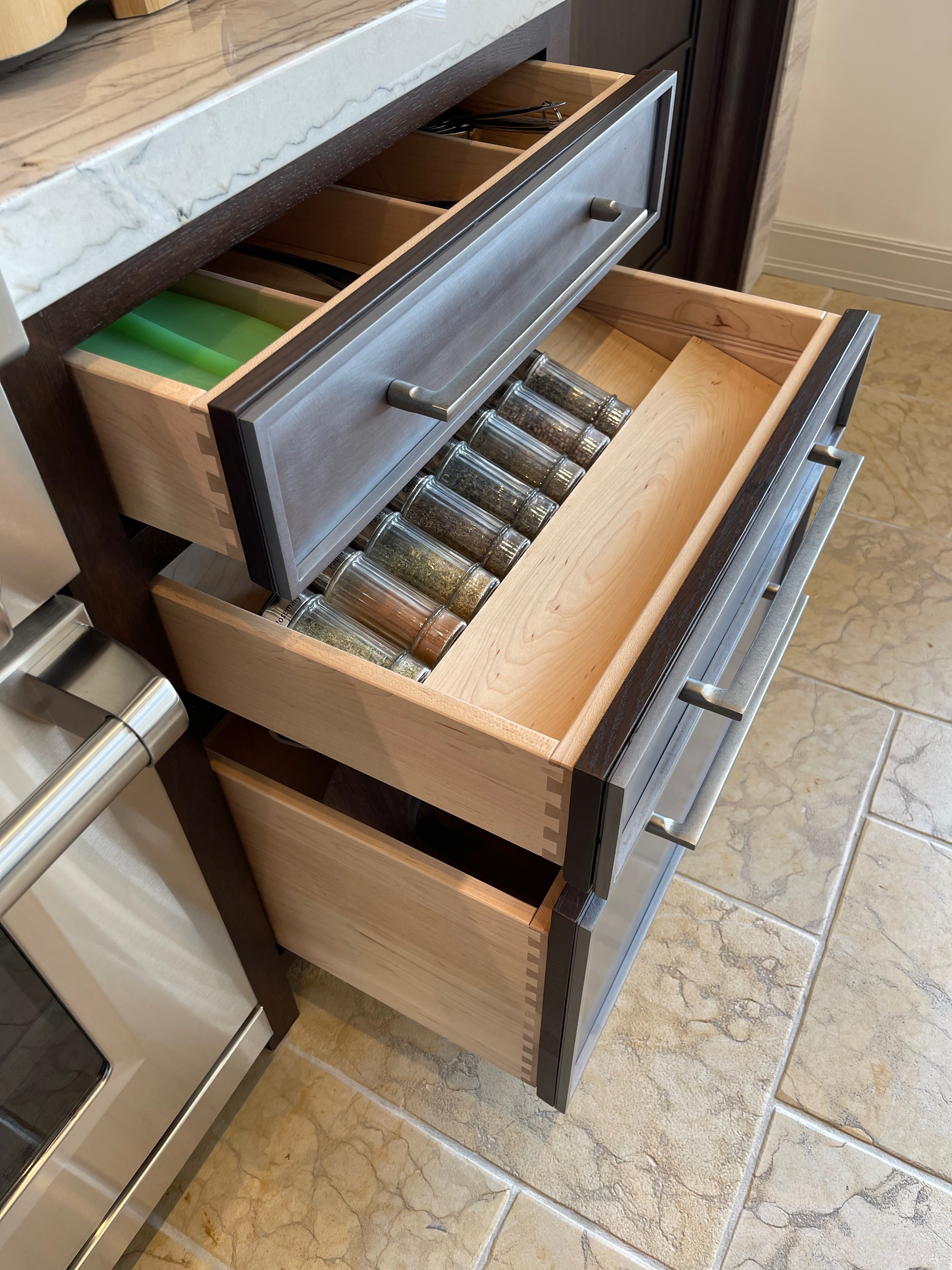 1-Three drawer base cabinet w/ wood spice racks in the first two drawers Dim.:27“w x 36”h x 24“d